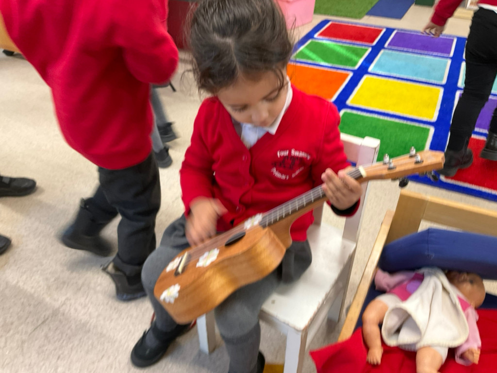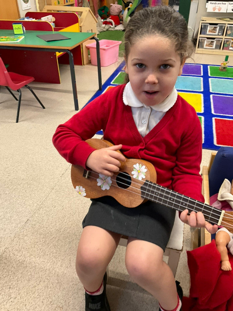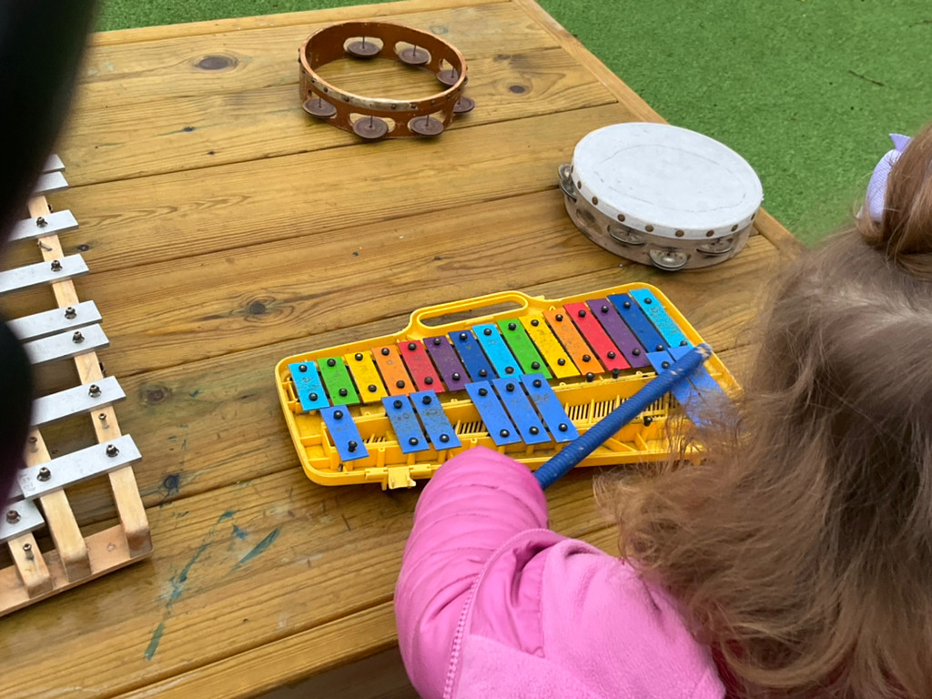 The nursery children actively engaged in playing musical instruments indoors and outdoors. They used their creativity to make different sounds and enjoyed singing whilst playing the instruments.