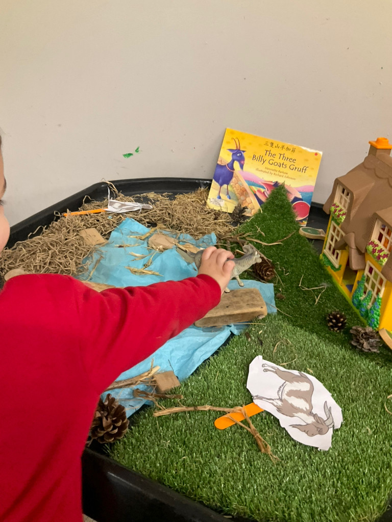 The children developed their Communication and Language skills by talking about the characters, sequencing events, and using story language such as “bridge”, “troll” and “trip-trap”. They confidently expressed their ideas and listened to one another during shared play.