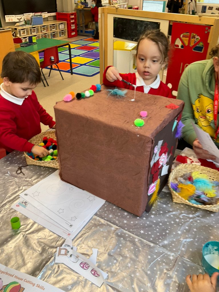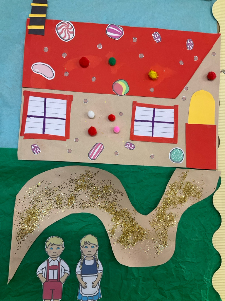 This week, the nursery children took part in a creative activity inspired by the story Hansel and Gretel. They explored a range of materials including glue, pom-poms, coloured paper, crayons, and scissors to design and decorate their own pictures. This hands-on activity supported the development of fine motor skills, hand–eye coordination, and early scissor control.