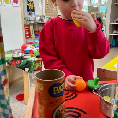 eat a tomato" encouraging children to explore and try new fruits just like the character Lola.All children were actively engaged and they showed curiosity about different fruits, enjoyed preparing their own fruit kebabs. The children recalled and quoted part of the story especially Lola's imaginative names for fruits. For example "moonsqurters" for tomatoes which helped reduce hesitation in trying new food. The children demonstrated good control when using child-safe knives and skewers, showing careful cutting and hand and eye coordination skills.