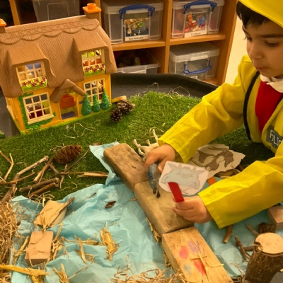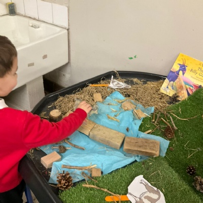 The children enjoyed listening to the story and took part in a range of hands-on activities to help bring the story to life. Through small world play, the children recreated the bridge and river scene, using different materials to build and explore. They showed curiosity and imagination as they retold parts of the story using props and figures.