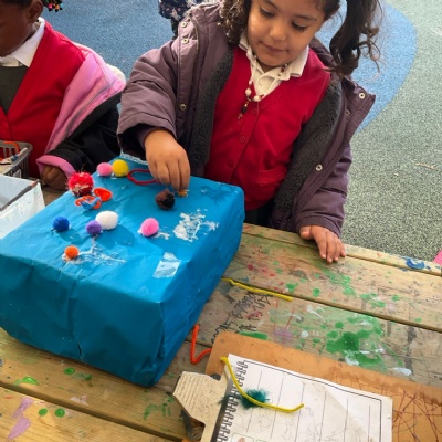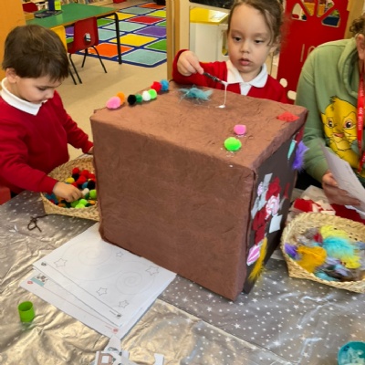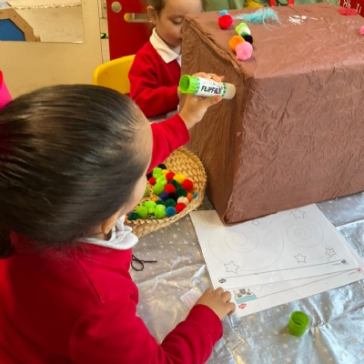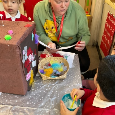 This week, the nursery children took part in a creative activity inspired by the story Hansel and Gretel. They explored a range of materials including glue, pom-poms, coloured paper, crayons, and scissors to design and decorate their own pictures. This hands-on activity supported the development of fine motor skills, hand&n