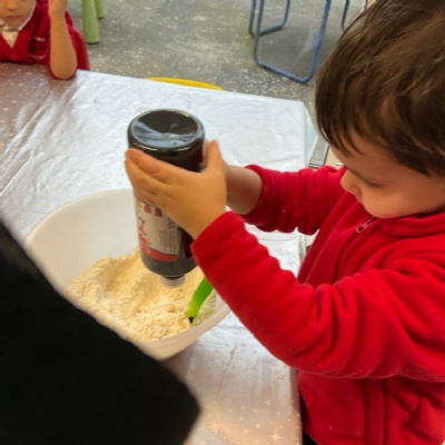 illing up cups and containersduring water play.Role Play: In the mud kitchen, we followed simple recipes to create our own mud cakes, using natural ingridients.