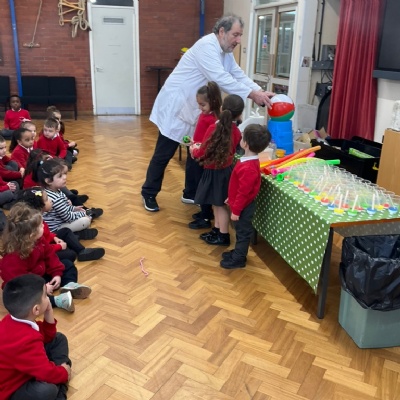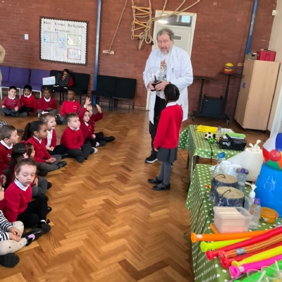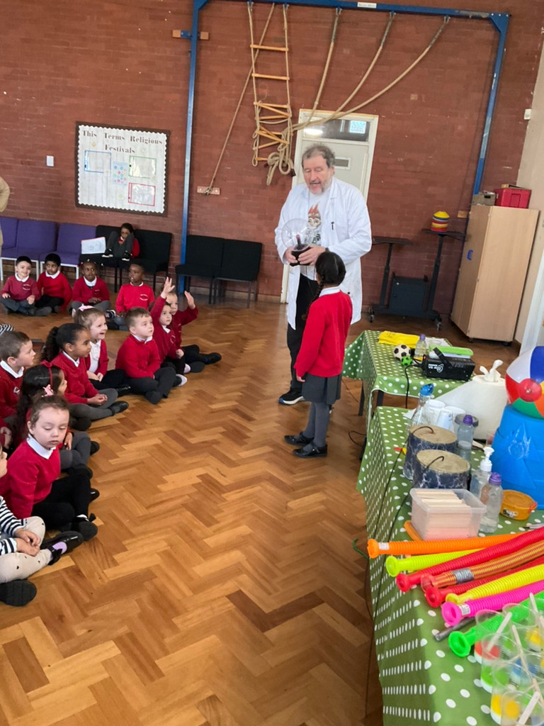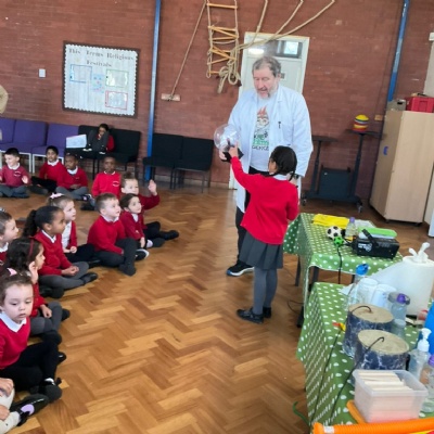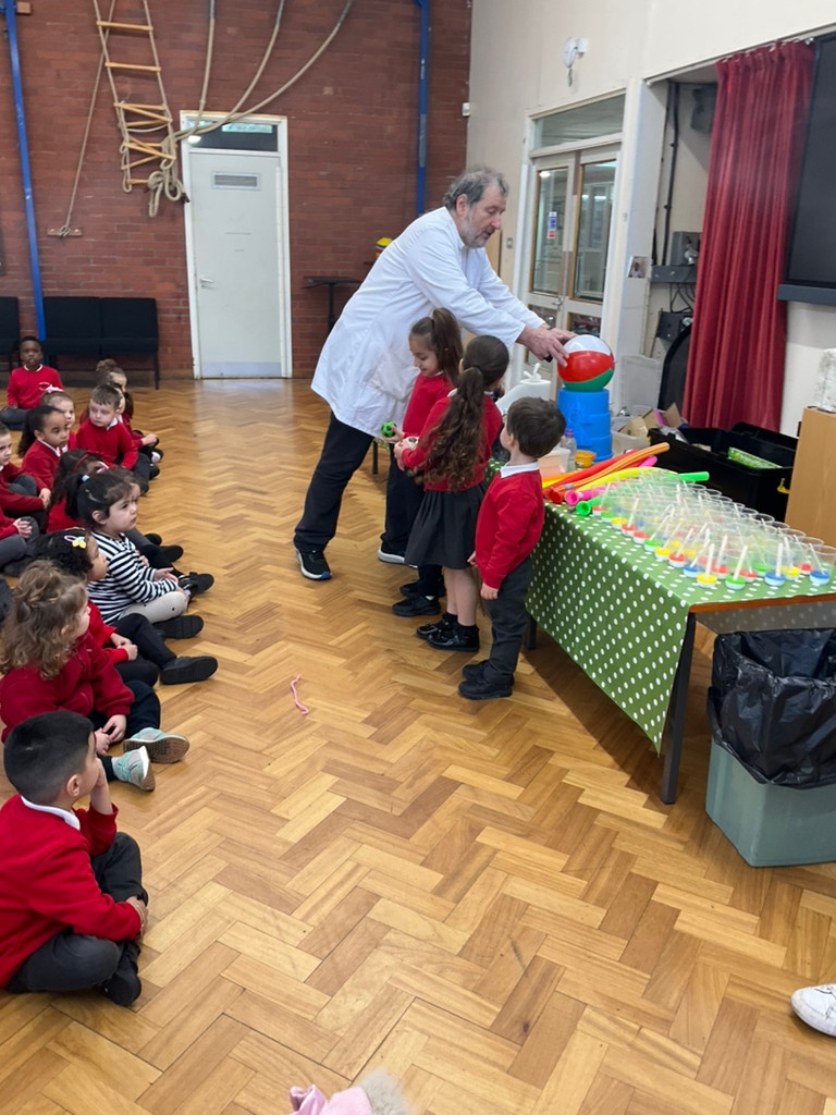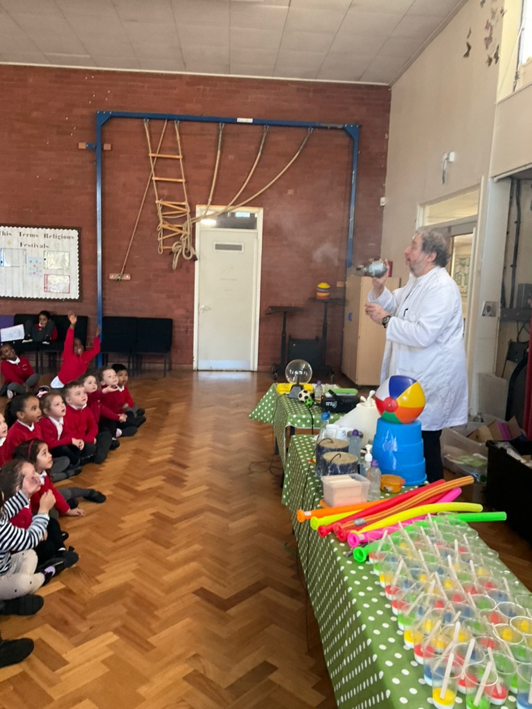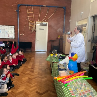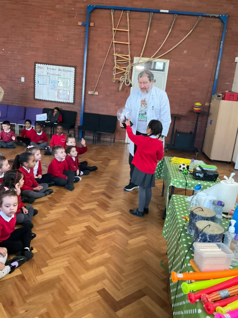 During Science Week, the children attended a special session in the school hall where a visiting science presenter demonstrated several exciting experiments. The children were particularly engaged during the gravity demonstration, where they observed how objects fall and how gravity affects movement. The presenter also carried out a balloon experiment which captured the children’s attention and encouraged them to think about how air and forces work.