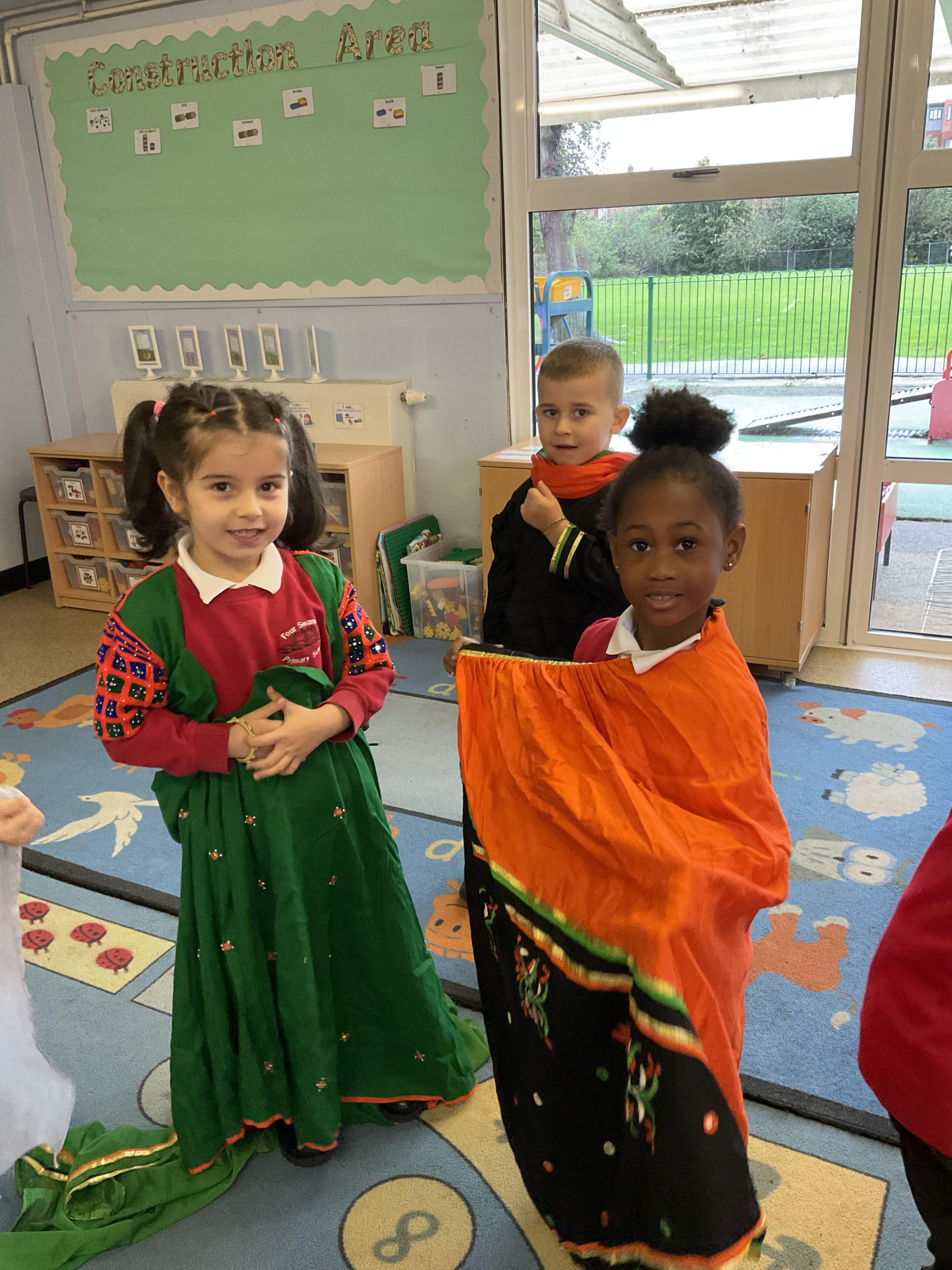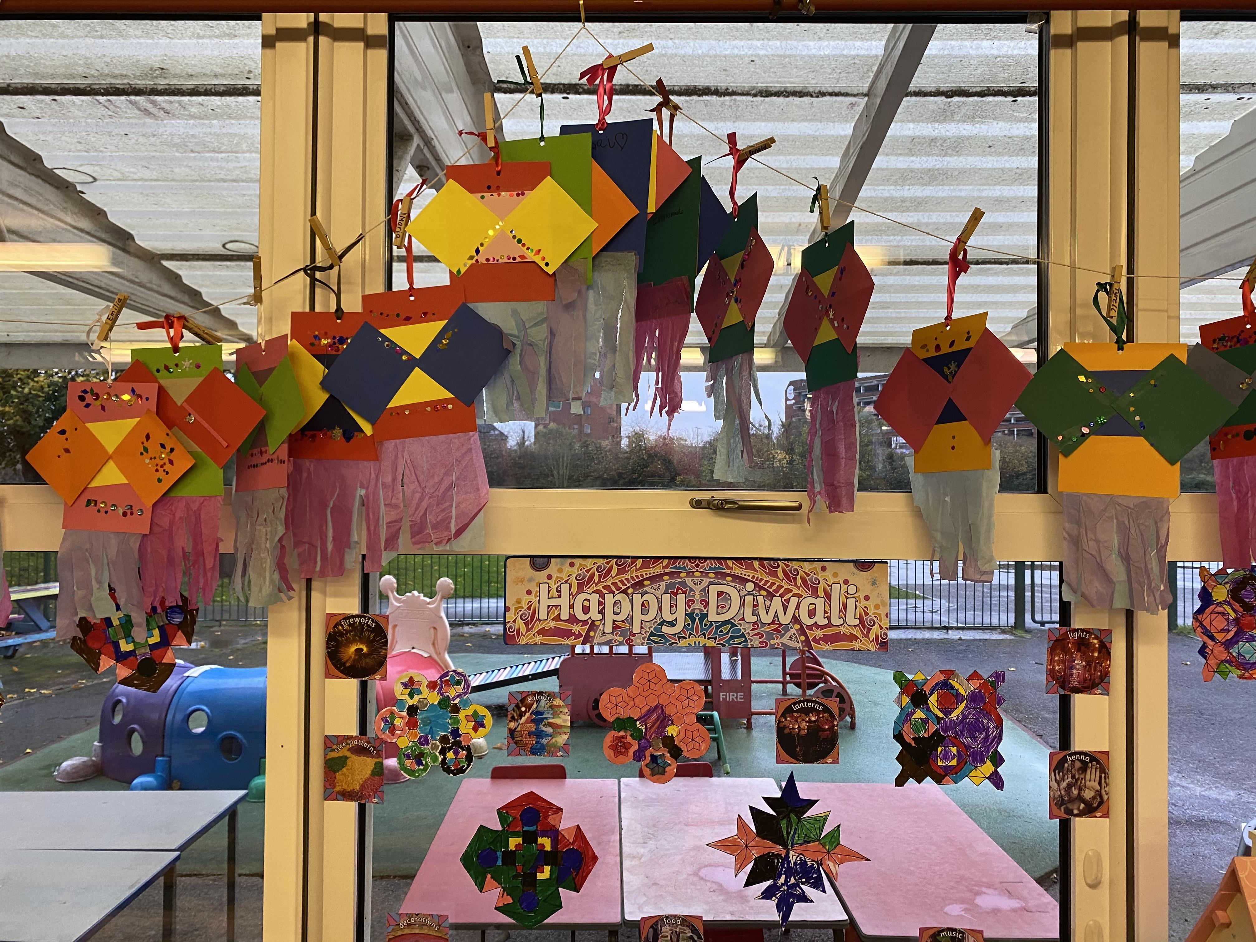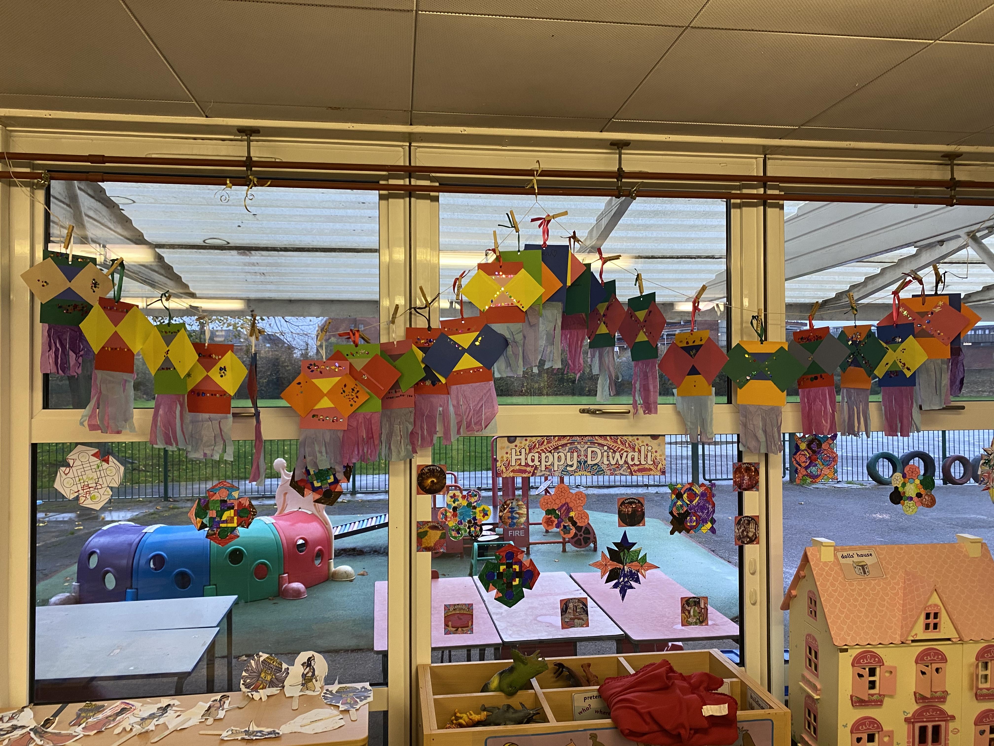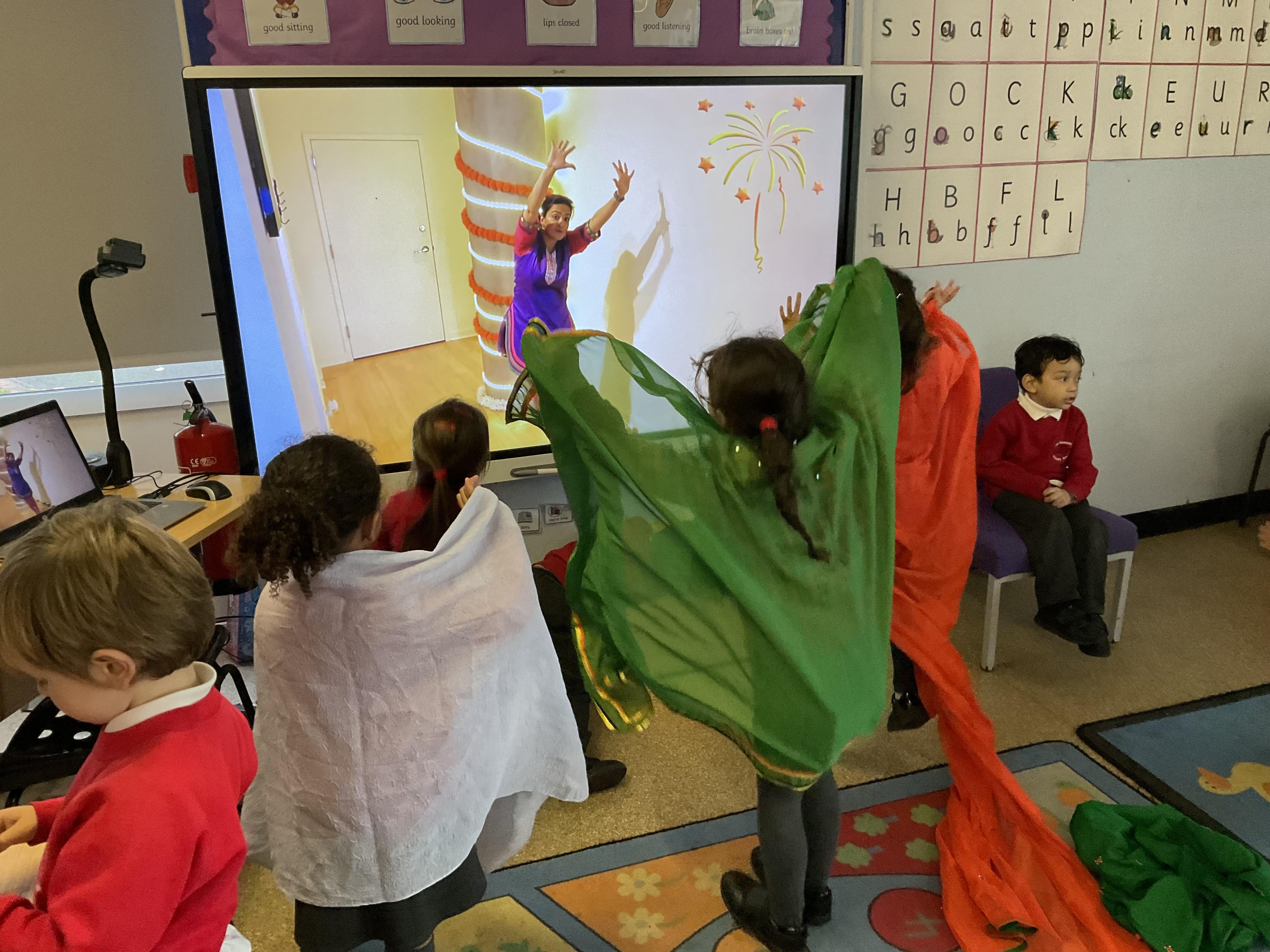 Today we celebrated Diwali, We made Rangoli patterns, sculpted clay divas, had a Diwali feast of samosas, pakoras, and bhajis and then we learnt a diwali dance. Mrs Dhanjal from Year 3 came to talk to the children about how she celebrates Diwali at home.