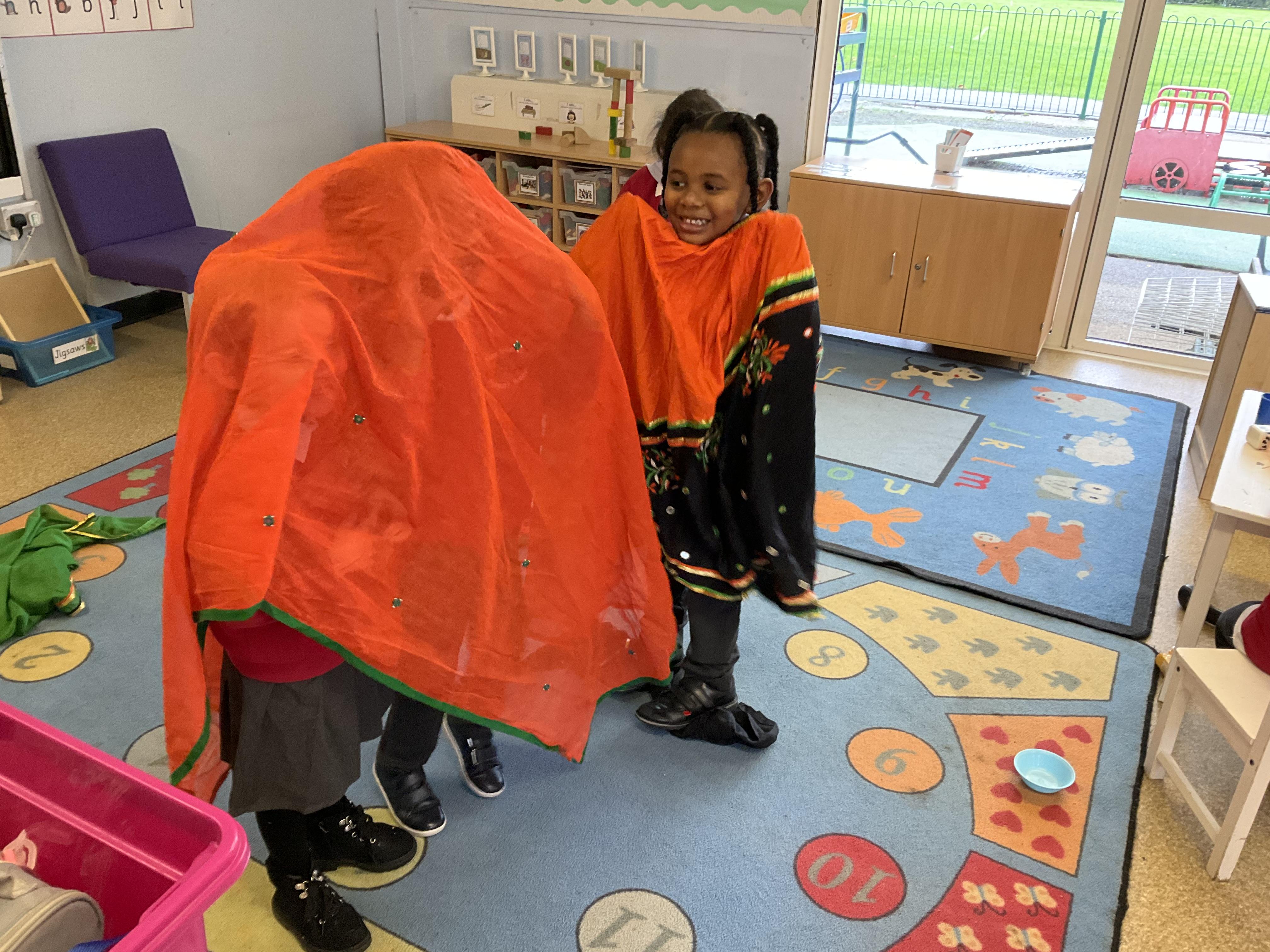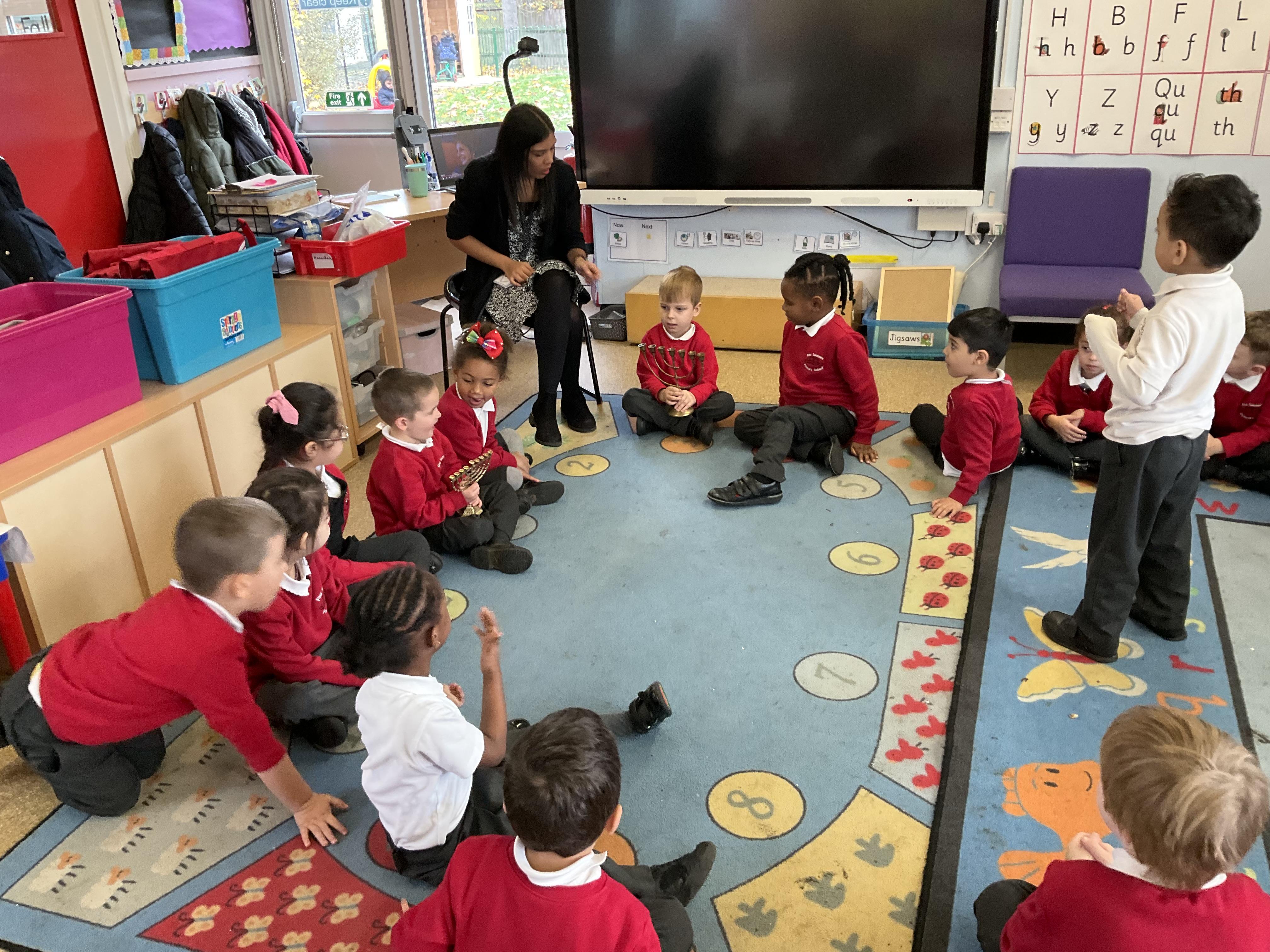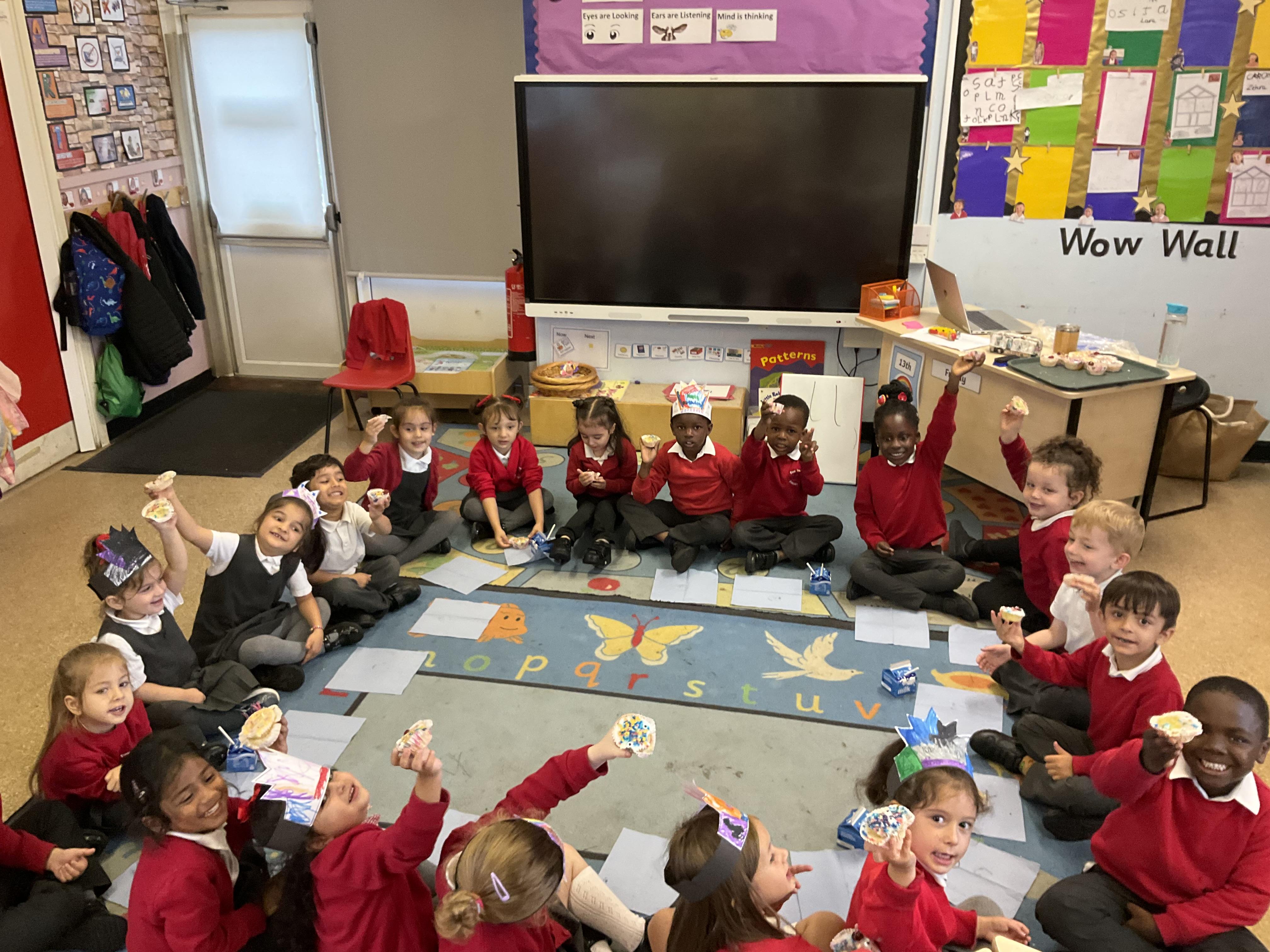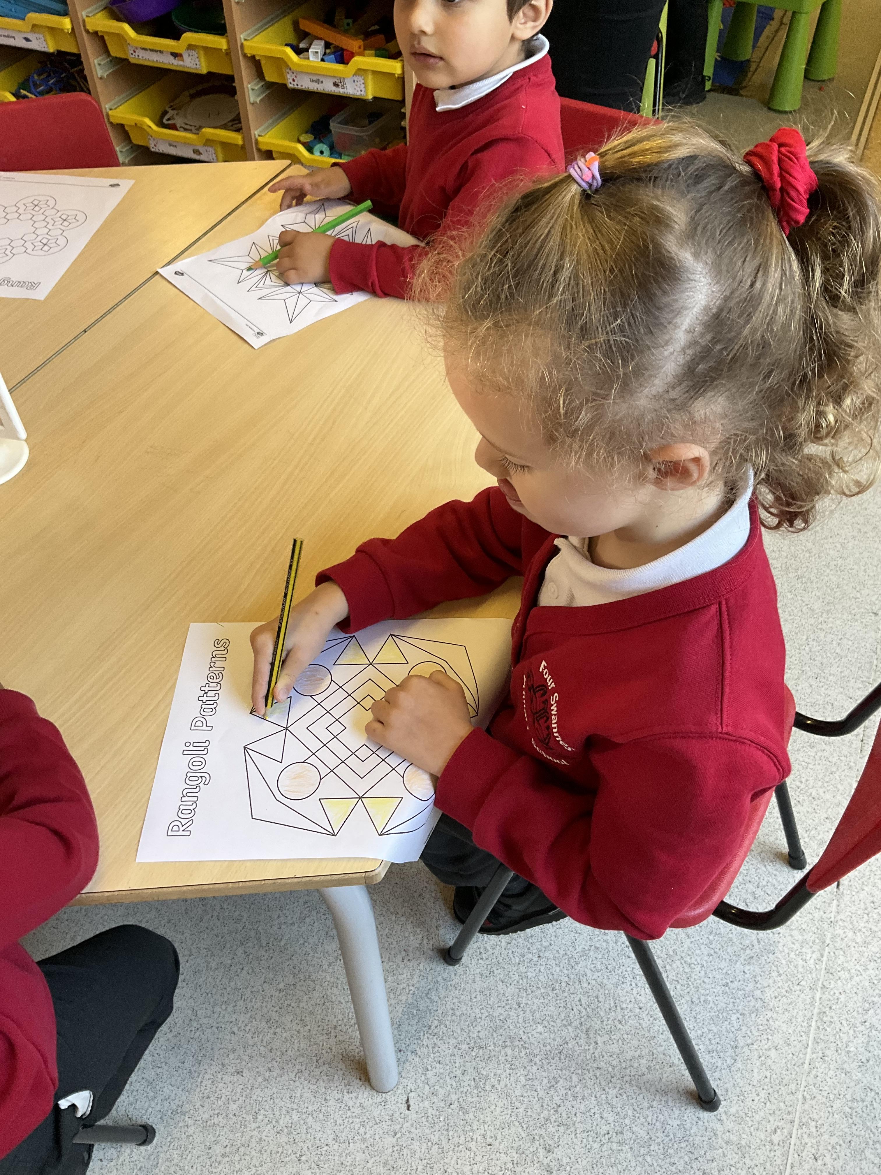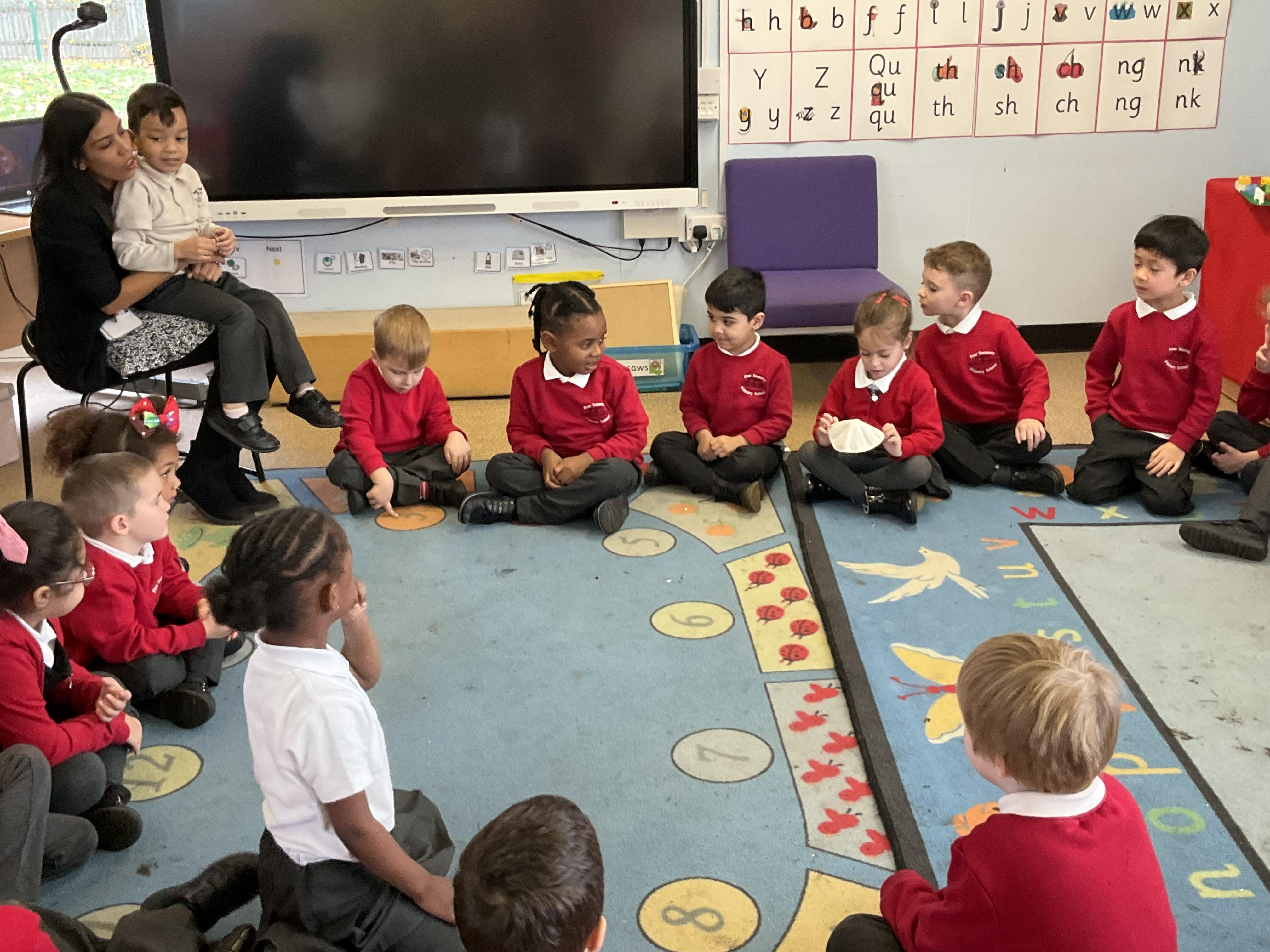 Today we celebrated Diwali, We made Rangoli patterns, sculpted clay divas, had a Diwali feast of samosas, pakoras, and bhajis and then we learnt a diwali dance. Mrs Dhanjal from Year 3 came to talk to the children about how she celebrates Diwali at home.