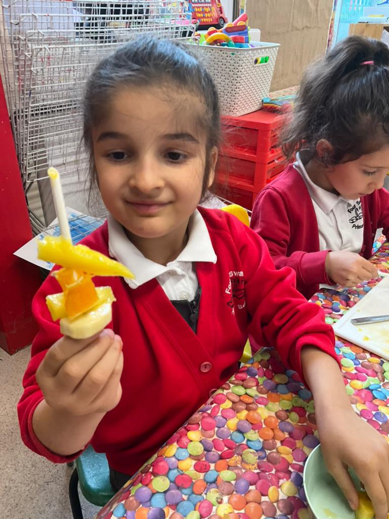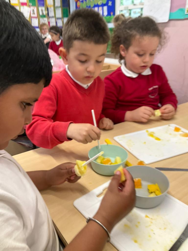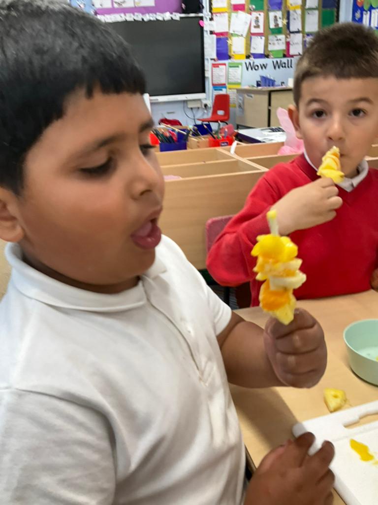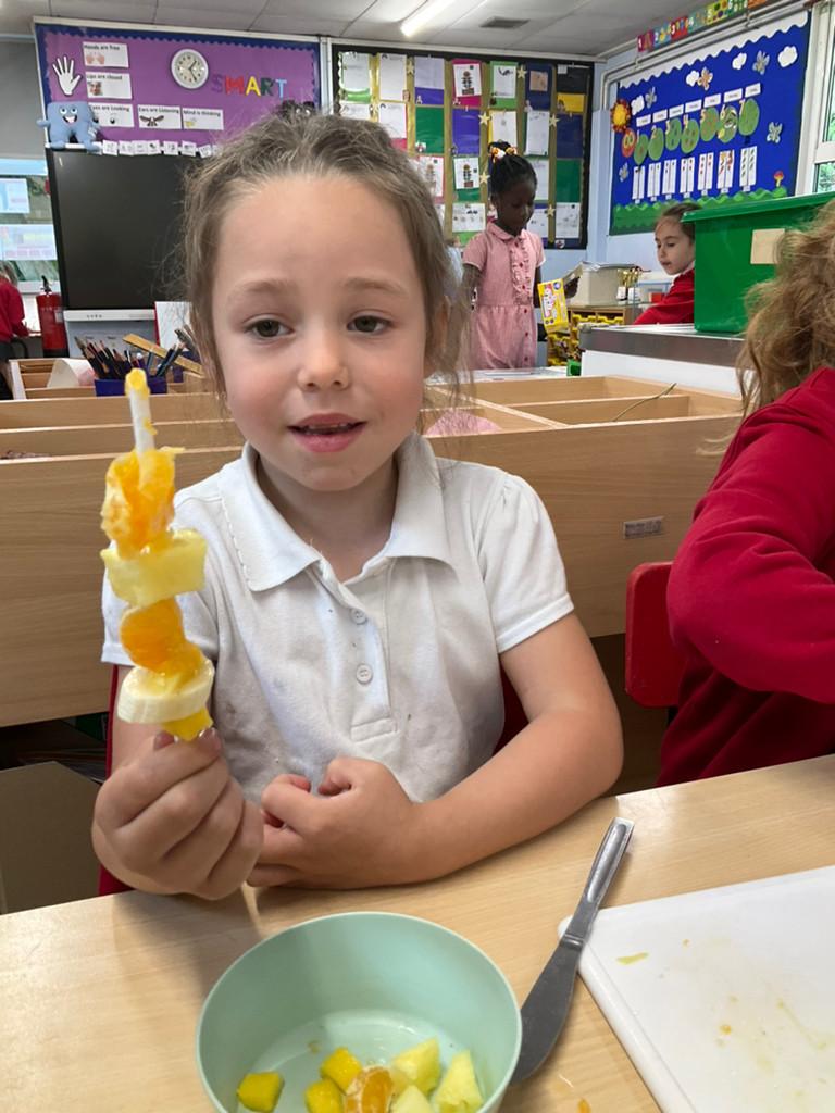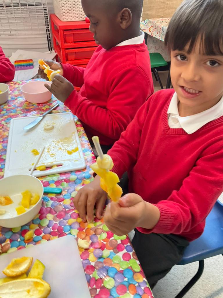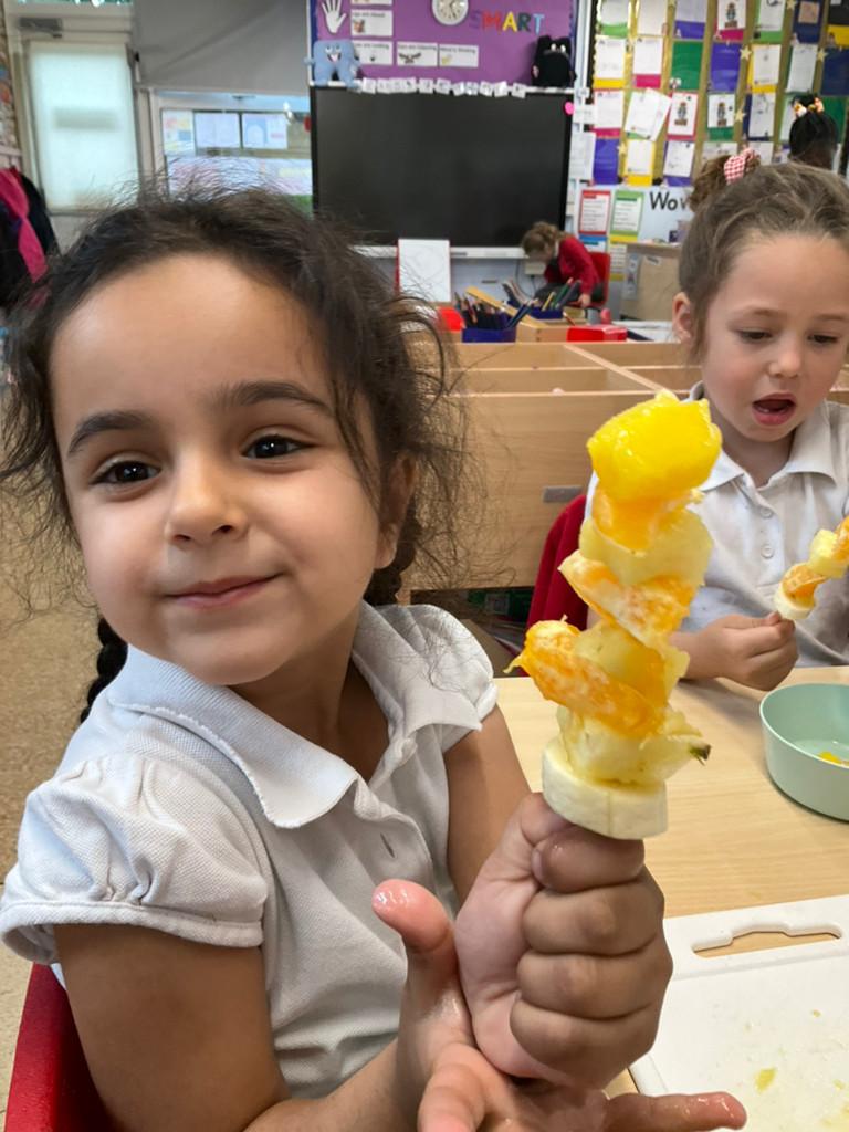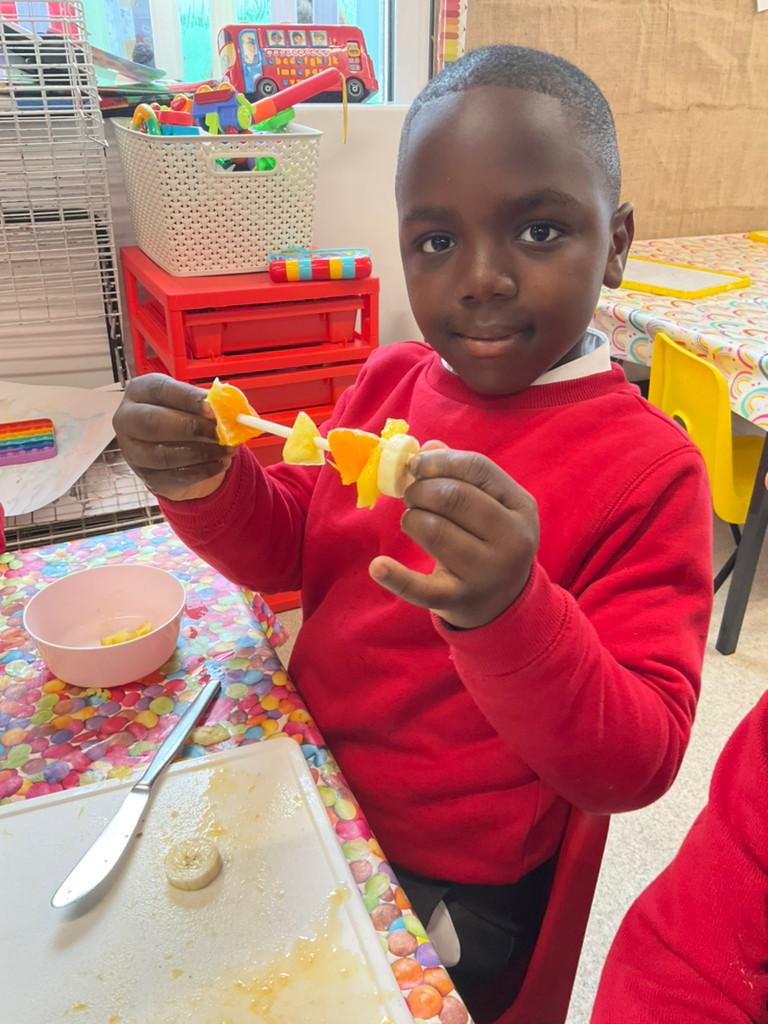 As part of Healthy Eating Week, children participated in a practical activity where they made fruit kebabs using a variety of tropical and familiar fruits such as pineapple, banana, oranges, apples, and plums. The activity was inspired by Handa’s Surprise, where Handa prepares a basket of fruits for her friend. This book was used to explore healthy foods, encourage discussion about fruits from different cultures, and support children in trying new foods.