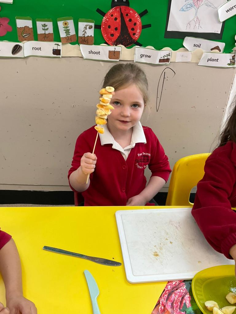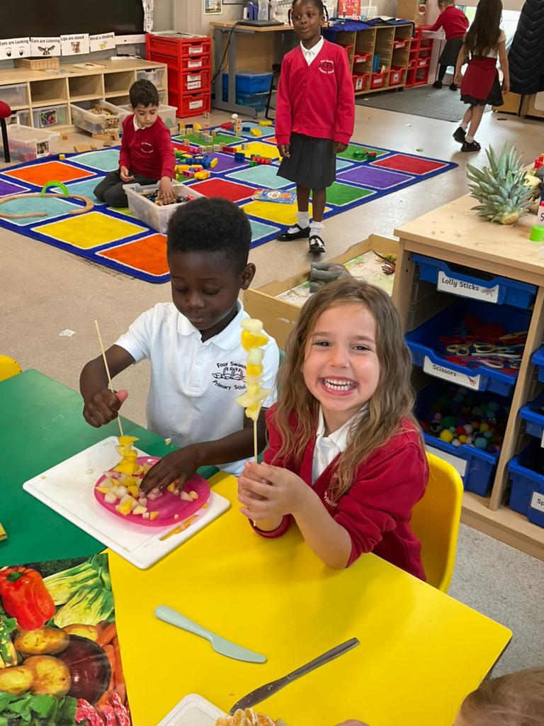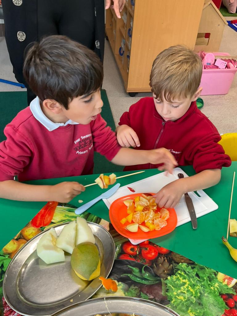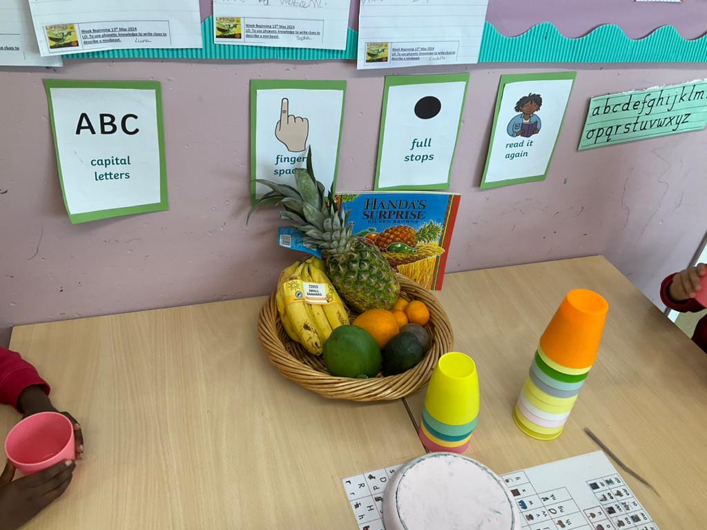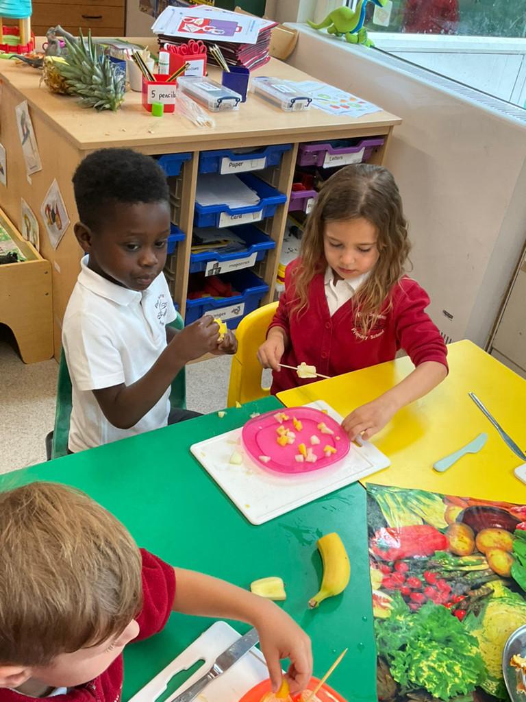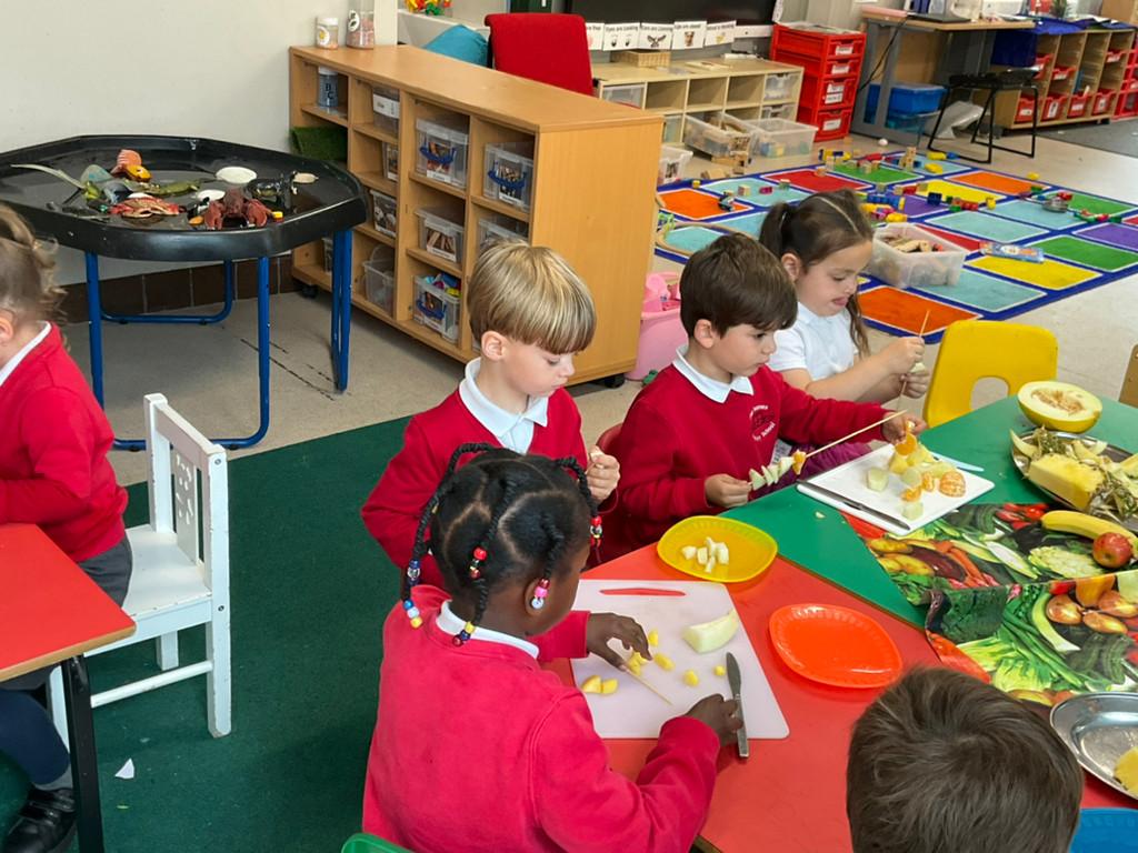 As part of Healthy Eating Week, children participated in a practical activity where they made fruit kebabs using a variety of tropical and familiar fruits such as pineapple, banana, oranges, apples, and plums. The activity was inspired by Handa’s Surprise, where Handa prepares a basket of fruits for her friend. This book was used to explore healthy foods, encourage discussion about fruits from different cultures, and support children in trying new foods.