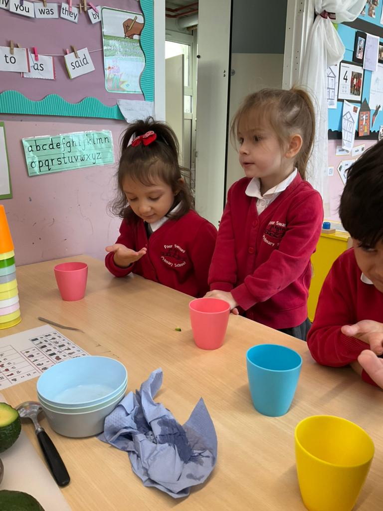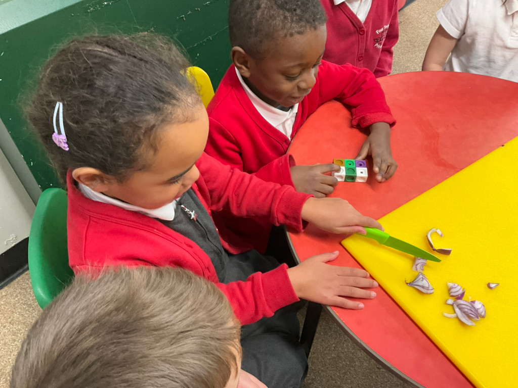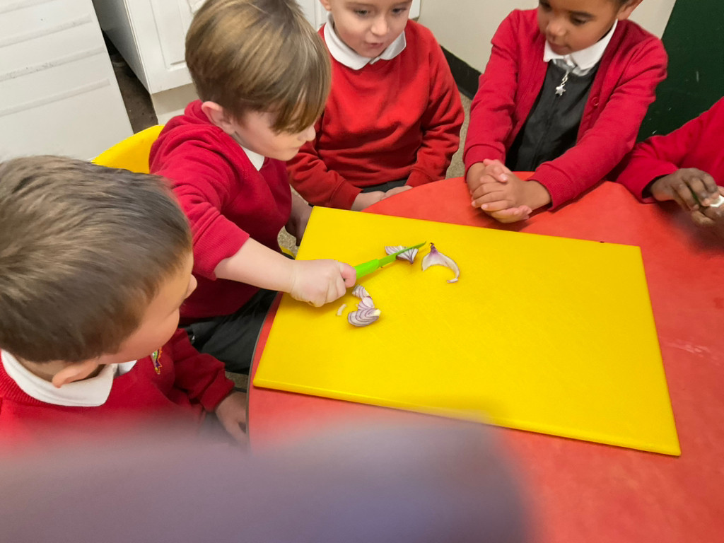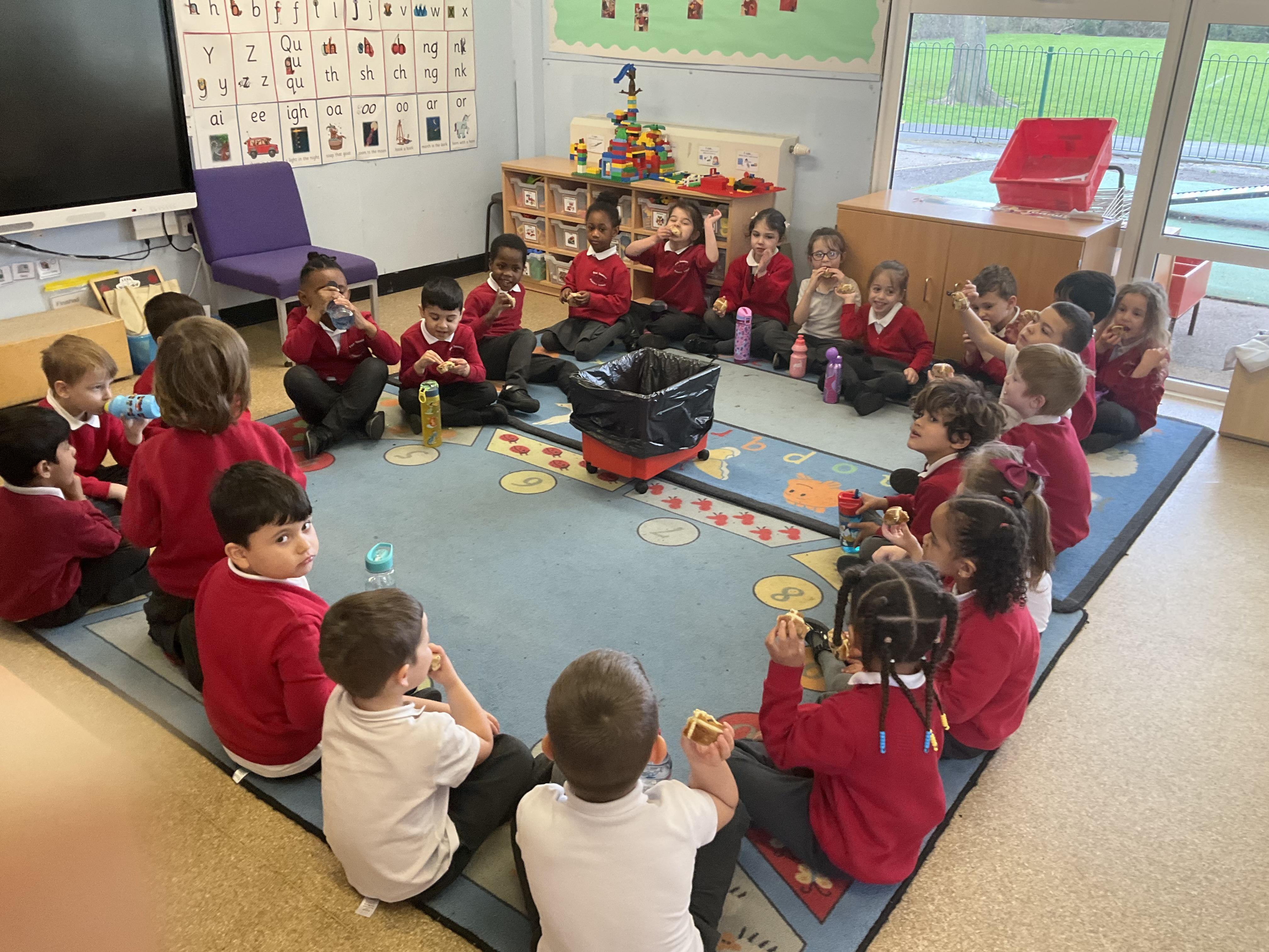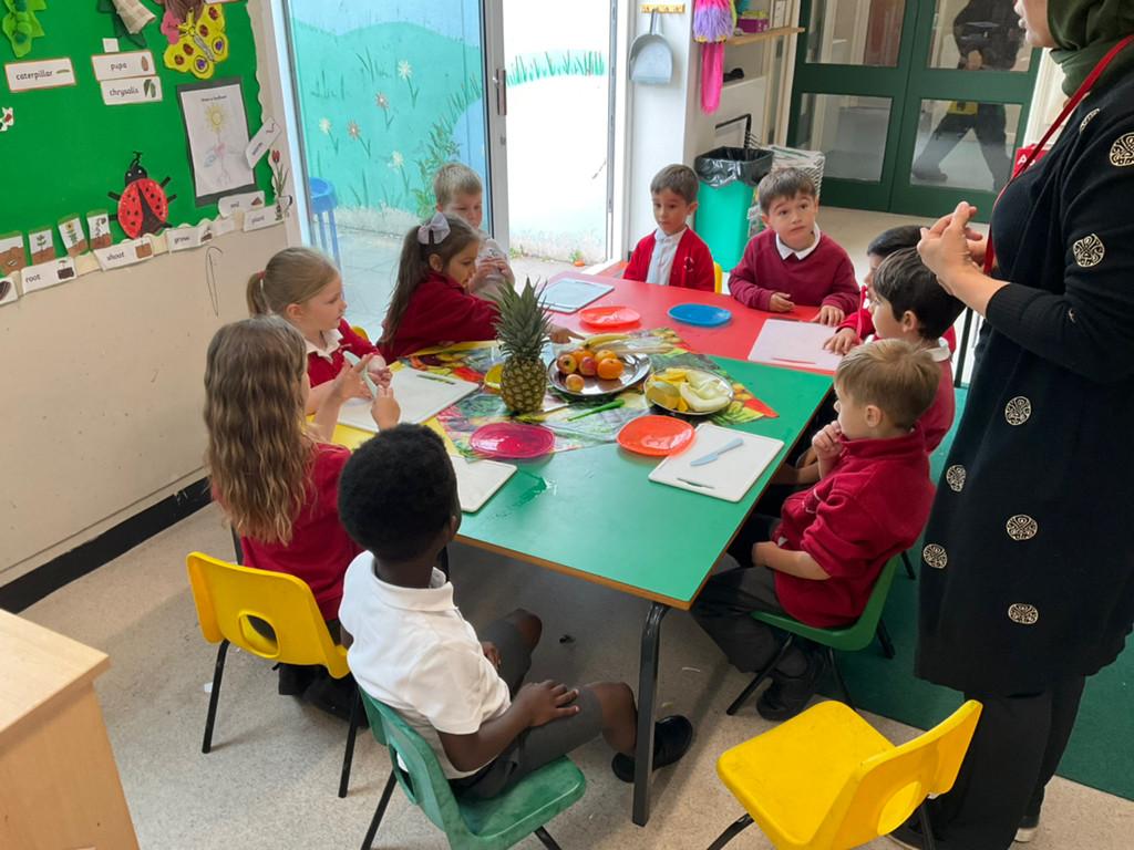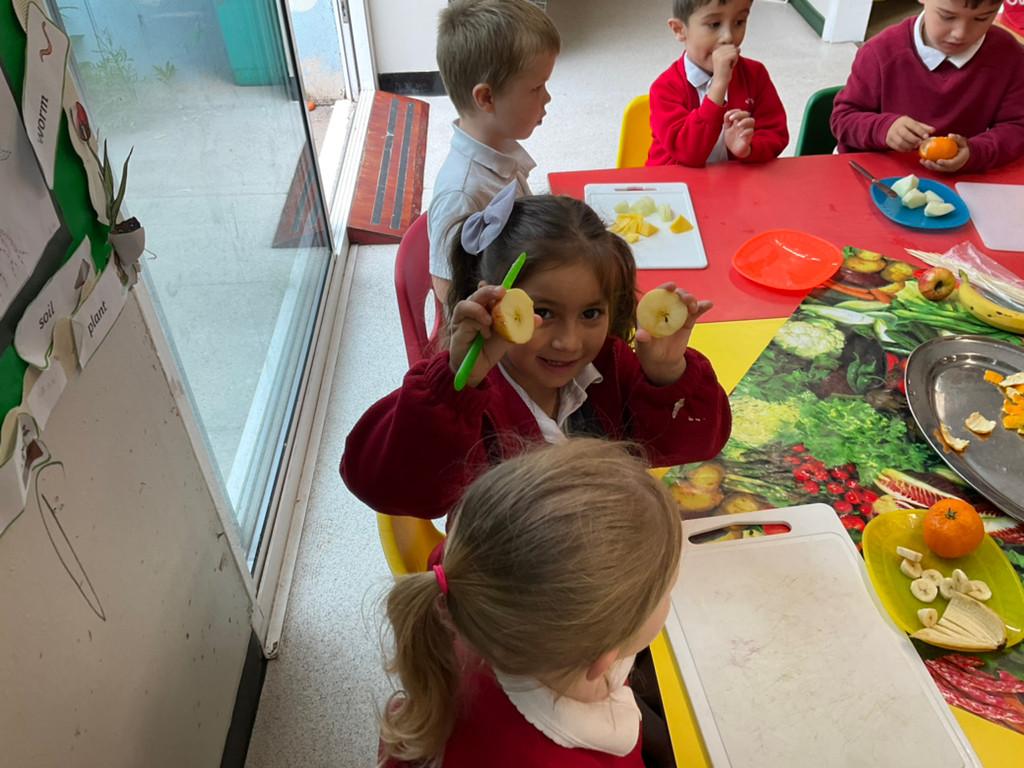 As part of Healthy Eating Week, children participated in a practical activity where they made fruit kebabs using a variety of tropical and familiar fruits such as pineapple, banana, oranges, apples, and plums. The activity was inspired by Handa’s Surprise, where Handa prepares a basket of fruits for her friend. This book was used to explore healthy foods, encourage discussion about fruits from different cultures, and support children in trying new foods.