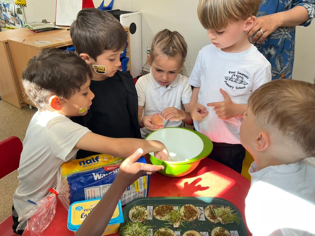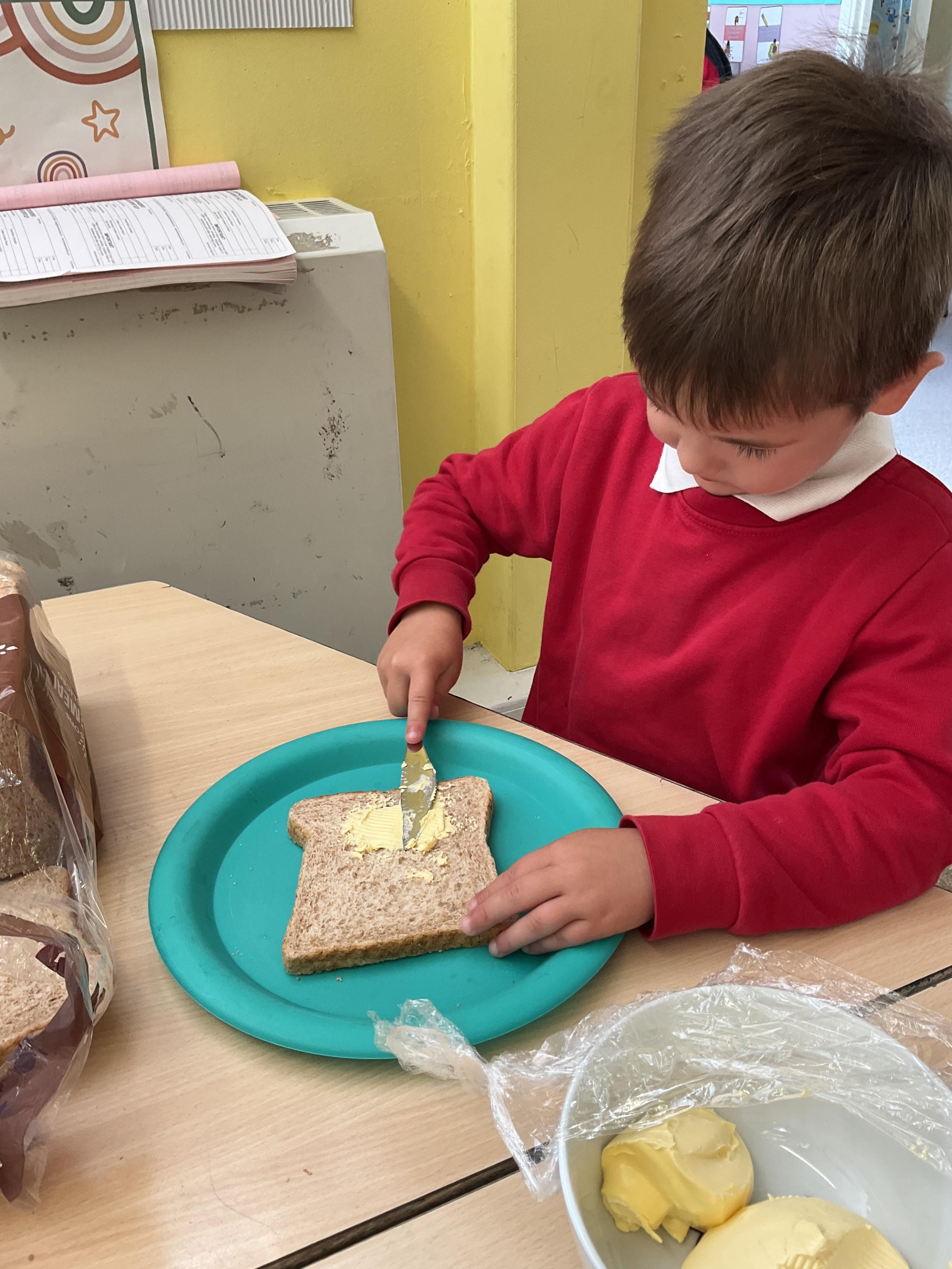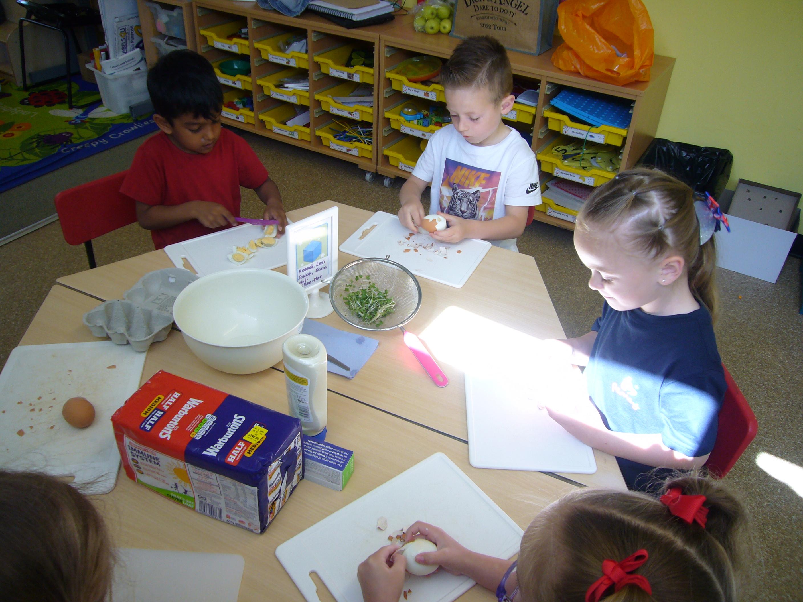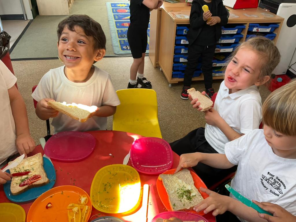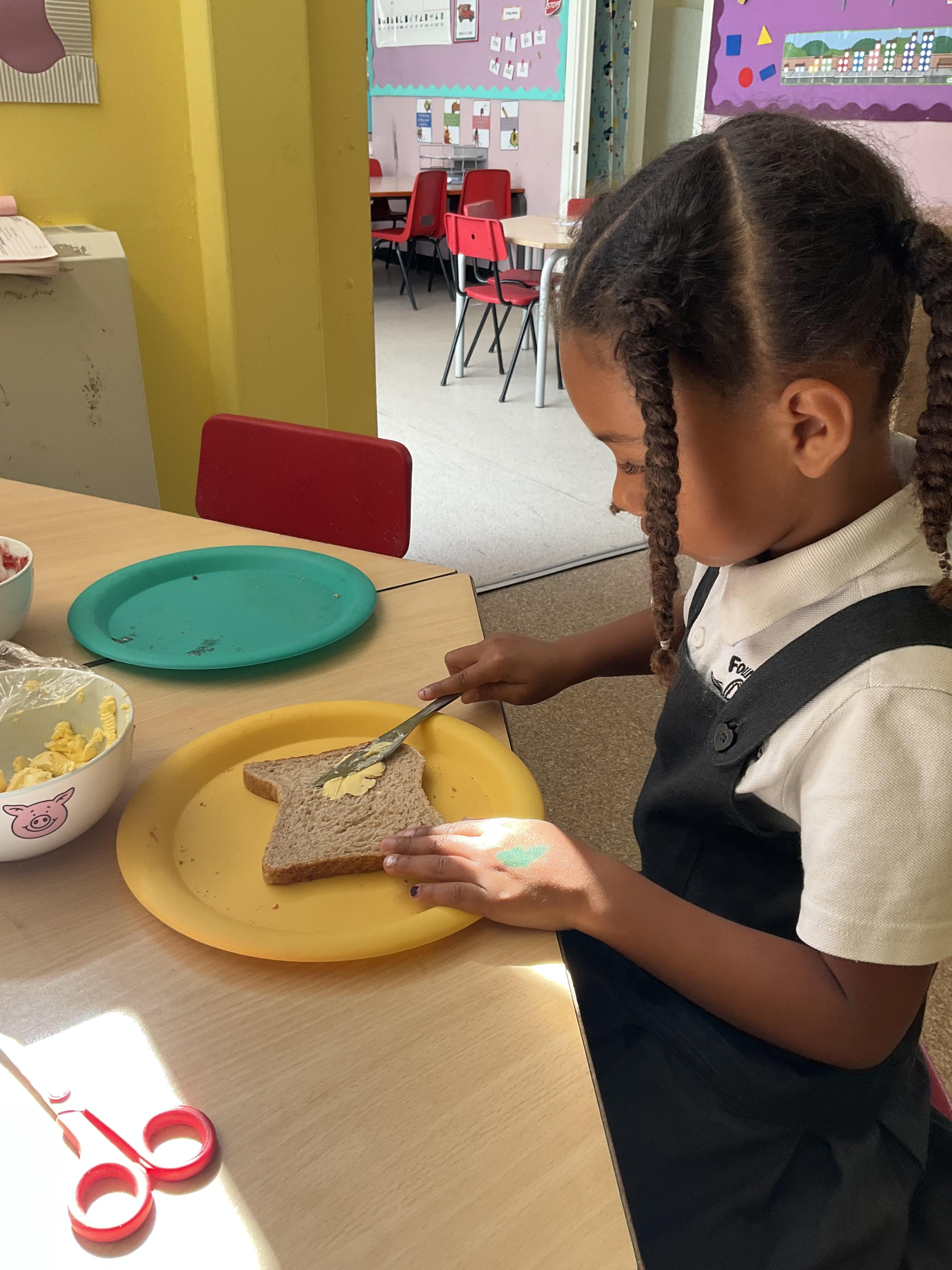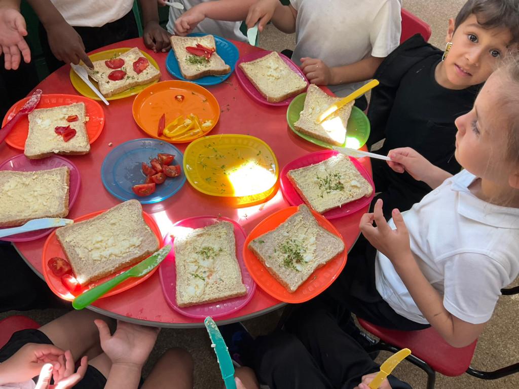 After reading the book, “Errol’s Garden”, the children planted cress seeds, which they watered everyday and looked after. Now it has grown beautifully so we decided to use it to garnish our sandwiches. They carefully used their fine motor skills skills to cut the cress plants and spread butter in their breads. Then they shelled the eggs to which they added mayonnaise and gave it a good mix. The children then added tomatoes, peppers and cress to their egg sandwiches, which they throughly enjoyed.