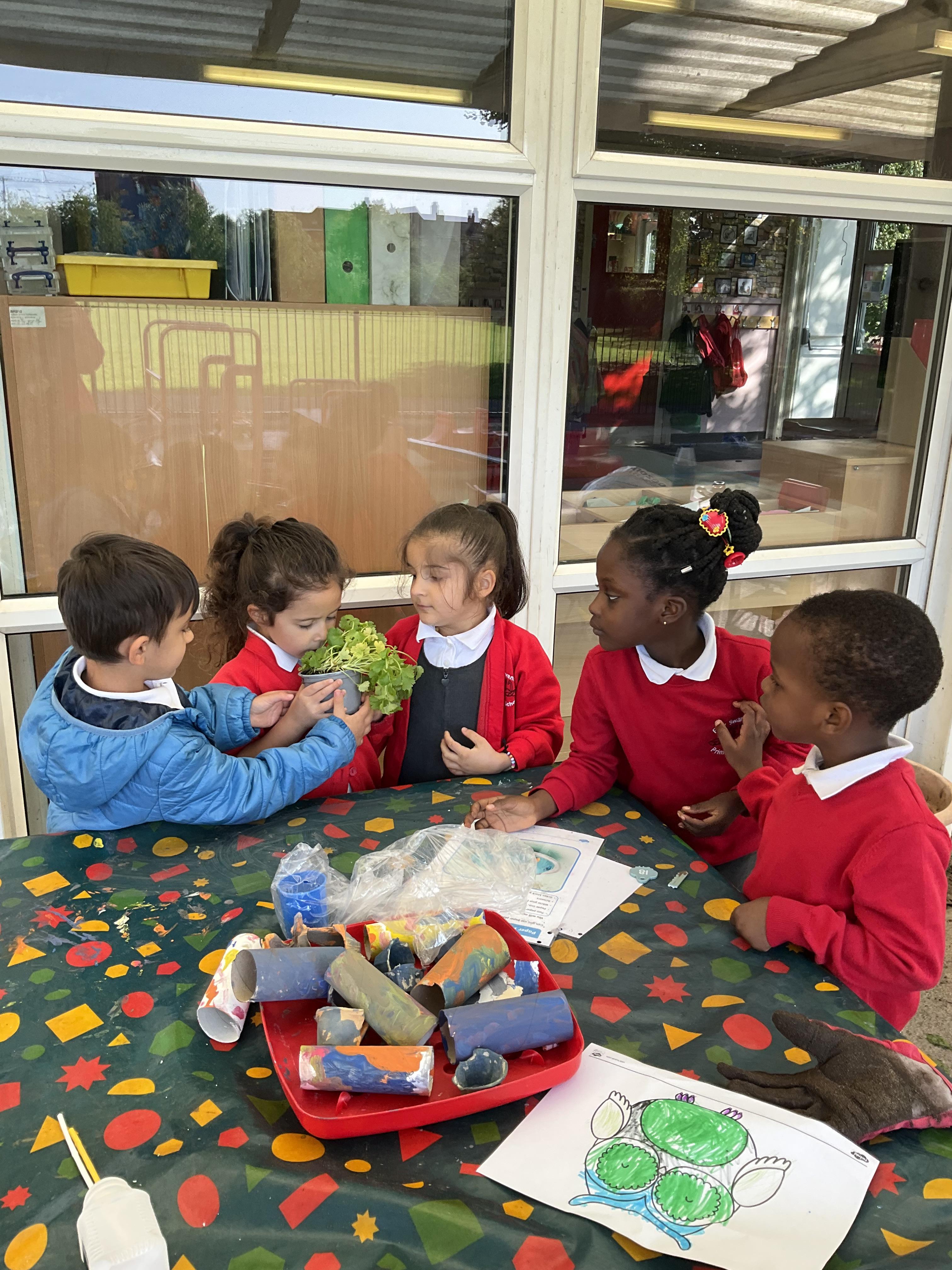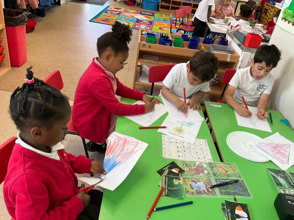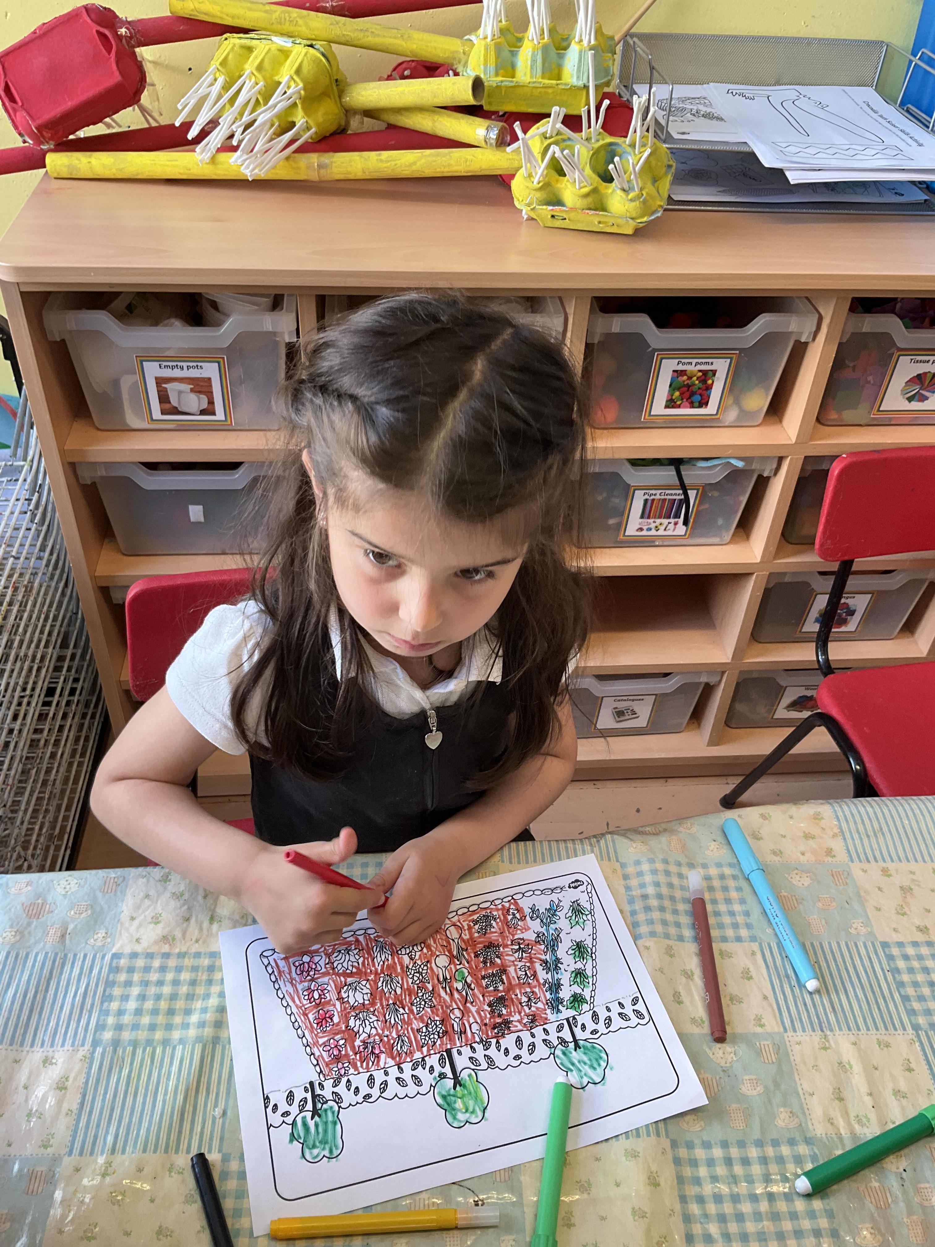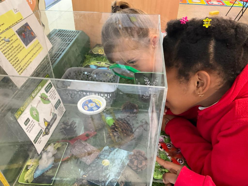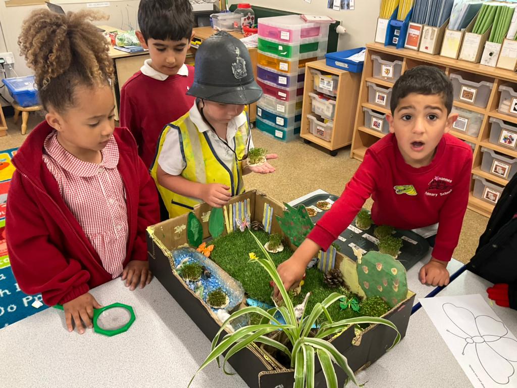 It has been an exciting week as our caterpillars arrived. The children have been learning about the life cycle of a butterfly and have designed a butterfly garden using plants and junk modelling materials. They coloured the bubble wrap in blue to make the pond. Then they placed the cress they grew around the garden. They learnt that plants need soil, water and space to grow. They used their cutting and sticking skills to design the butterfly garden.