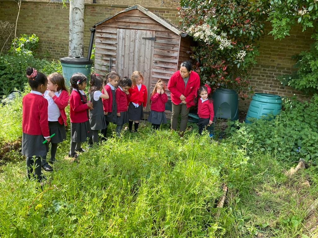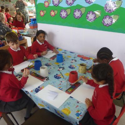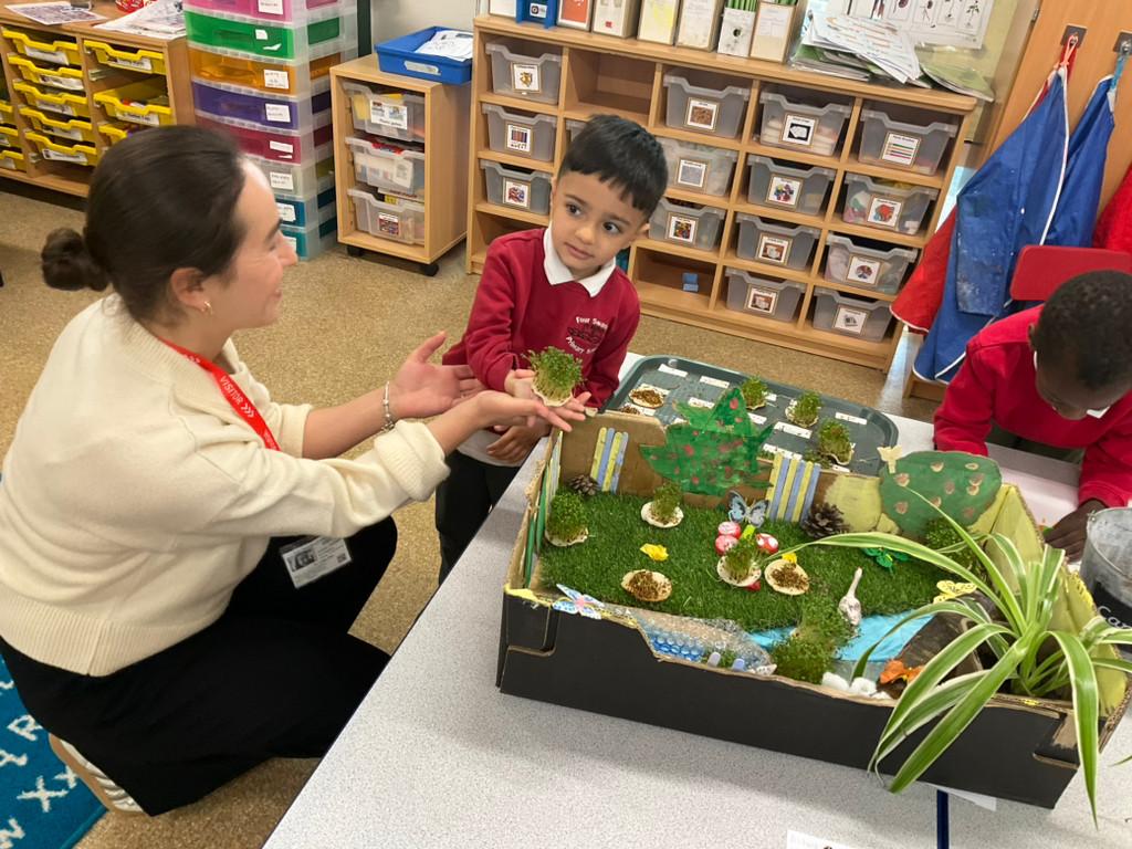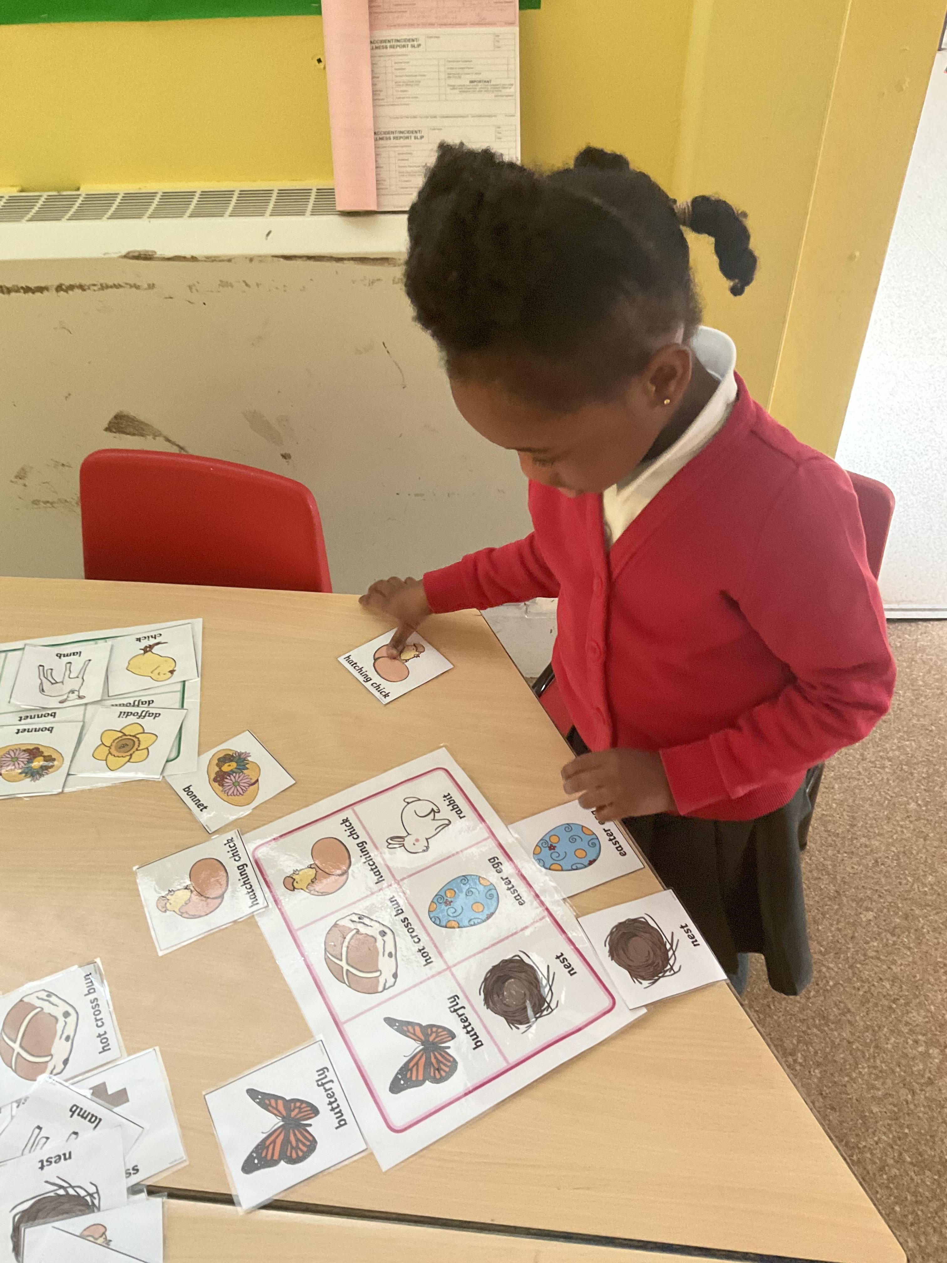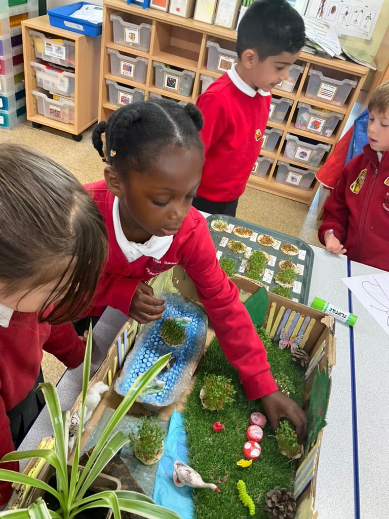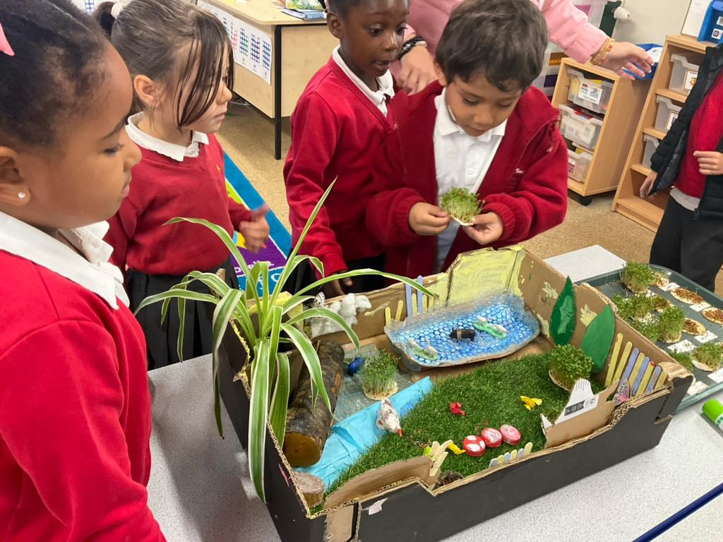 It has been an exciting week as our caterpillars arrived. The children have been learning about the life cycle of a butterfly and have designed a butterfly garden using plants and junk modelling materials. They coloured the bubble wrap in blue to make the pond. Then they placed the cress they grew around the garden. They learnt that plants need soil, water and space to grow. They used their cutting and sticking skills to design the butterfly garden.