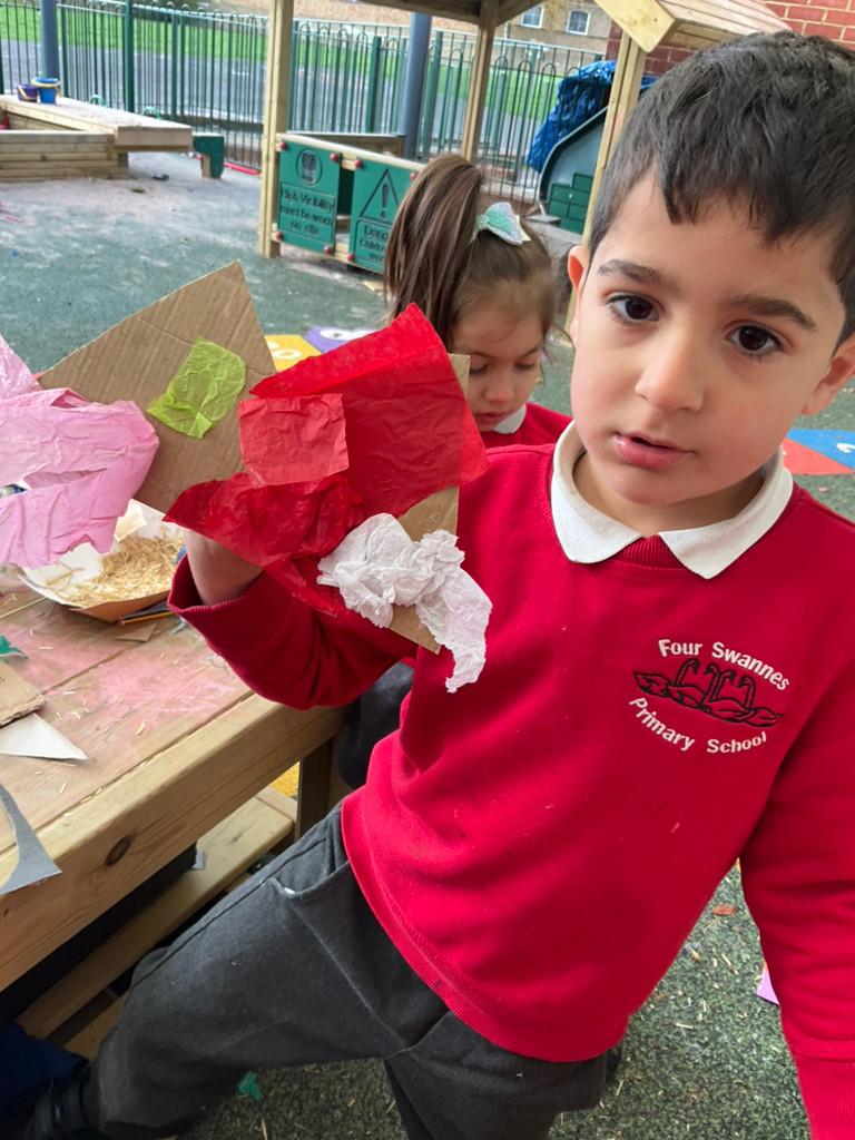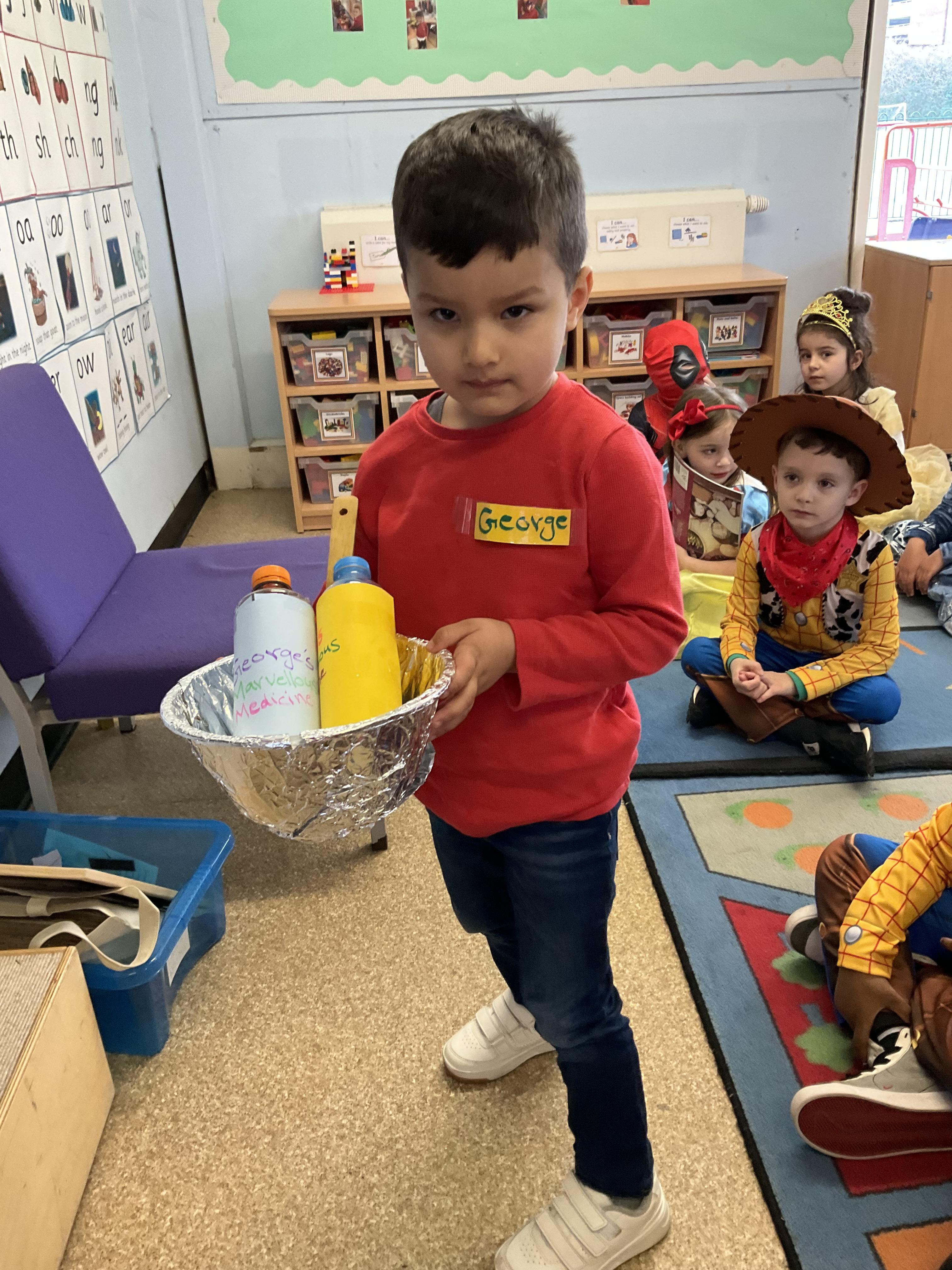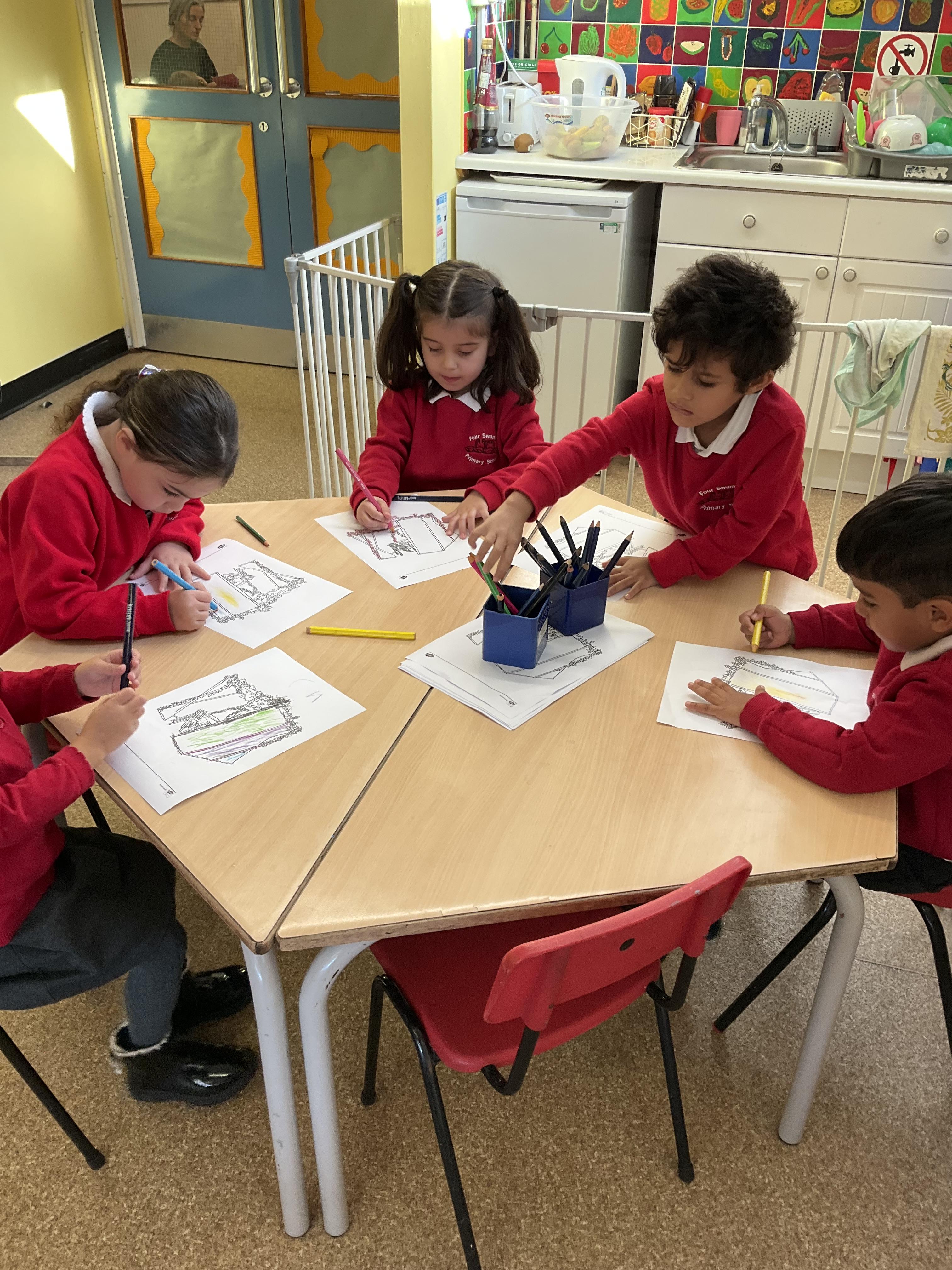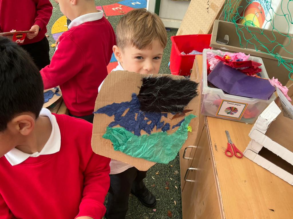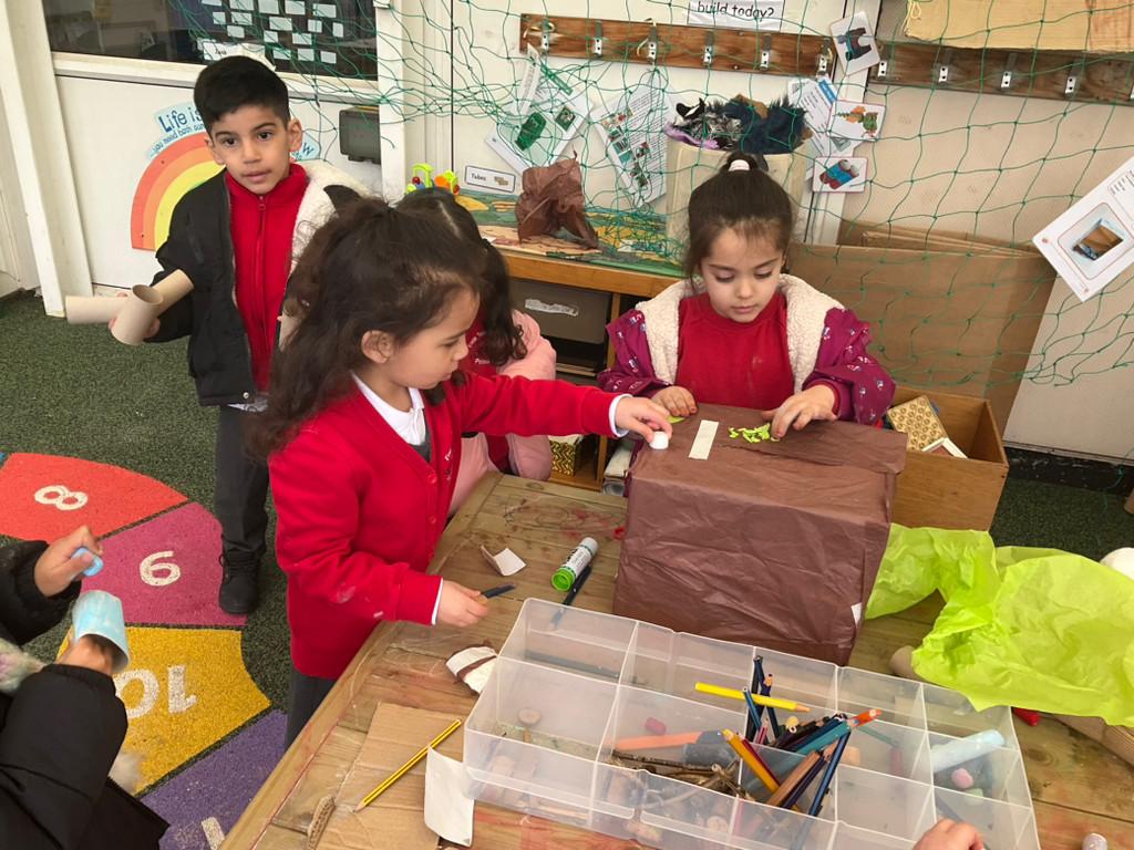 This week we read the book George and the dragon by Christopher Wormell. The children enjoyed making shields in the junk modelling area using cardboard, tissue papers, masking tapes and PVA glue. They worked as a team sharing ideas and resources and tried to use the pattern knowledge from maths when designing their shields.