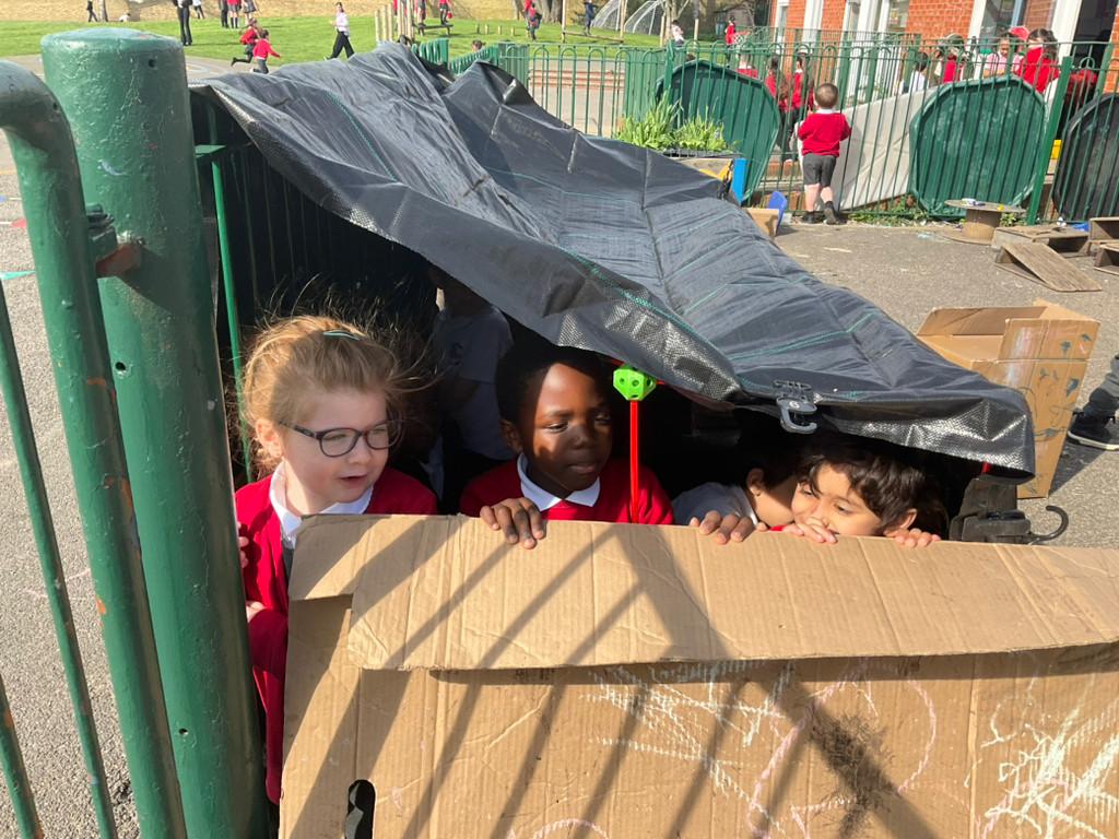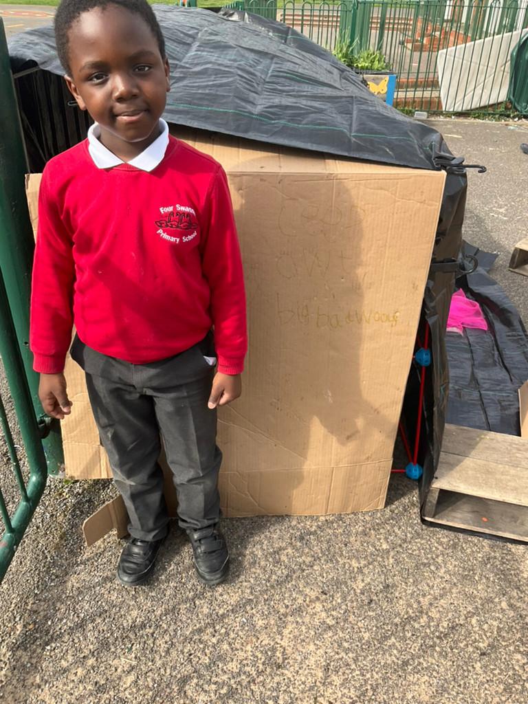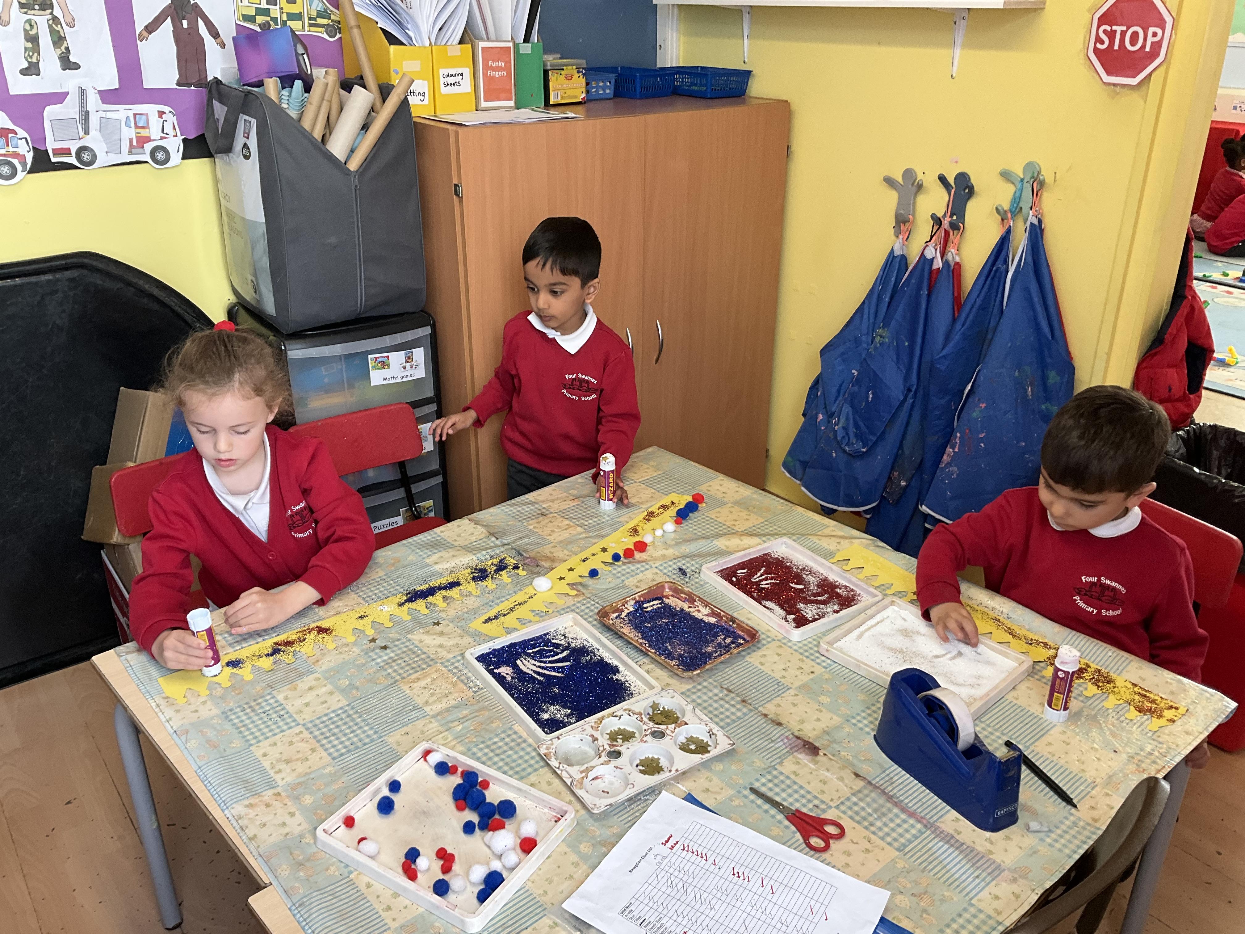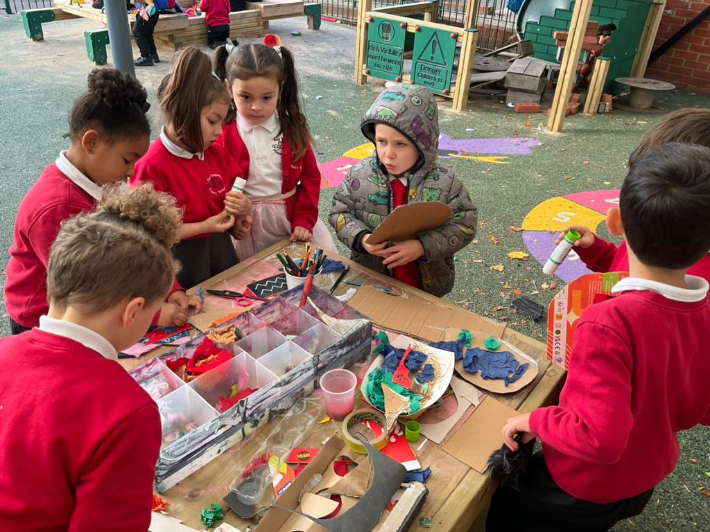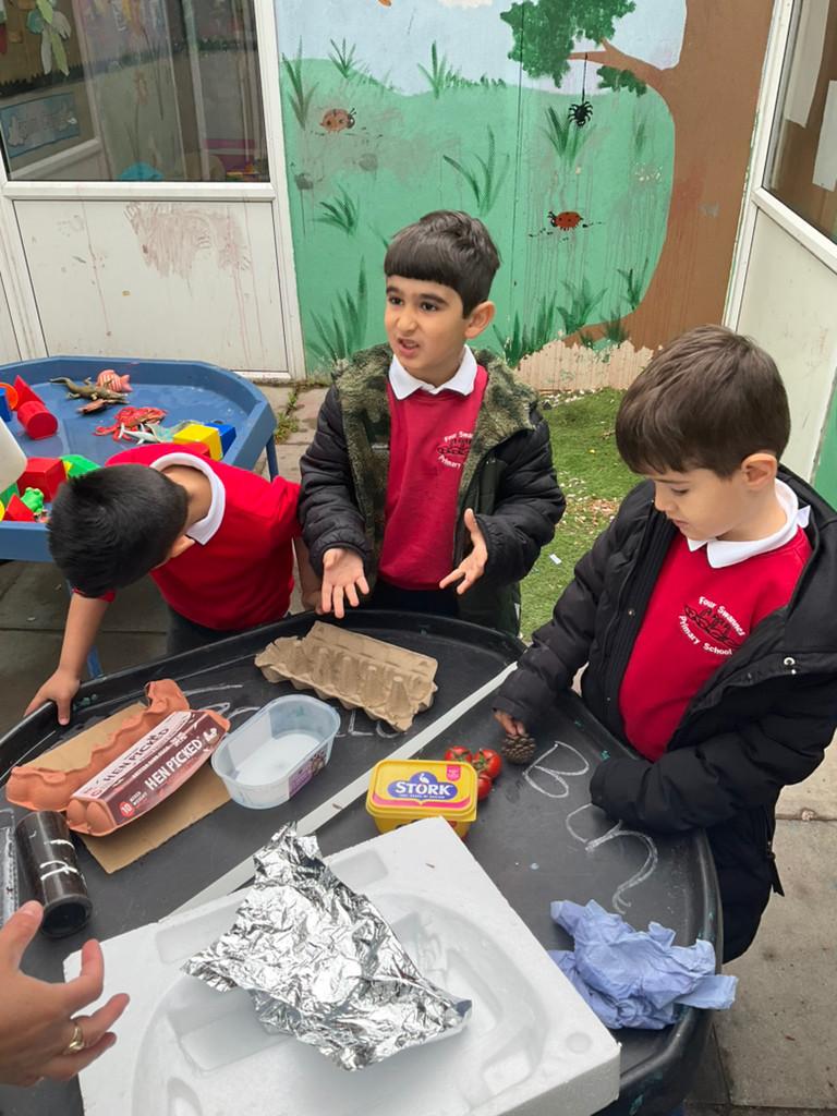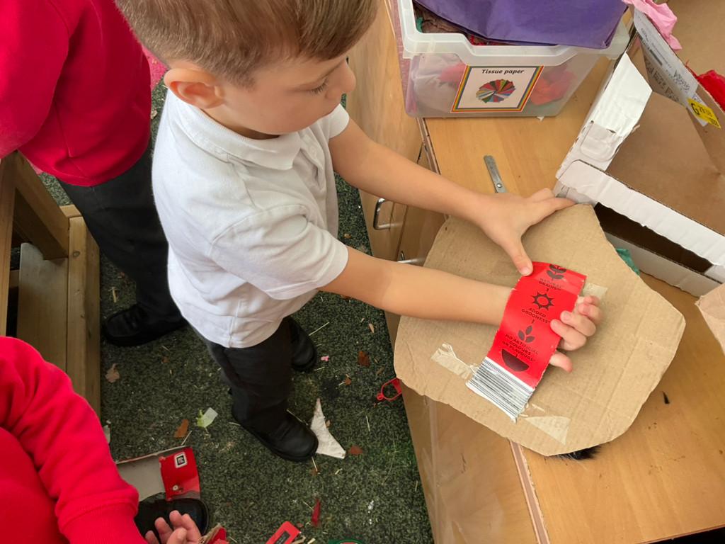 This week we read the book George and the dragon by Christopher Wormell. The children enjoyed making shields in the junk modelling area using cardboard, tissue papers, masking tapes and PVA glue. They worked as a team sharing ideas and resources and tried to use the pattern knowledge from maths when designing their shields.
