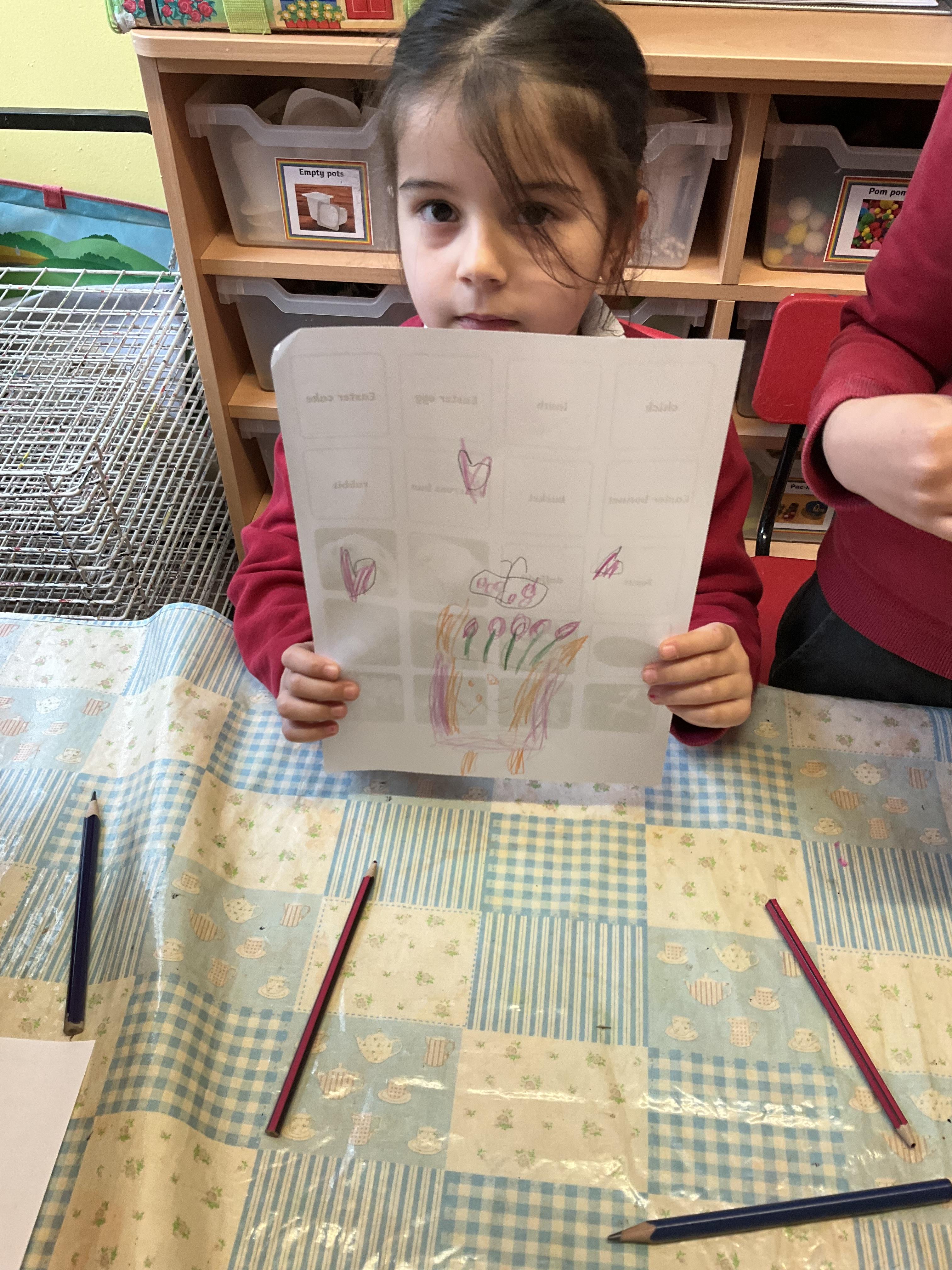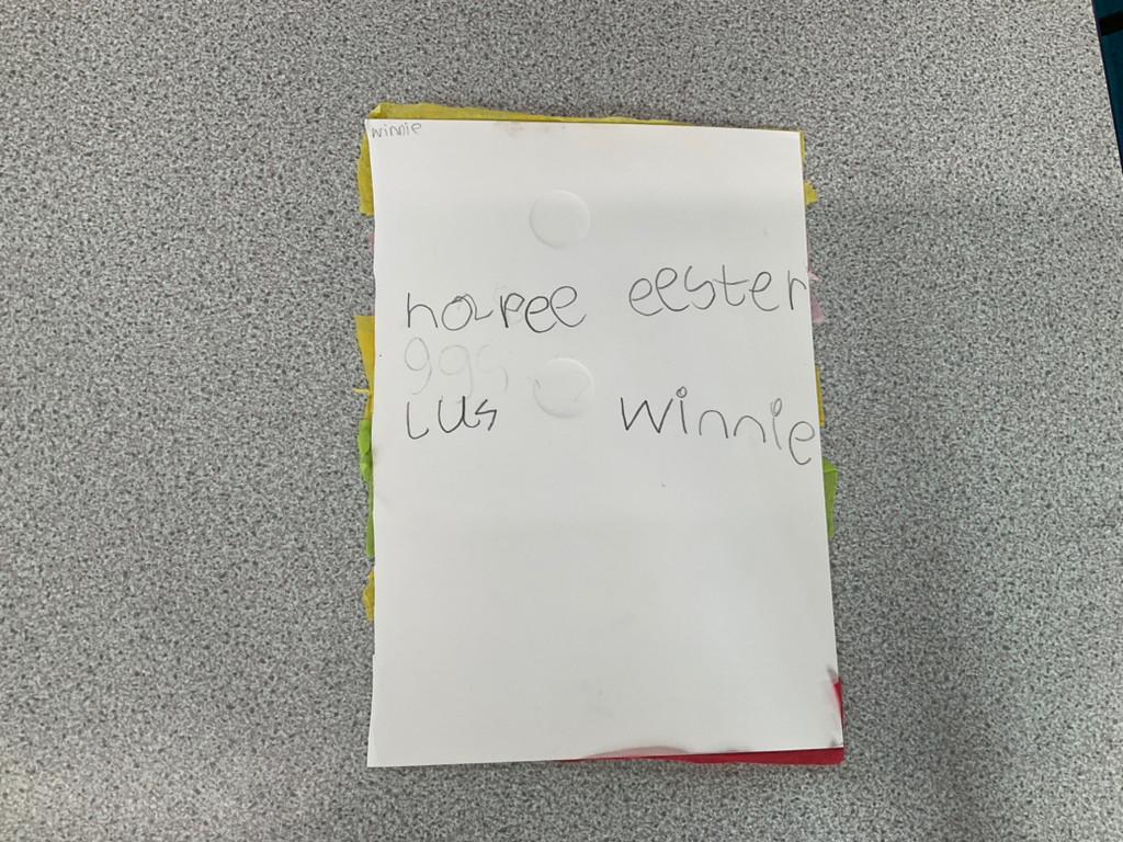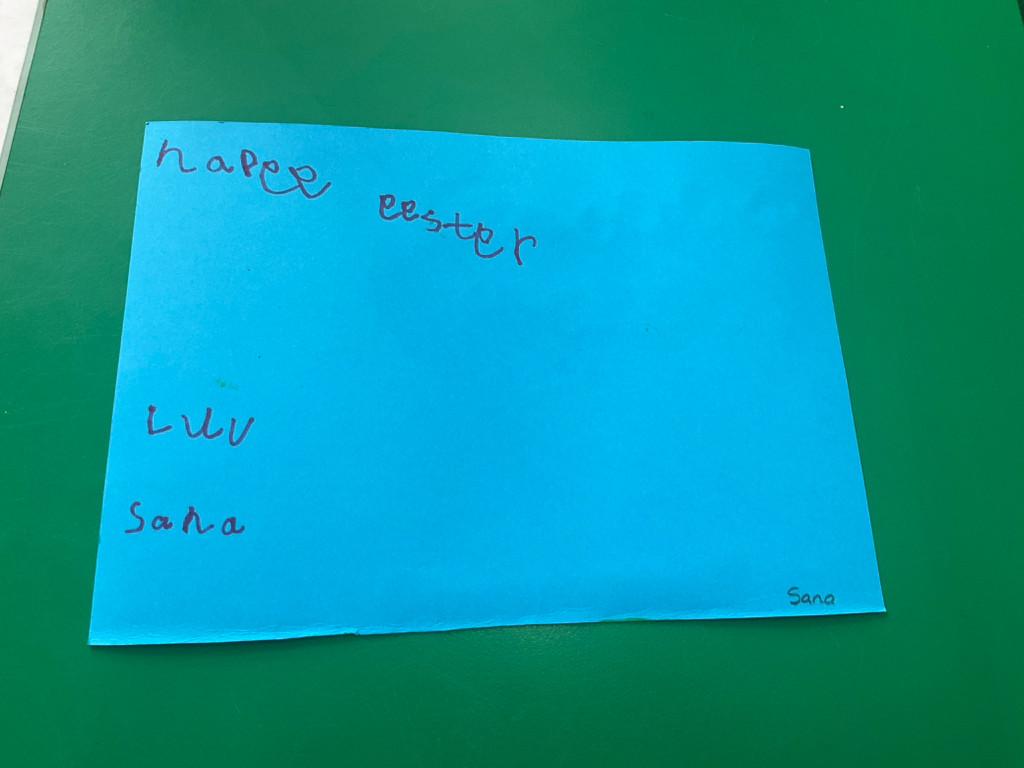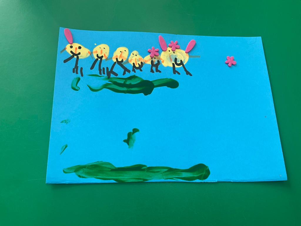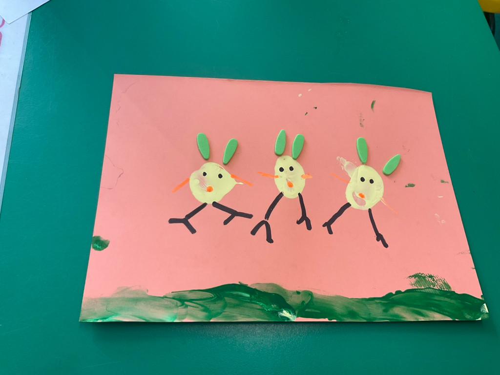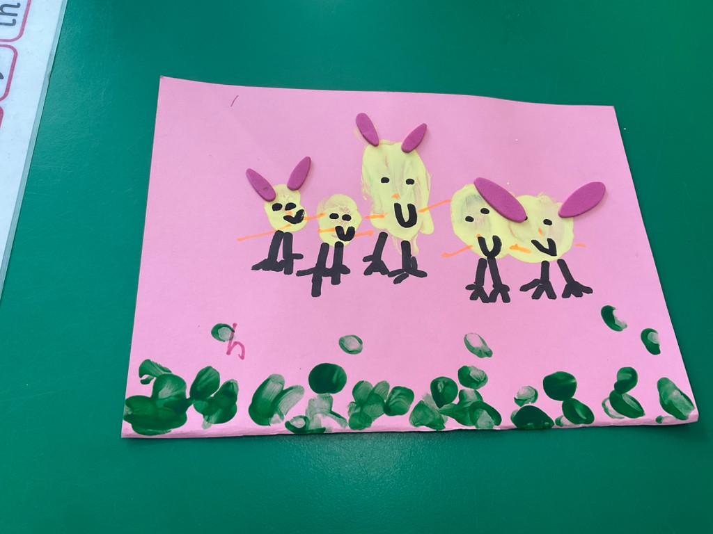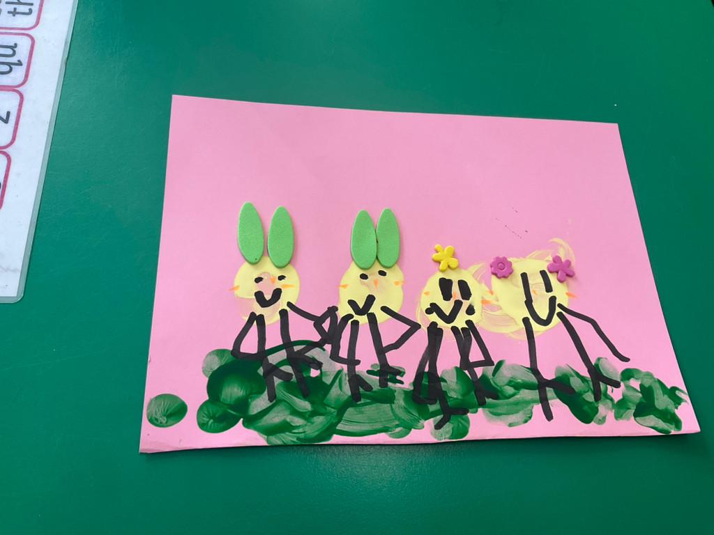 The children used their fingerprints to create their Easter cards. They had to use their fine motor skills to stick the bunny ears and flowers. Then they used their phonetic knowledge to write a message in their cards.