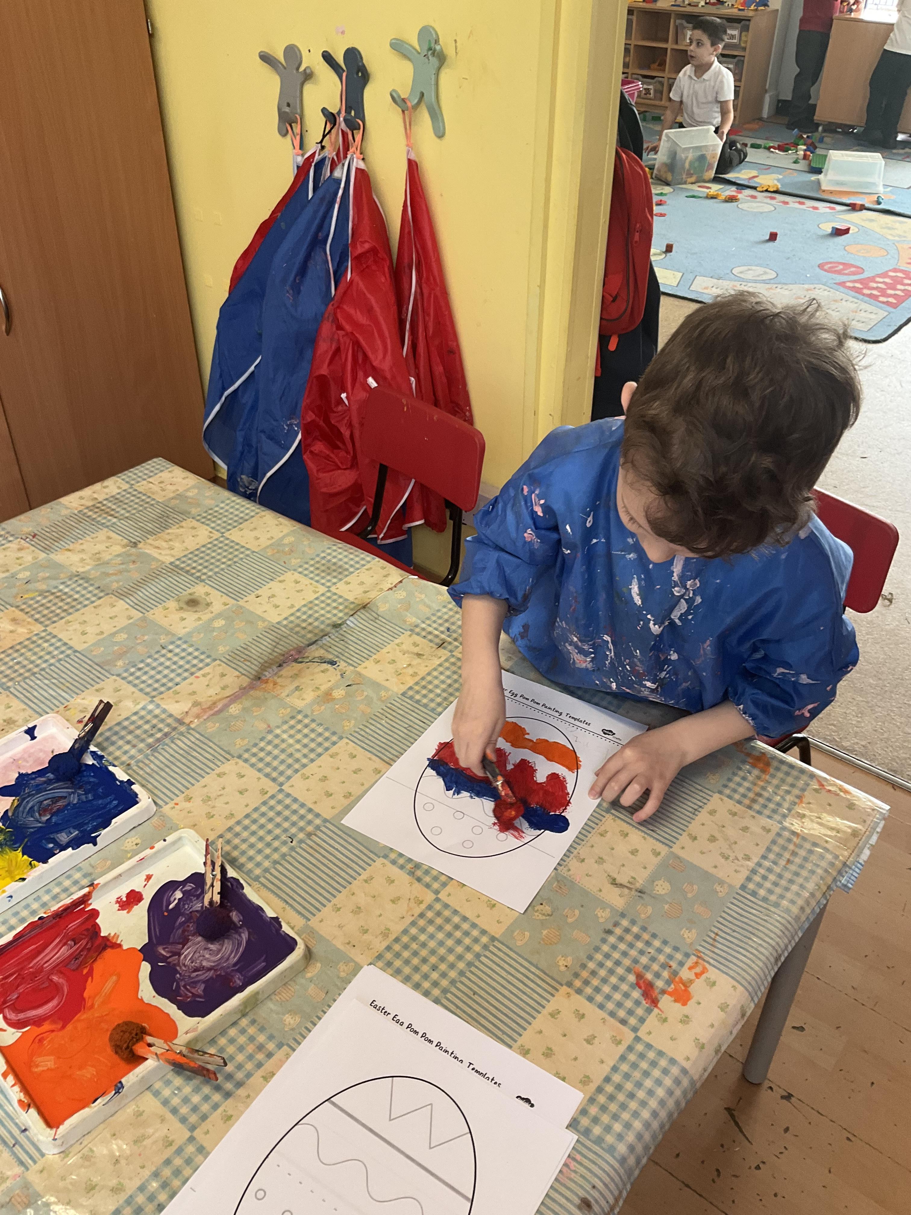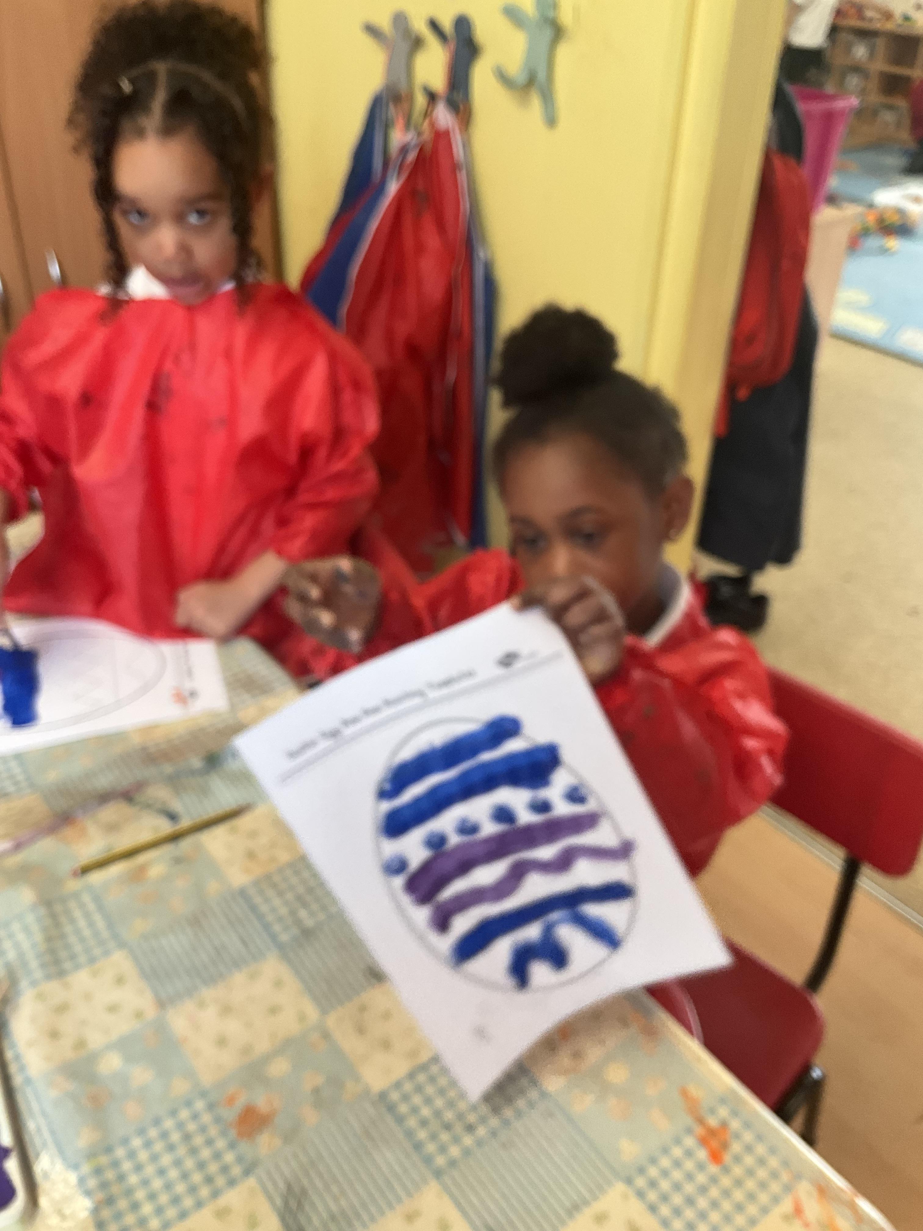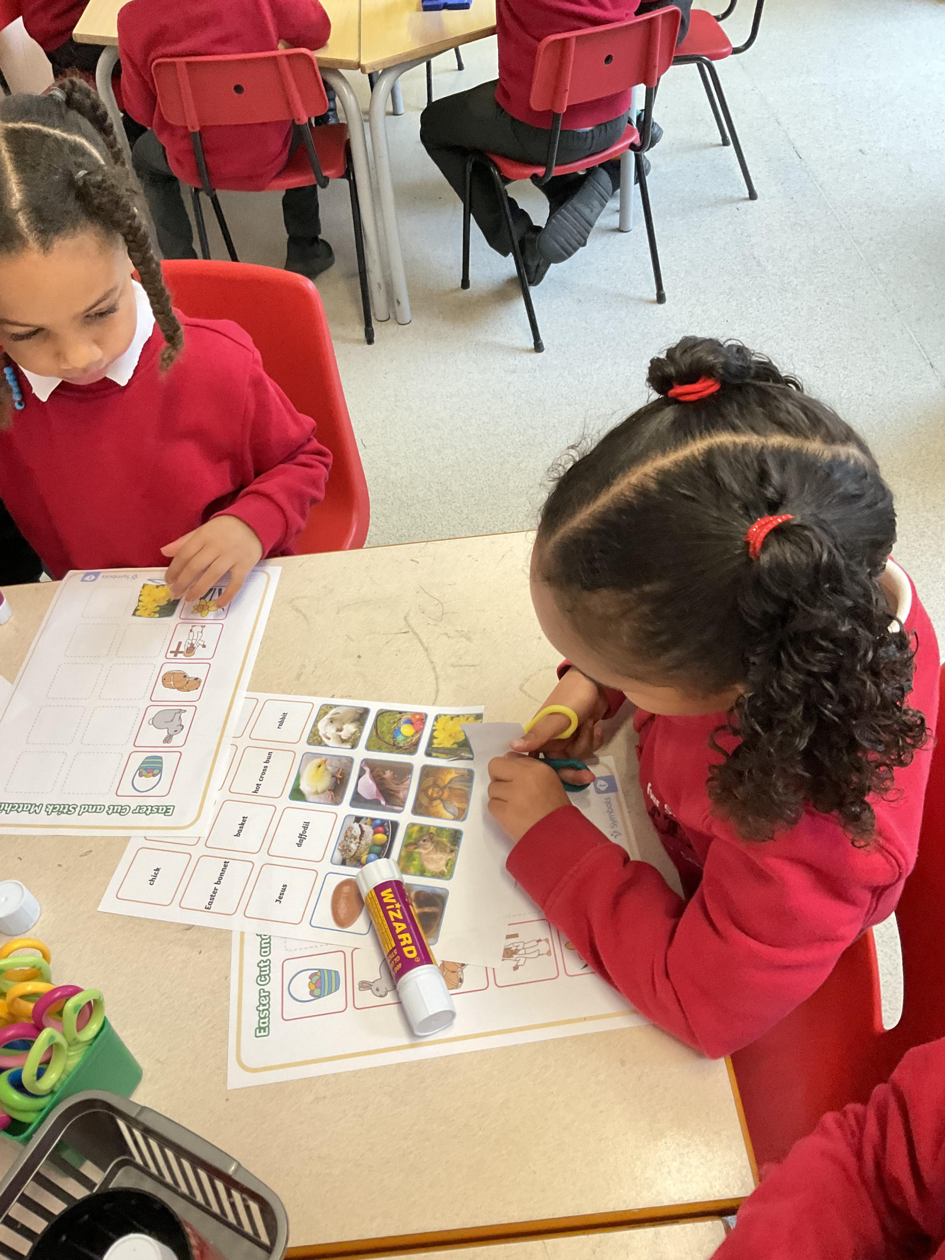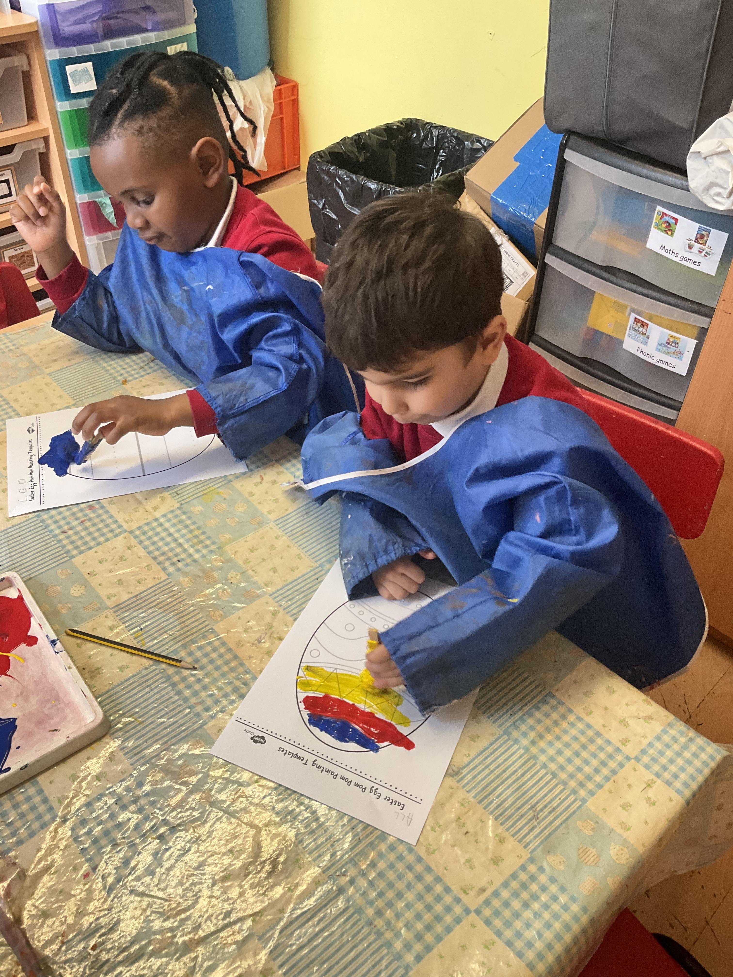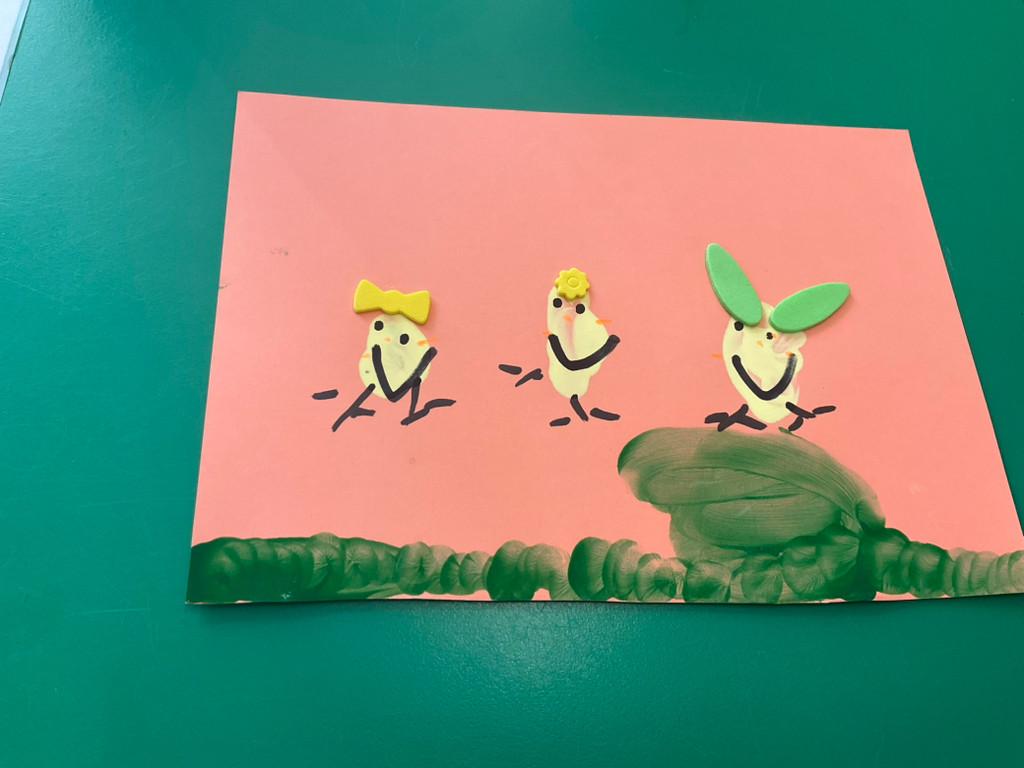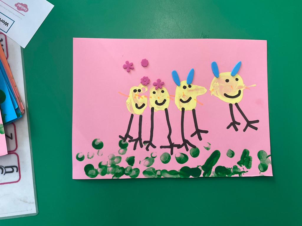 The children used their fingerprints to create their Easter cards. They had to use their fine motor skills to stick the bunny ears and flowers. Then they used their phonetic knowledge to write a message in their cards.