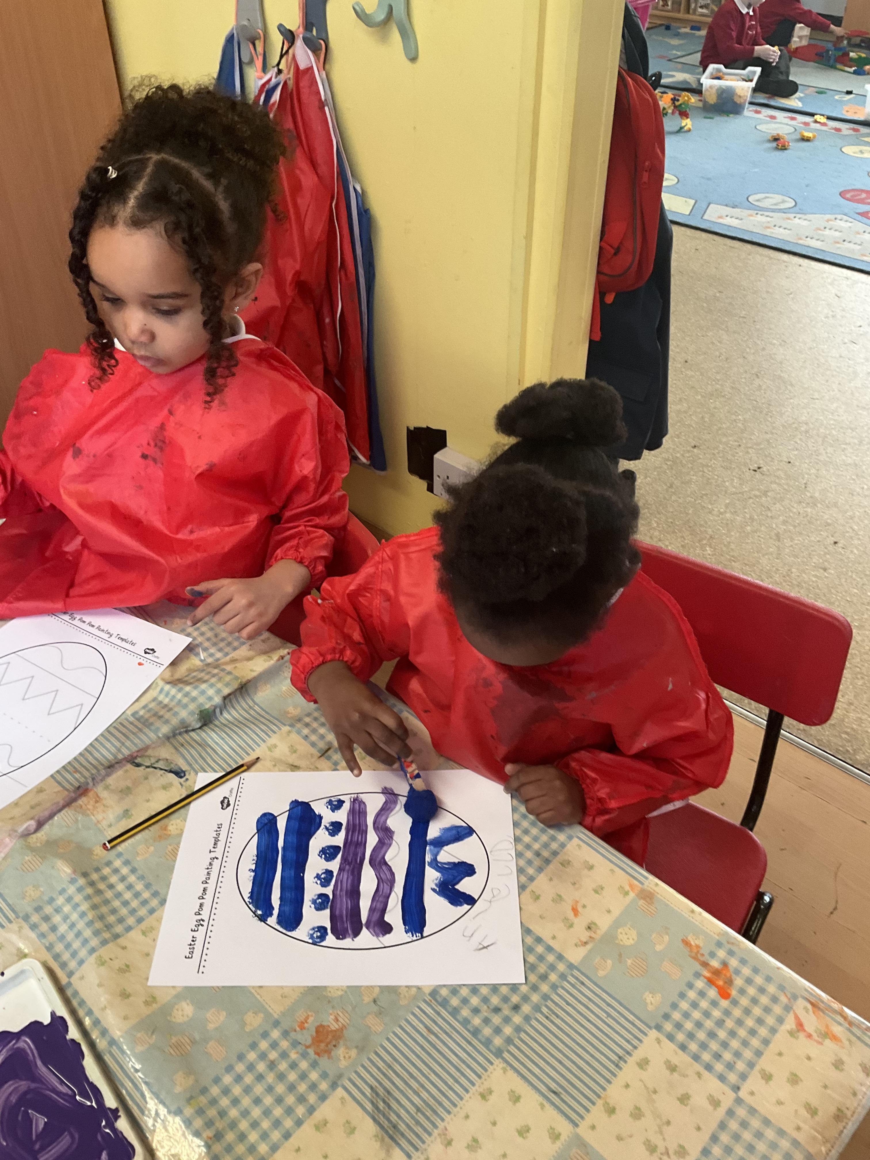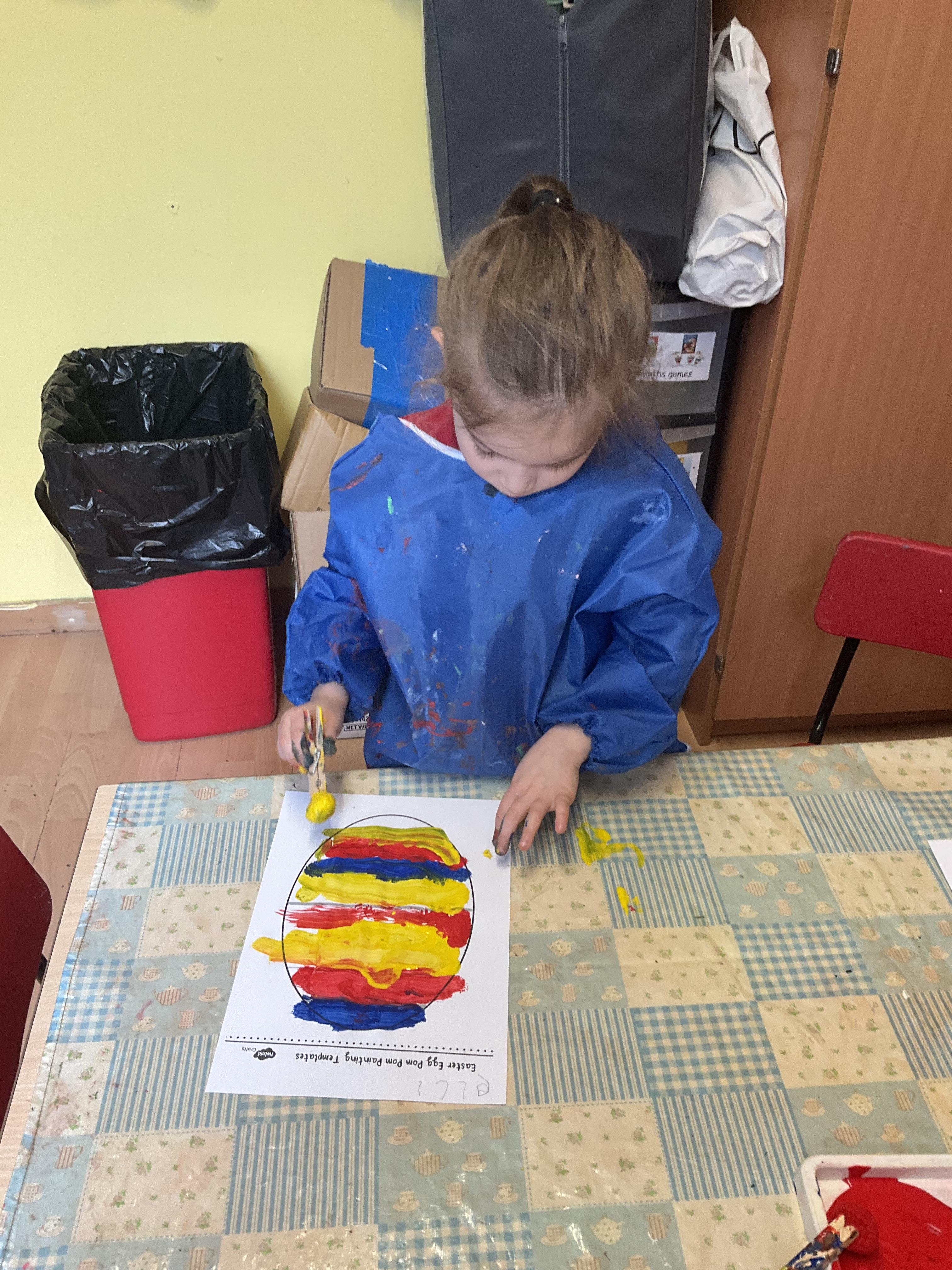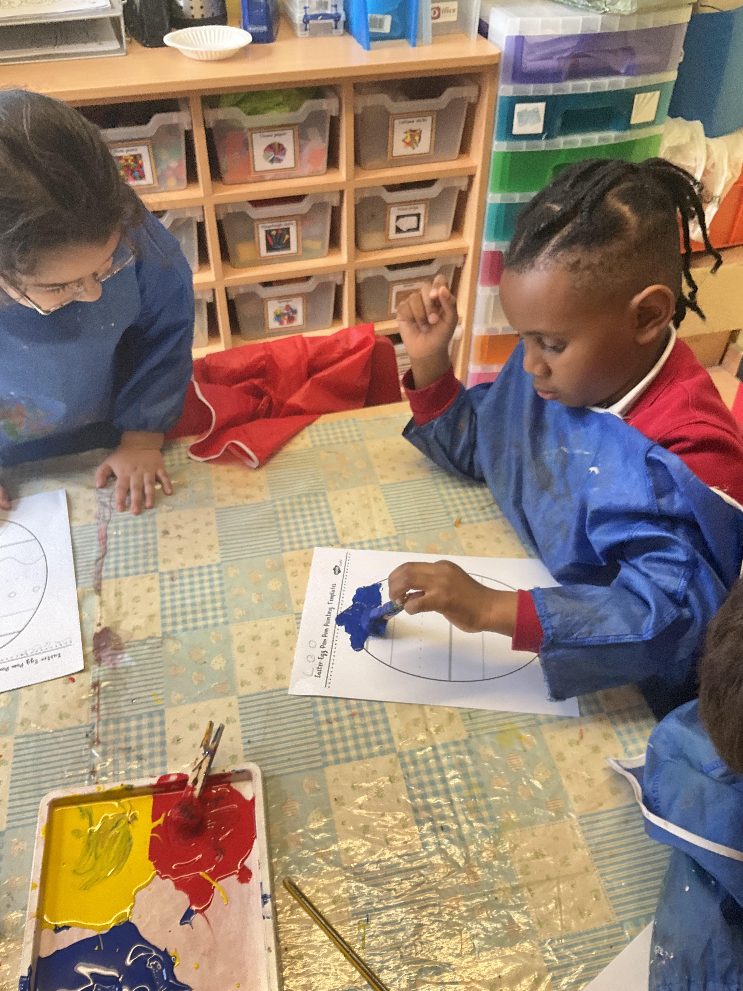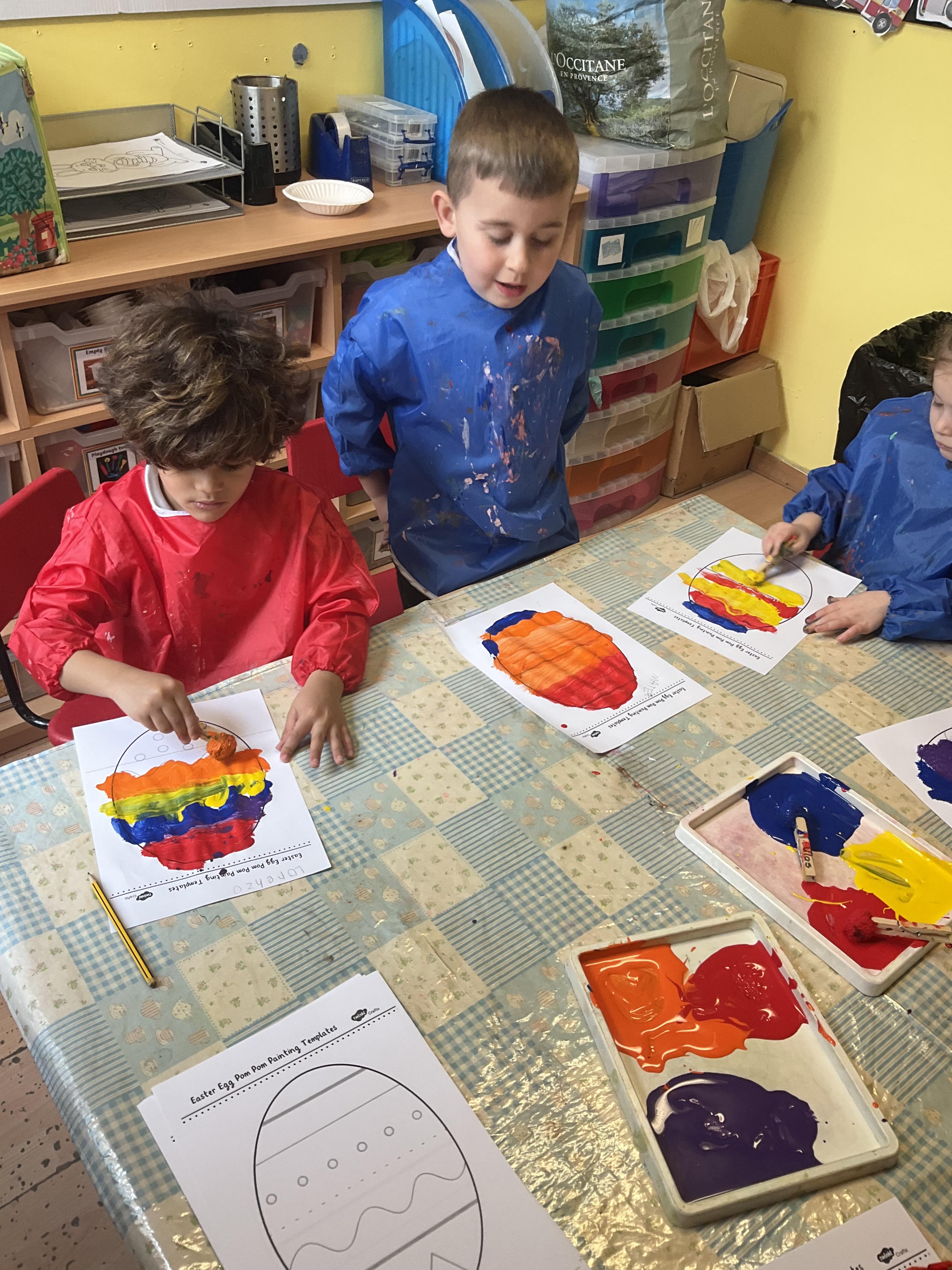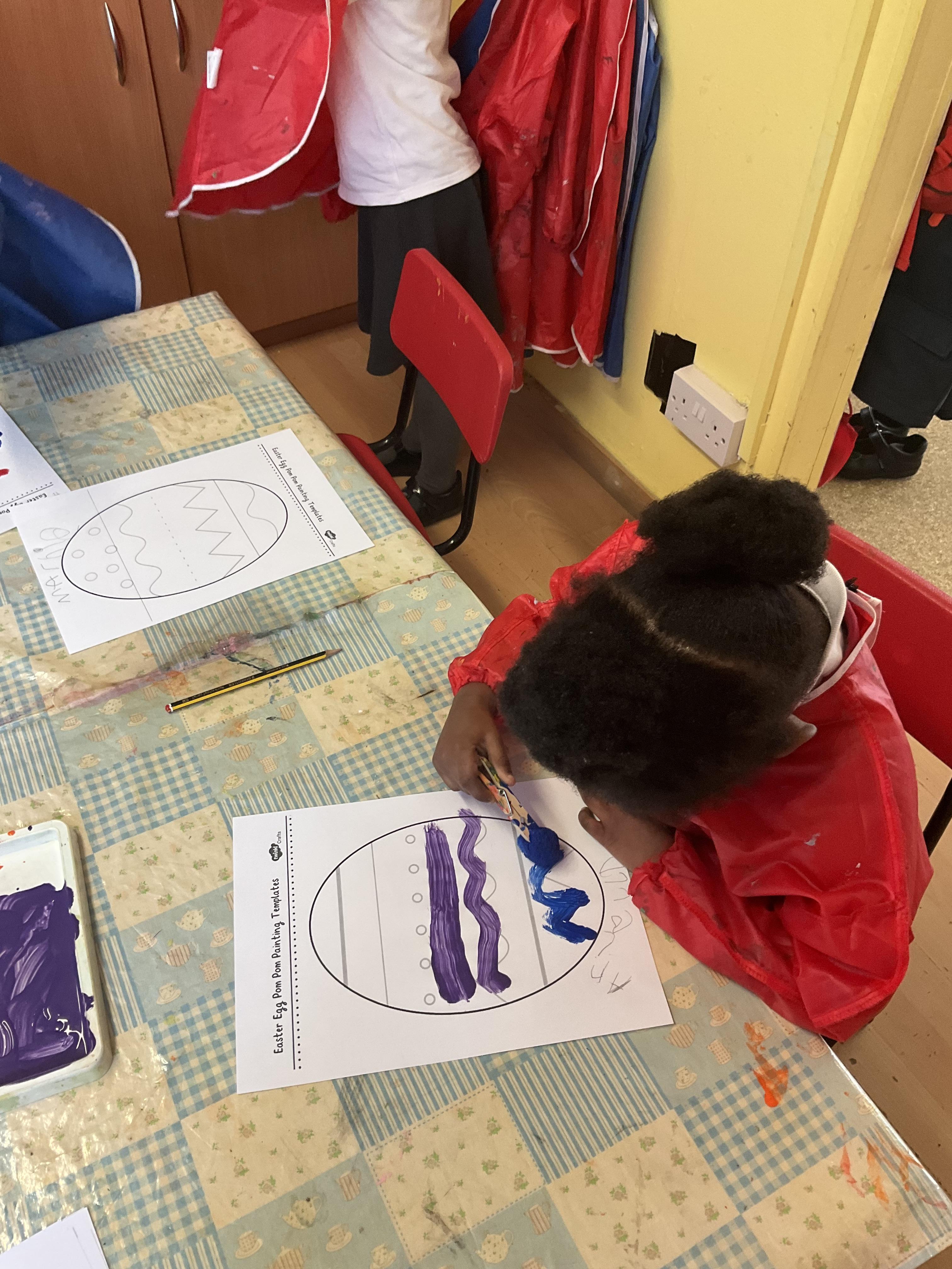 The children used their fingerprints to create their Easter cards. They had to use their fine motor skills to stick the bunny ears and flowers. Then they used their phonetic knowledge to write a message in their cards.