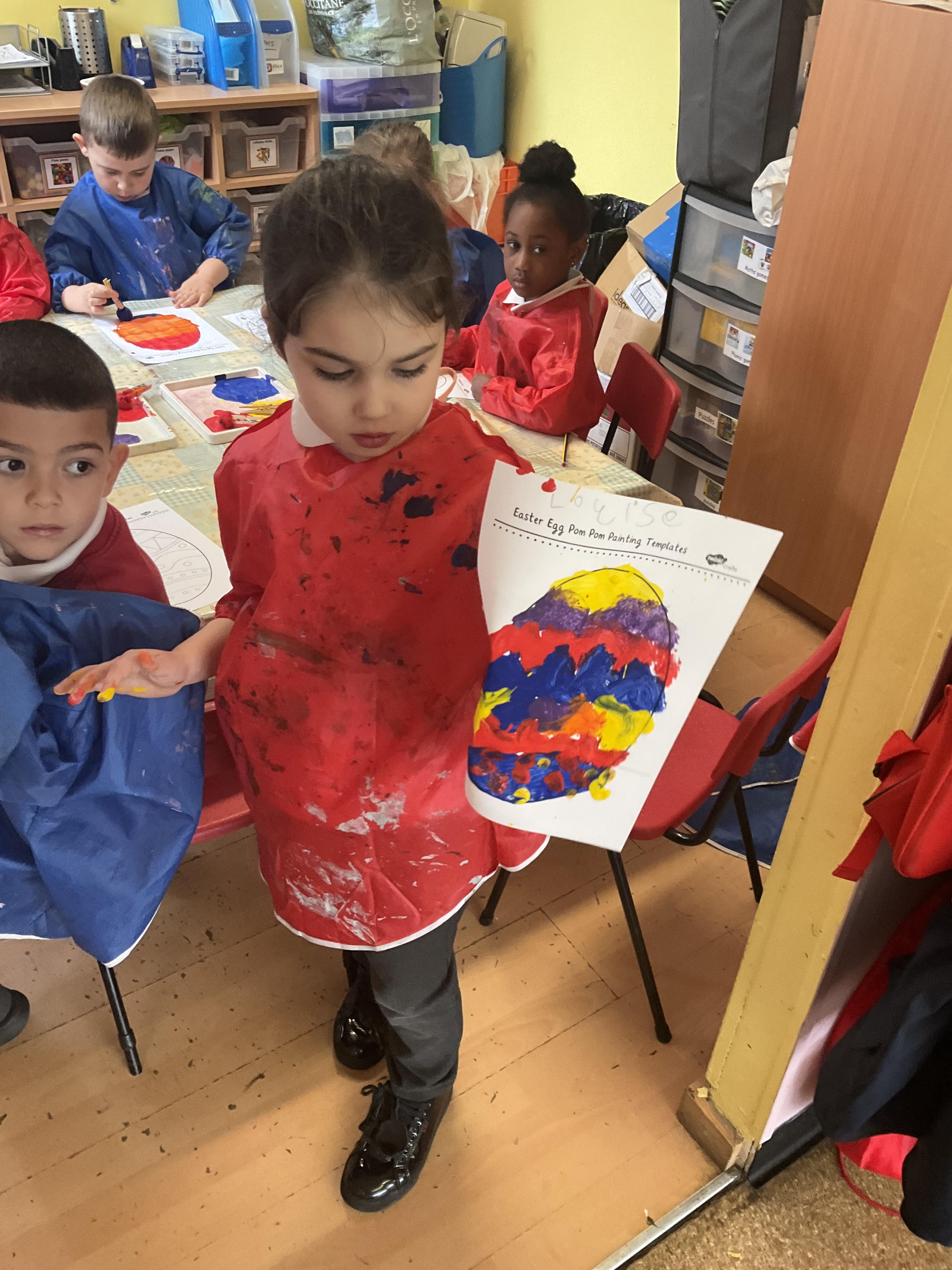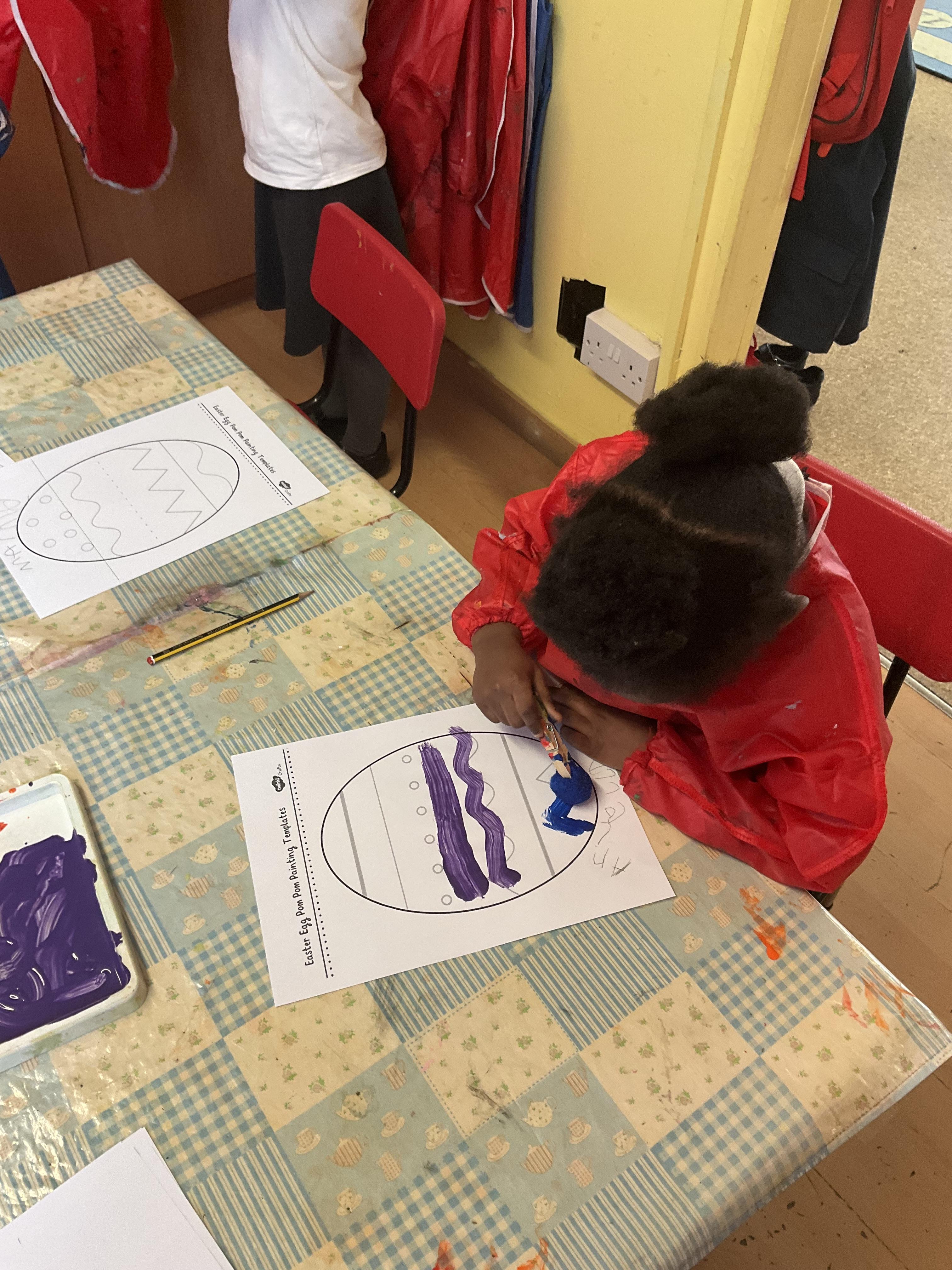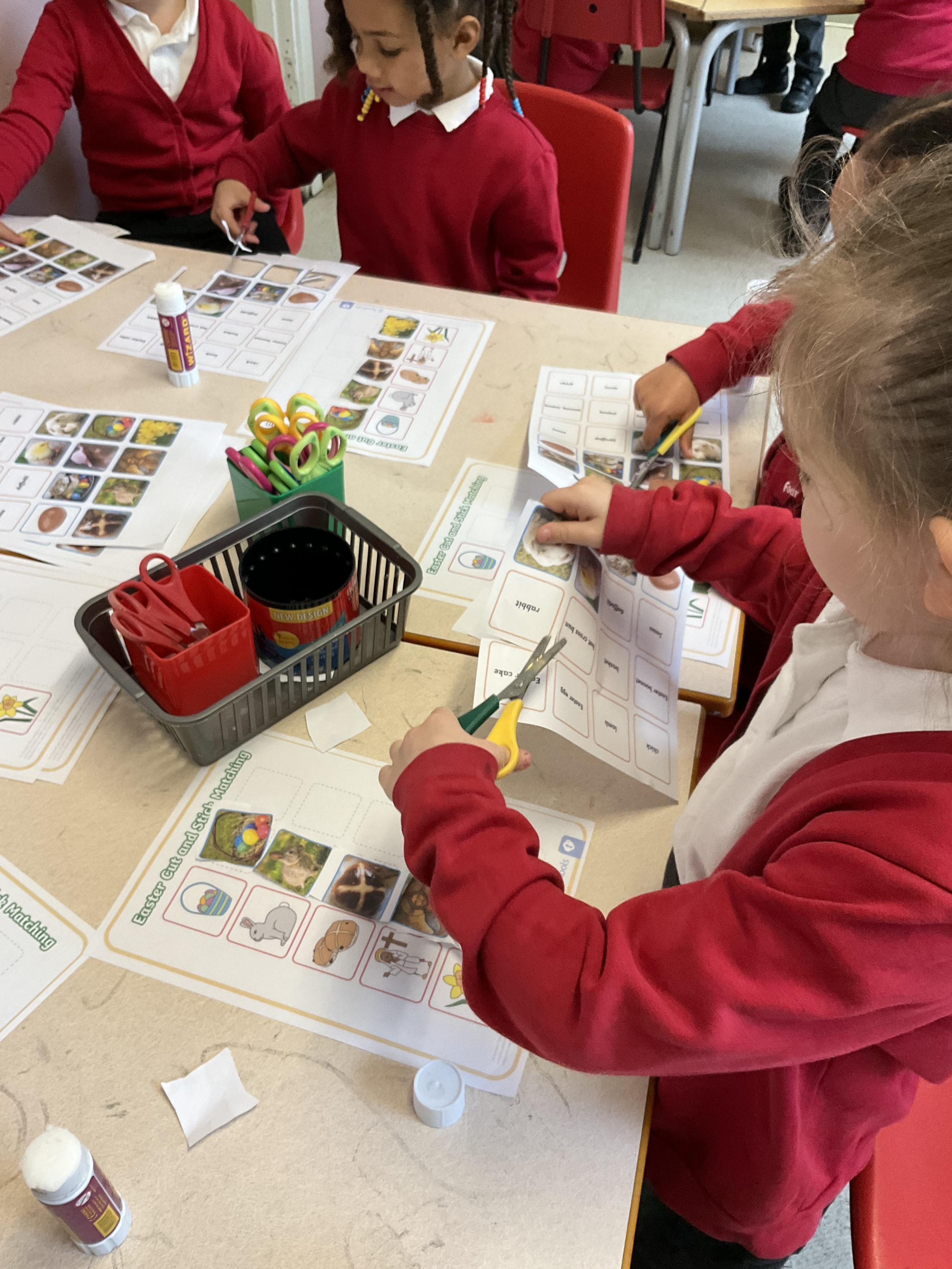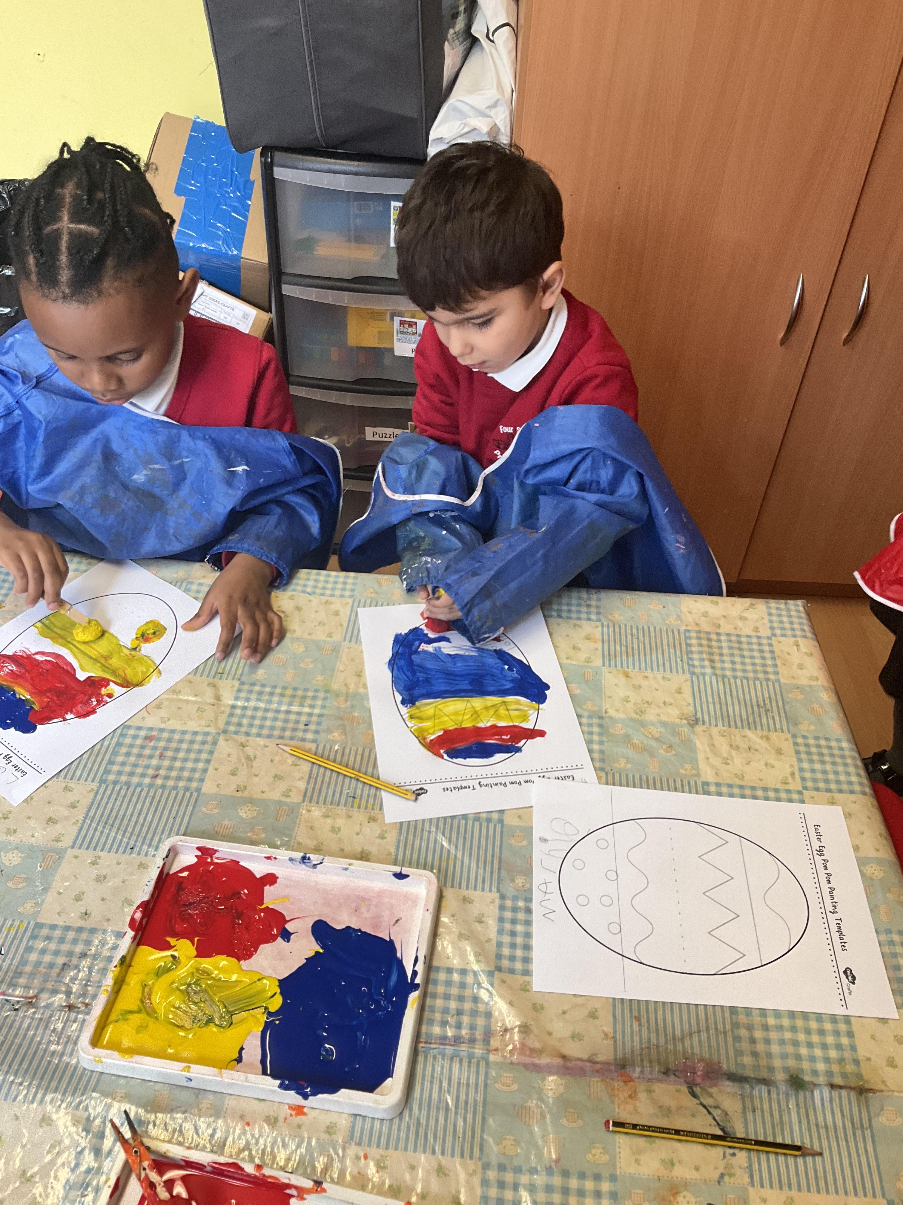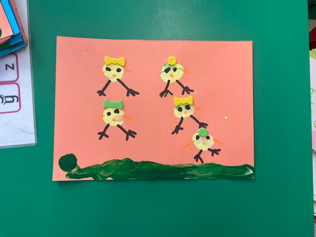 The children used their fingerprints to create their Easter cards. They had to use their fine motor skills to stick the bunny ears and flowers. Then they used their phonetic knowledge to write a message in their cards.