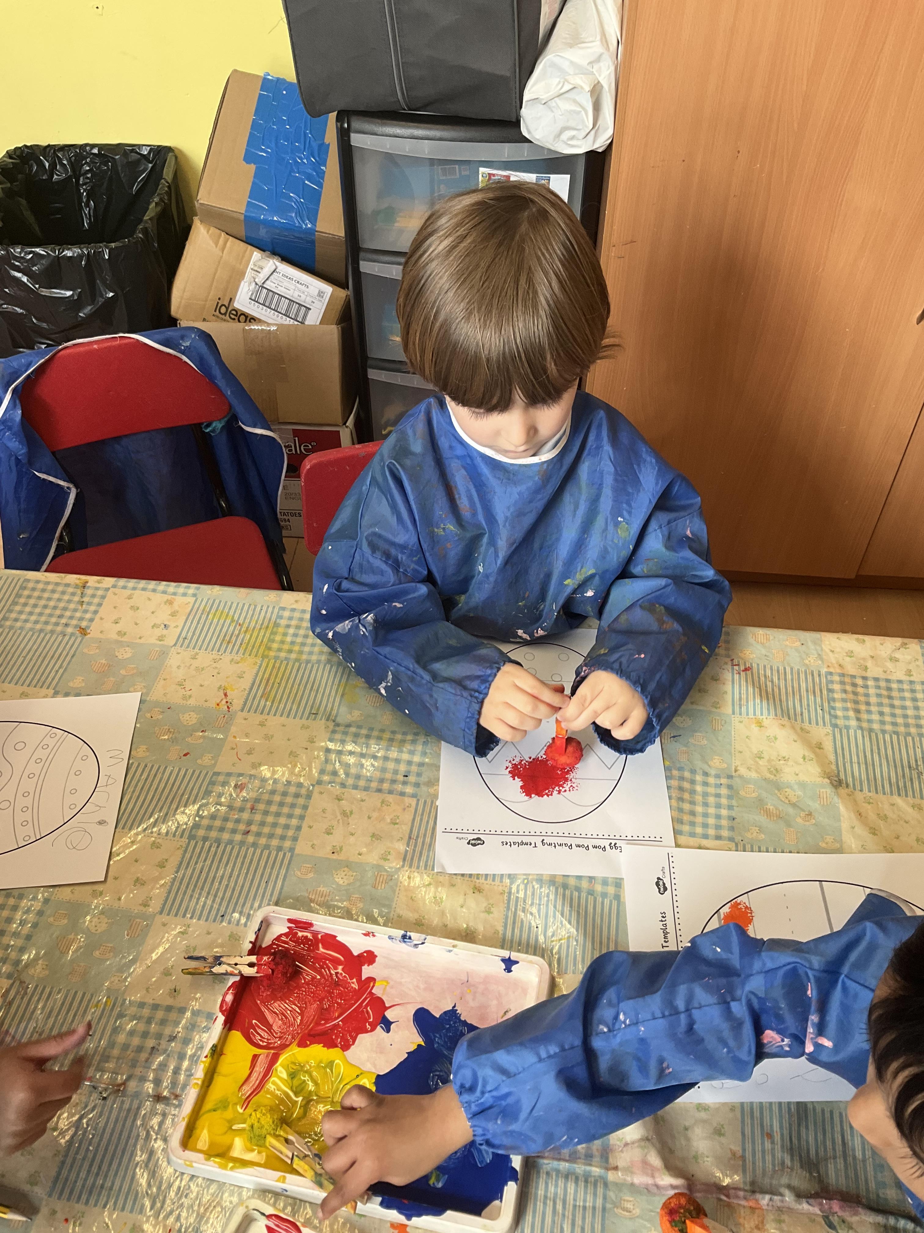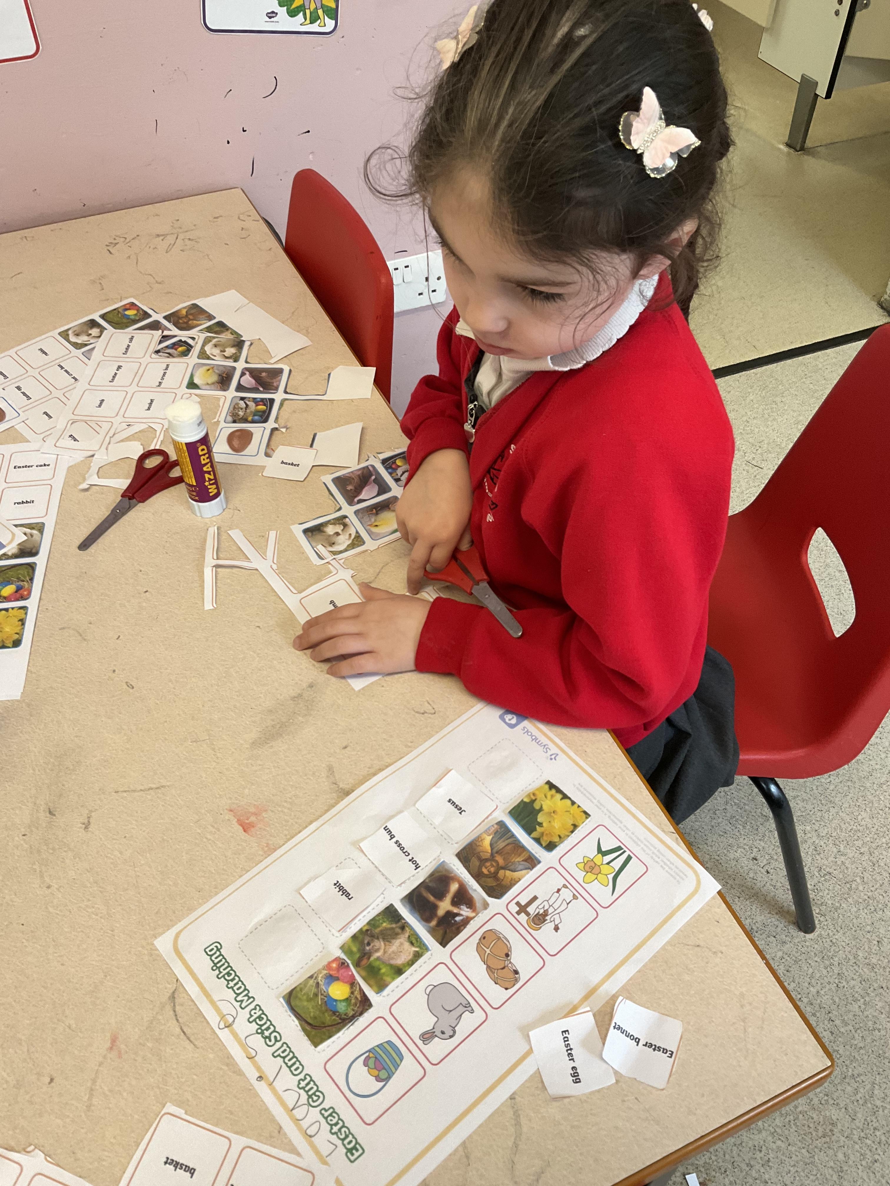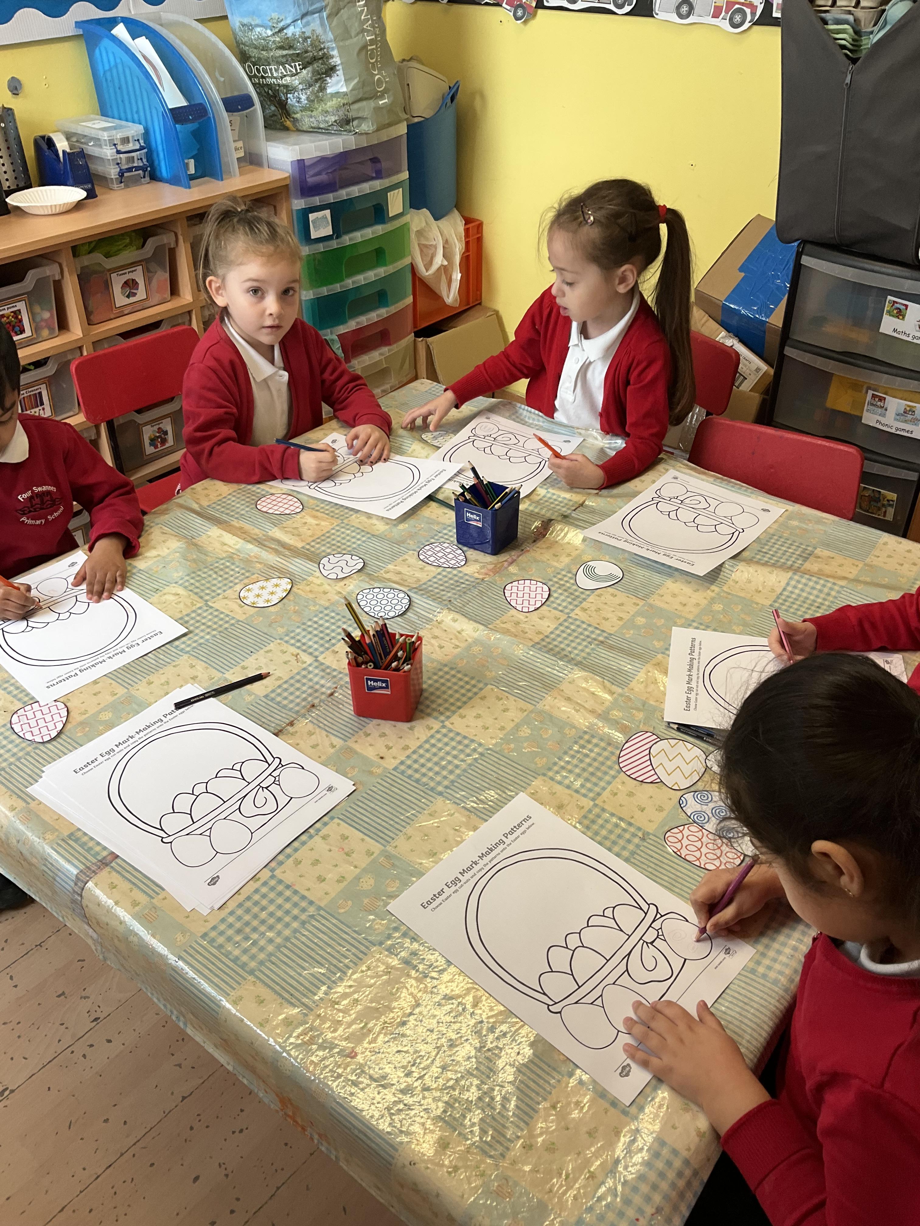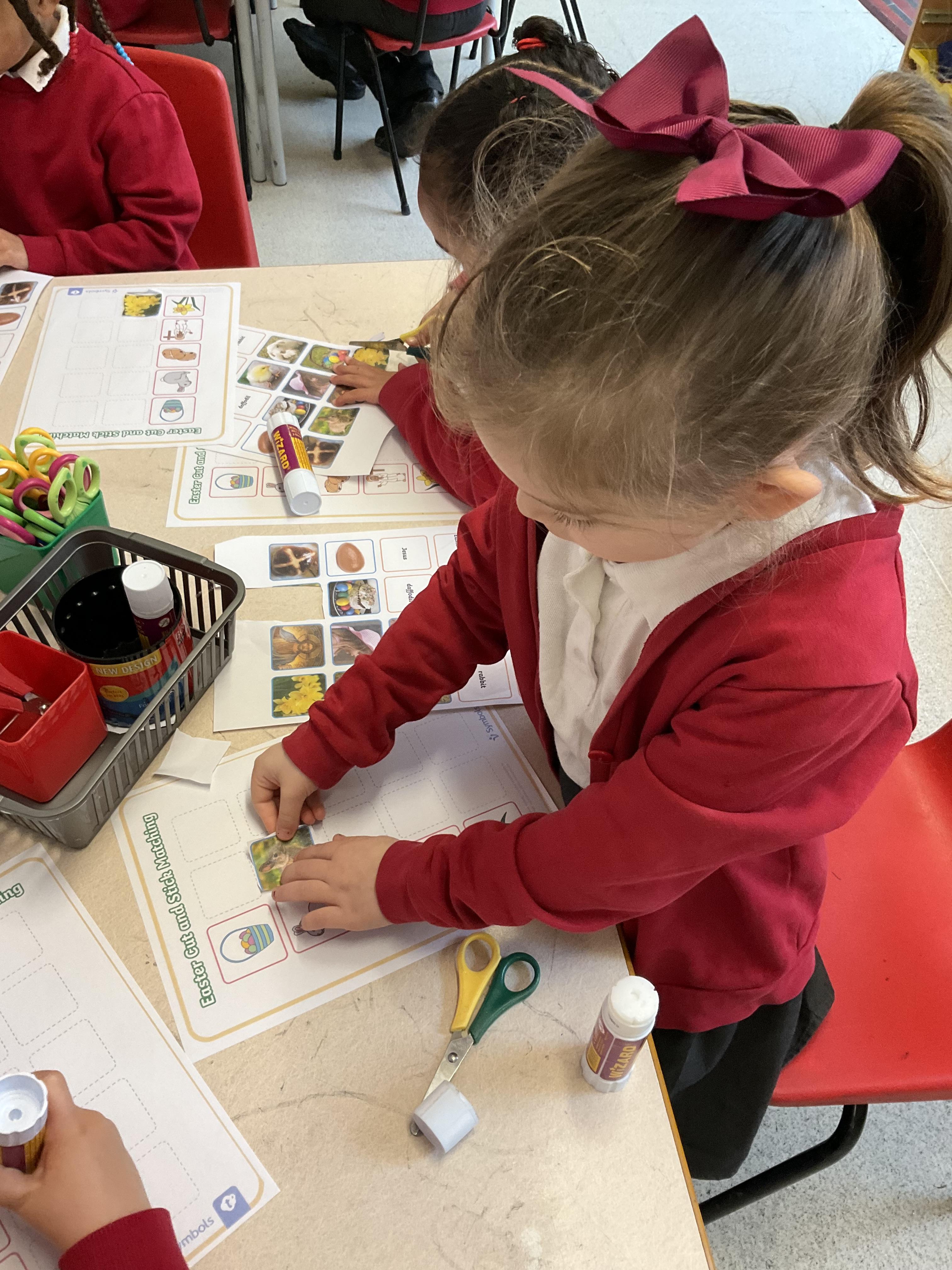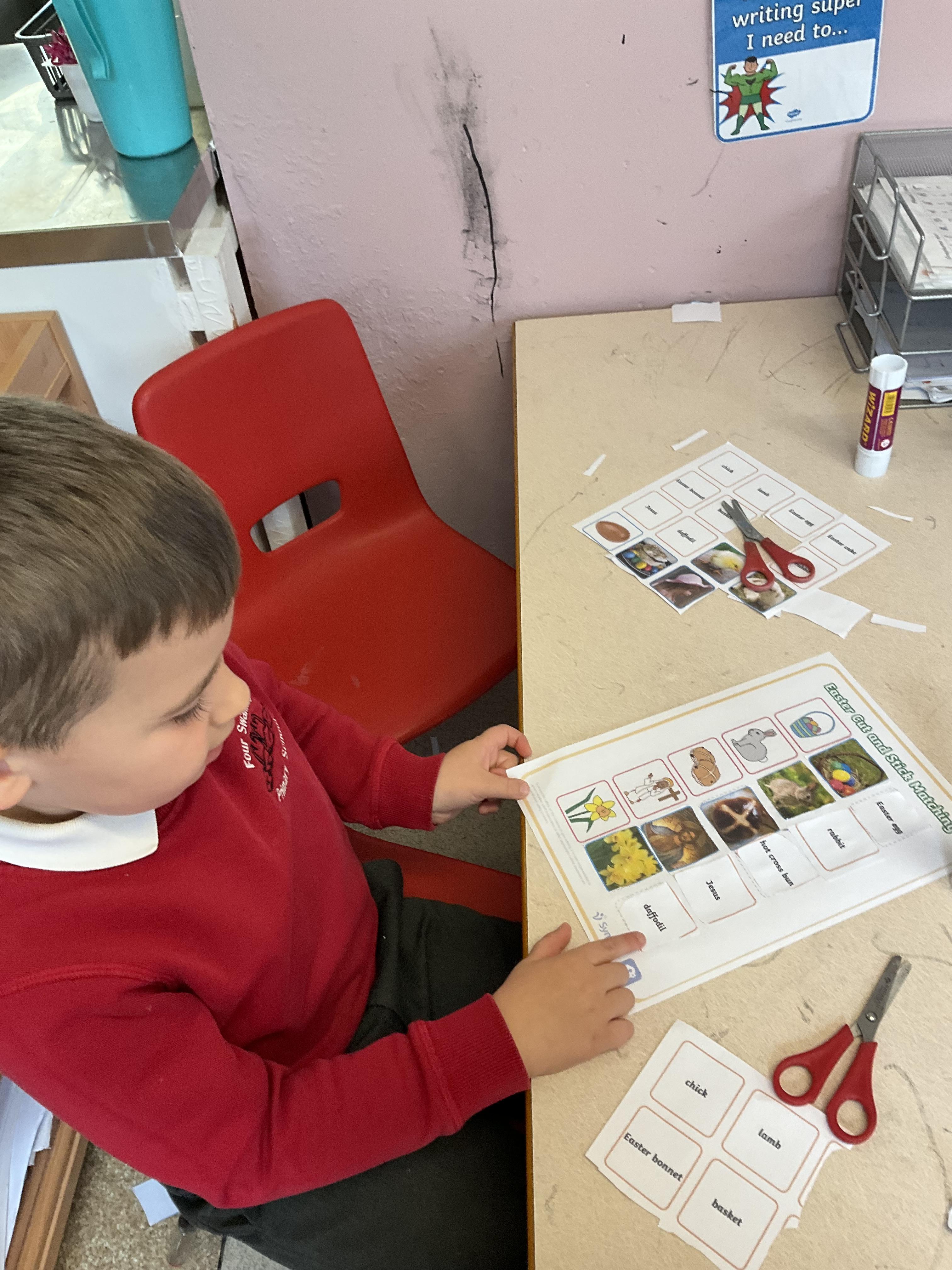 The children used their fingerprints to create their Easter cards. They had to use their fine motor skills to stick the bunny ears and flowers. Then they used their phonetic knowledge to write a message in their cards.