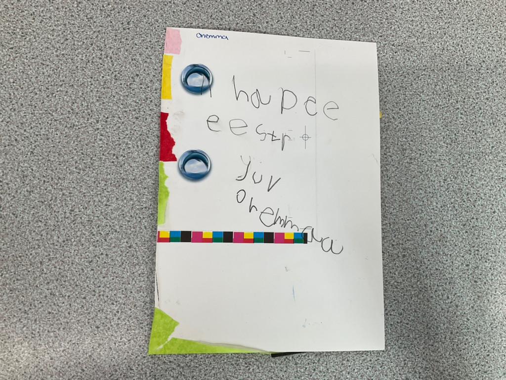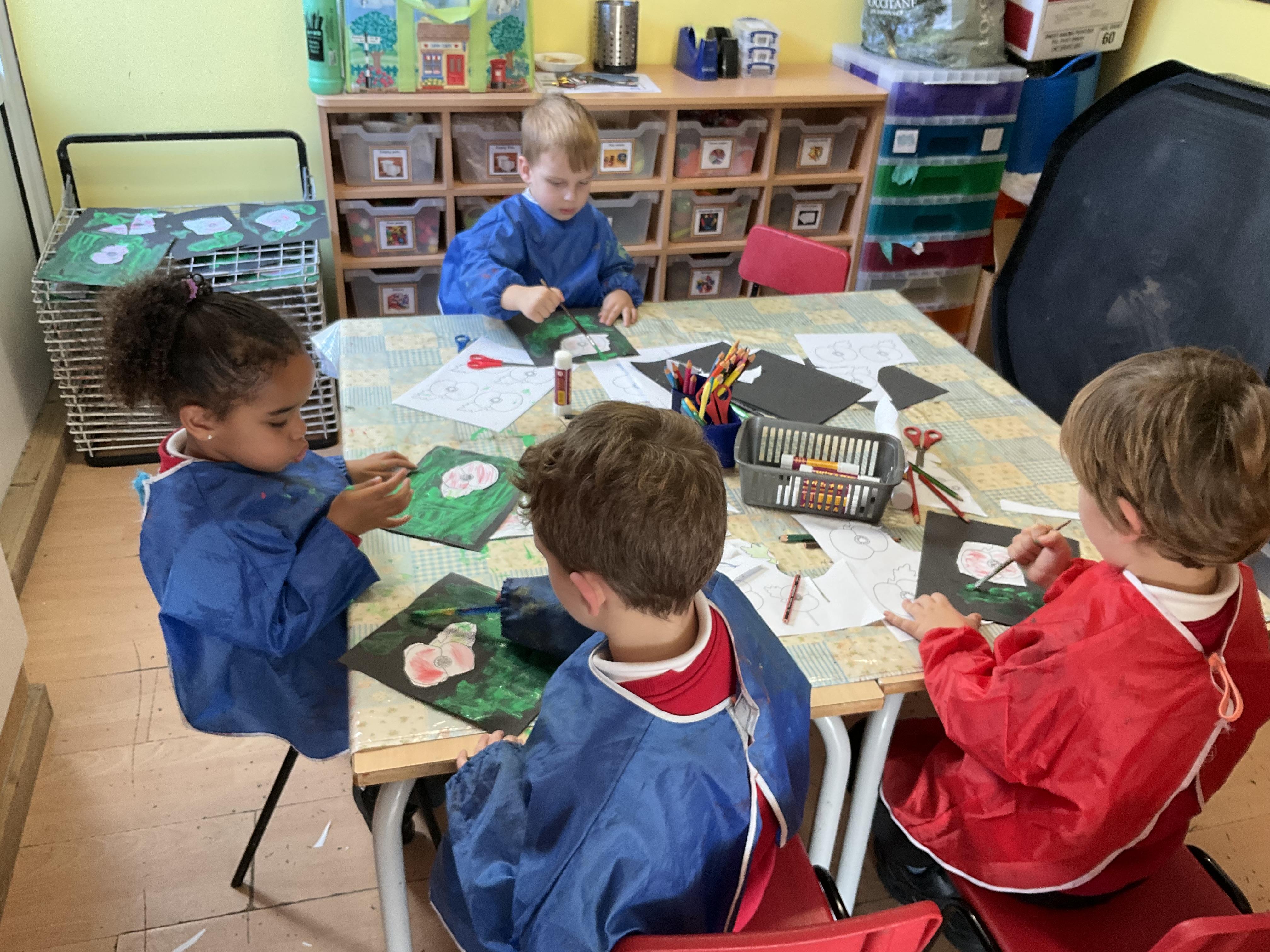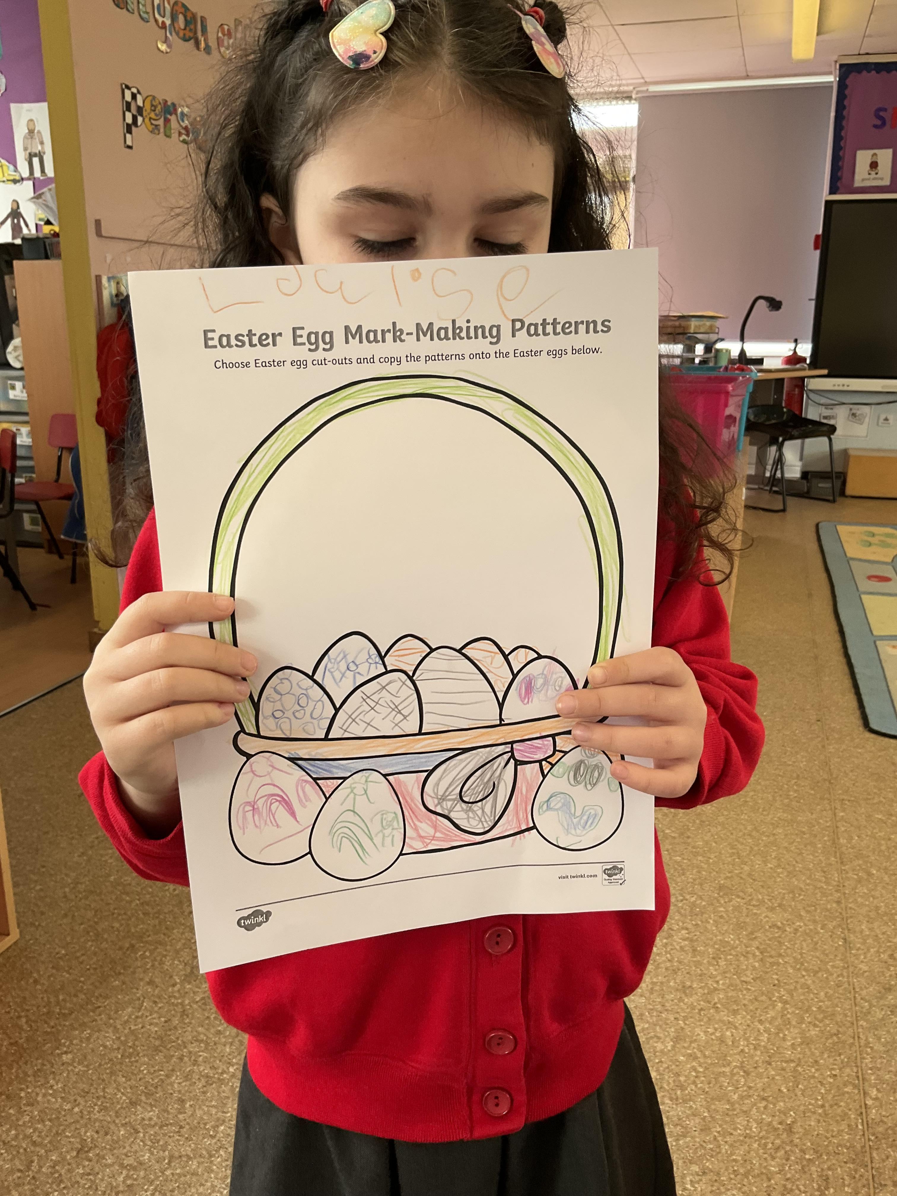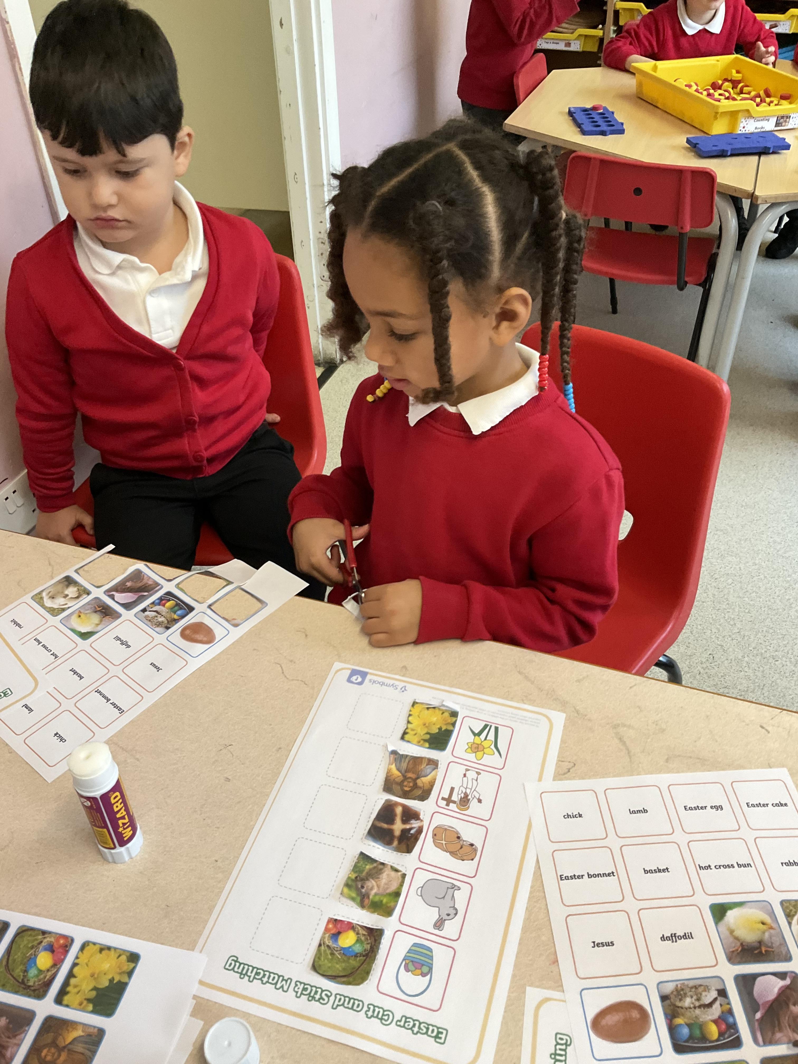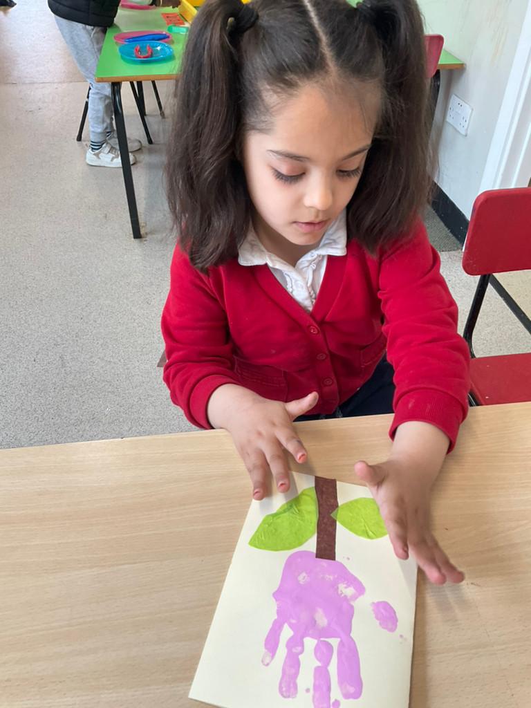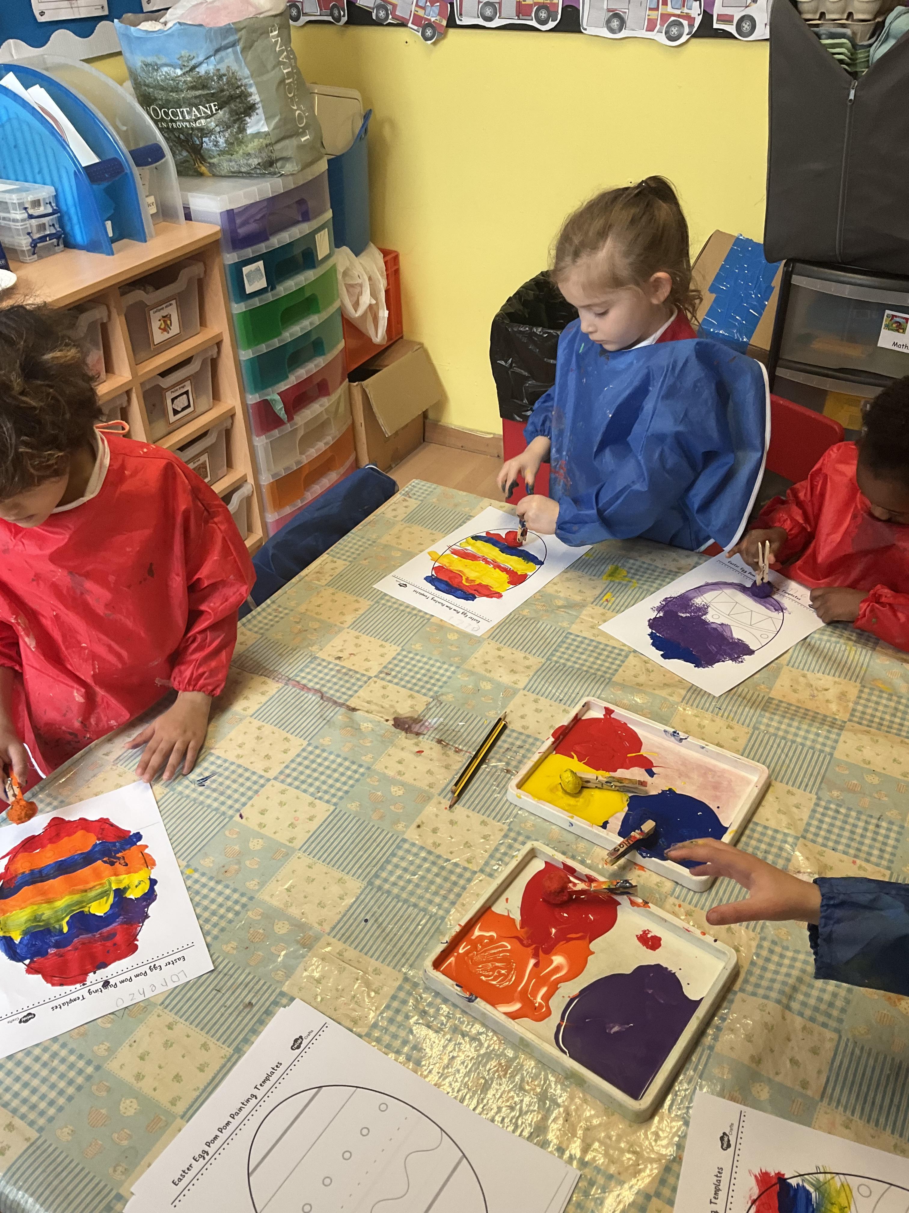 The children used their fingerprints to create their Easter cards. They had to use their fine motor skills to stick the bunny ears and flowers. Then they used their phonetic knowledge to write a message in their cards.