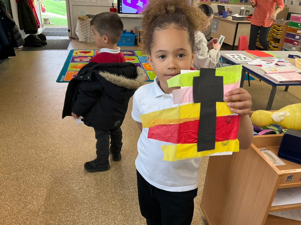 The children learnt that the Union Jack is the flag that represents the countries of the UK- England, Scotland, Wales and Northern Ireland. We discussed how it was a hard time in England during the Second World War and why the children had to leave their homes. We looked at pictures of people having street parties when Winston Churchill, the Prime Minister, announced that the war was over in Europe on 8th May 1945.