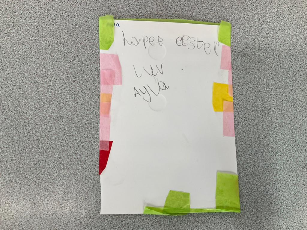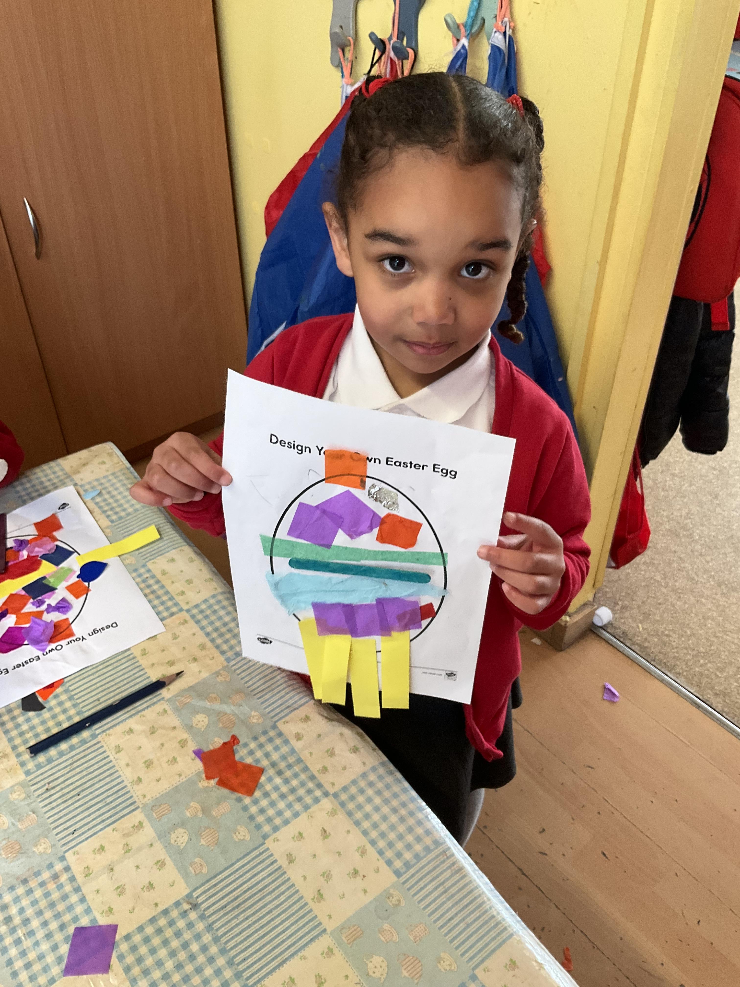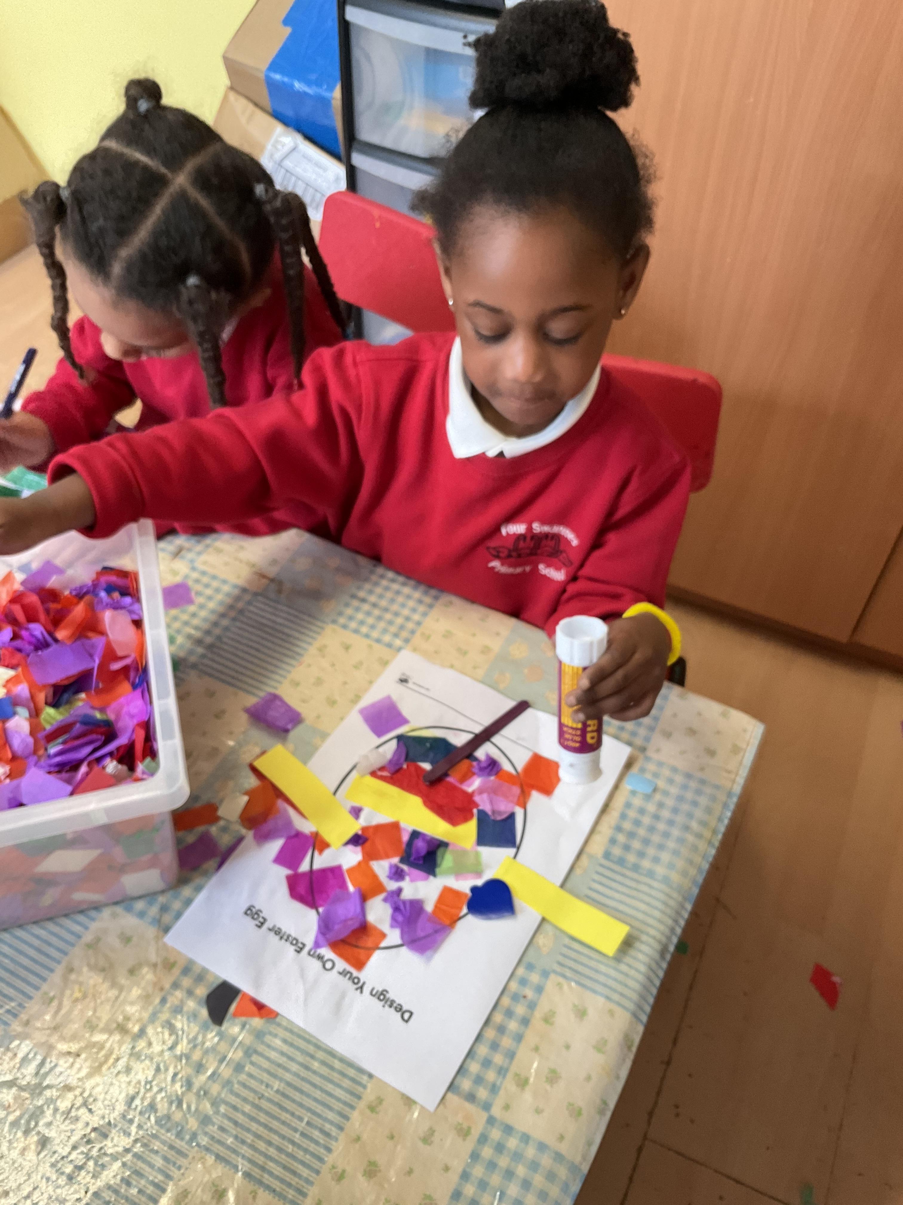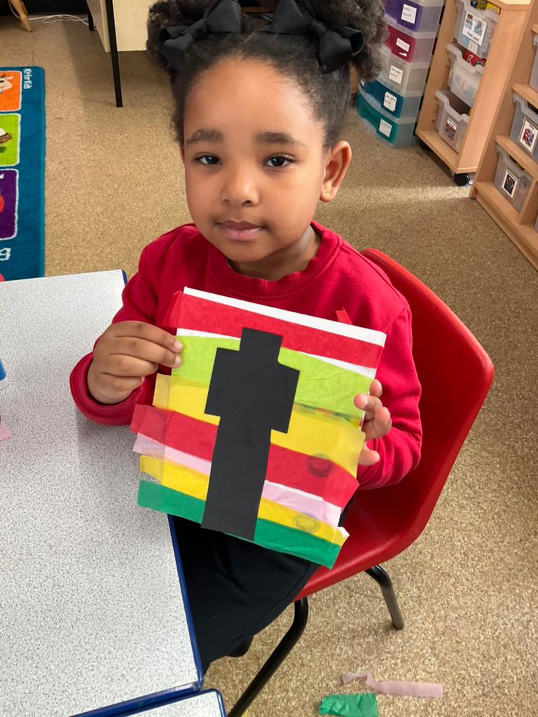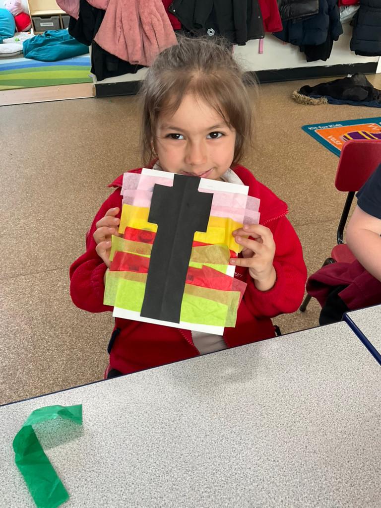 In RE we learnt about the importance of the cross for Christians all over the world. We looked at different types of crosses and those made from dried palm leaves. Then the children designed a colourful background for their Easter card using tissue paper. This made a beautiful background for the cross they cut out using black card paper.Then they wrote a message in their cards.