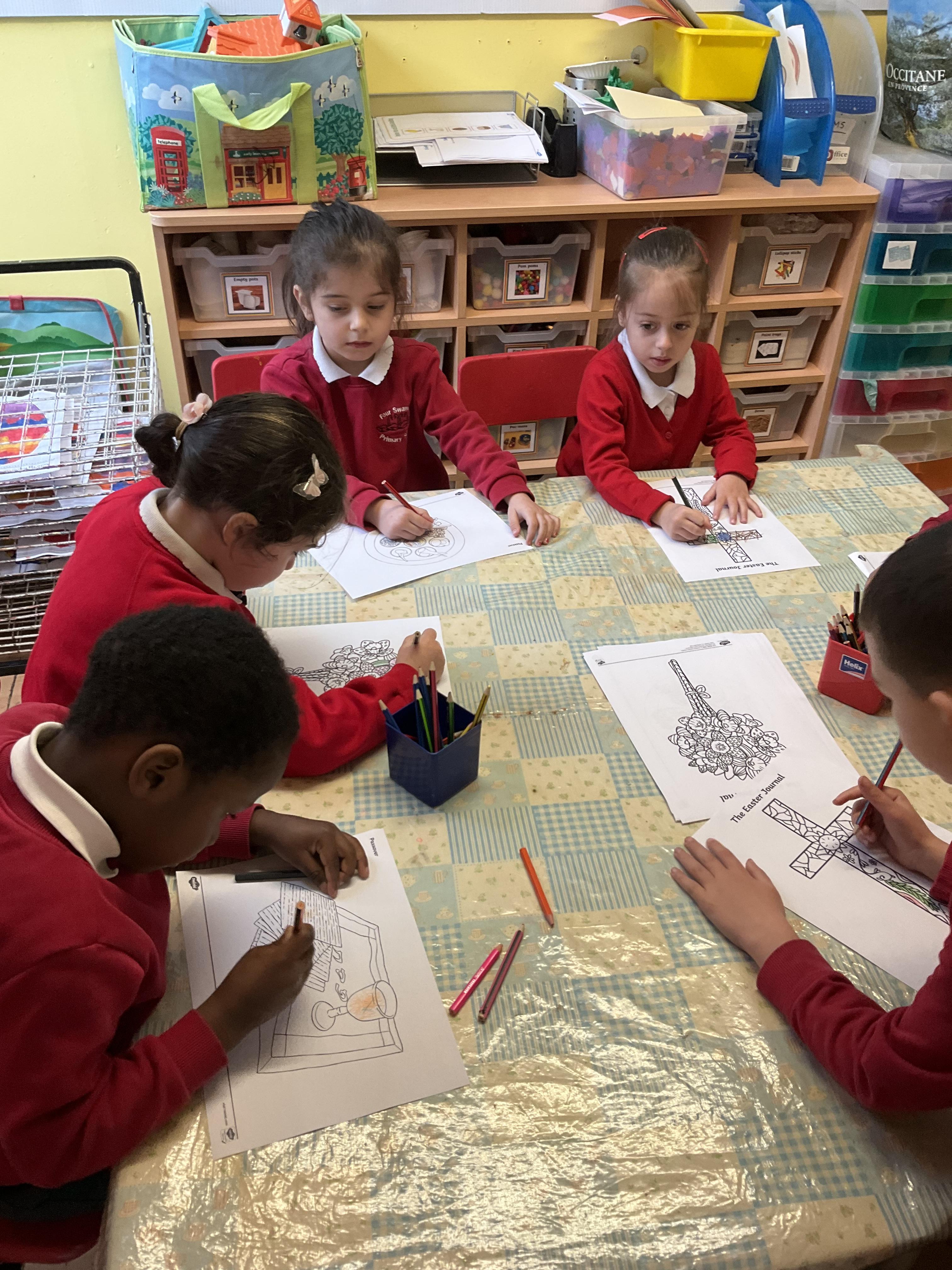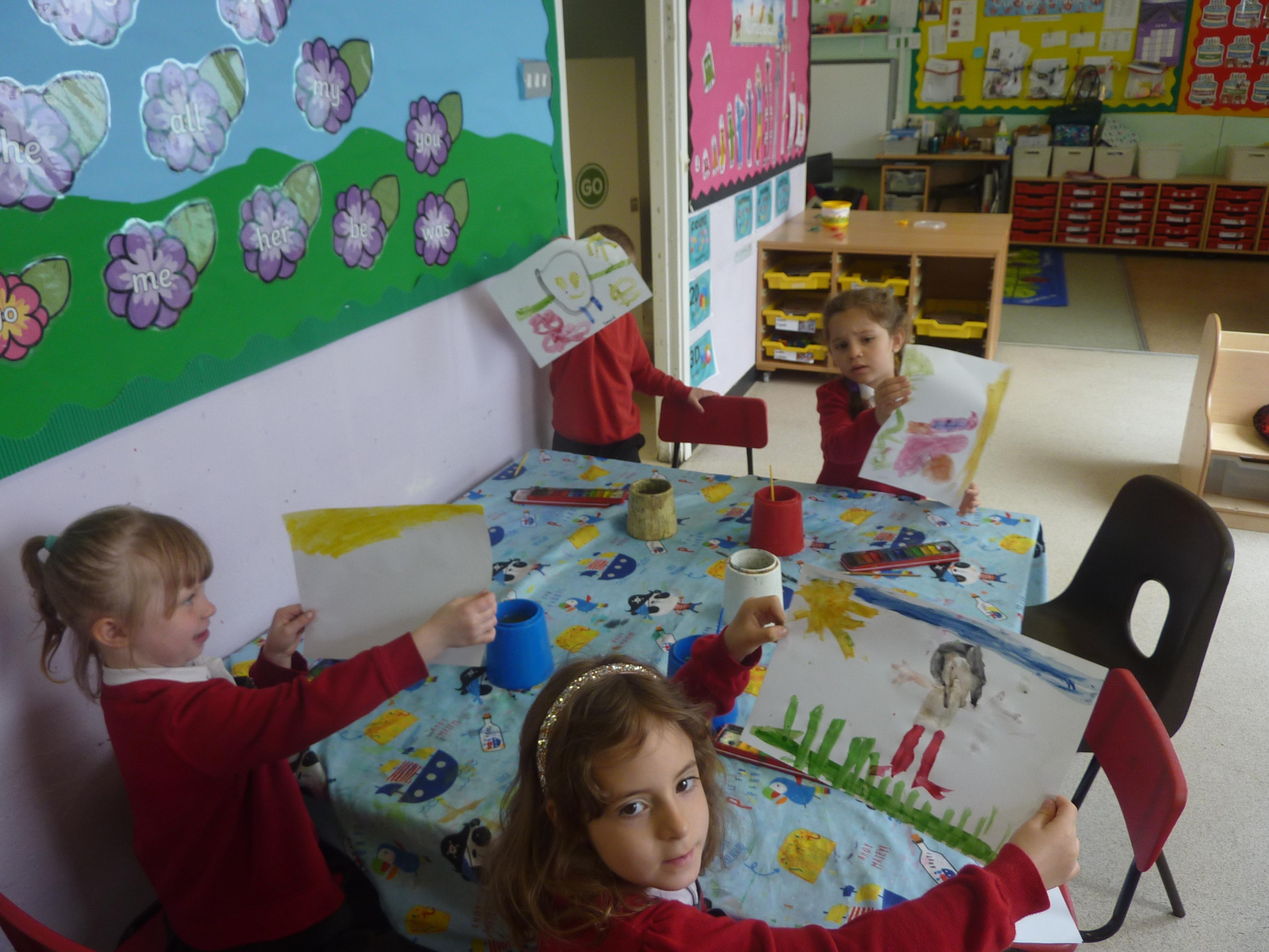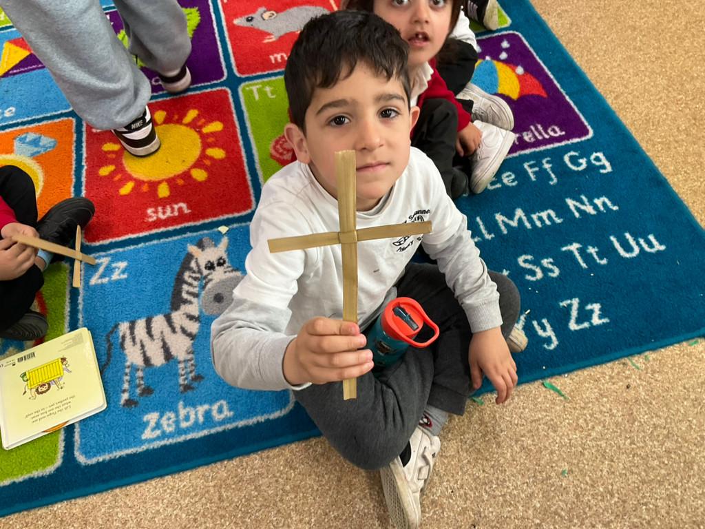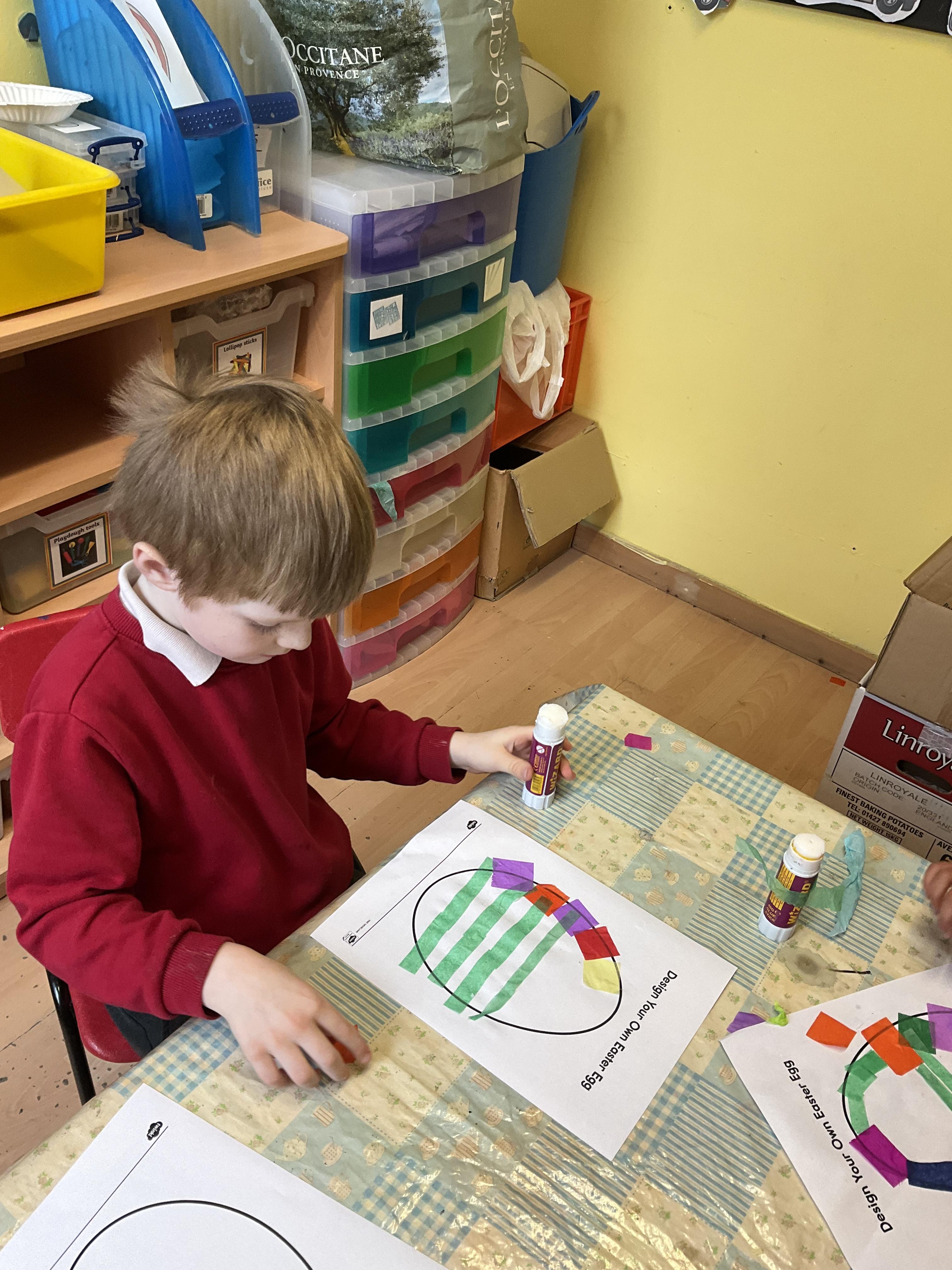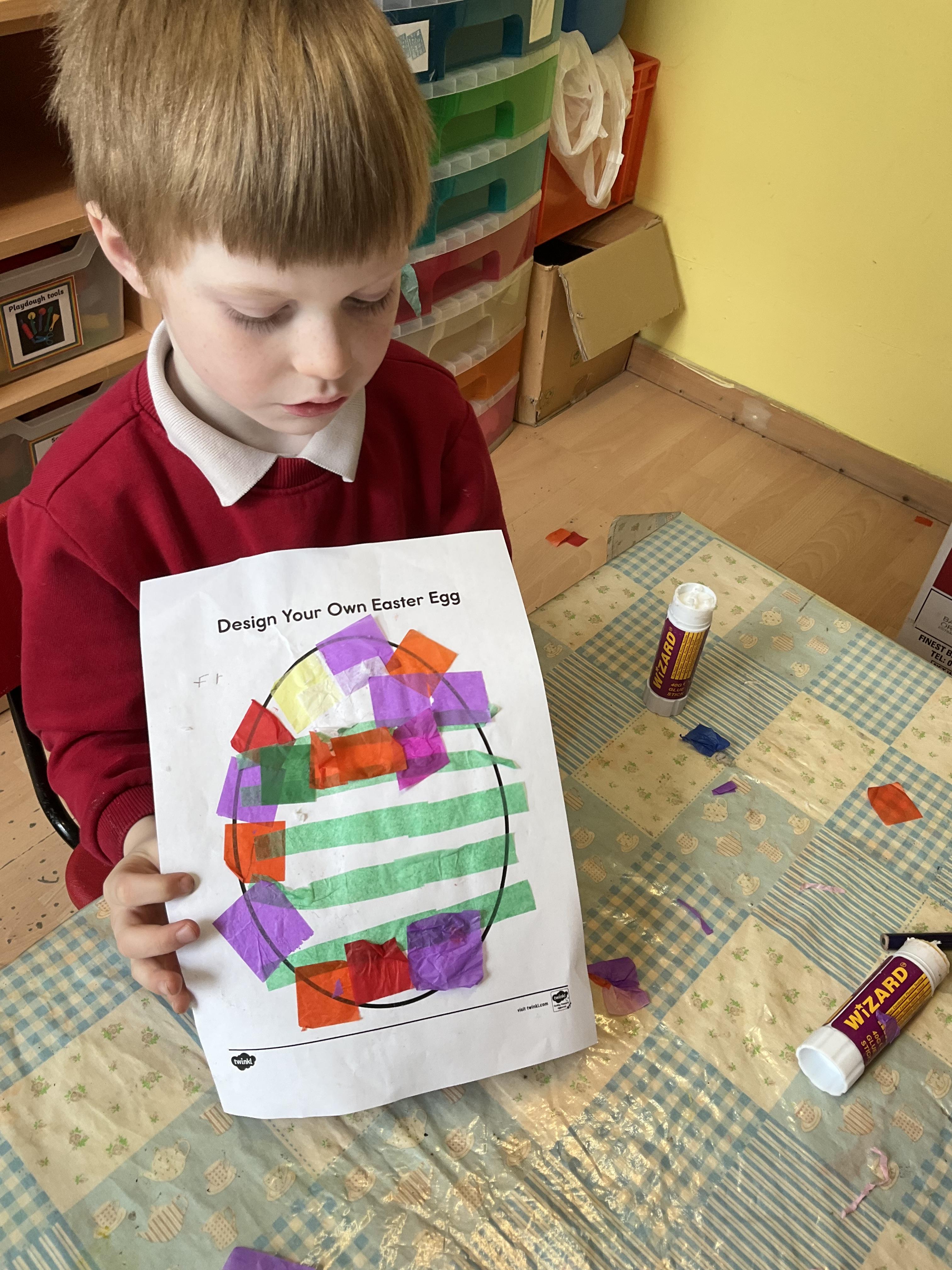 In RE we learnt about the importance of the cross for Christians all over the world. We looked at different types of crosses and those made from dried palm leaves. Then the children designed a colourful background for their Easter card using tissue paper. This made a beautiful background for the cross they cut out using black card paper.Then they wrote a message in their cards.