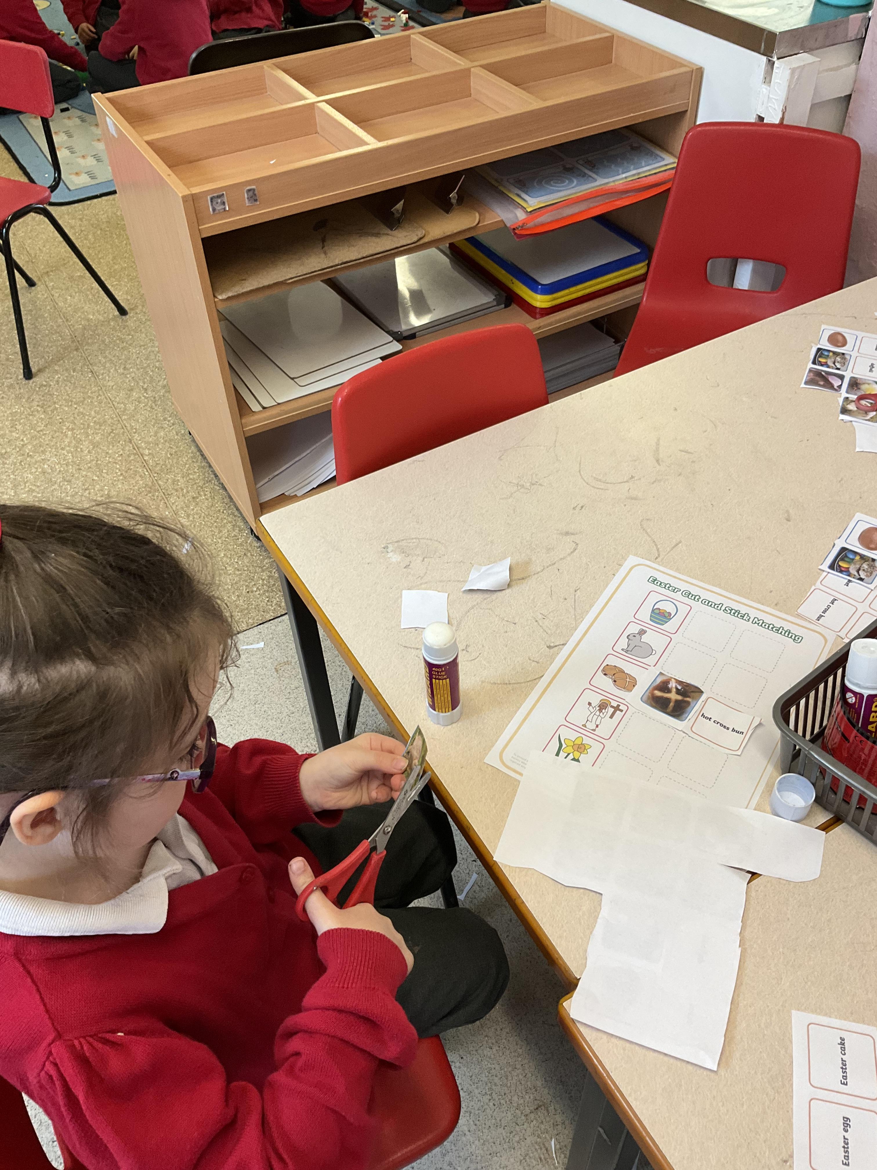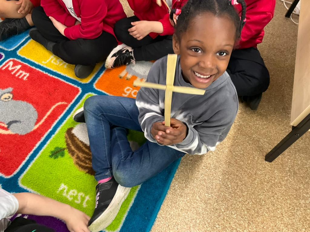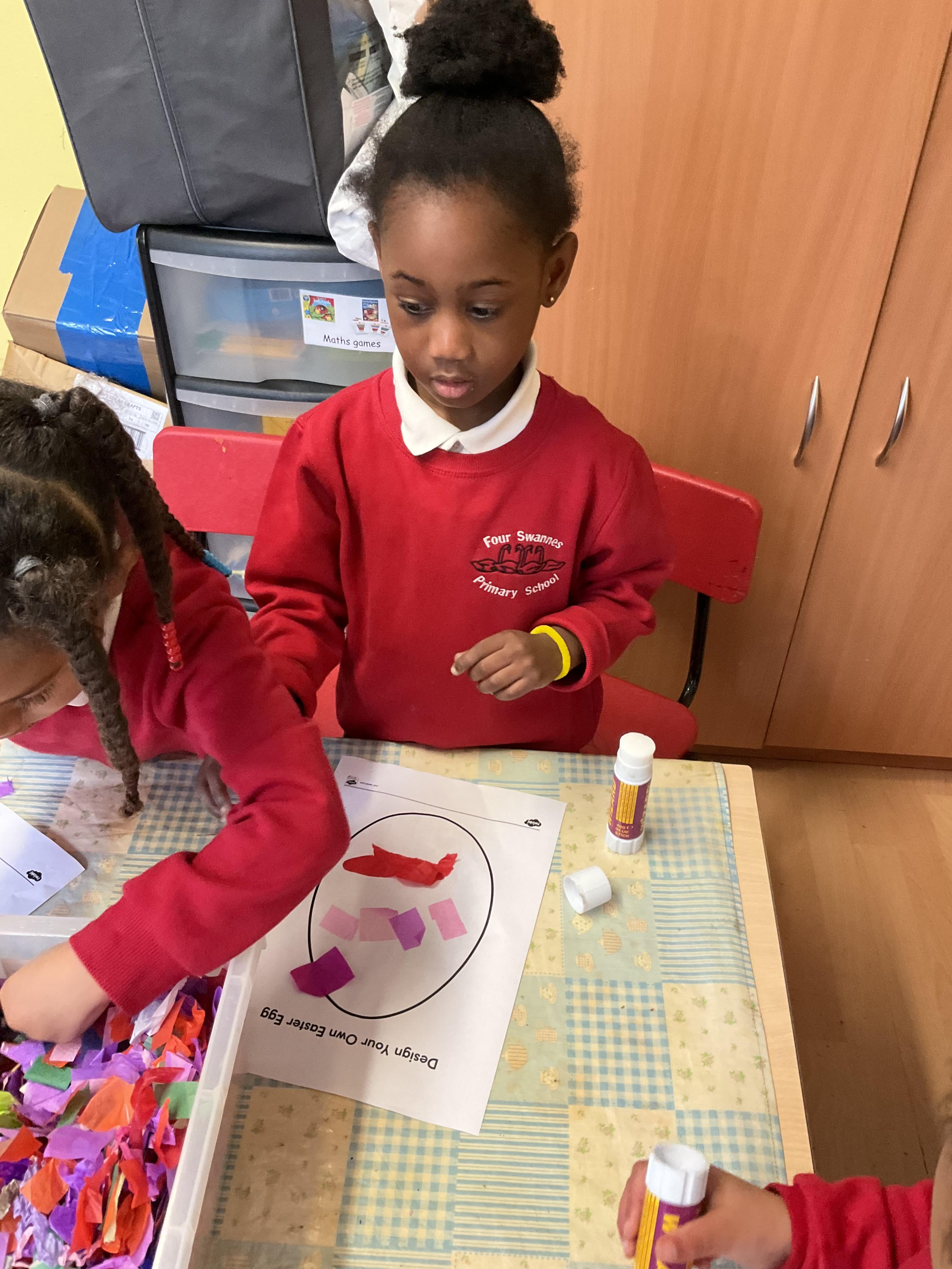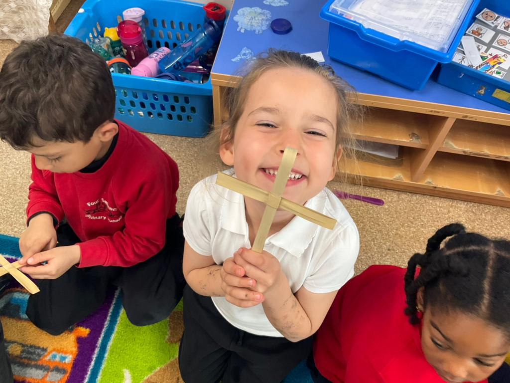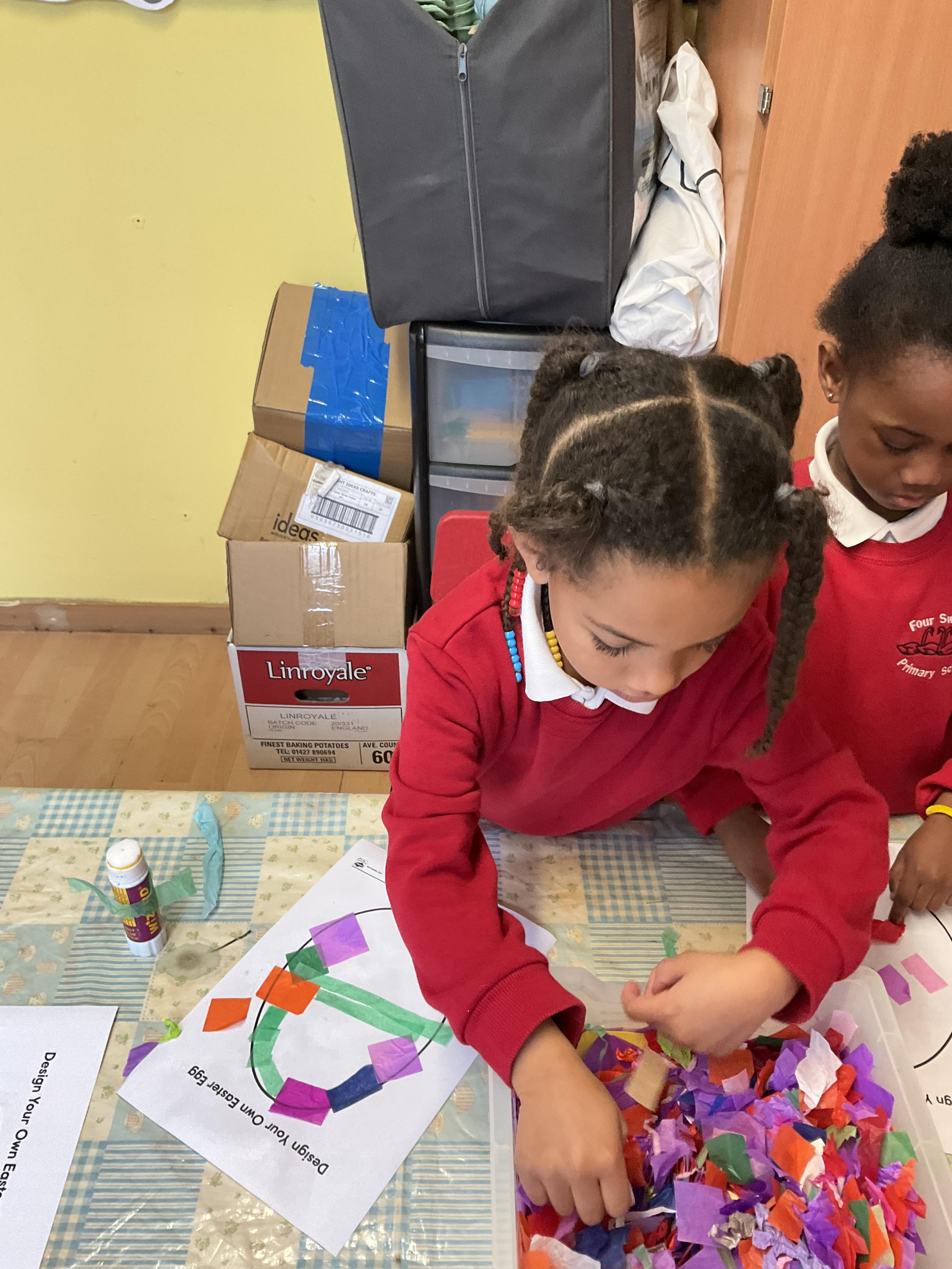 In RE we learnt about the importance of the cross for Christians all over the world. We looked at different types of crosses and those made from dried palm leaves. Then the children designed a colourful background for their Easter card using tissue paper. This made a beautiful background for the cross they cut out using black card paper.Then they wrote a message in their cards.