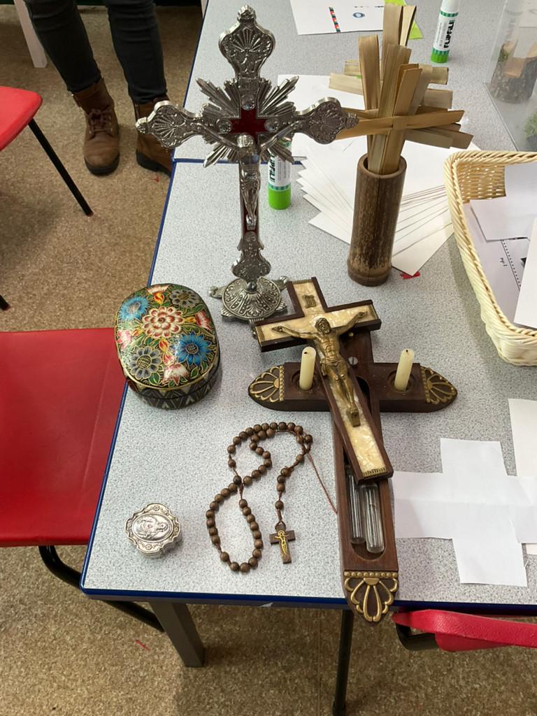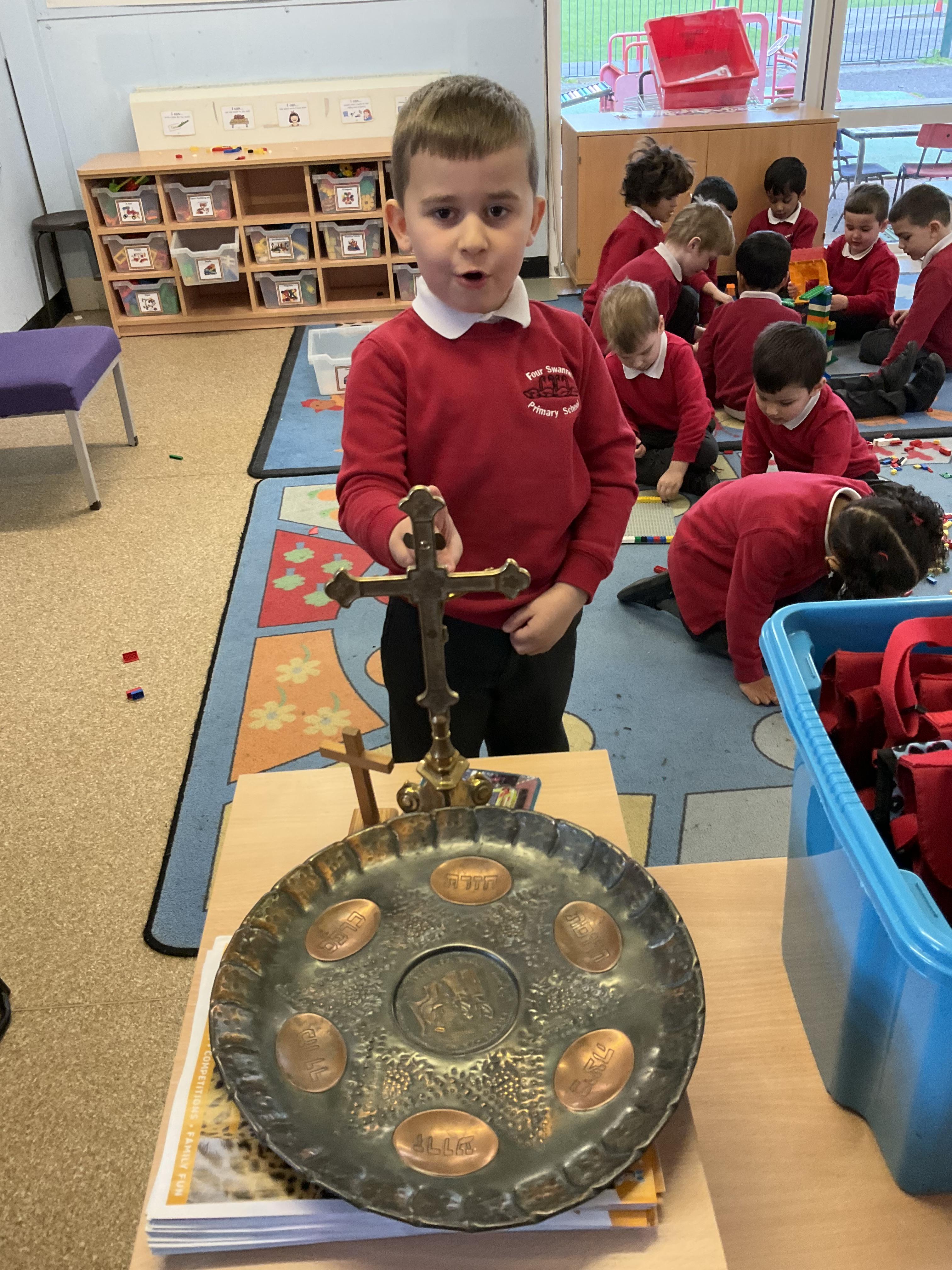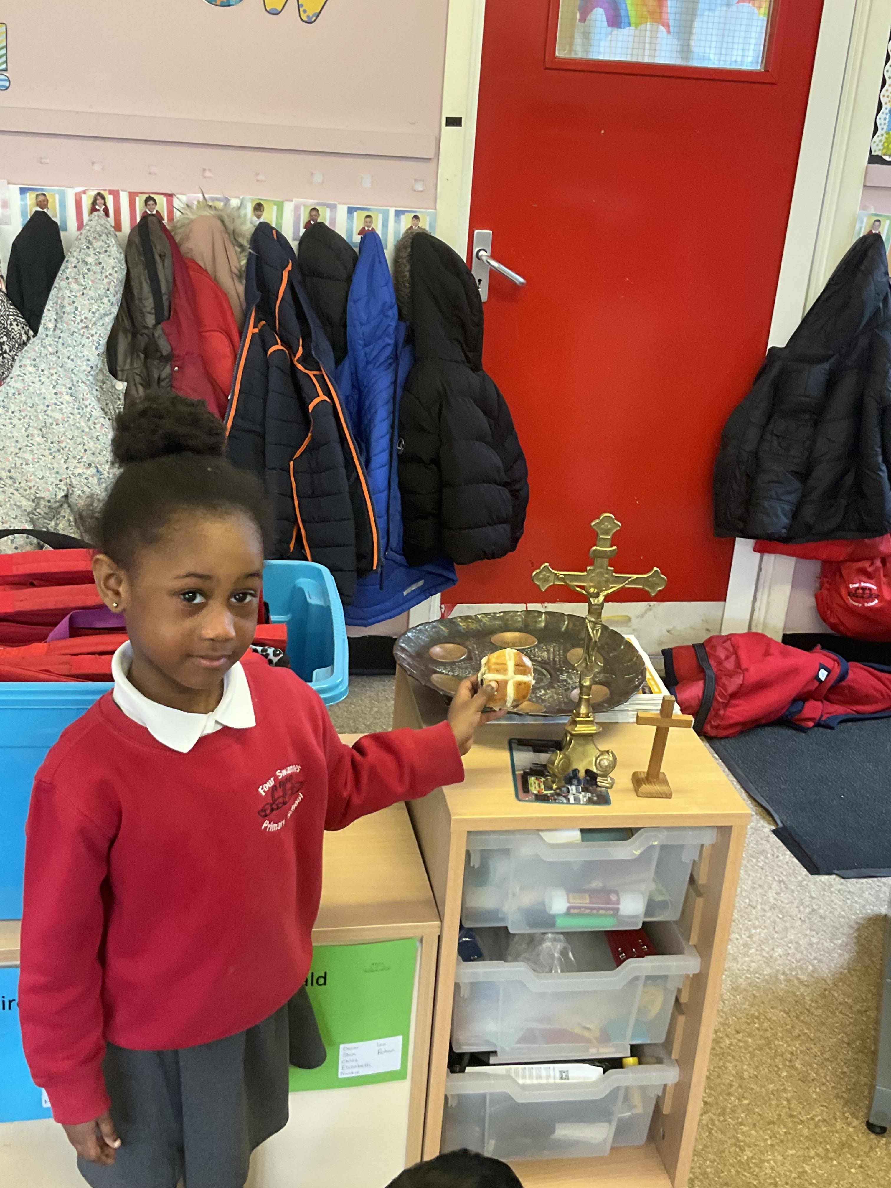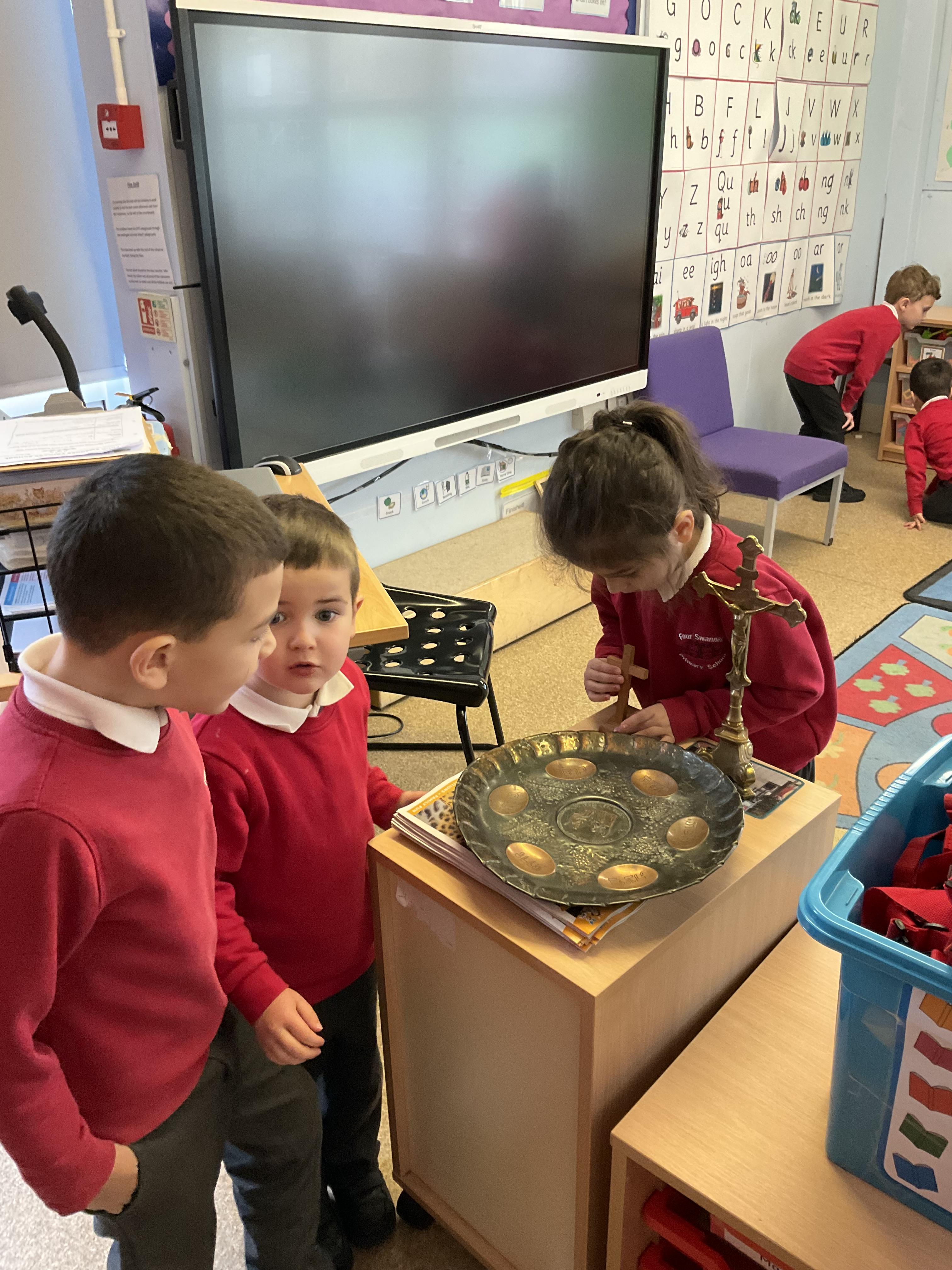 In RE we learnt about the importance of the cross for Christians all over the world. We looked at different types of crosses and those made from dried palm leaves. Then the children designed a colourful background for their Easter card using tissue paper. This made a beautiful background for the cross they cut out using black card paper.Then they wrote a message in their cards.