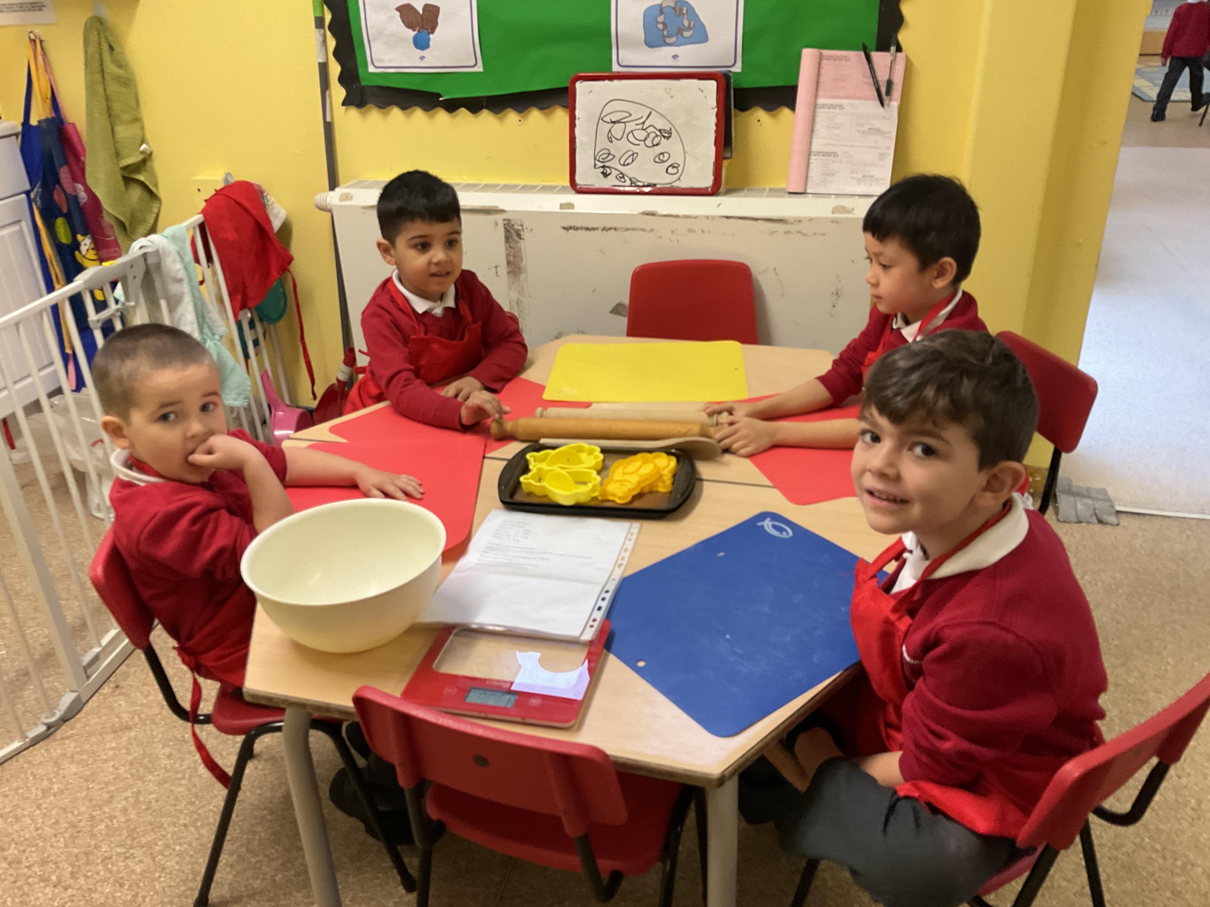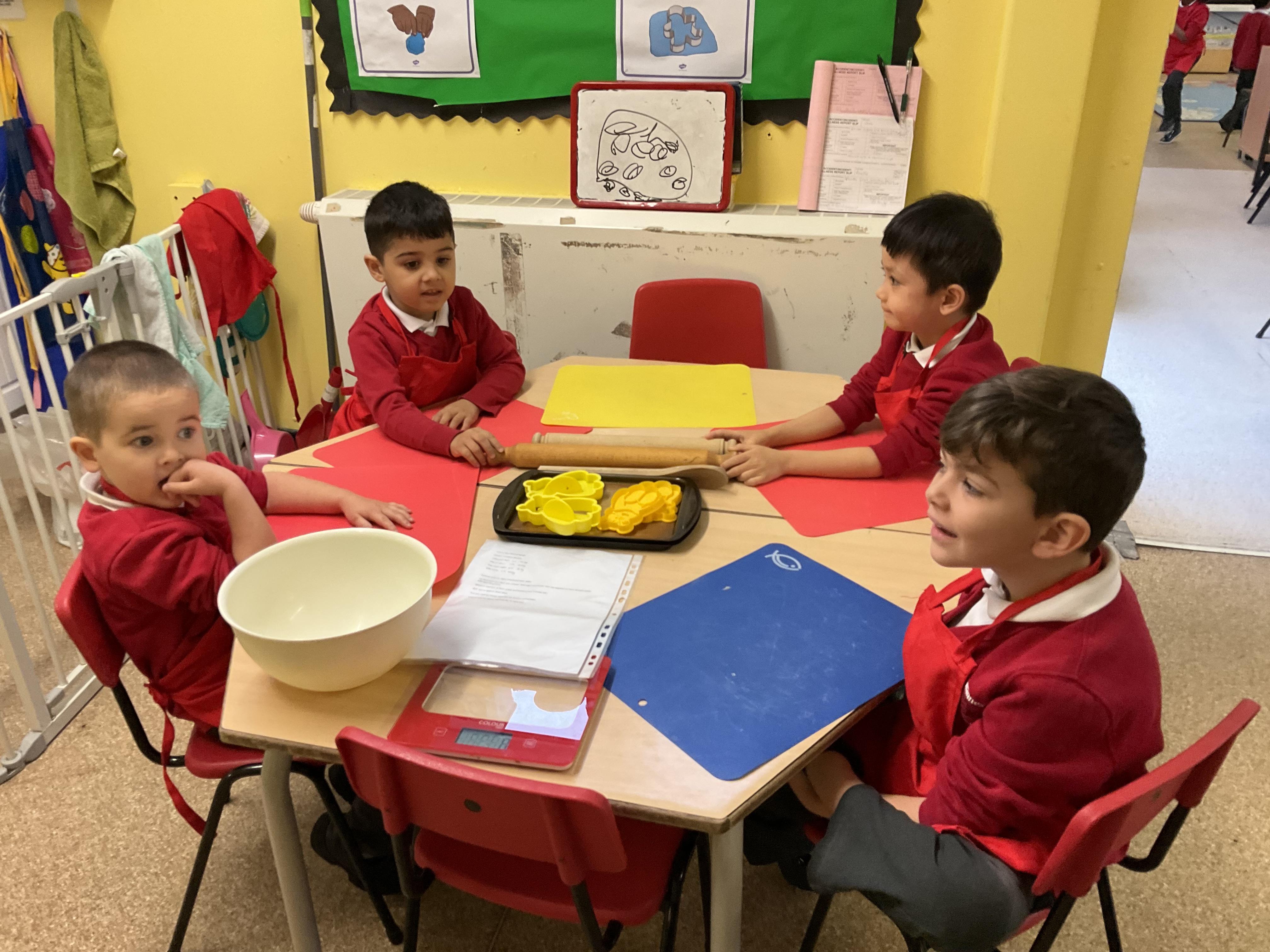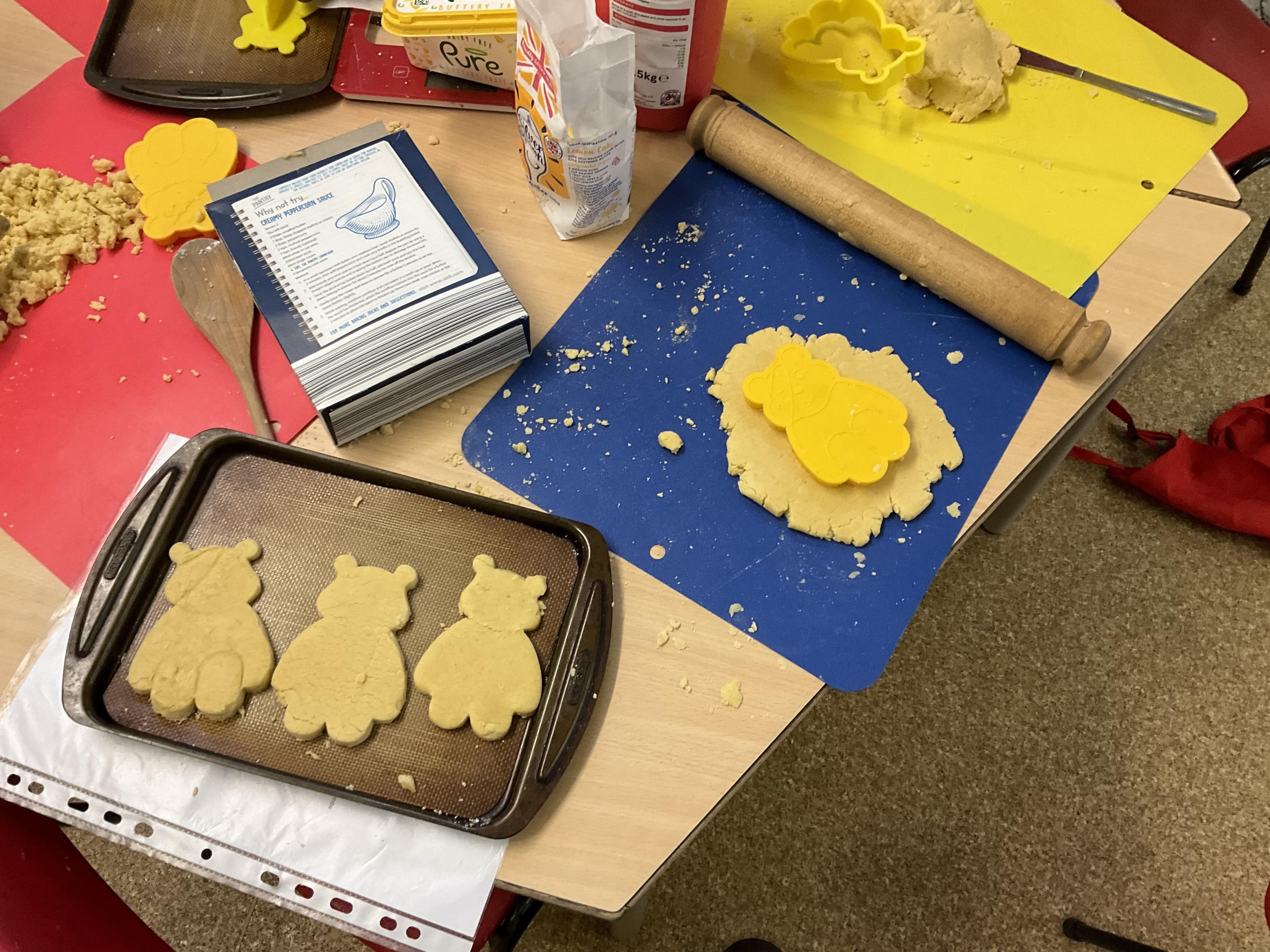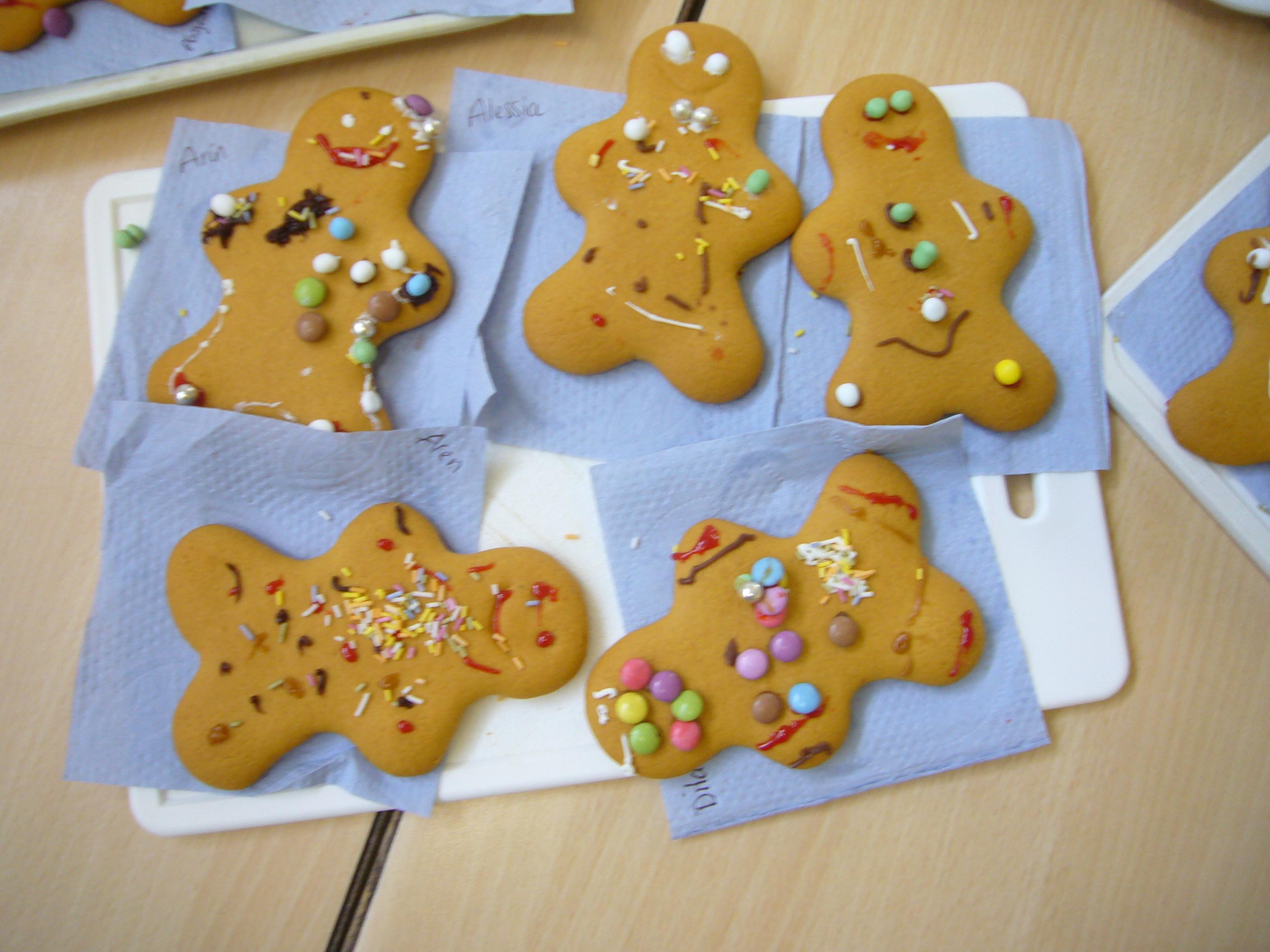 After reading the book, “The Gingerbread man”, the children cooked Gingerbread men biscuits using plain flour, soft brown sugar, egg, ginger powder, golden syrup, bicarbonate soda, butter. There was a lot of mathematical skills used as the children had to measure out the ingredients.