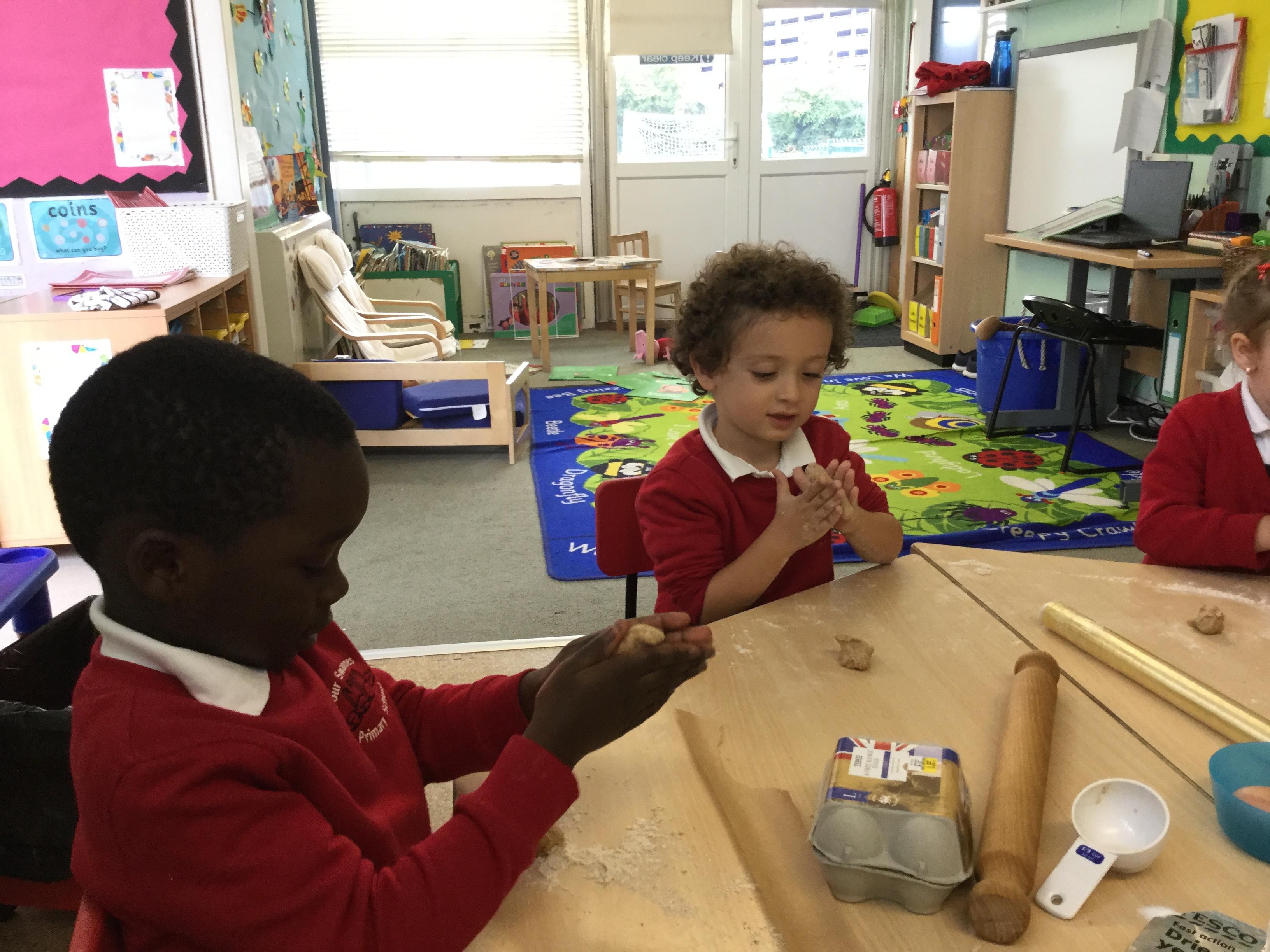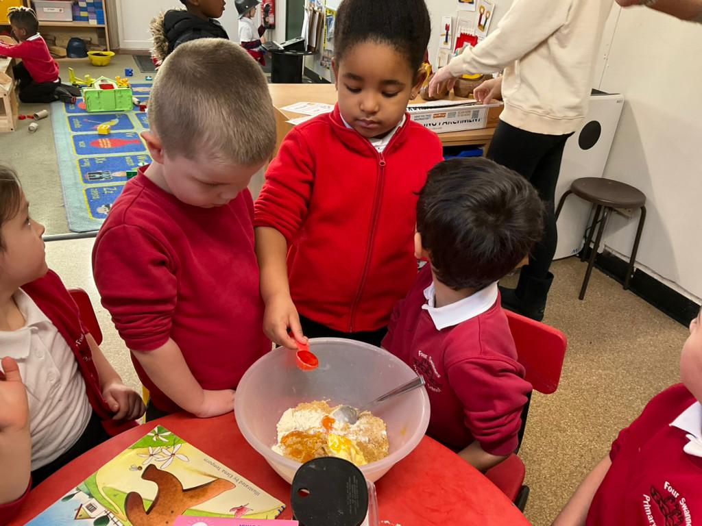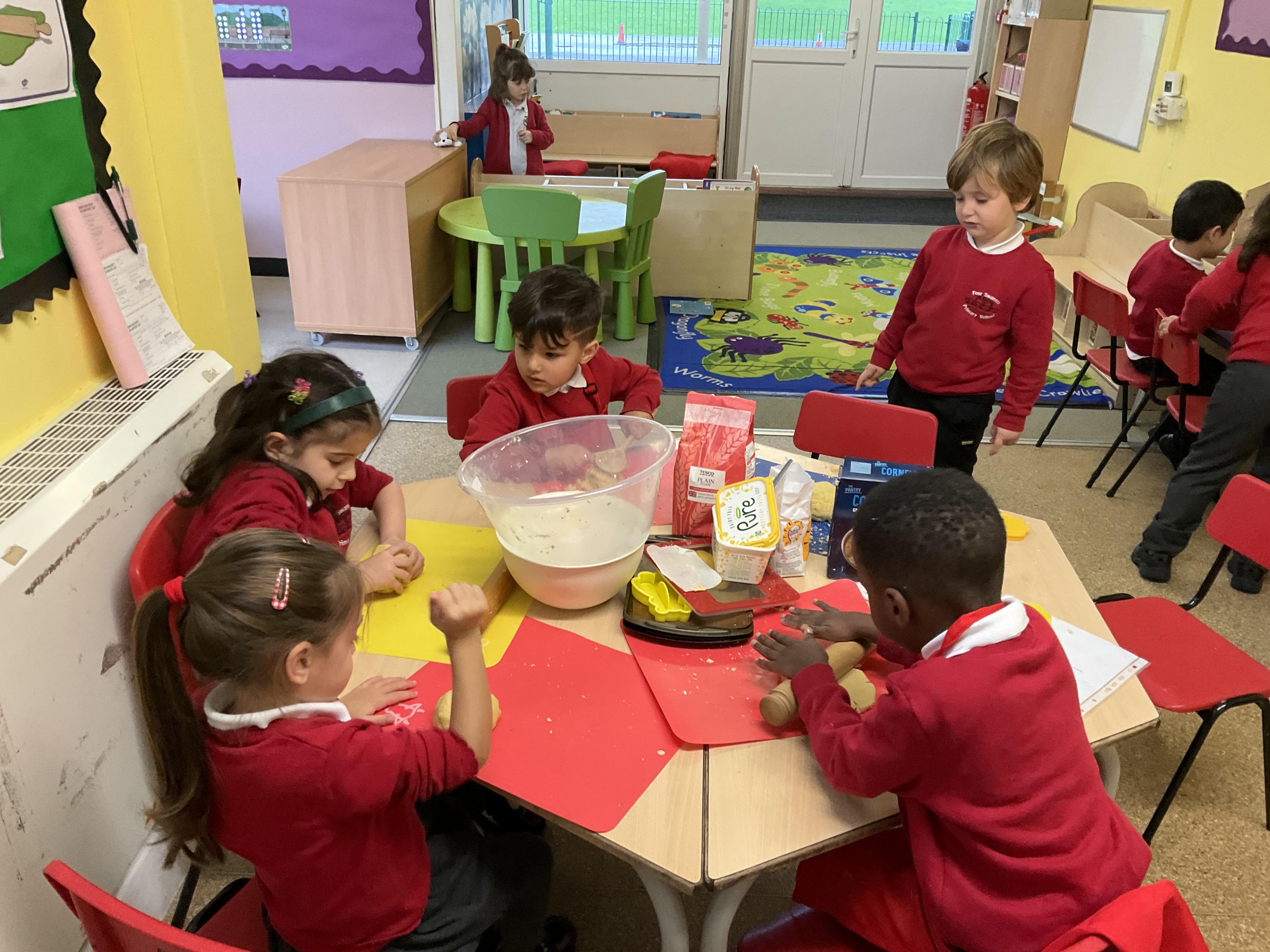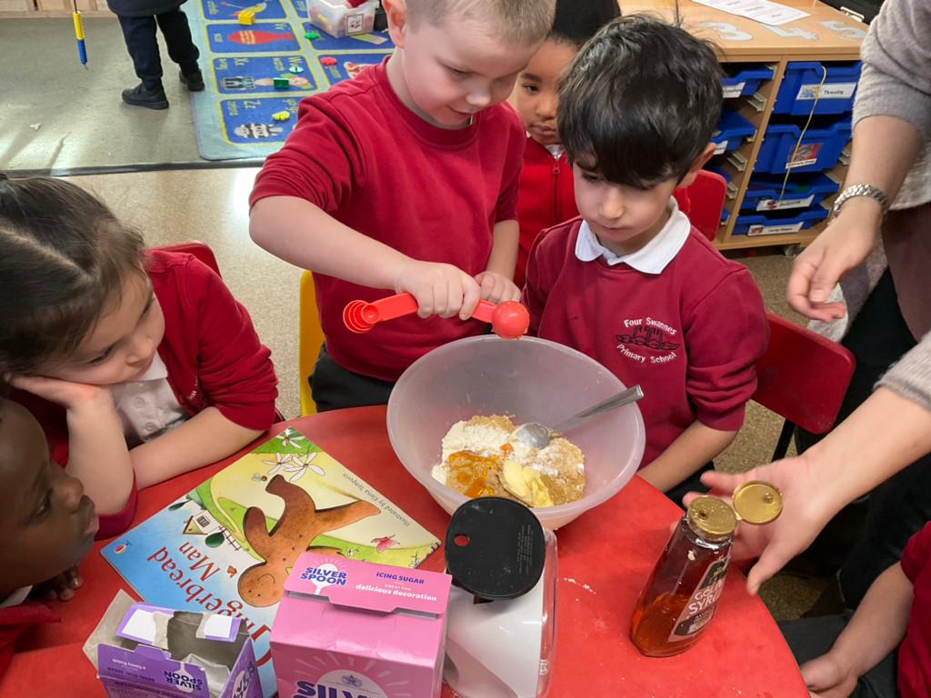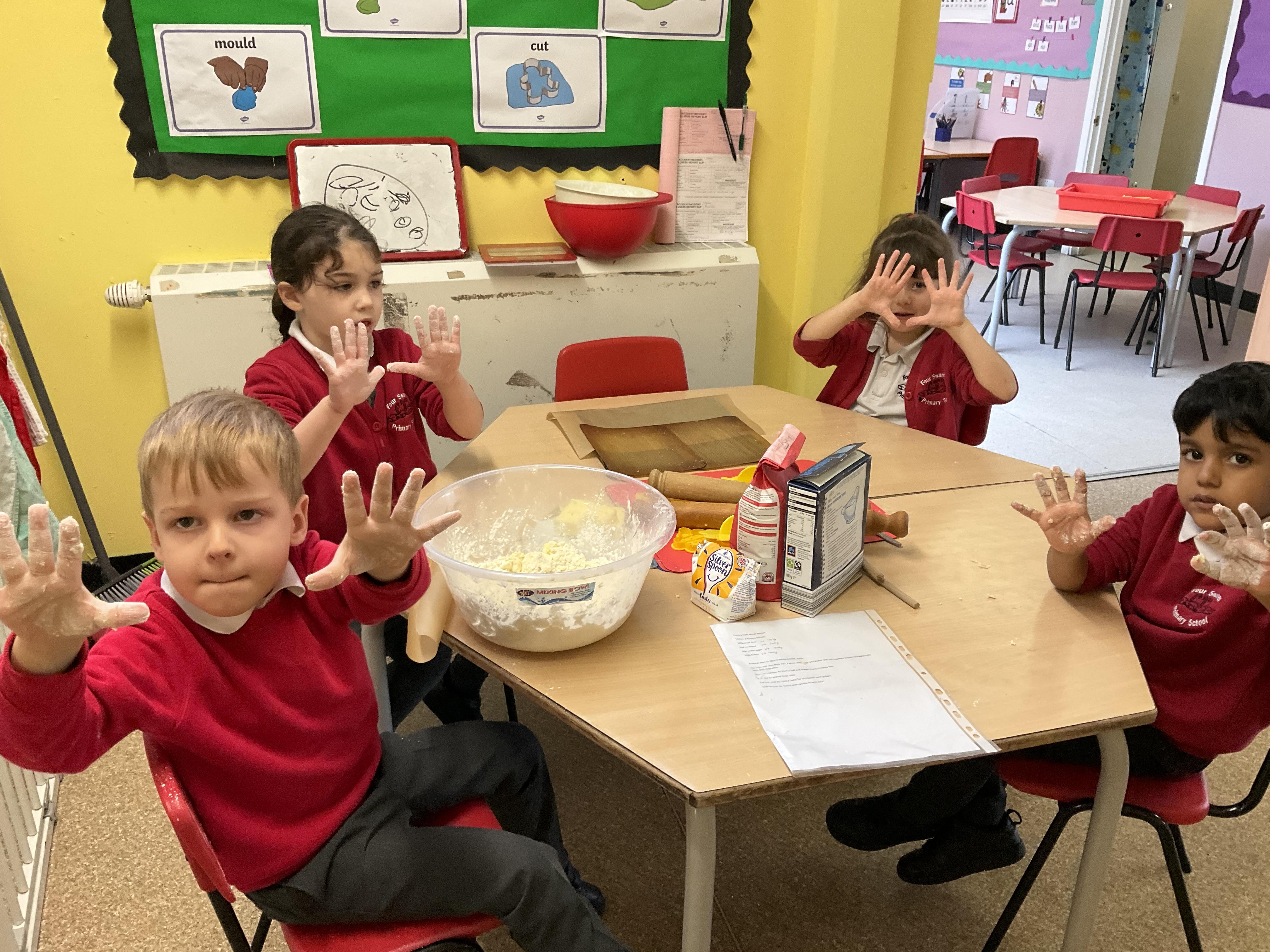 After reading the book, “The Gingerbread man”, the children cooked Gingerbread men biscuits using plain flour, soft brown sugar, egg, ginger powder, golden syrup, bicarbonate soda, butter. There was a lot of mathematical skills used as the children had to measure out the ingredients.