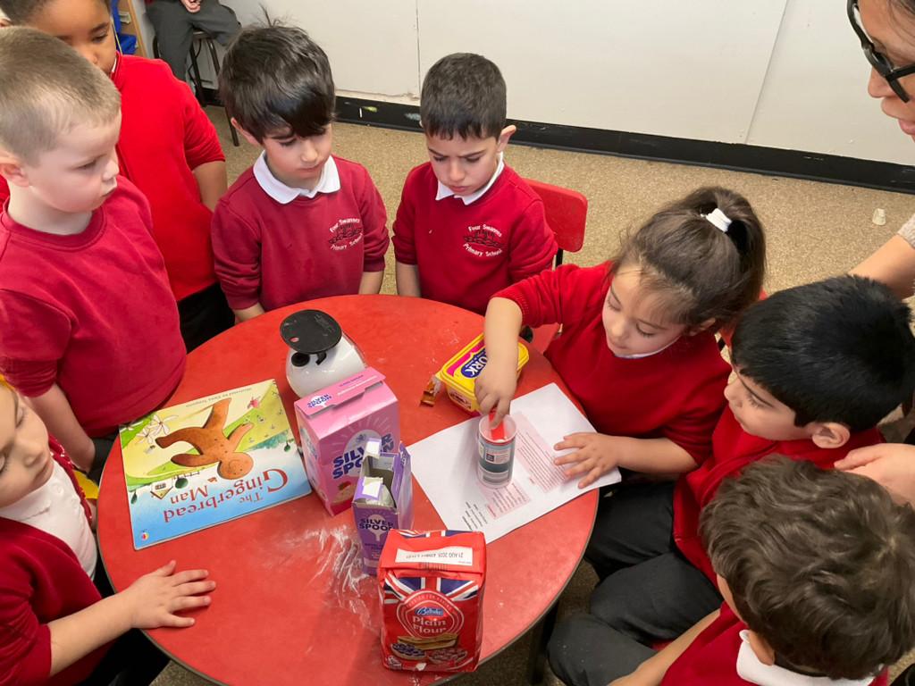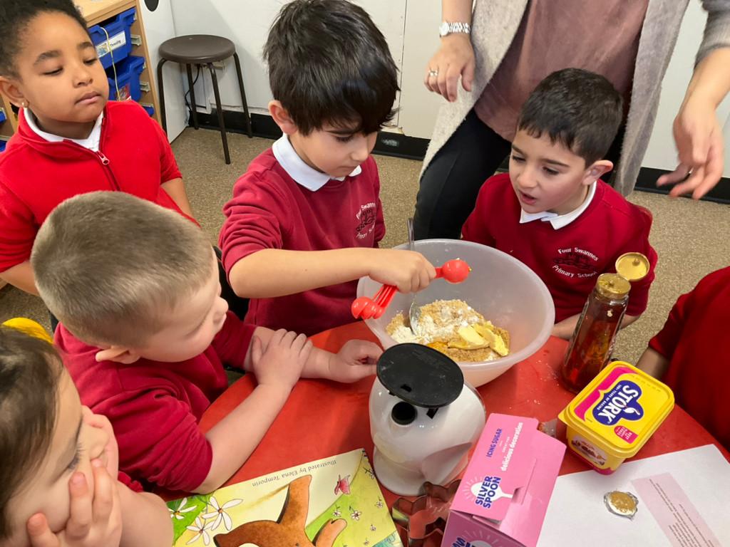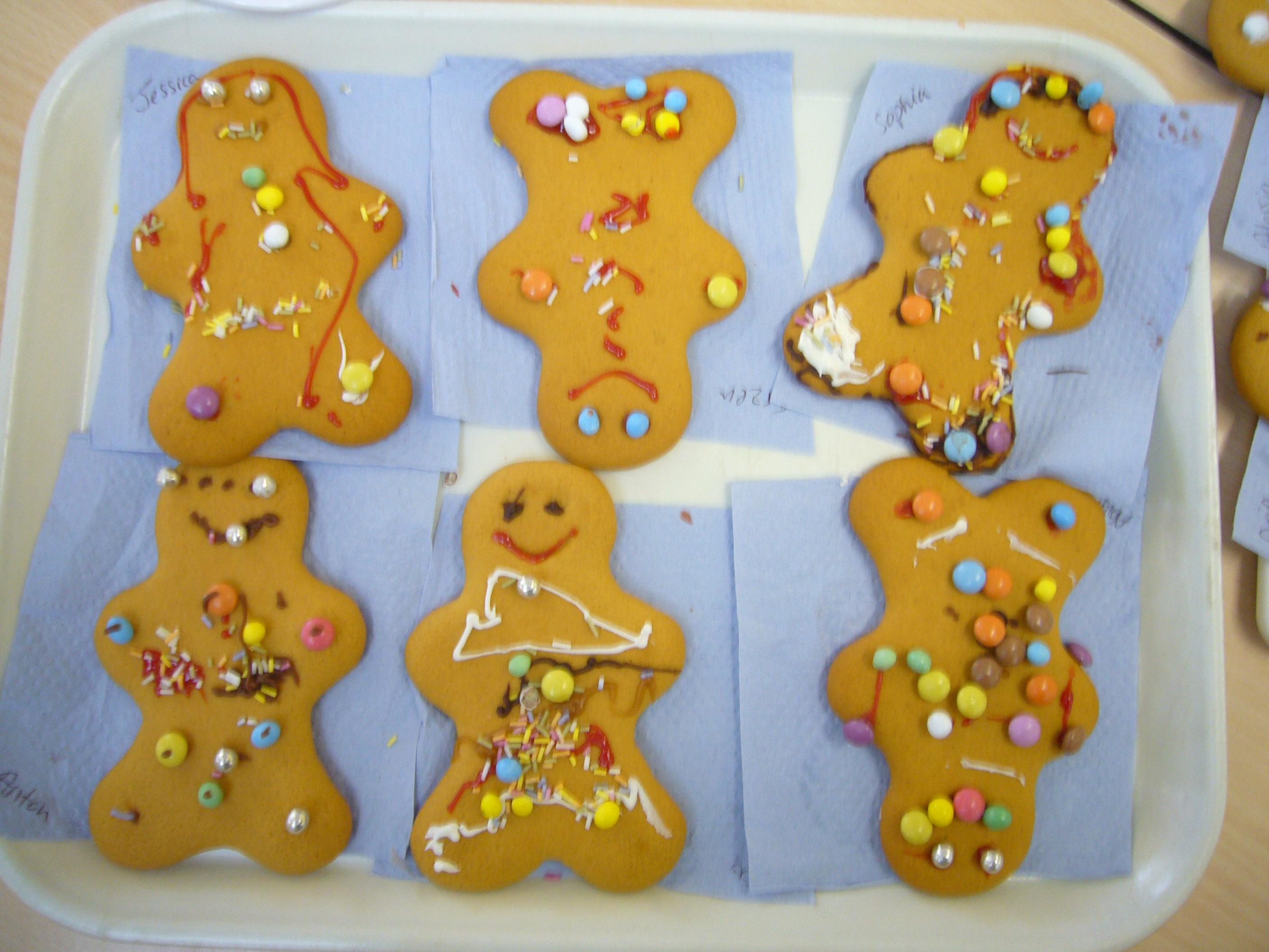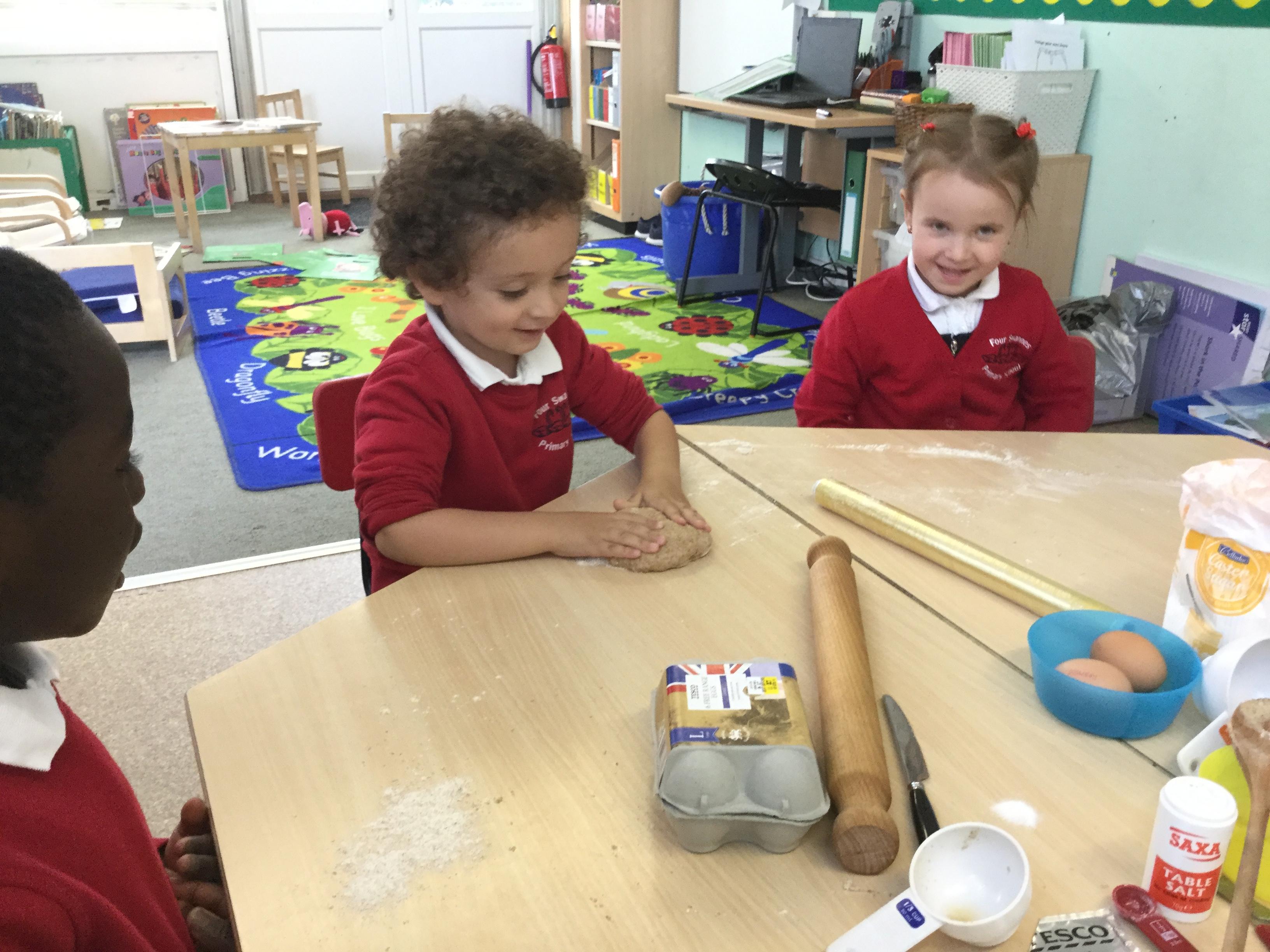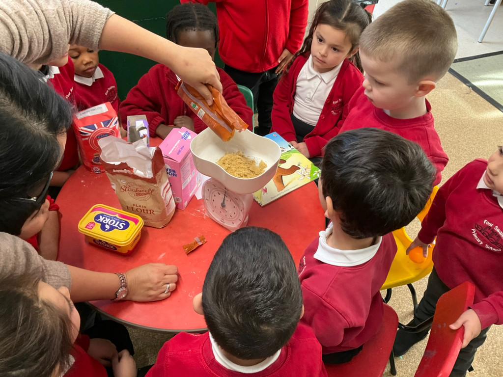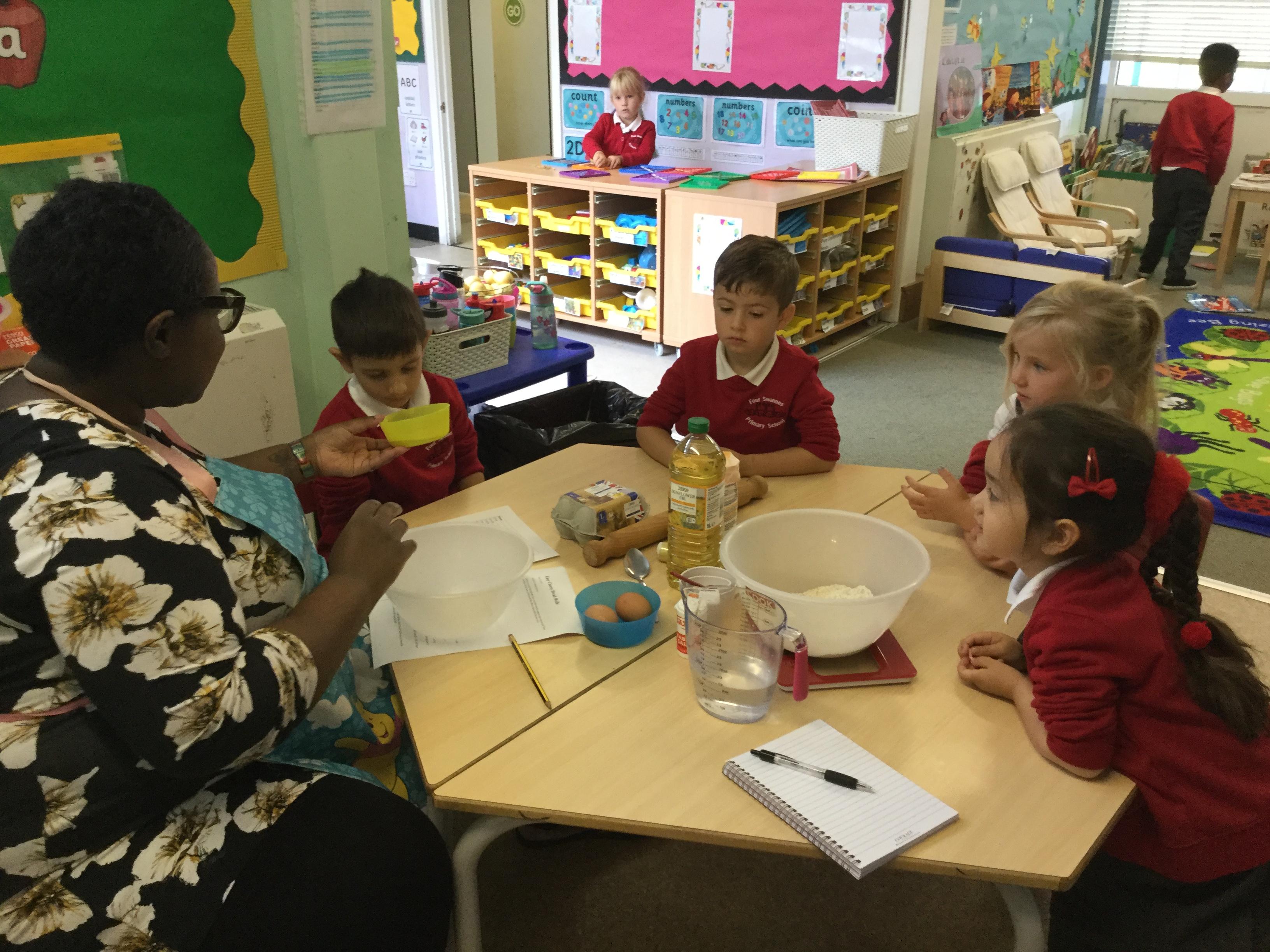 After reading the book, “The Gingerbread man”, the children cooked Gingerbread men biscuits using plain flour, soft brown sugar, egg, ginger powder, golden syrup, bicarbonate soda, butter. There was a lot of mathematical skills used as the children had to measure out the ingredients.