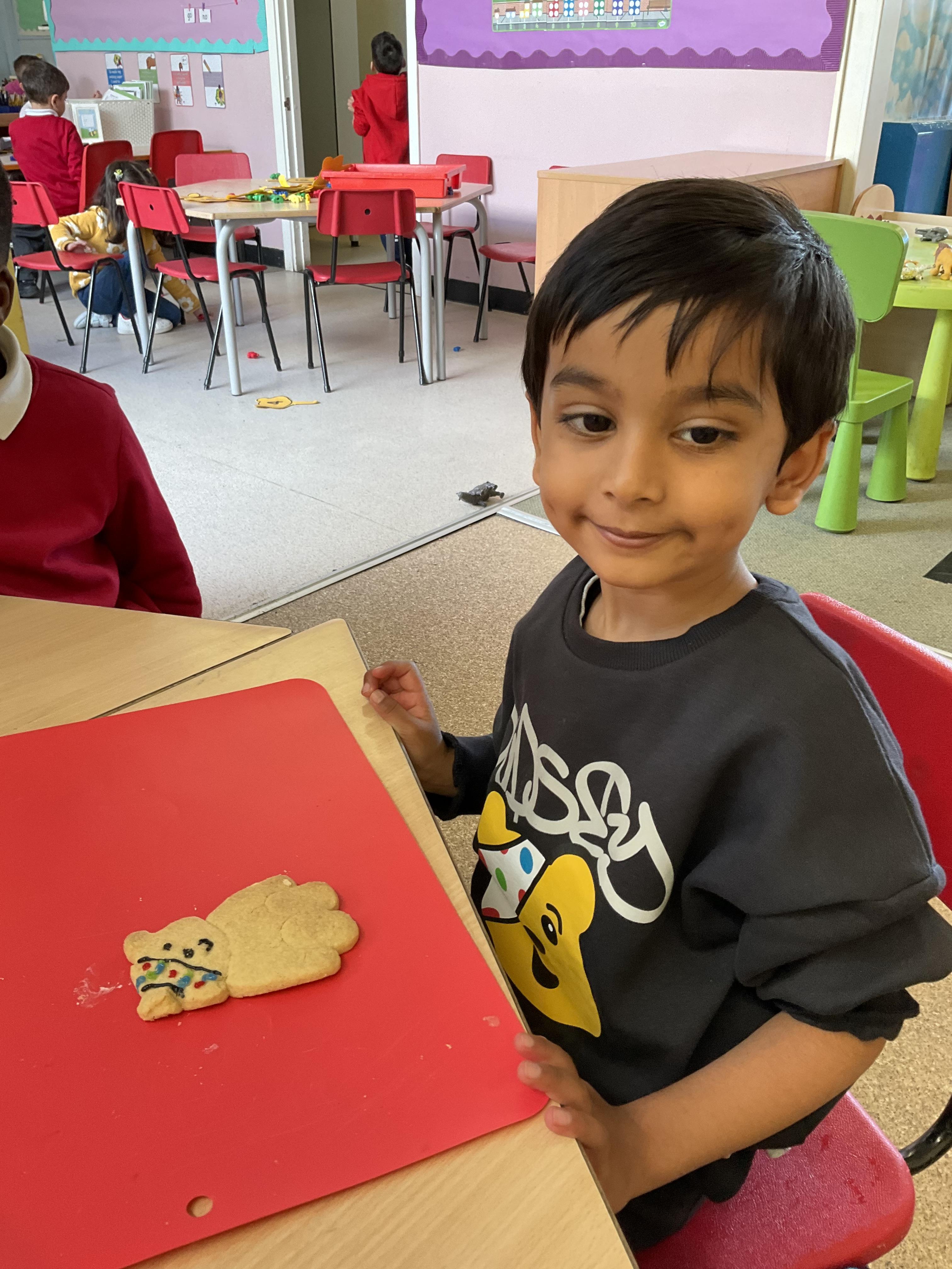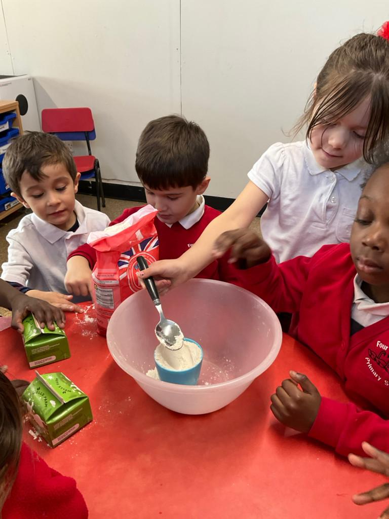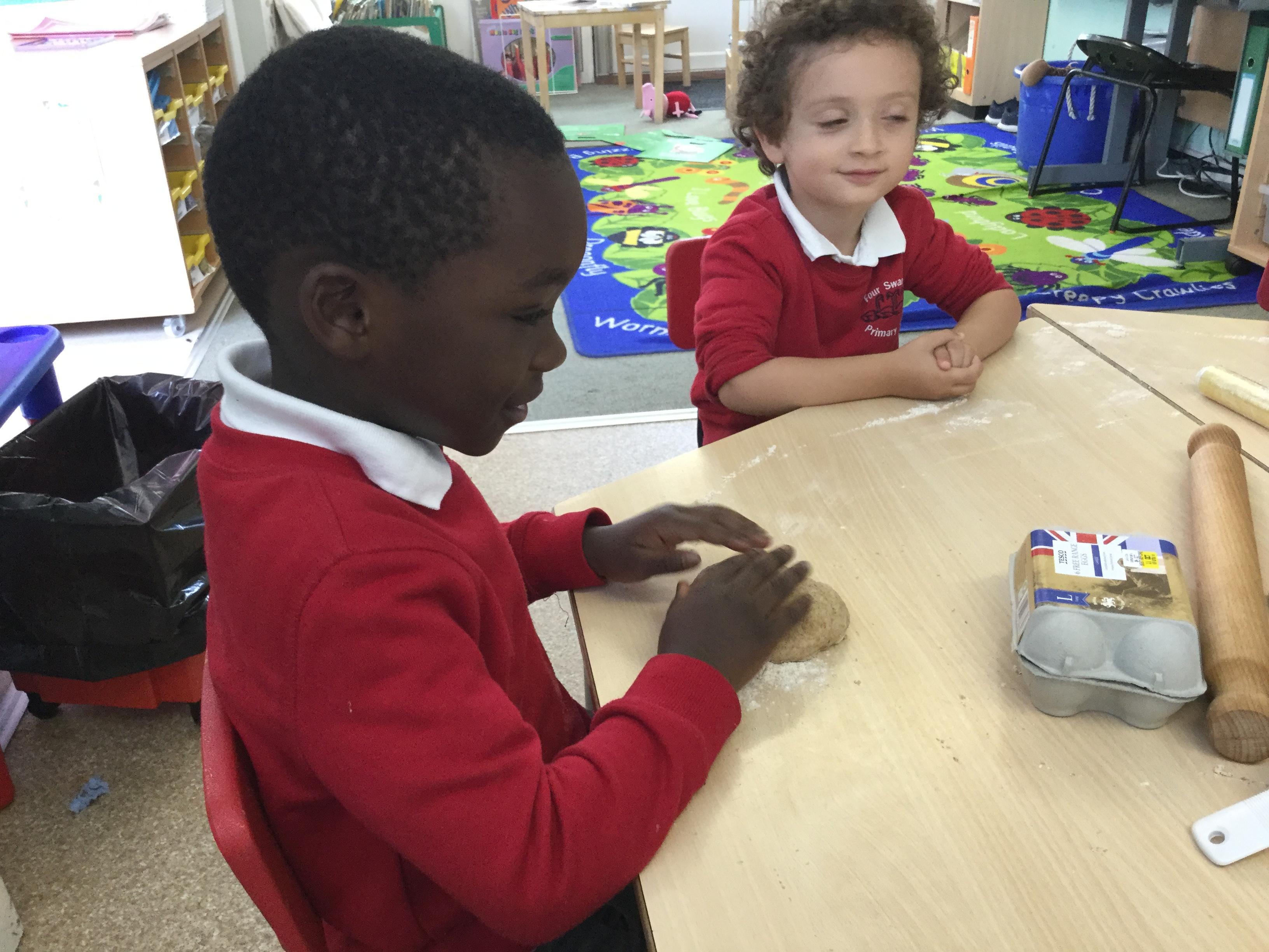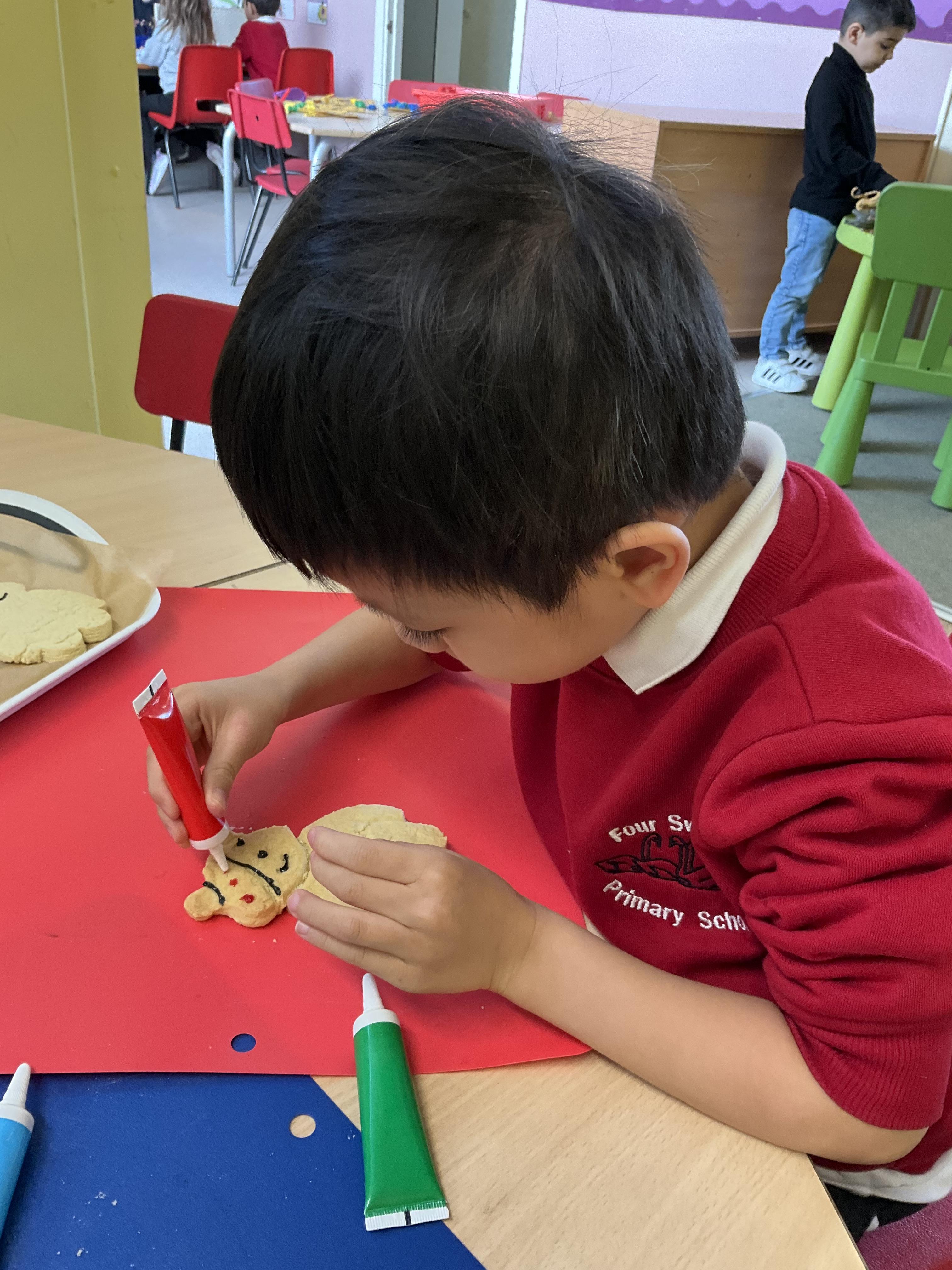 After reading the book, “The Gingerbread man”, the children cooked Gingerbread men biscuits using plain flour, soft brown sugar, egg, ginger powder, golden syrup, bicarbonate soda, butter. There was a lot of mathematical skills used as the children had to measure out the ingredients.