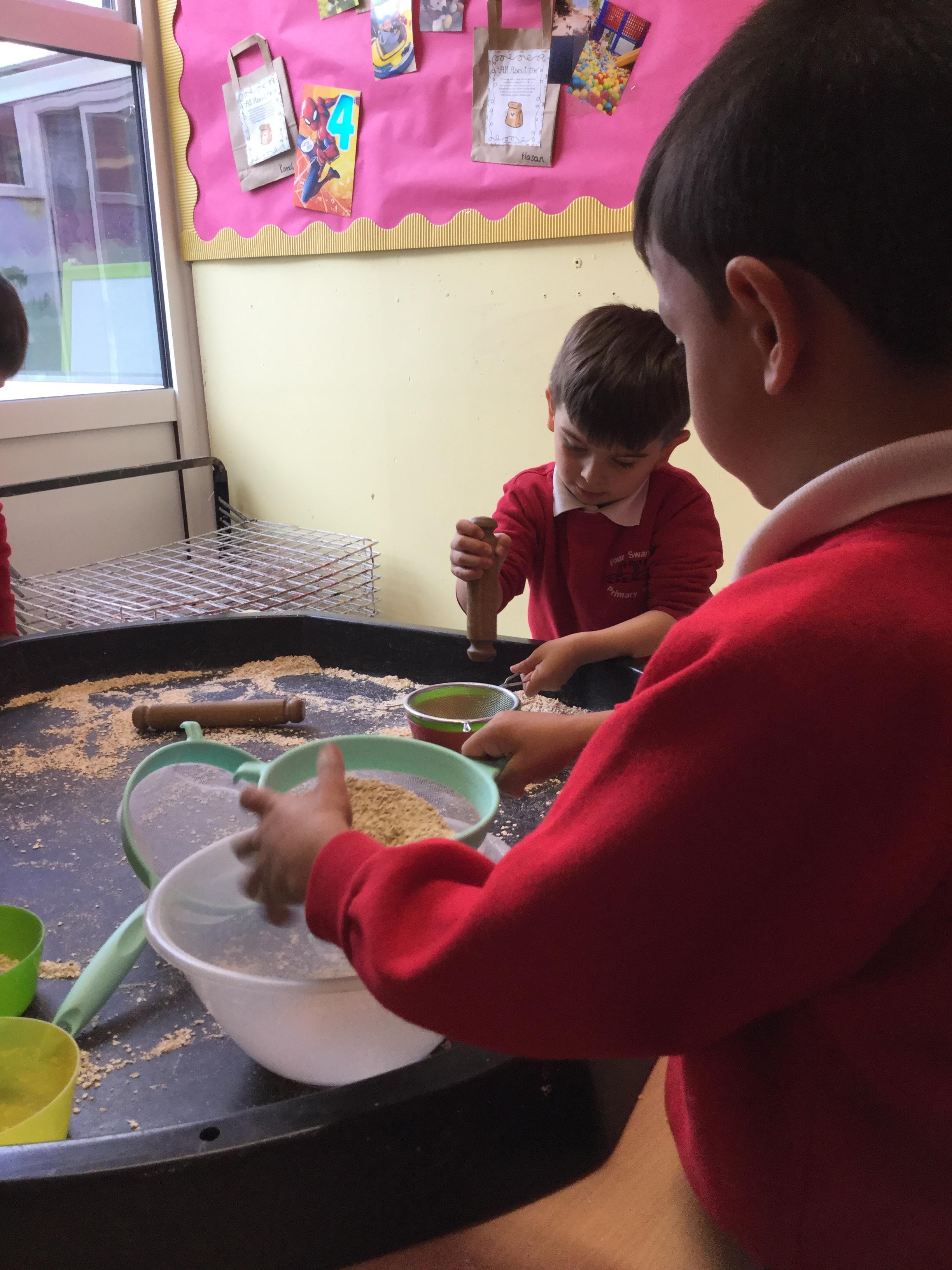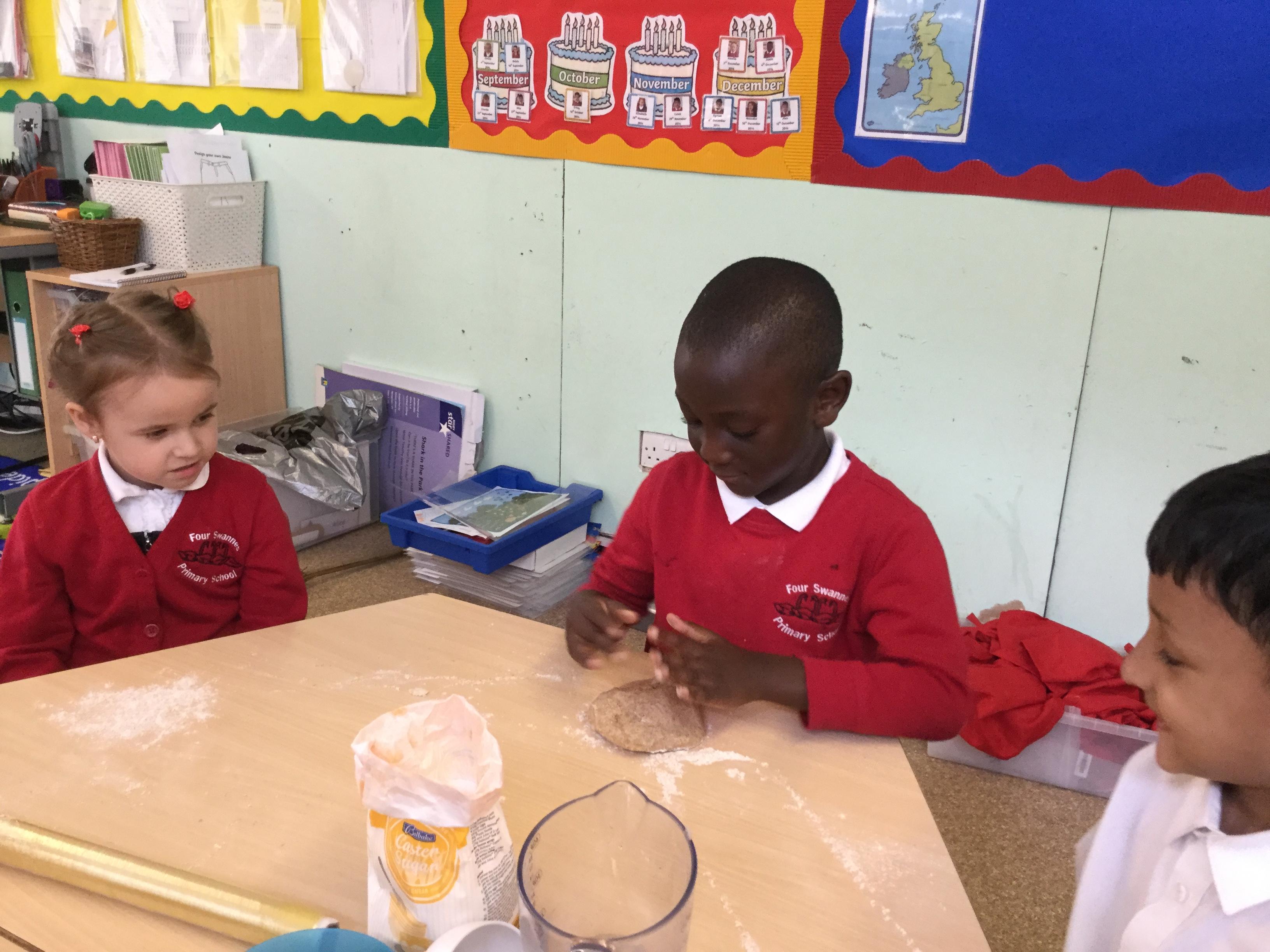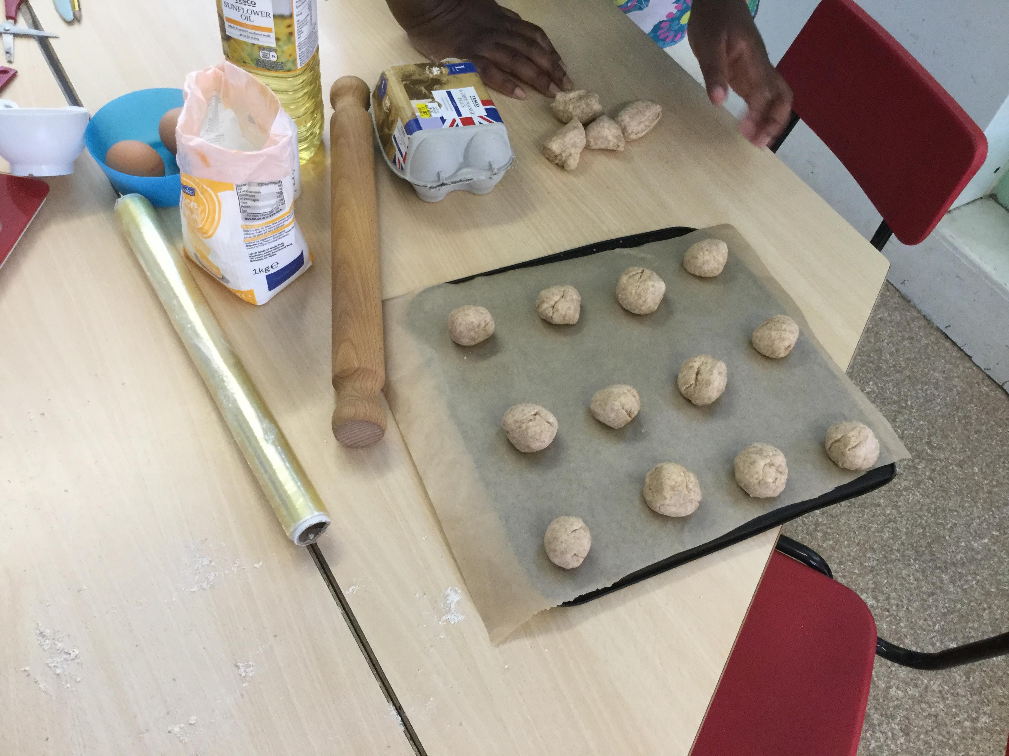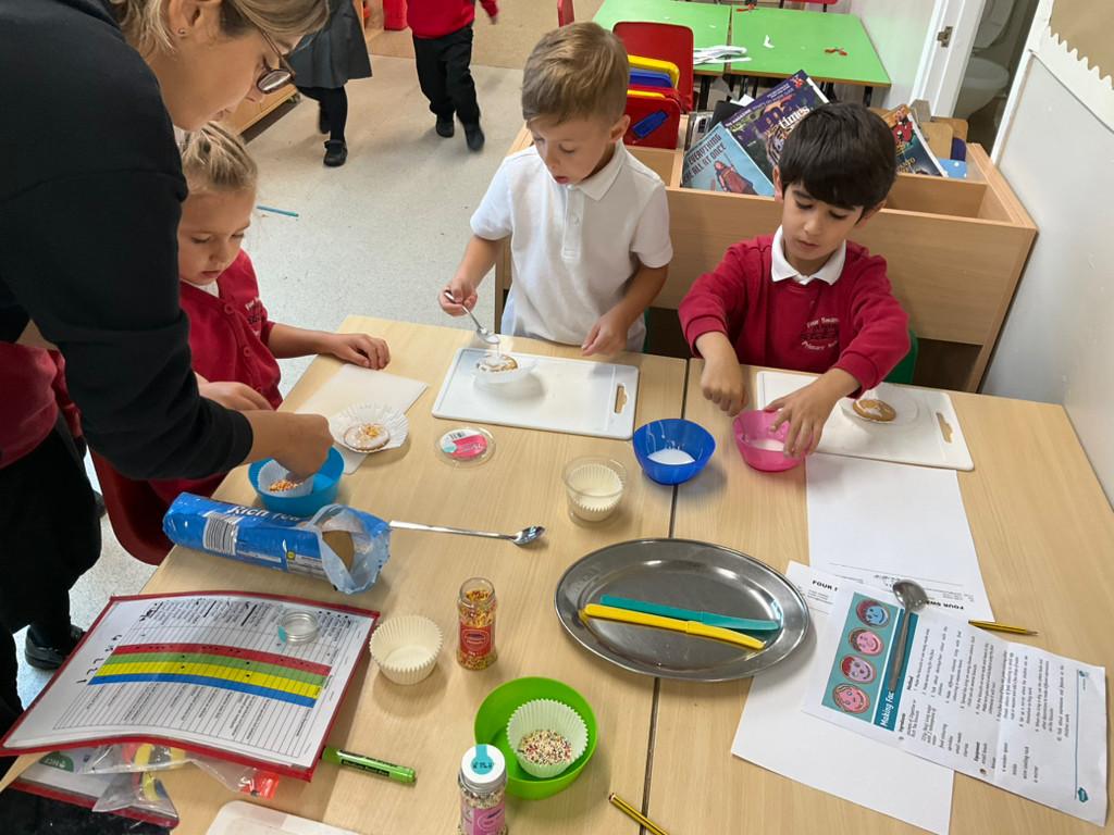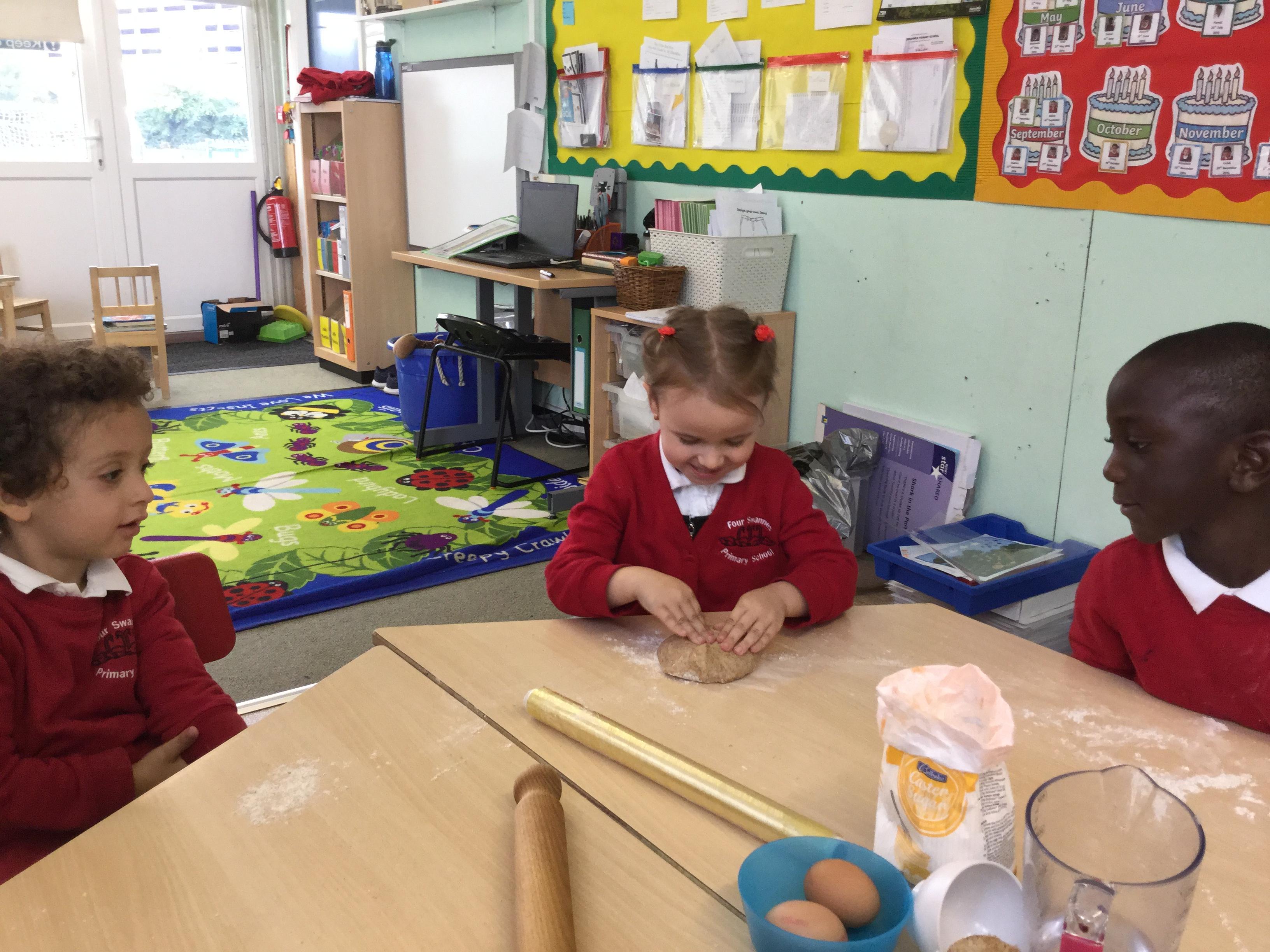 After reading the book, “The Gingerbread man”, the children cooked Gingerbread men biscuits using plain flour, soft brown sugar, egg, ginger powder, golden syrup, bicarbonate soda, butter. There was a lot of mathematical skills used as the children had to measure out the ingredients.