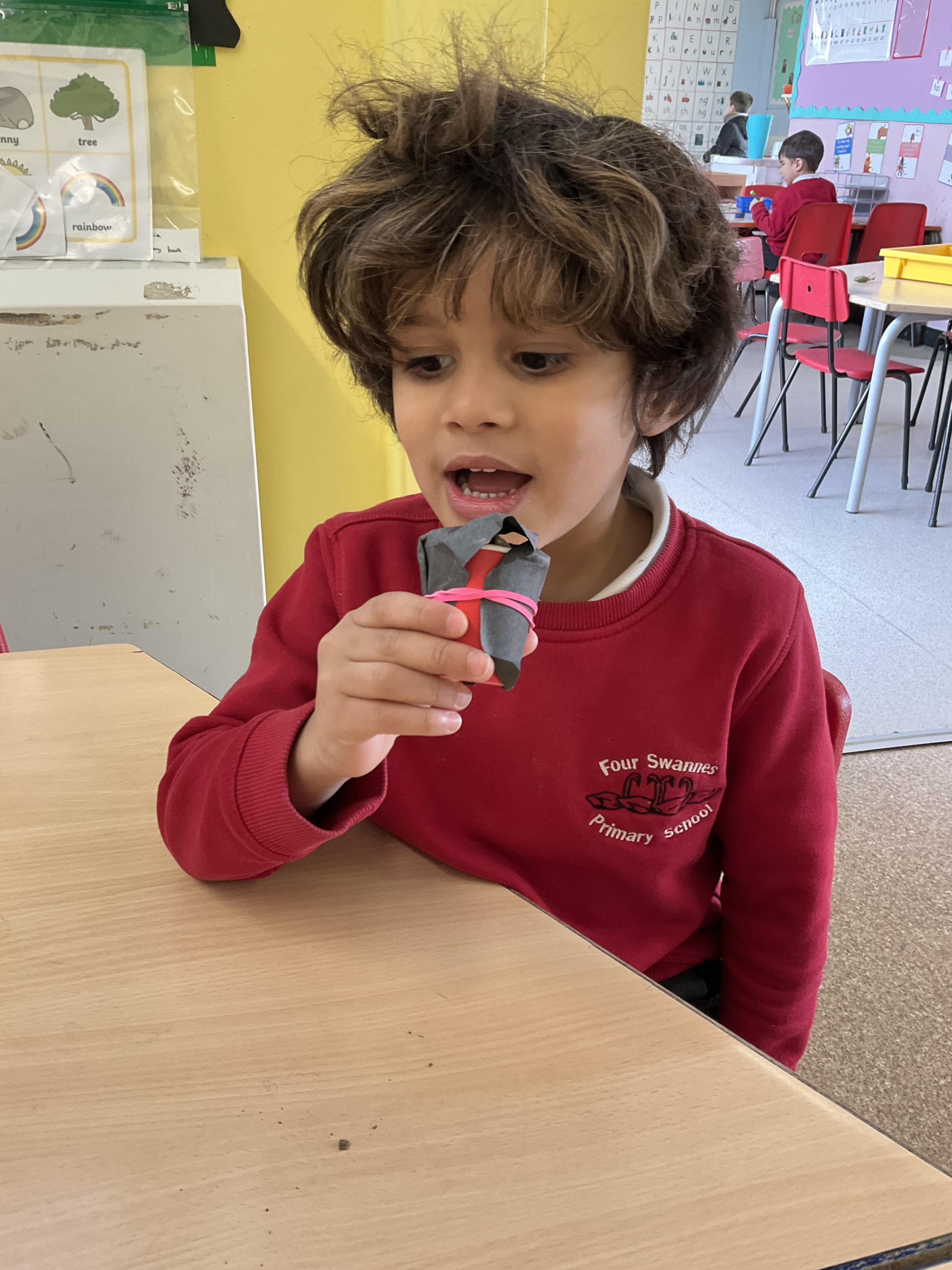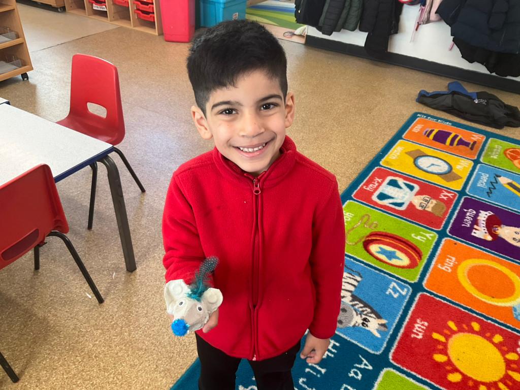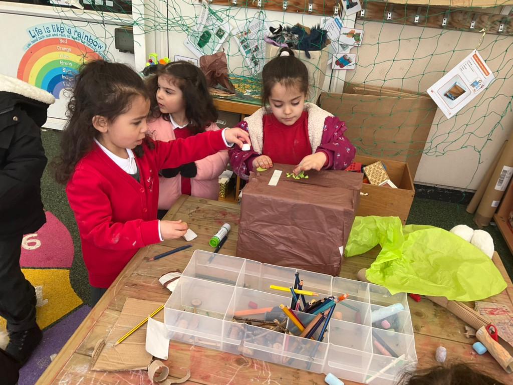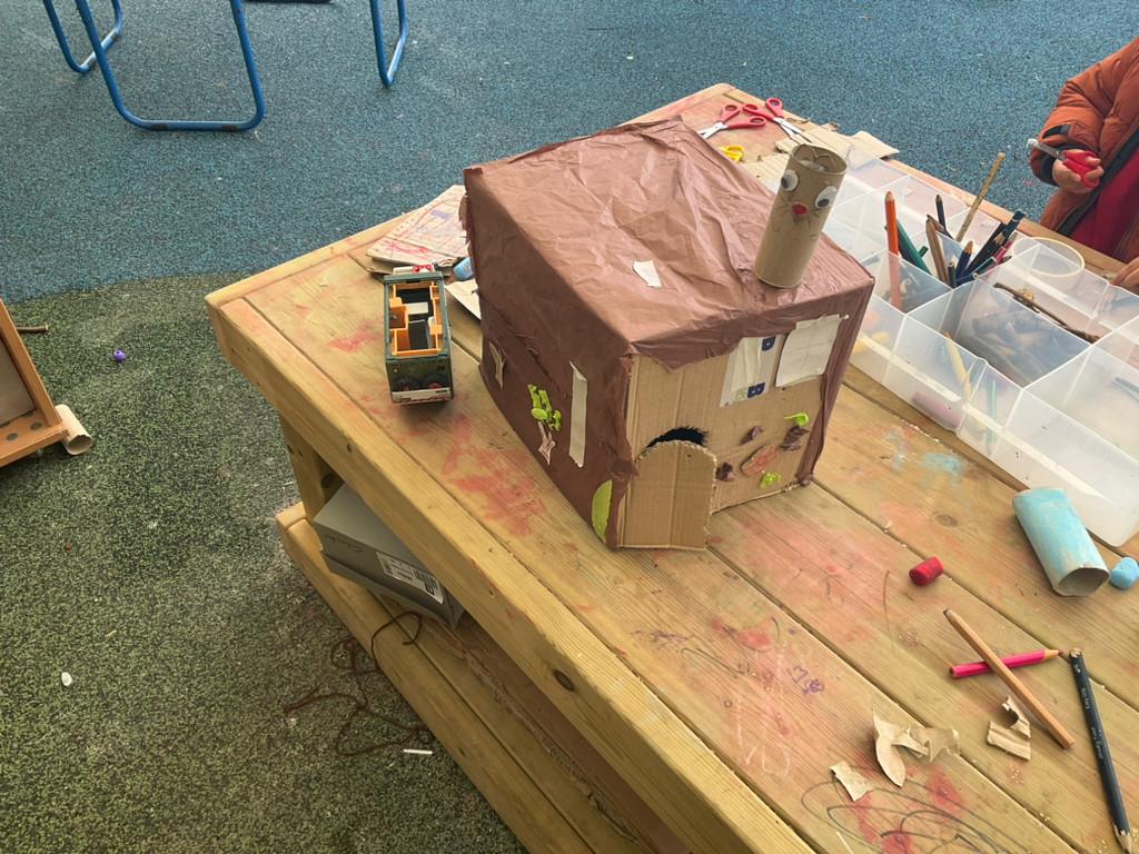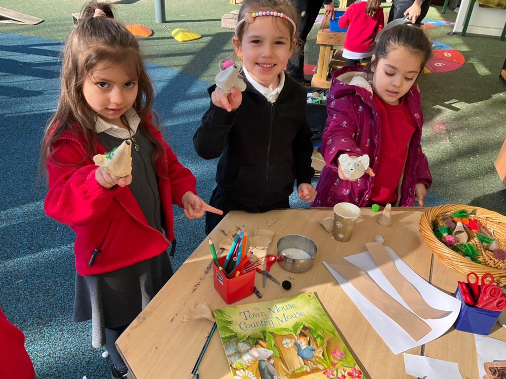 After reading our topic book, “Town mouse and country mouse”, the children used the junk modelling materials to make a house for the mouse. They chose different materials to decorate the house. We also used egg boxes and goggly eyes to make the face of a mouse and the children chose different coloured feathers to decorate the mouse. Through the story, we discussed the difference between a town and a country and the children identified the features that you would find in a town but not in a country, like big buildings and lots of cars and buses.