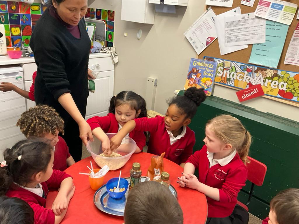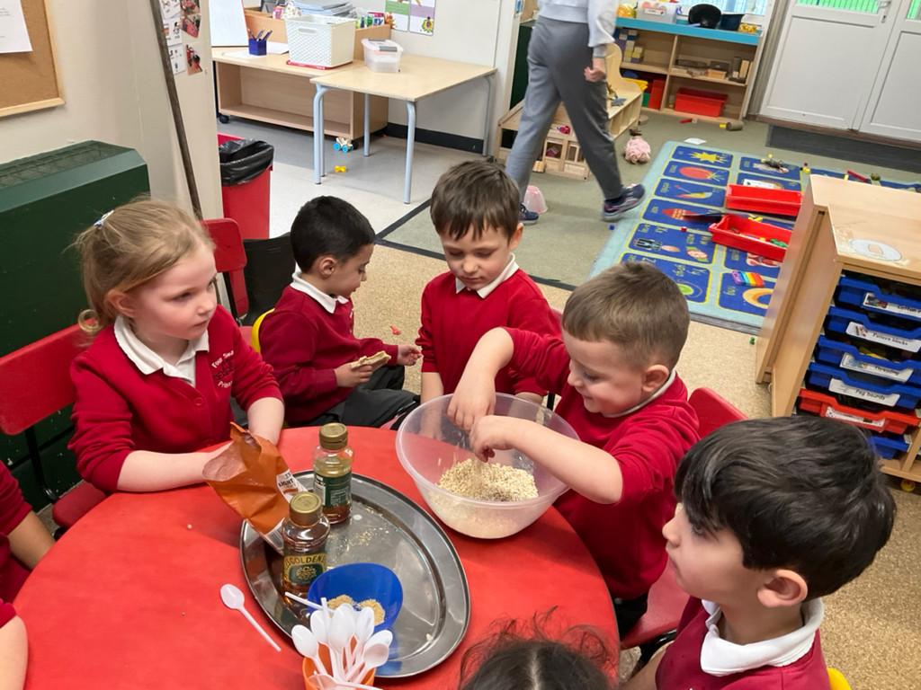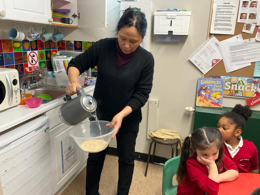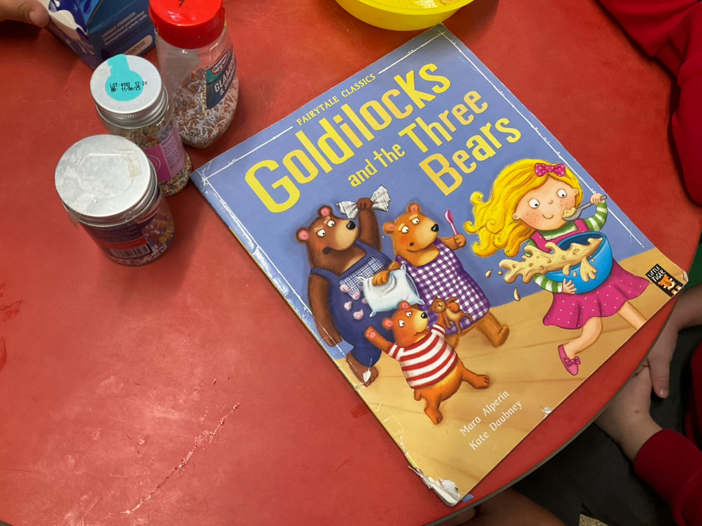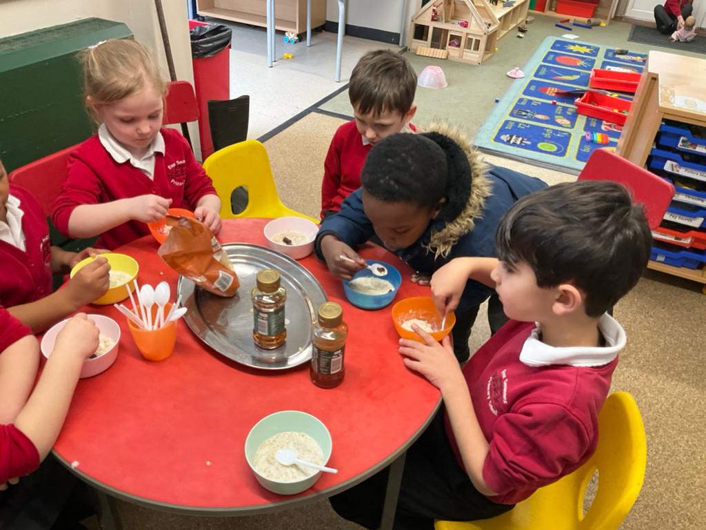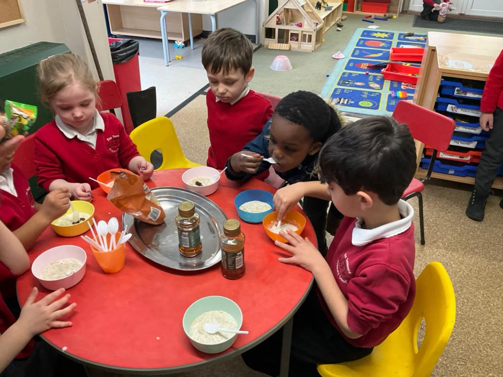 After reading the book, Goldilocks and the three Bears, the children cooked porridge. They observed how the oats changed after adding hot water and after being cooked in the microwave. The children had a selection of toppings to choose from. They enjoyed their porridge and many went for second helpings.