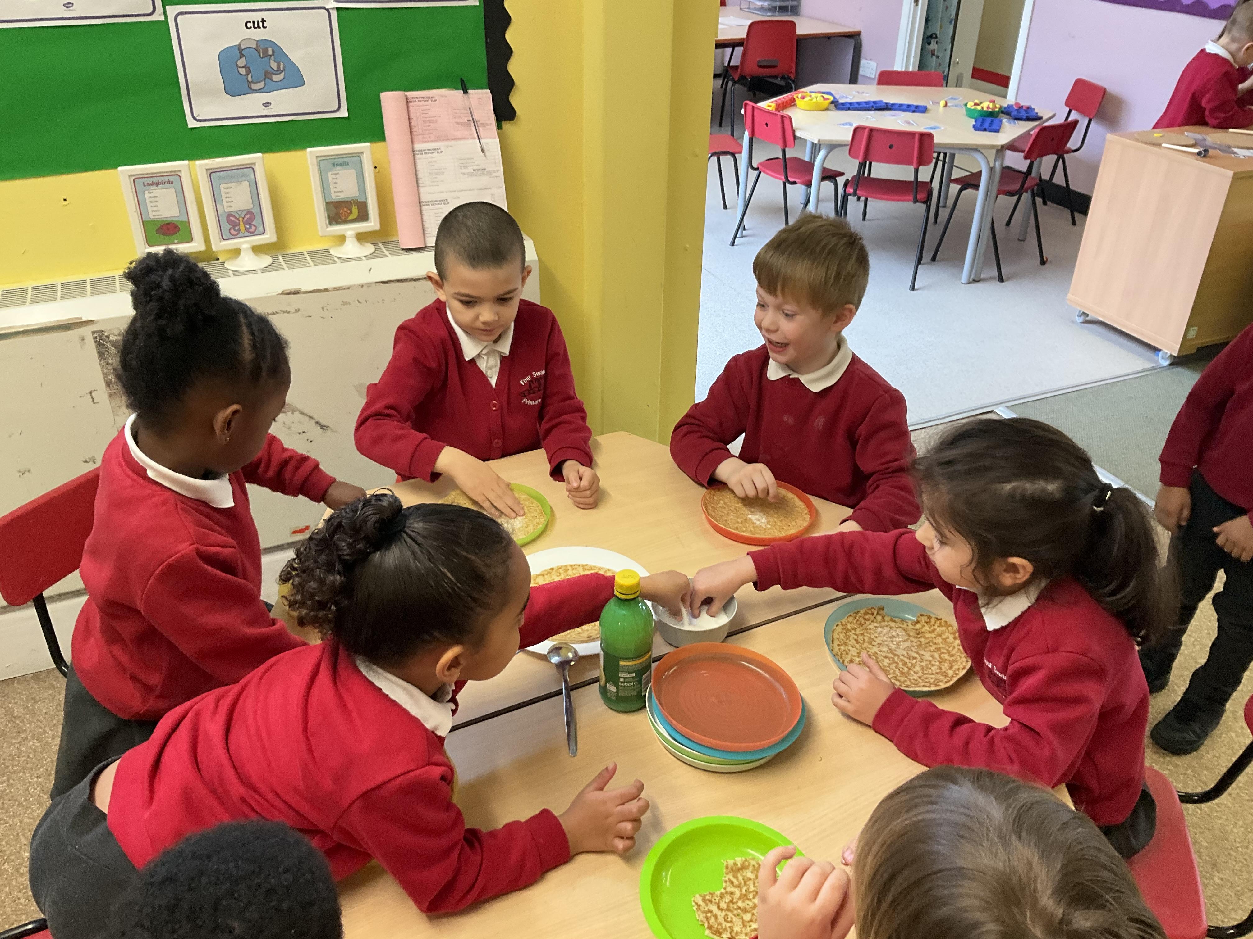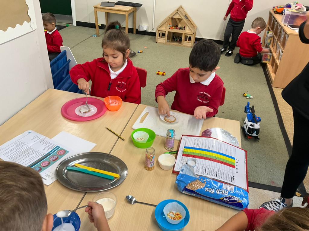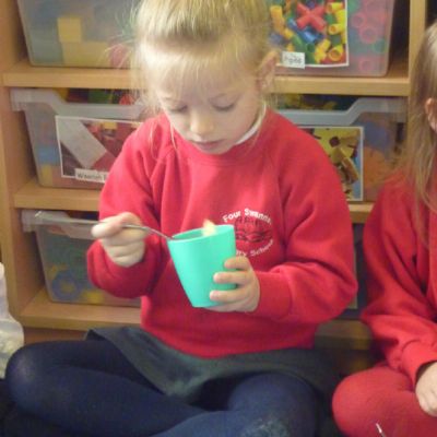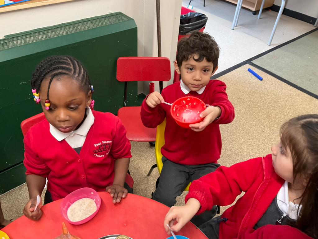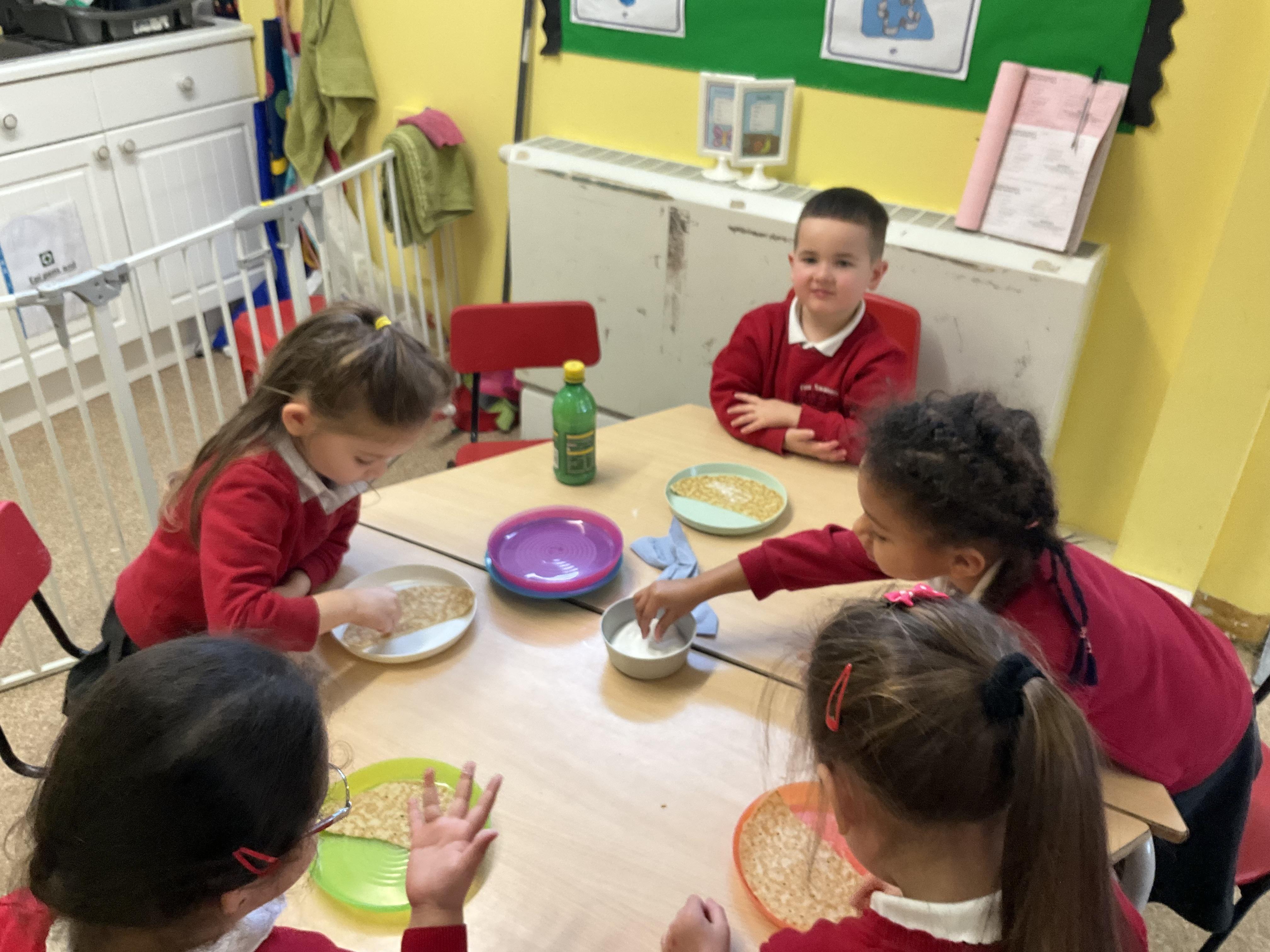 After reading the book, Goldilocks and the three Bears, the children cooked porridge. They observed how the oats changed after adding hot water and after being cooked in the microwave. The children had a selection of toppings to choose from. They enjoyed their porridge and many went for second helpings.