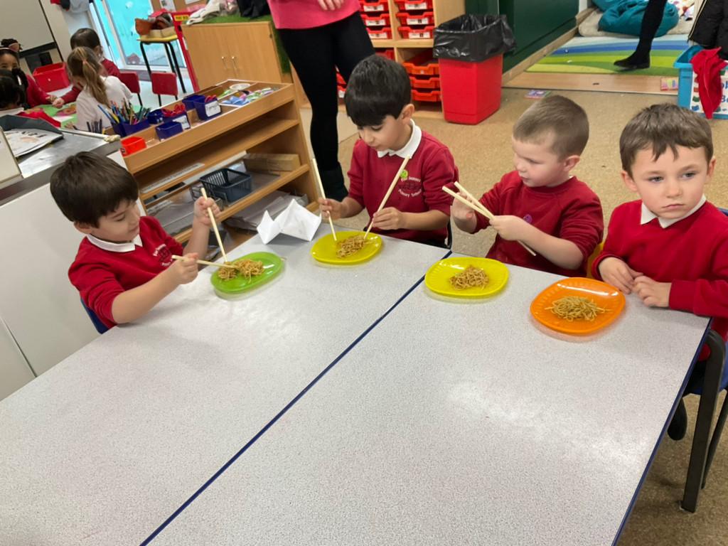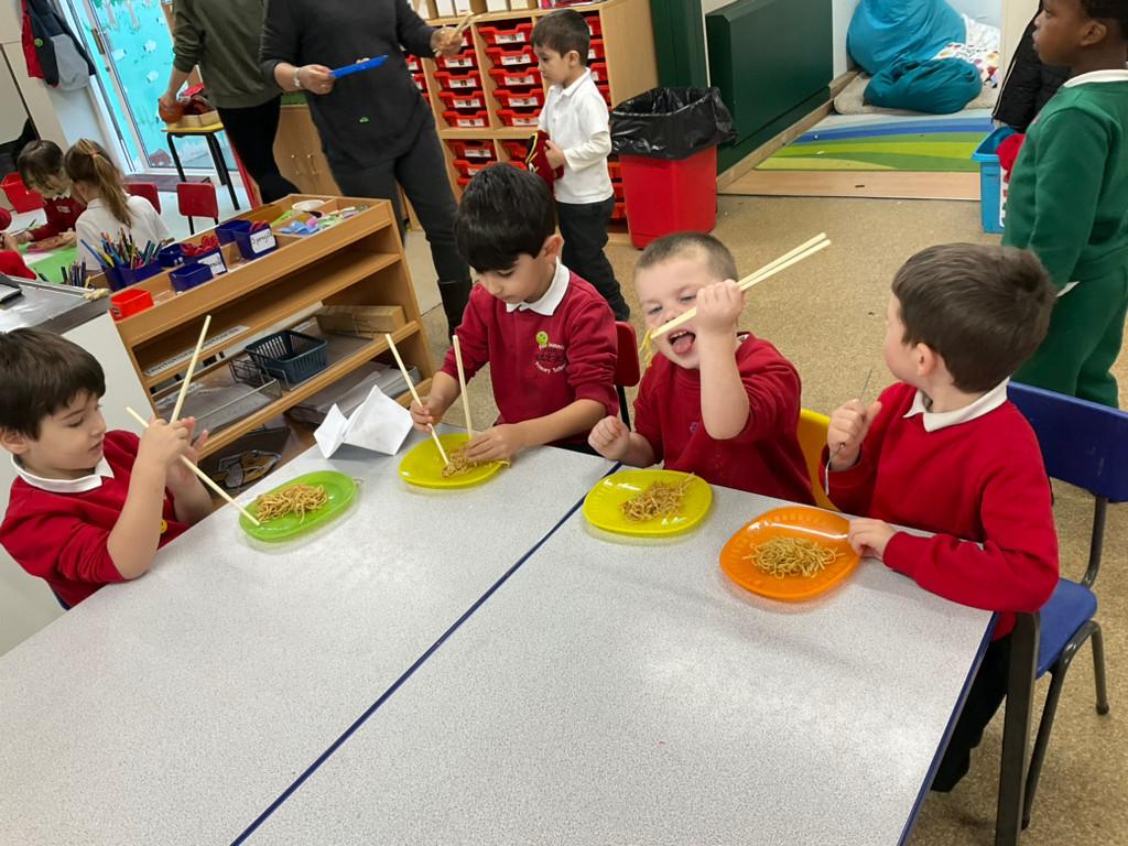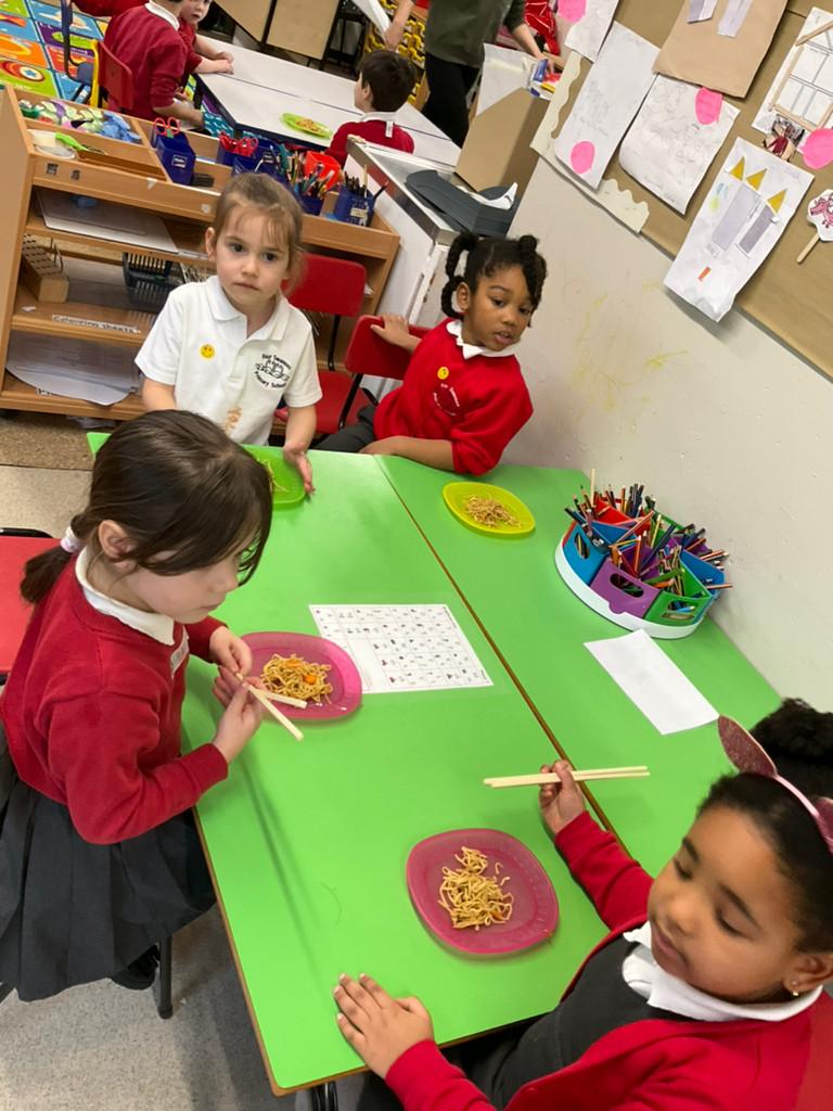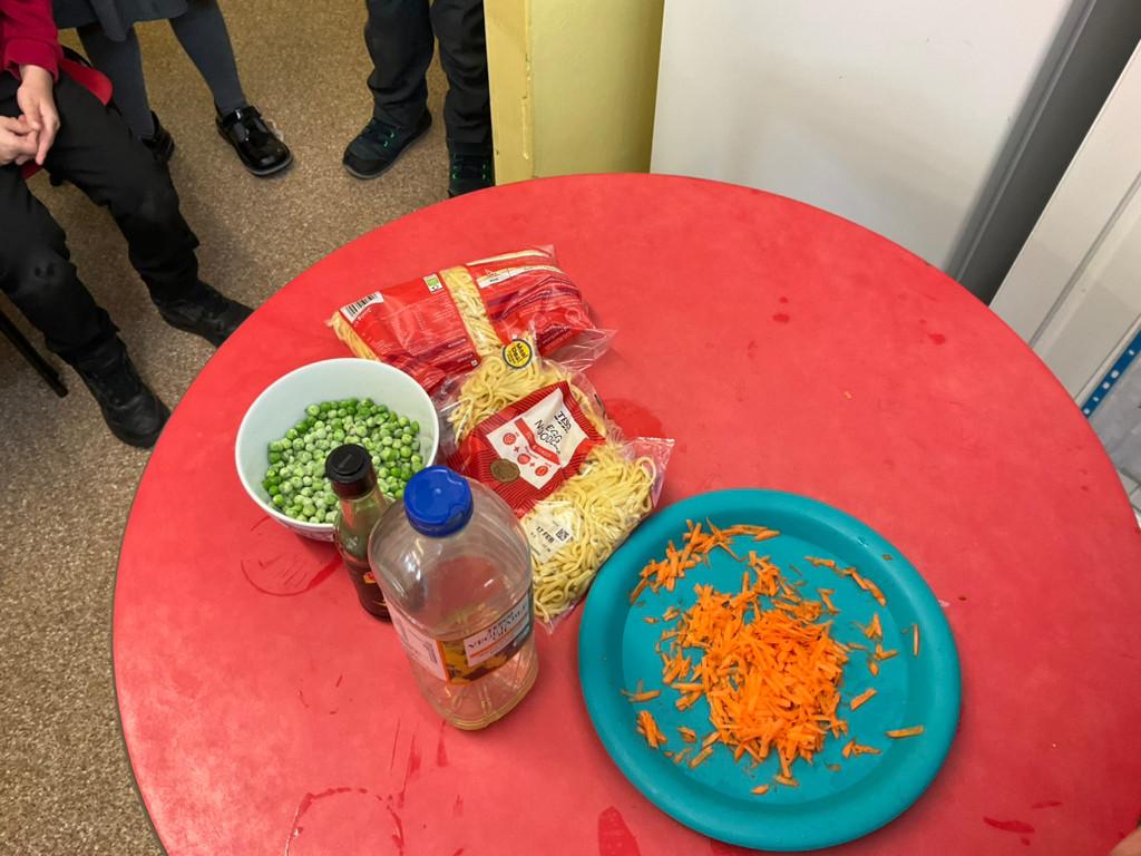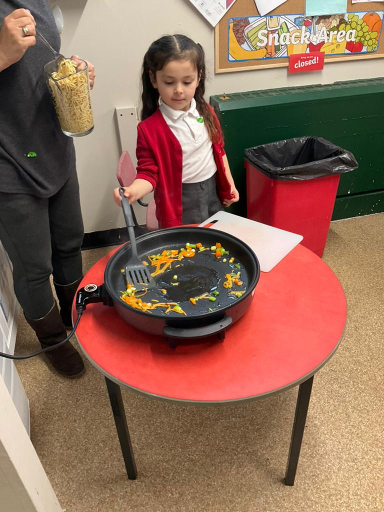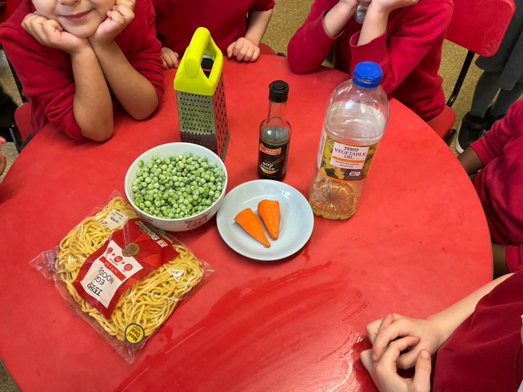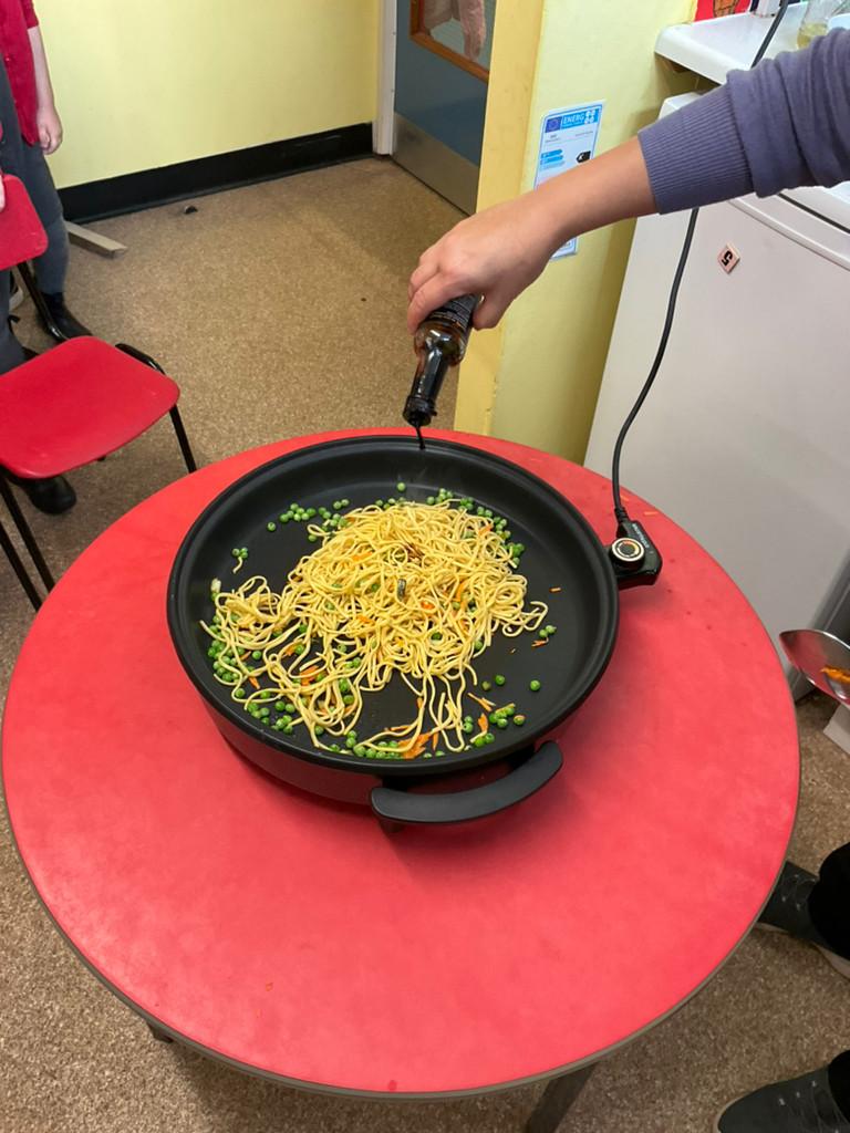 This week we celebrated Chinese new year by cooking noodles. We had to chop the carrots and spring onions before frying them. Then we added the cooked noodles and some flavouring using soya sauce.