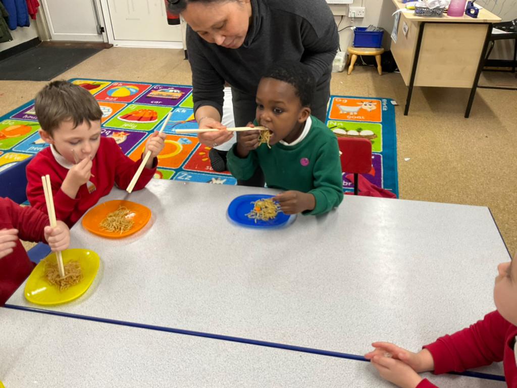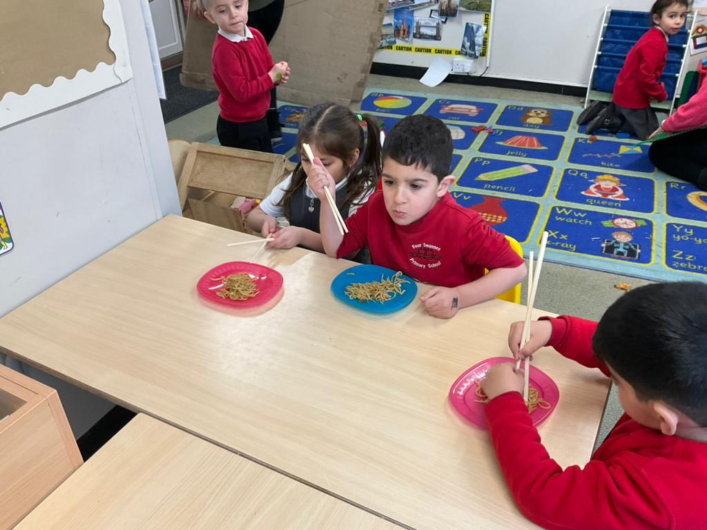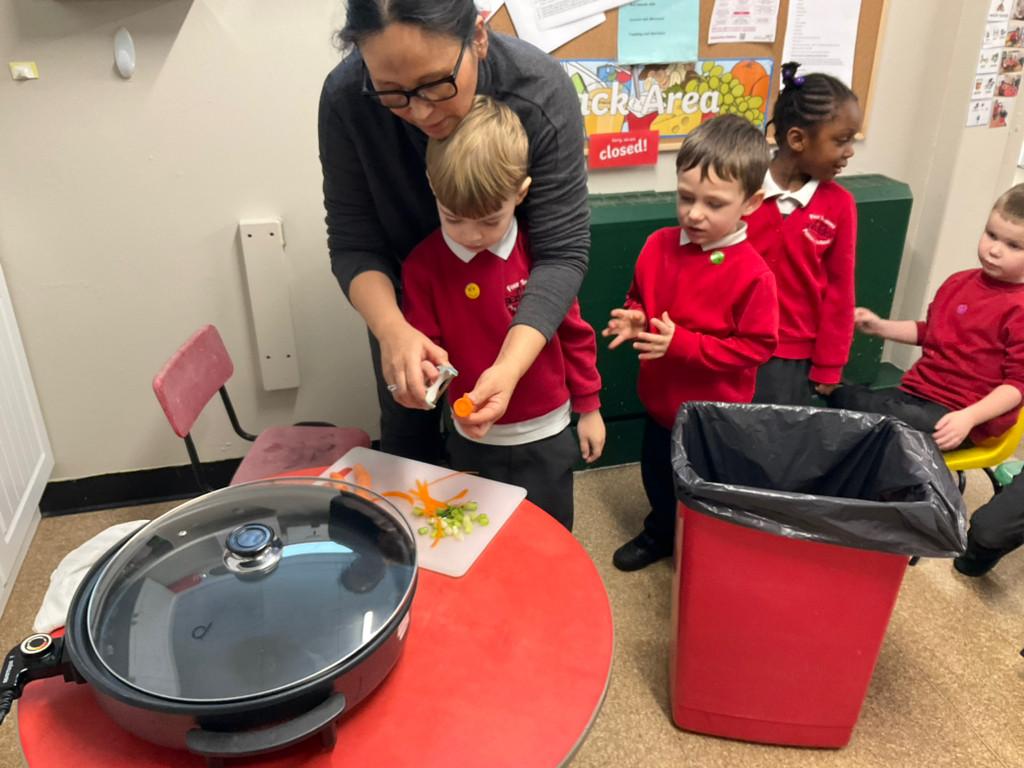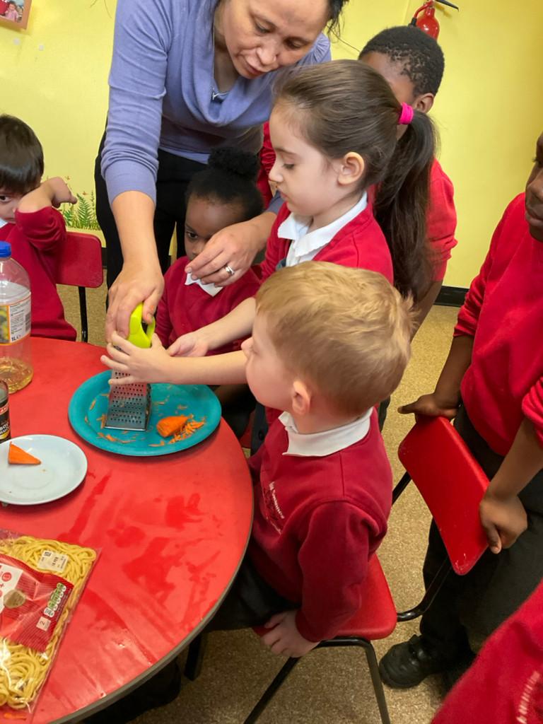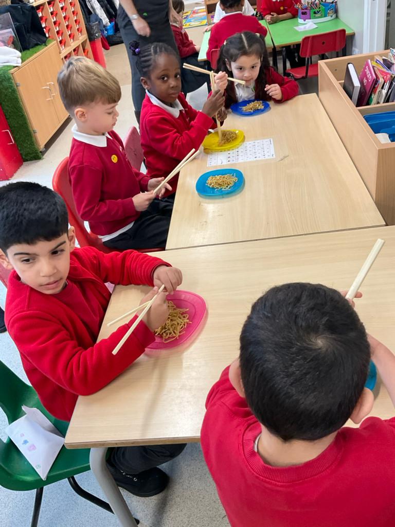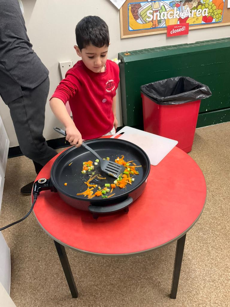 This week we celebrated Chinese new year by cooking noodles. We had to chop the carrots and spring onions before frying them. Then we added the cooked noodles and some flavouring using soya sauce.