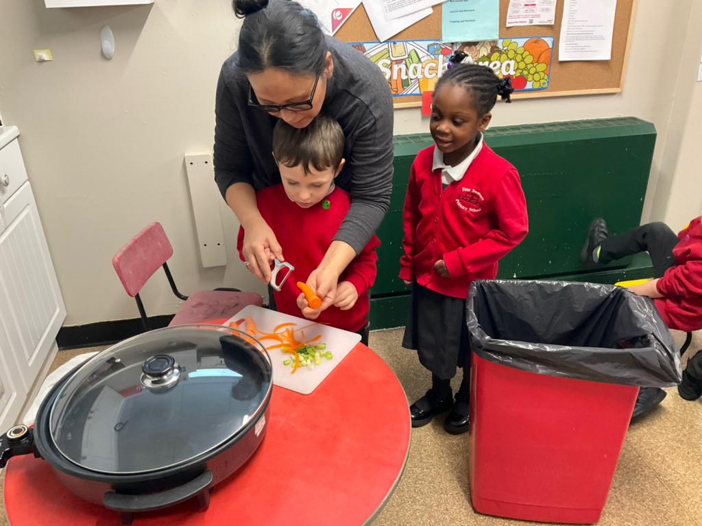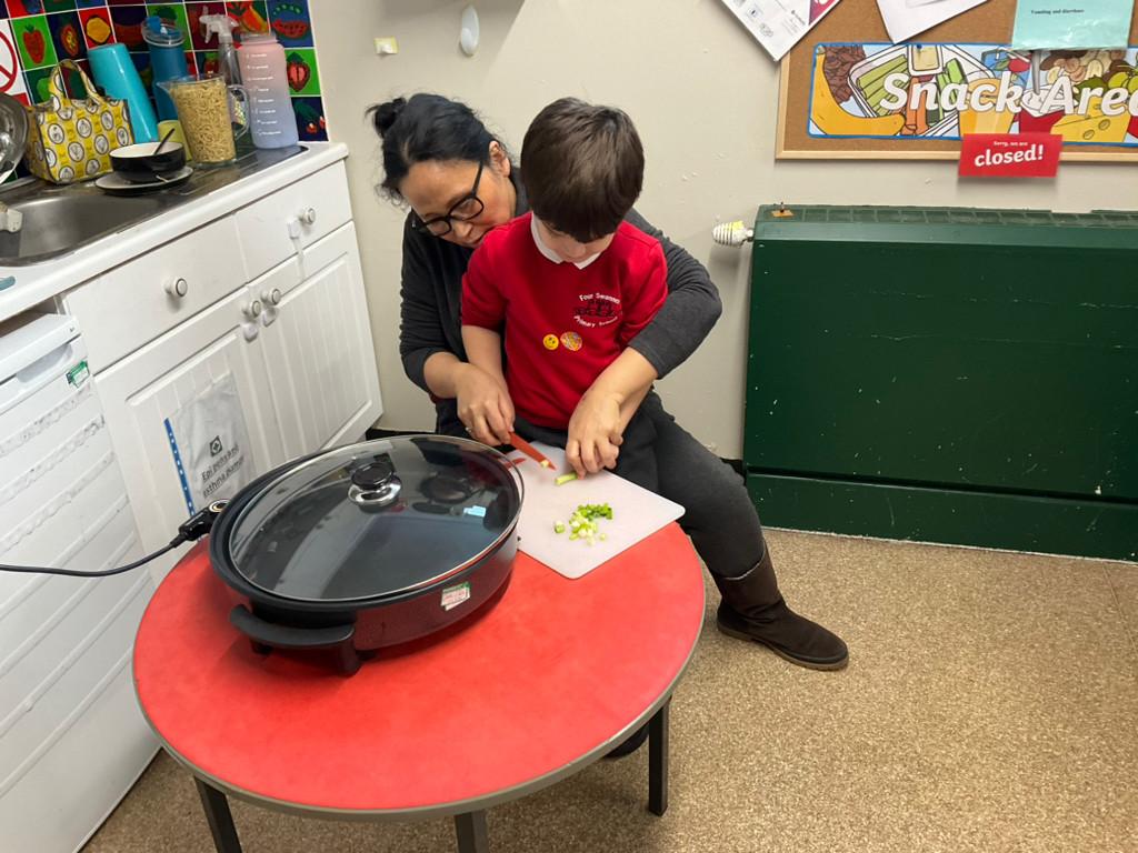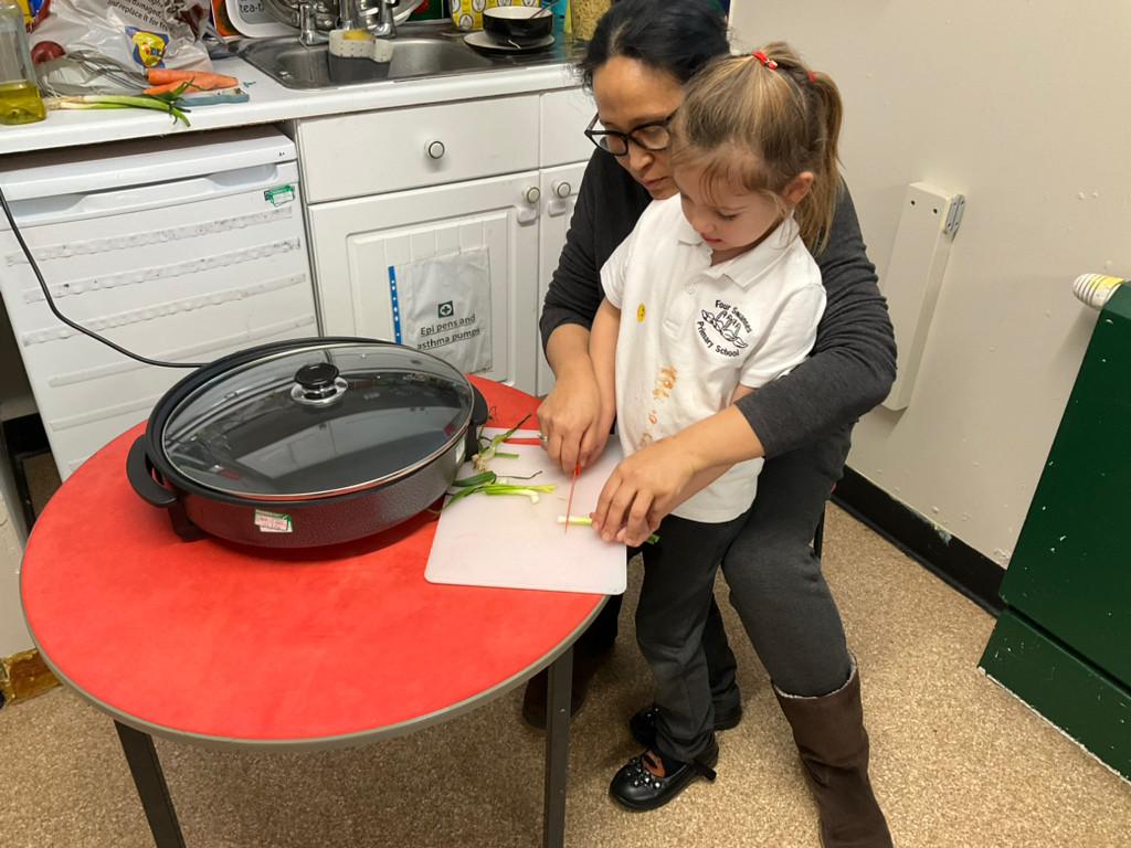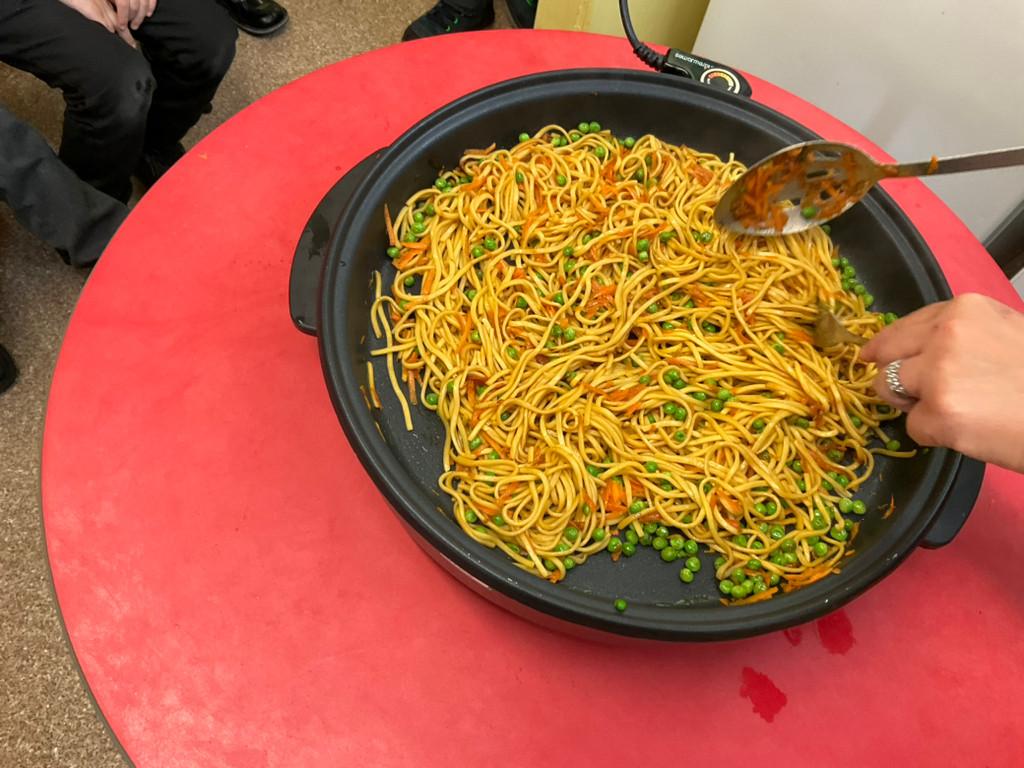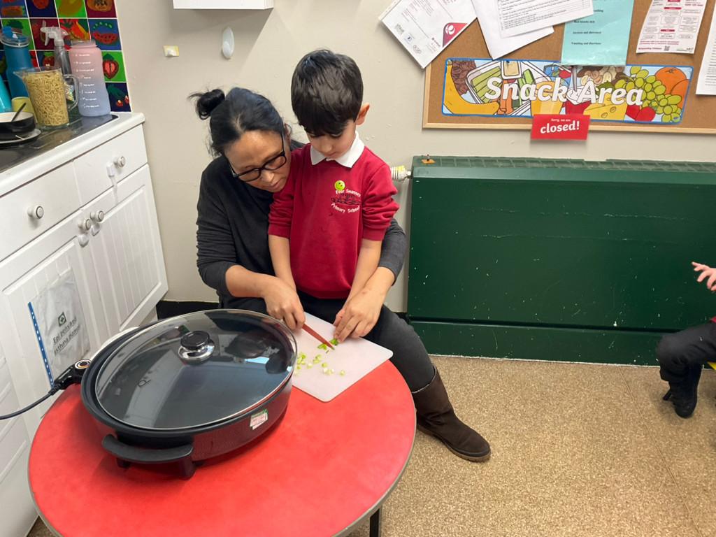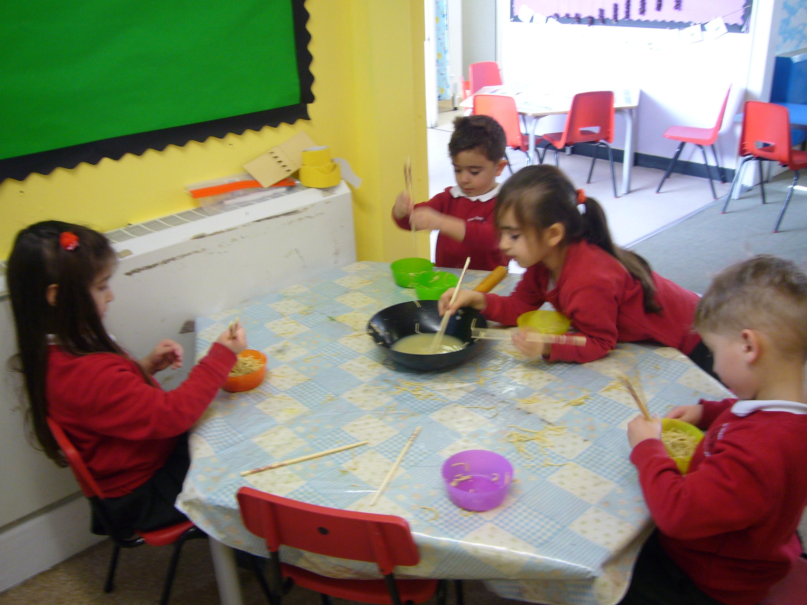 This week we celebrated Chinese new year by cooking noodles. We had to chop the carrots and spring onions before frying them. Then we added the cooked noodles and some flavouring using soya sauce.