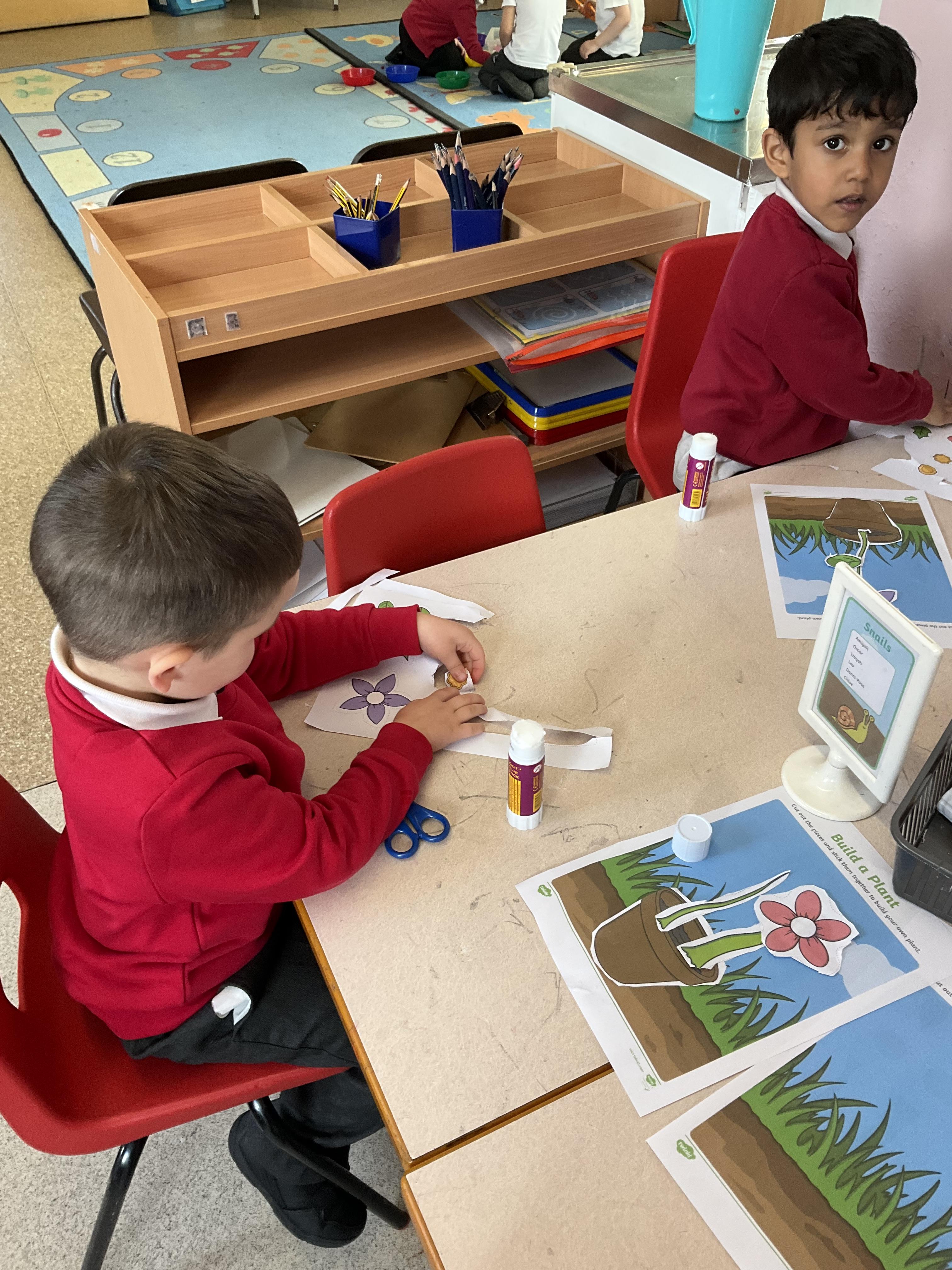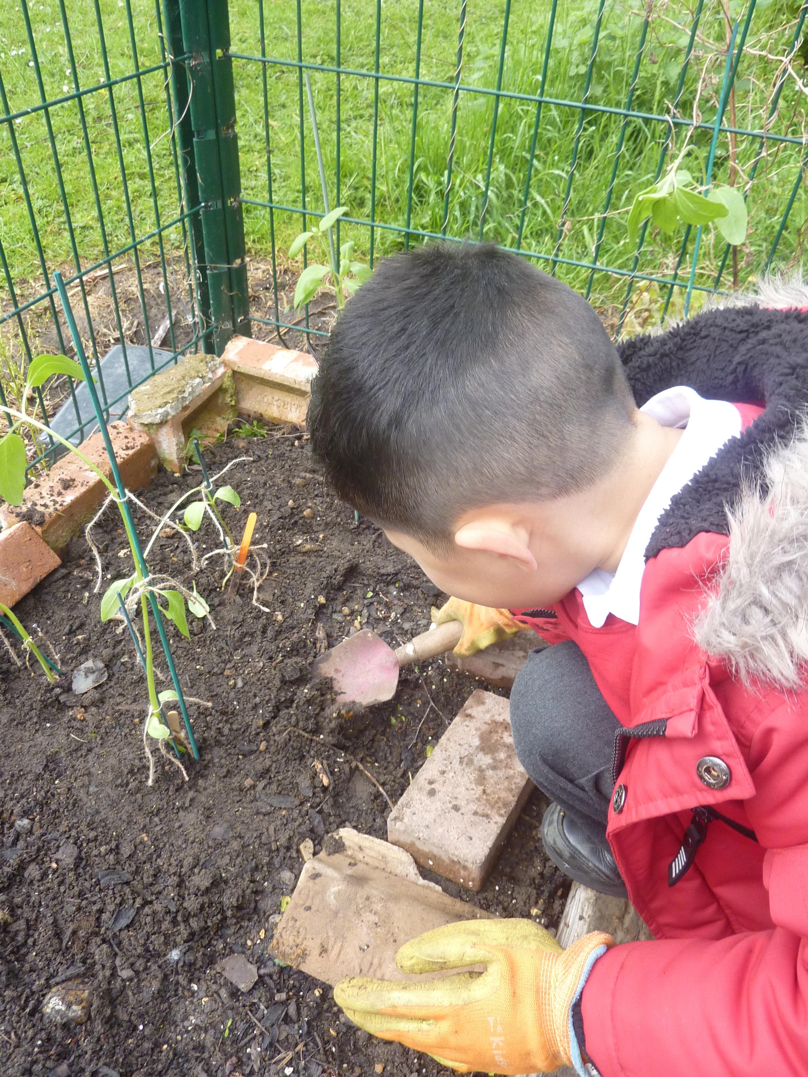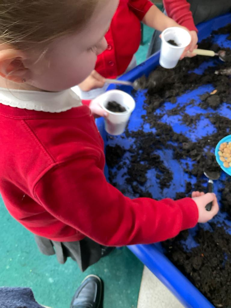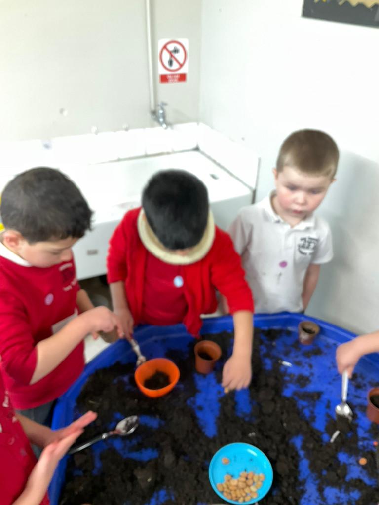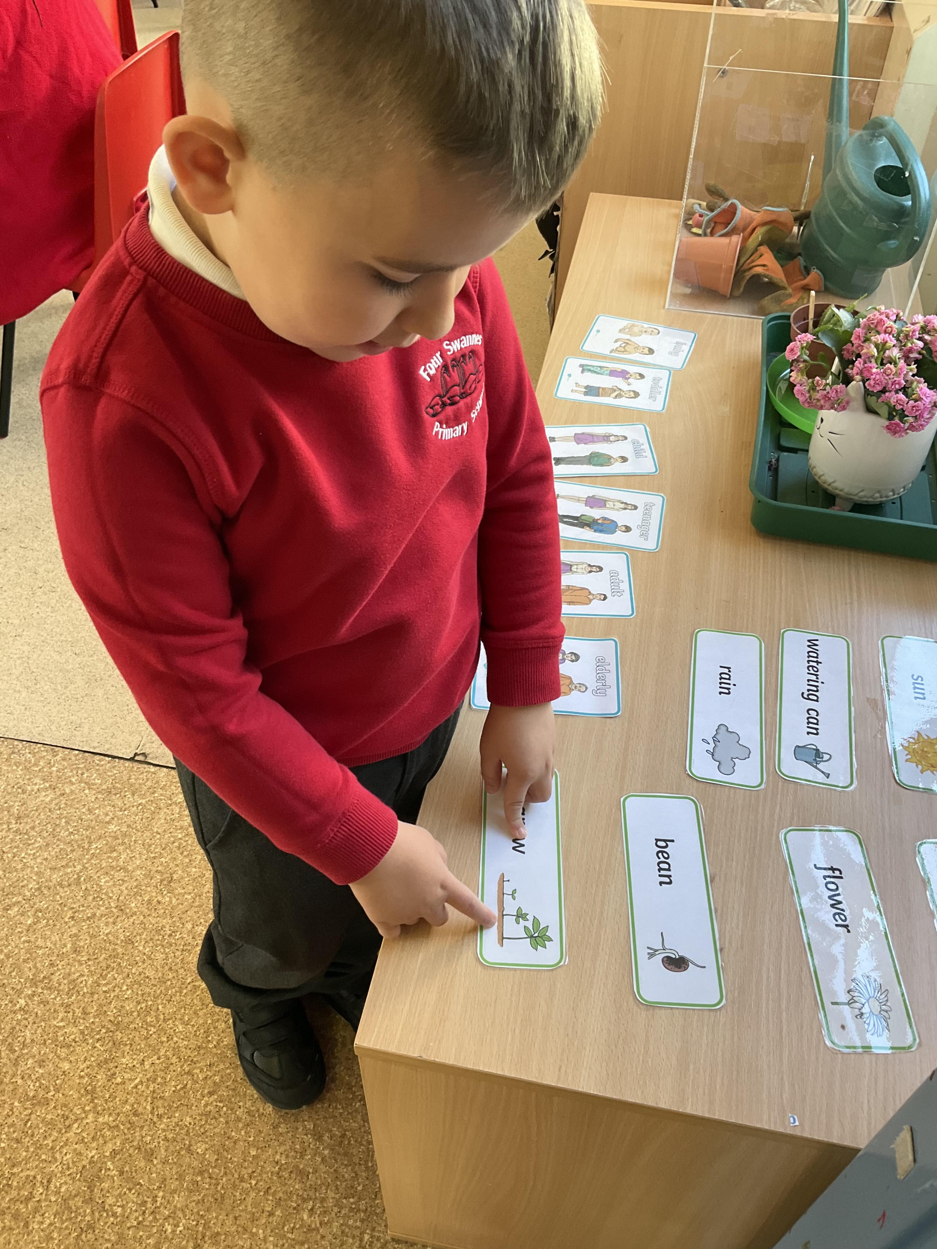 After reading, 'Jack and the Beanstalk', the children planted broad beans. They discussed the things that plants needed to grow; water, sun, space, soil and warmth. They also explored the different parts of the pea plant and the life cycle of a bean. Then they planted their own broad beans by following the instructions.