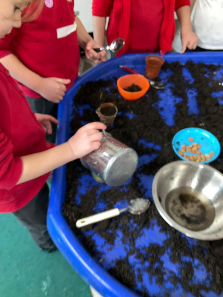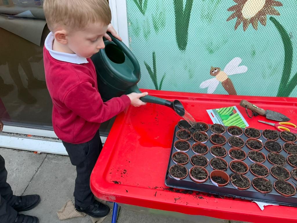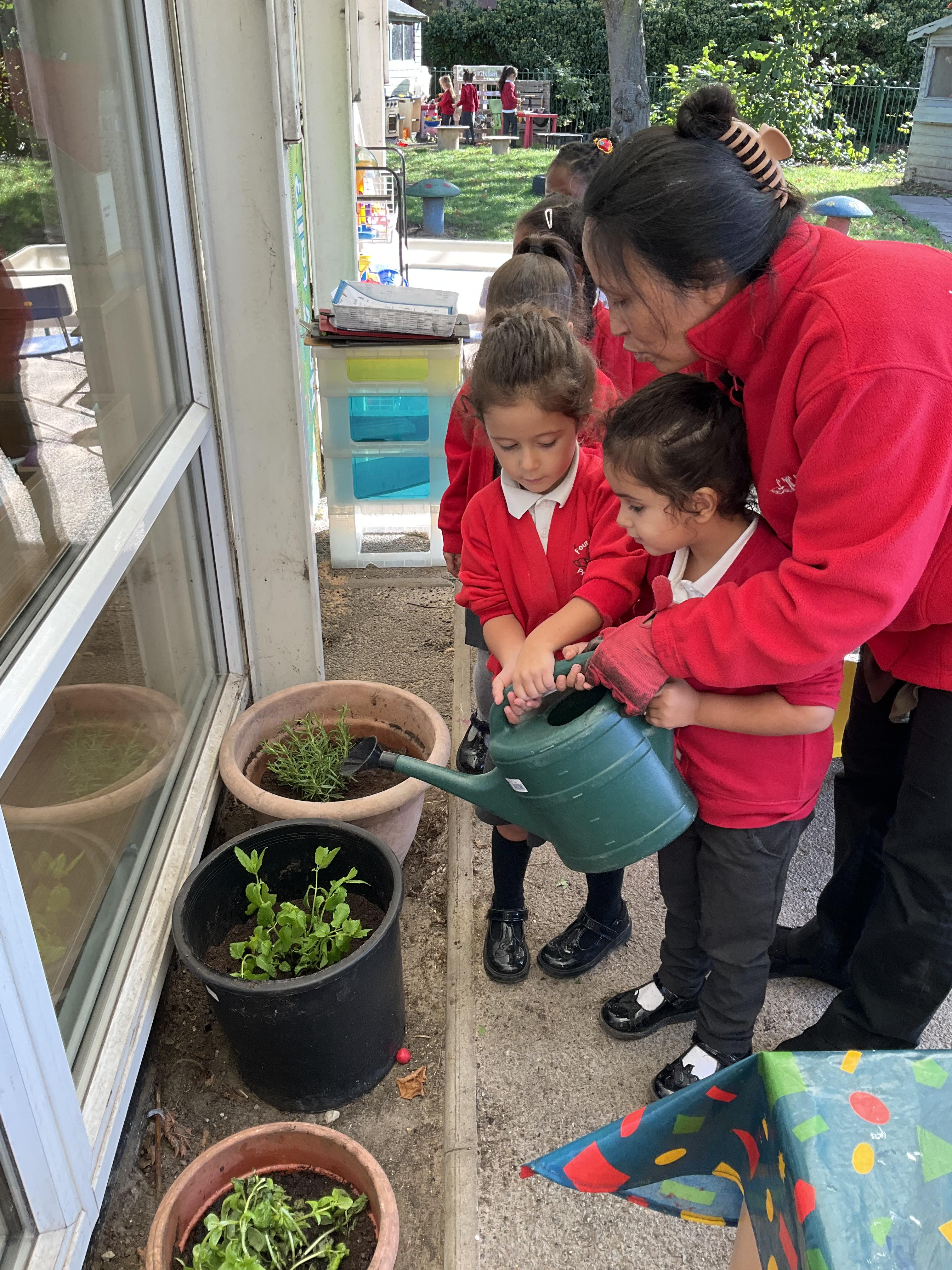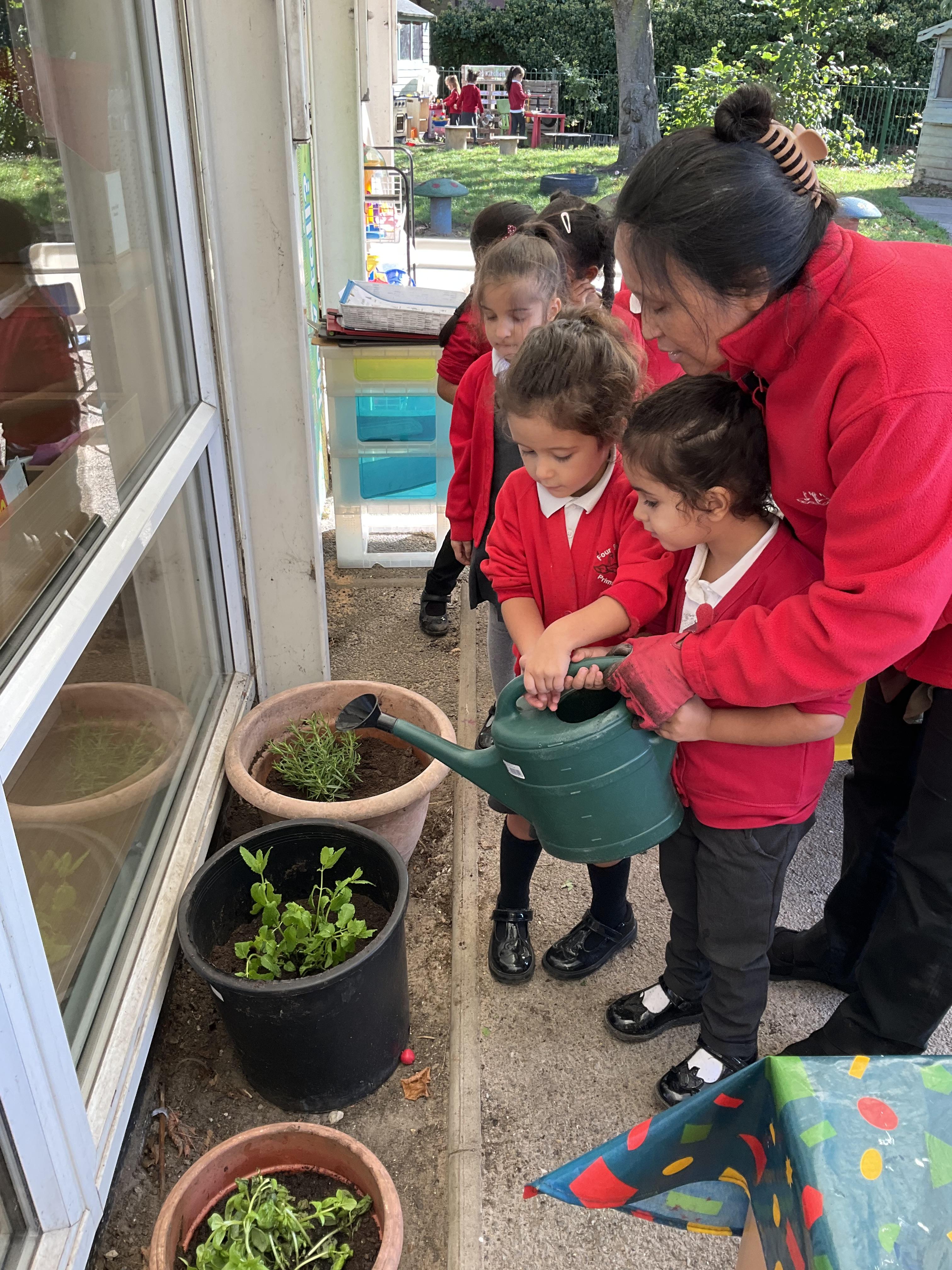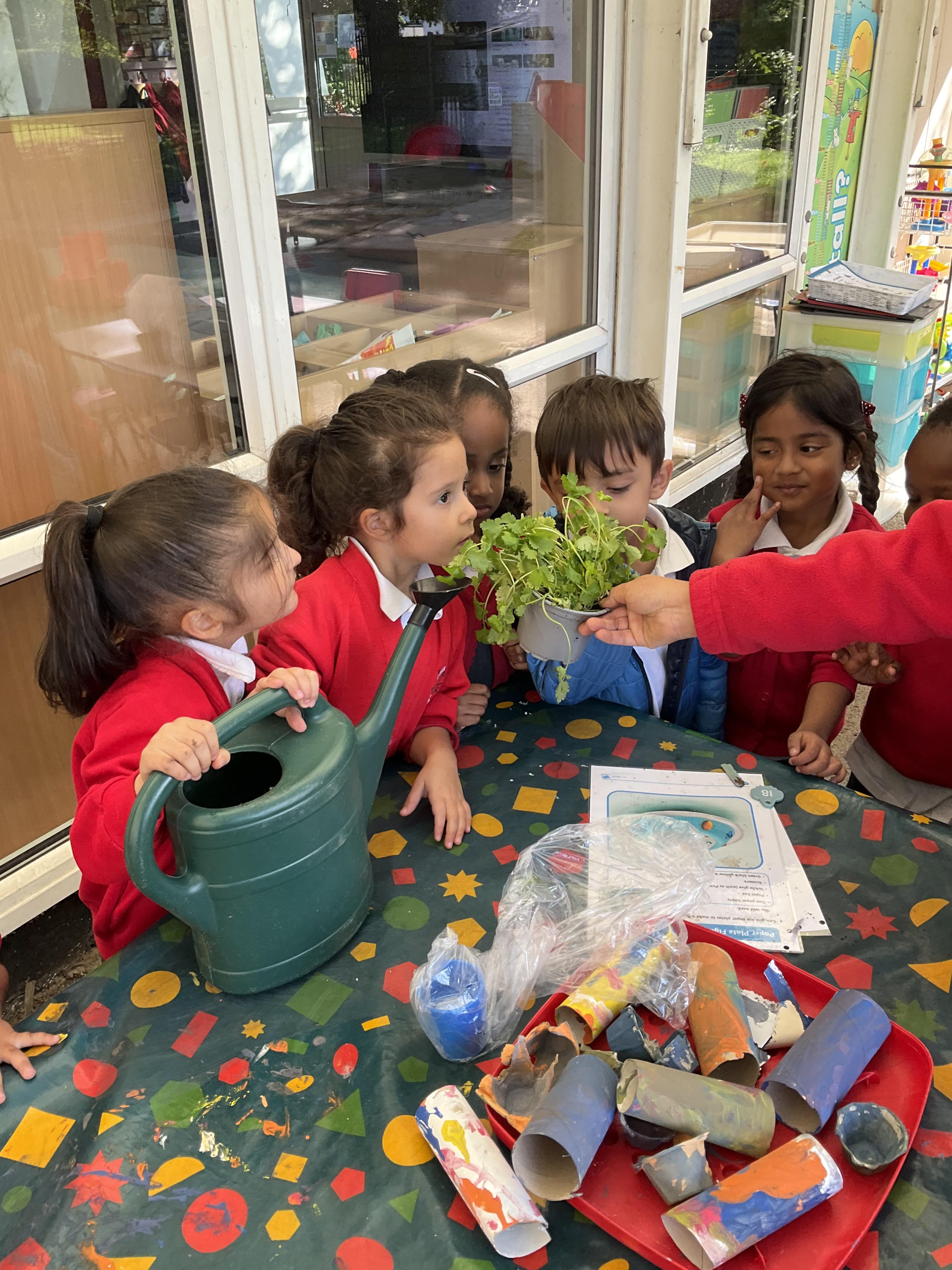 After reading, 'Jack and the Beanstalk', the children planted broad beans. They discussed the things that plants needed to grow; water, sun, space, soil and warmth. They also explored the different parts of the pea plant and the life cycle of a bean. Then they planted their own broad beans by following the instructions.
