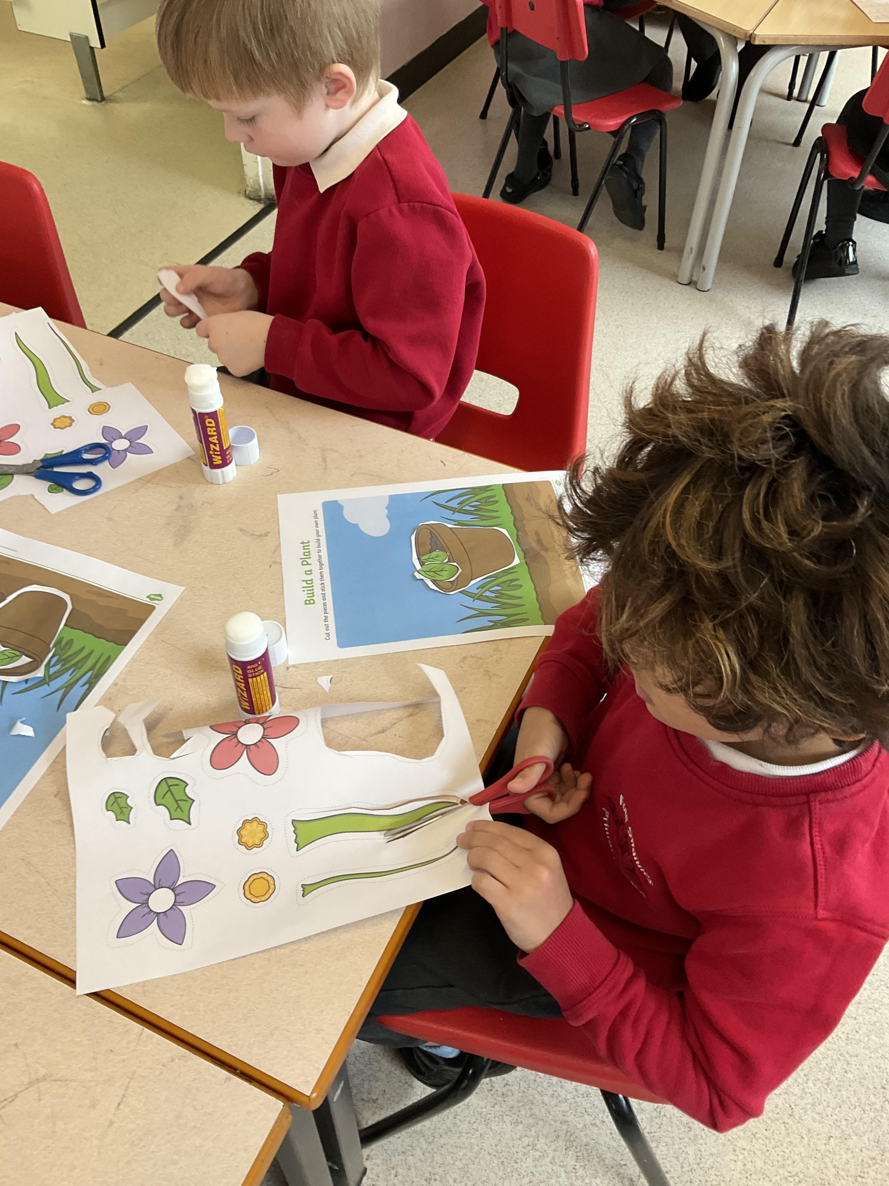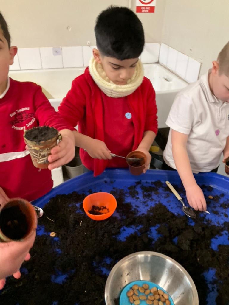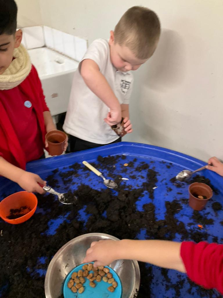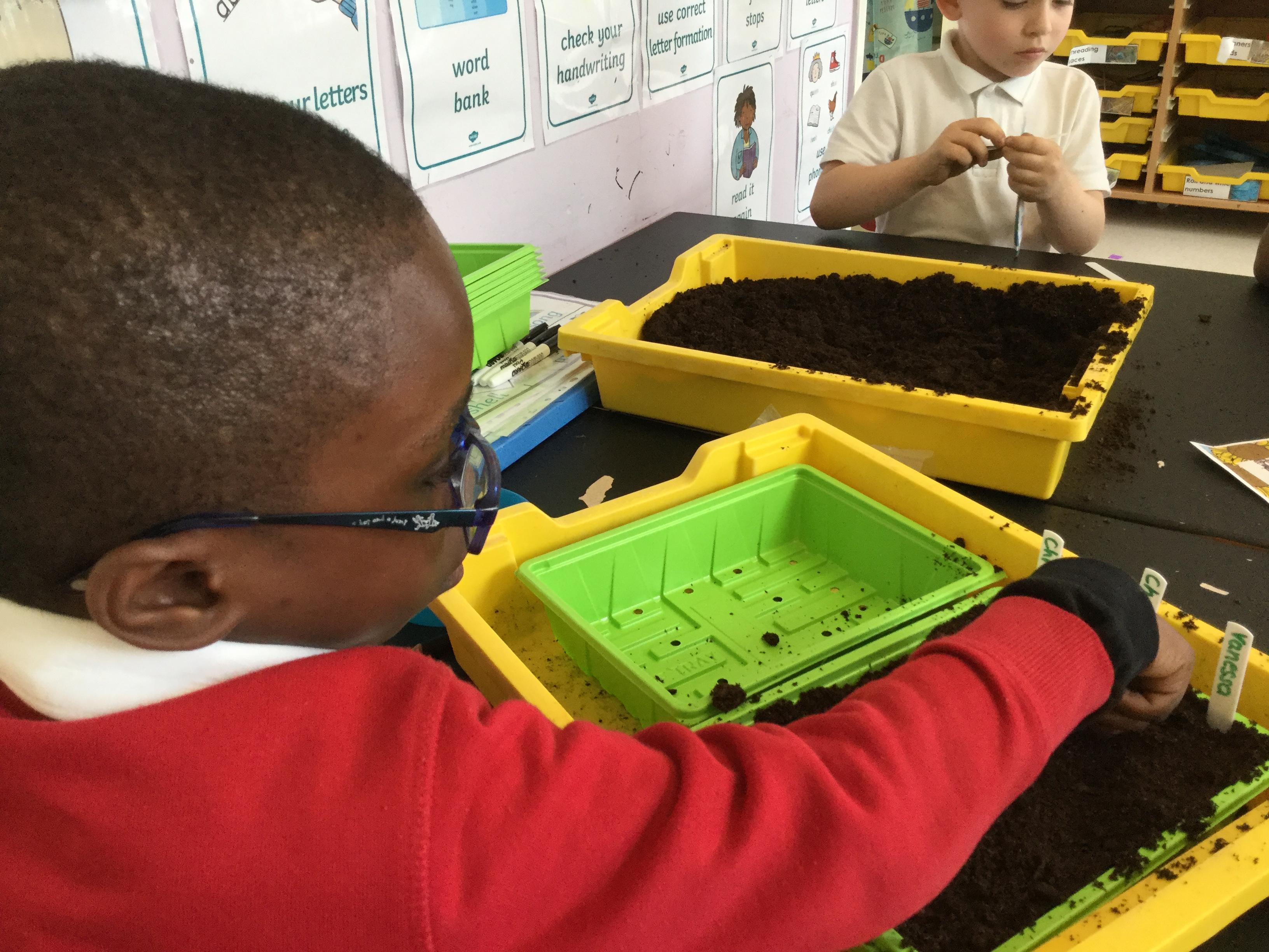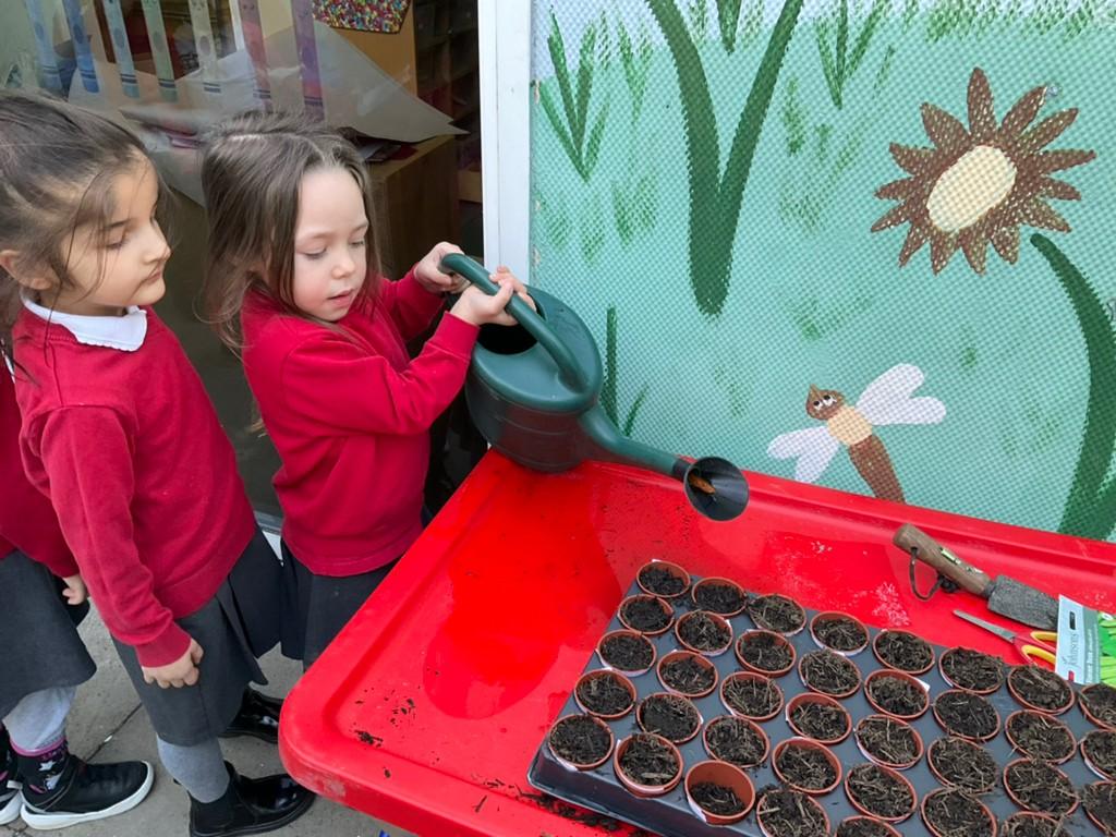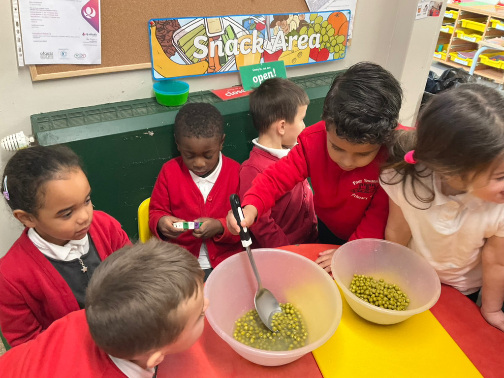 After reading, 'Jack and the Beanstalk', the children planted broad beans. They discussed the things that plants needed to grow; water, sun, space, soil and warmth. They also explored the different parts of the pea plant and the life cycle of a bean. Then they planted their own broad beans by following the instructions.