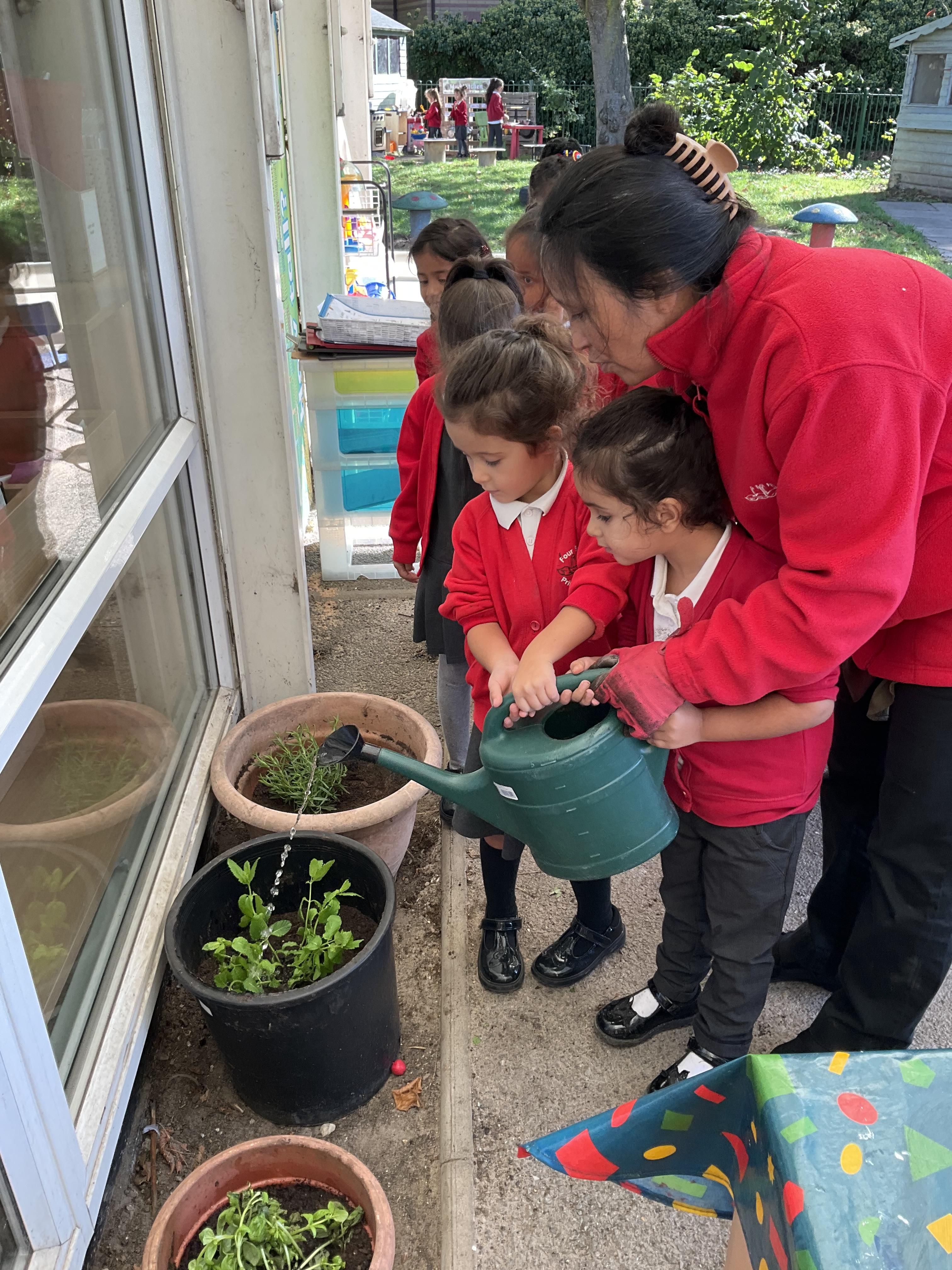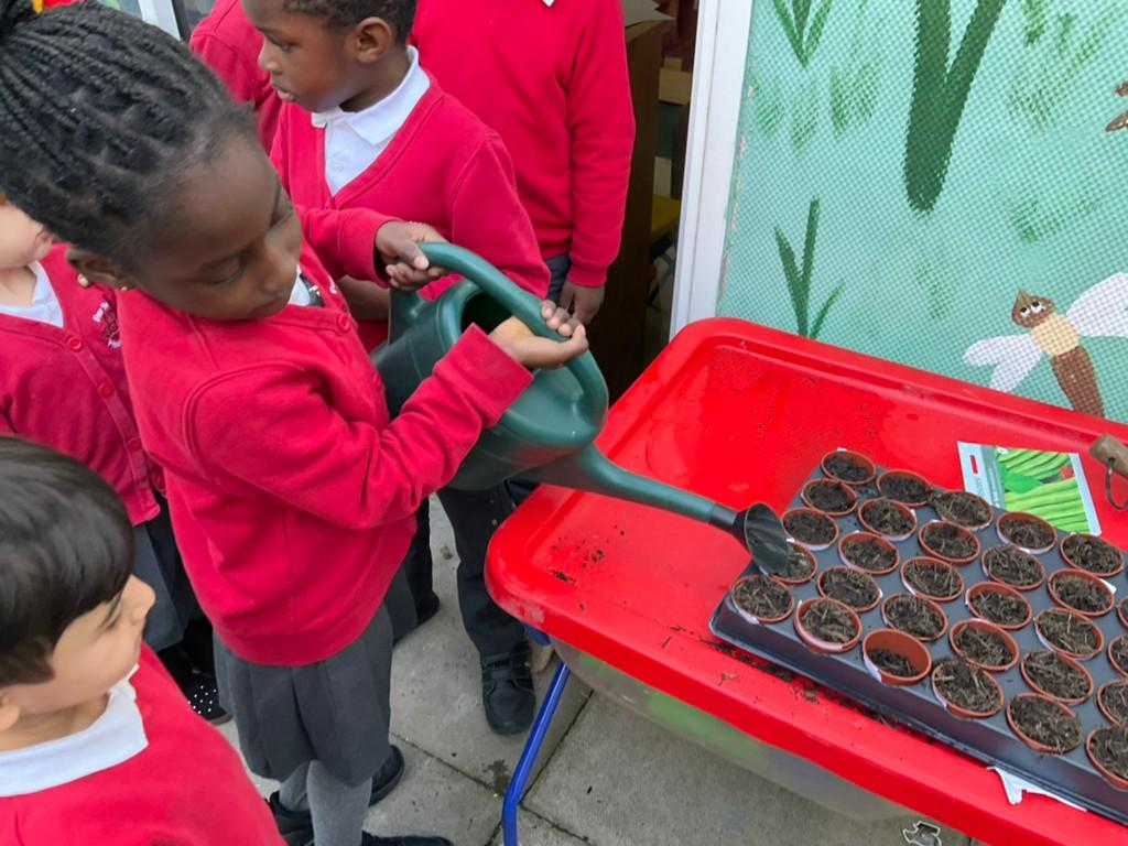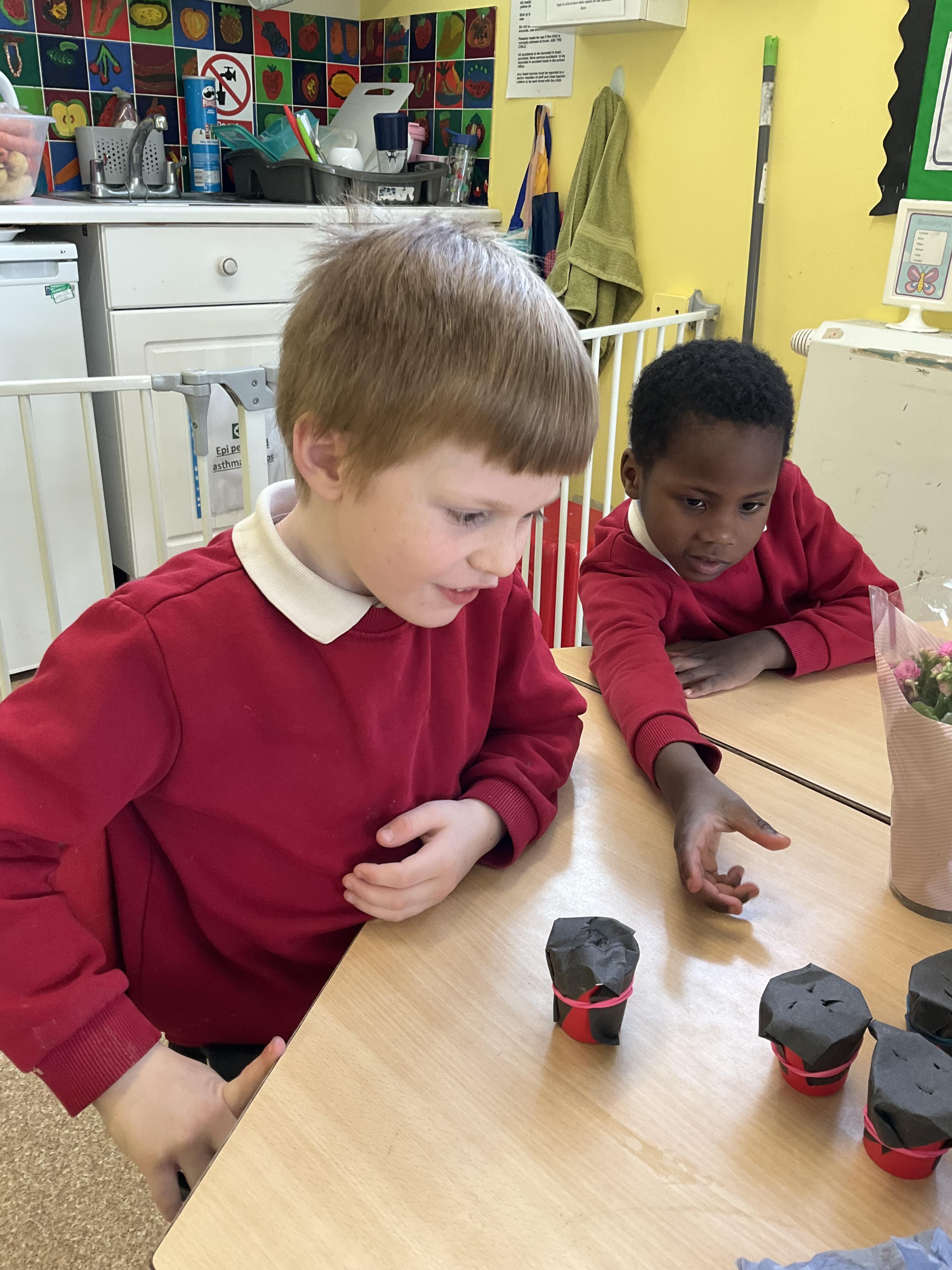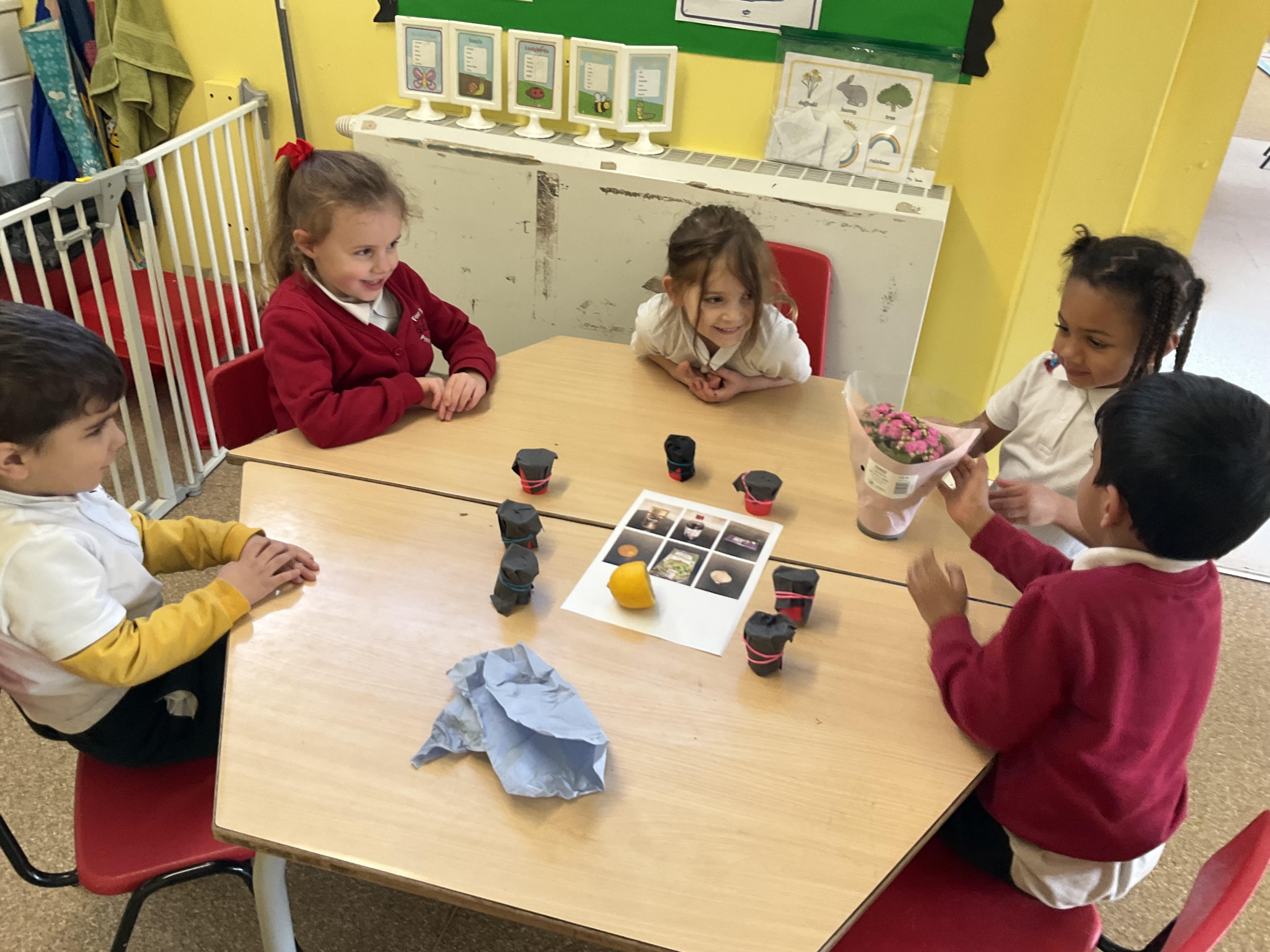 After reading, 'Jack and the Beanstalk', the children planted broad beans. They discussed the things that plants needed to grow; water, sun, space, soil and warmth. They also explored the different parts of the pea plant and the life cycle of a bean. Then they planted their own broad beans by following the instructions.