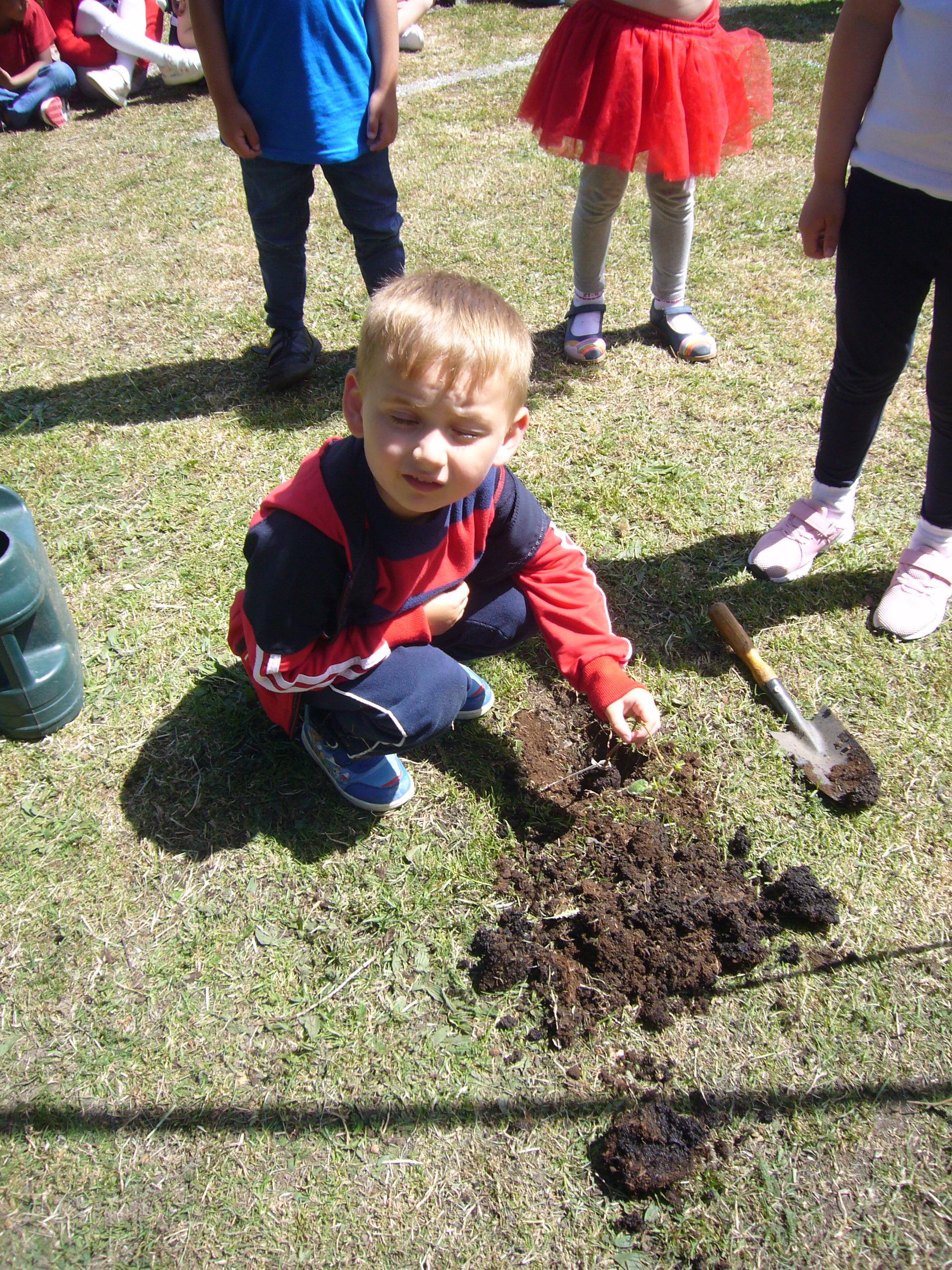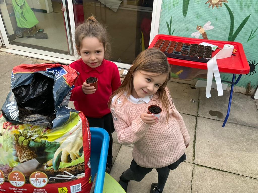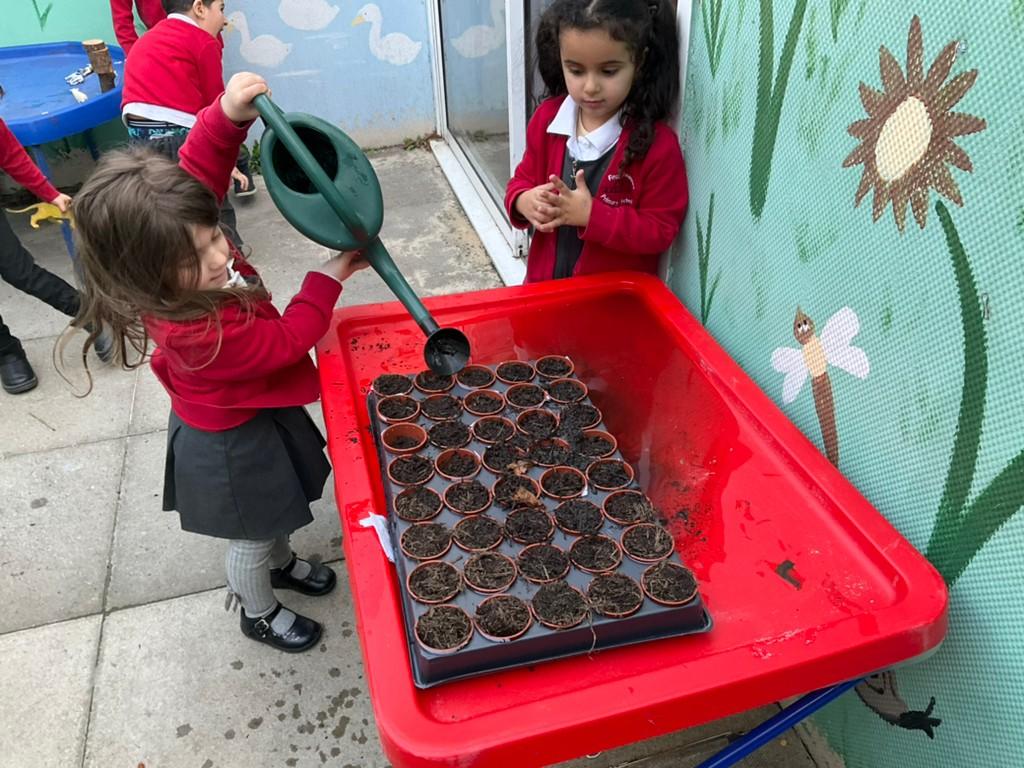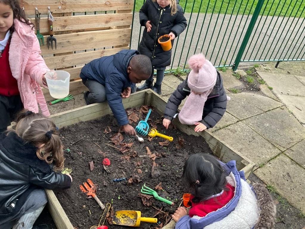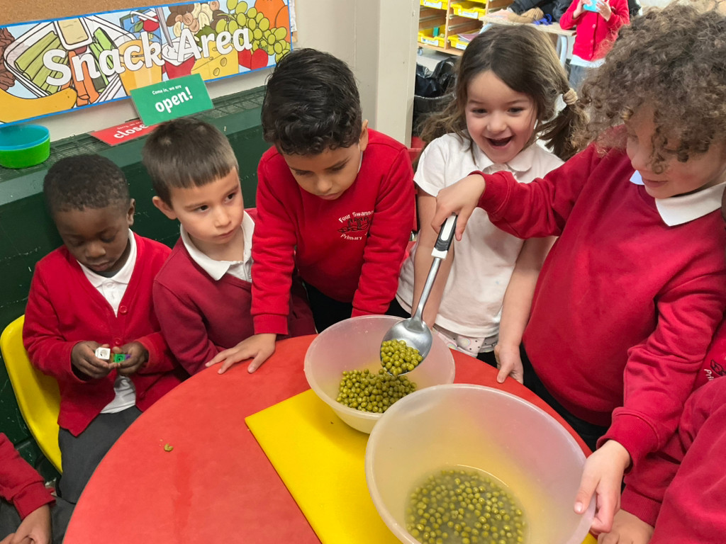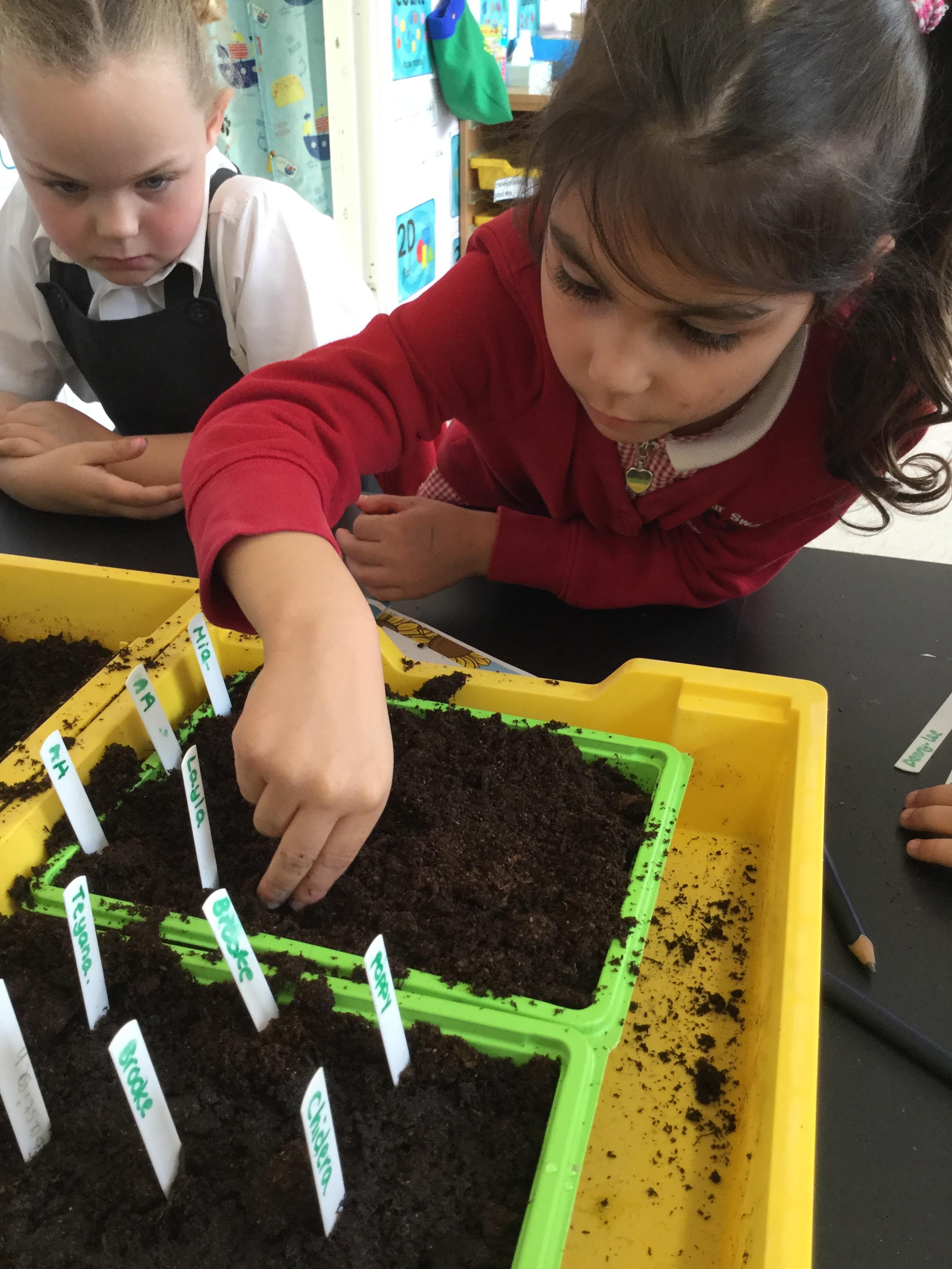 After reading, 'Jack and the Beanstalk', the children planted broad beans. They discussed the things that plants needed to grow; water, sun, space, soil and warmth. They also explored the different parts of the pea plant and the life cycle of a bean. Then they planted their own broad beans by following the instructions.