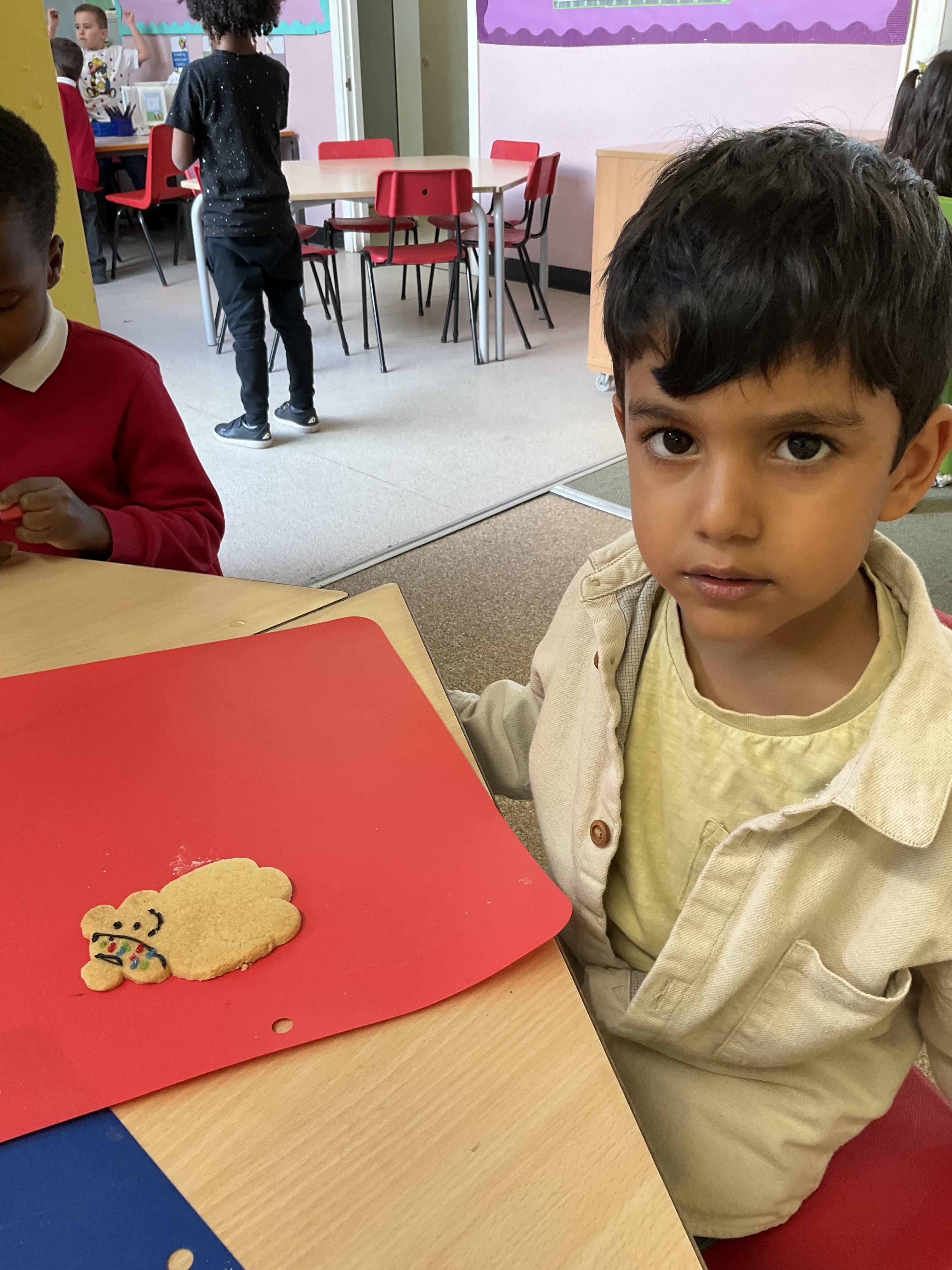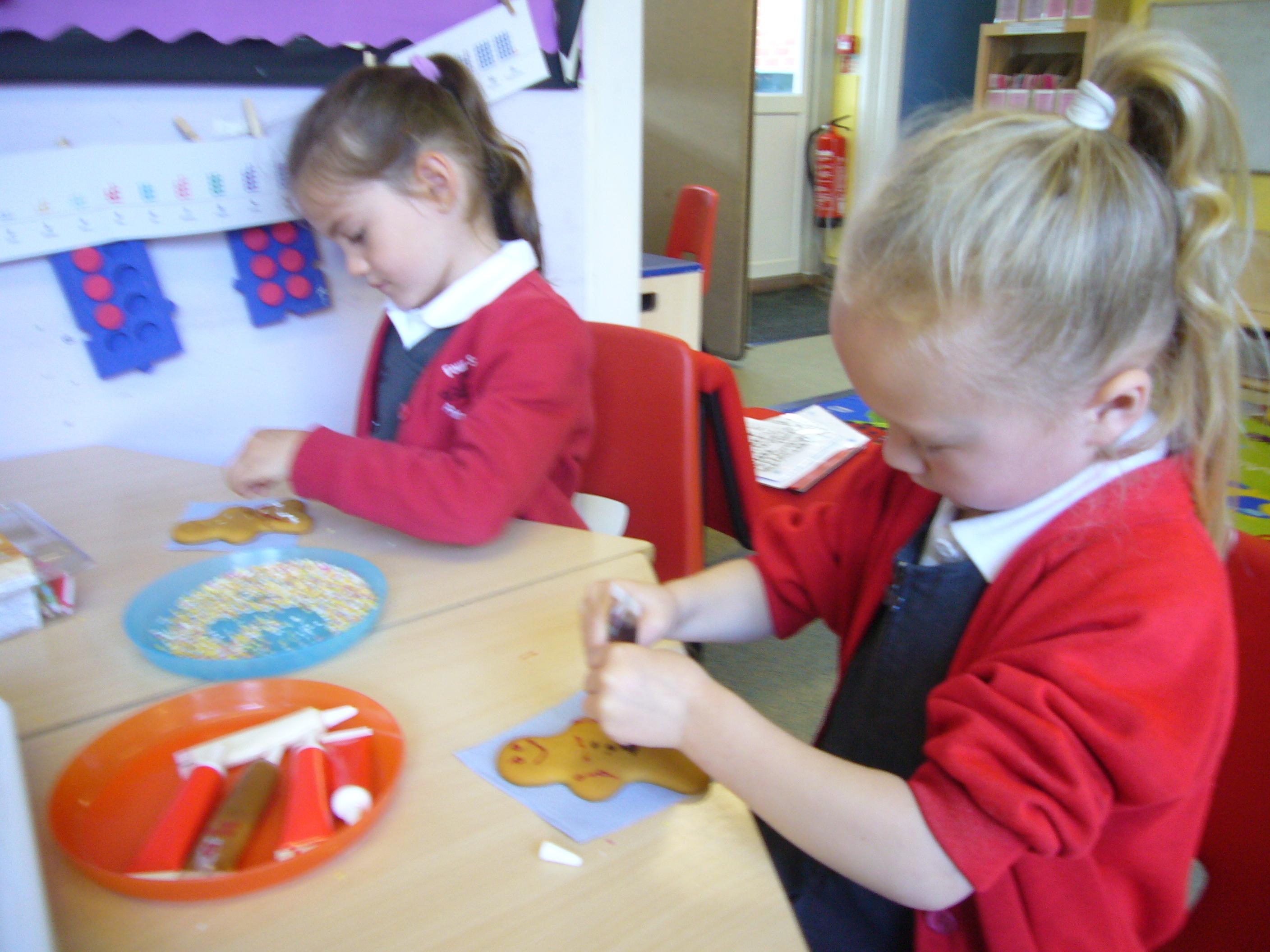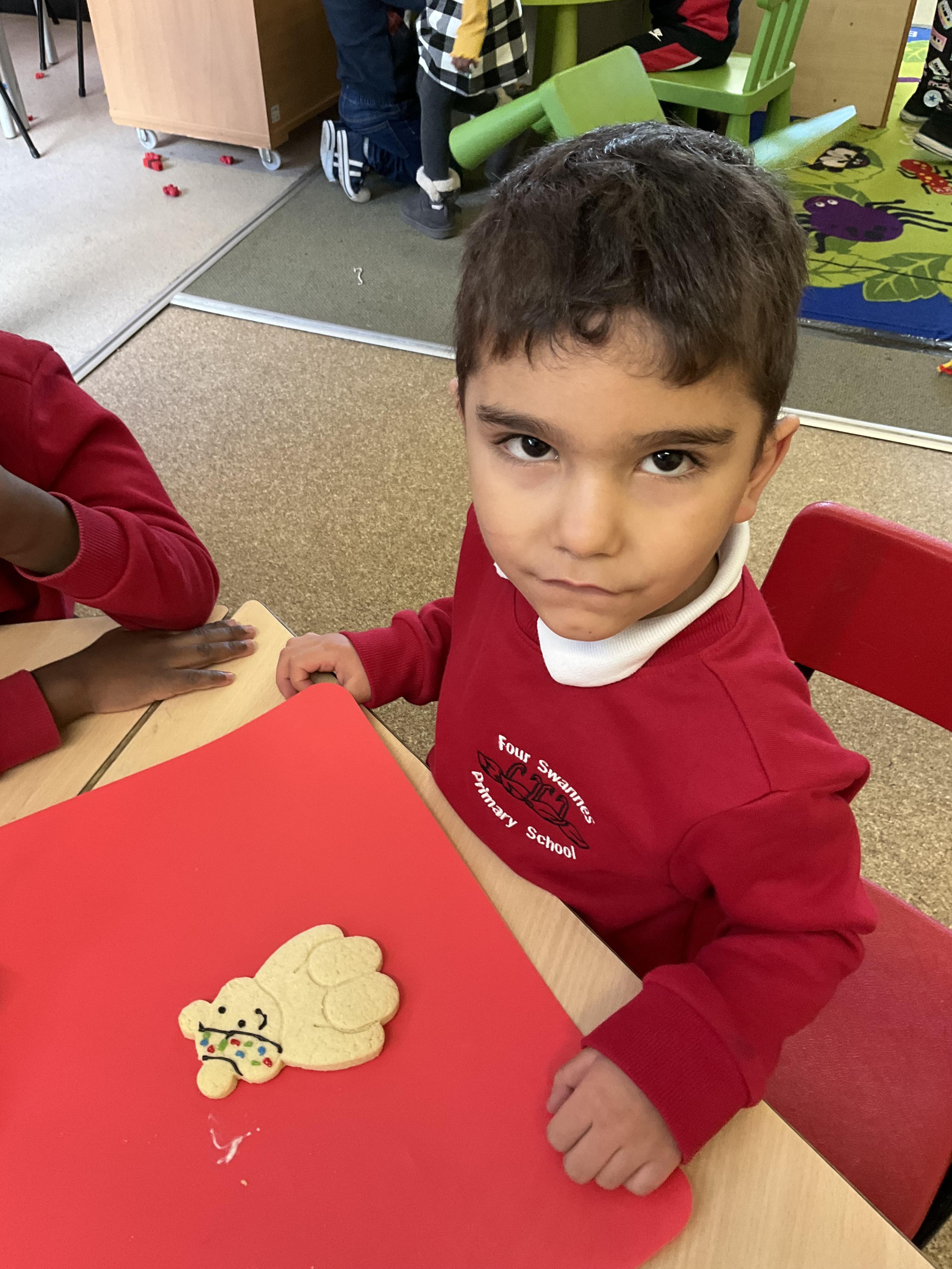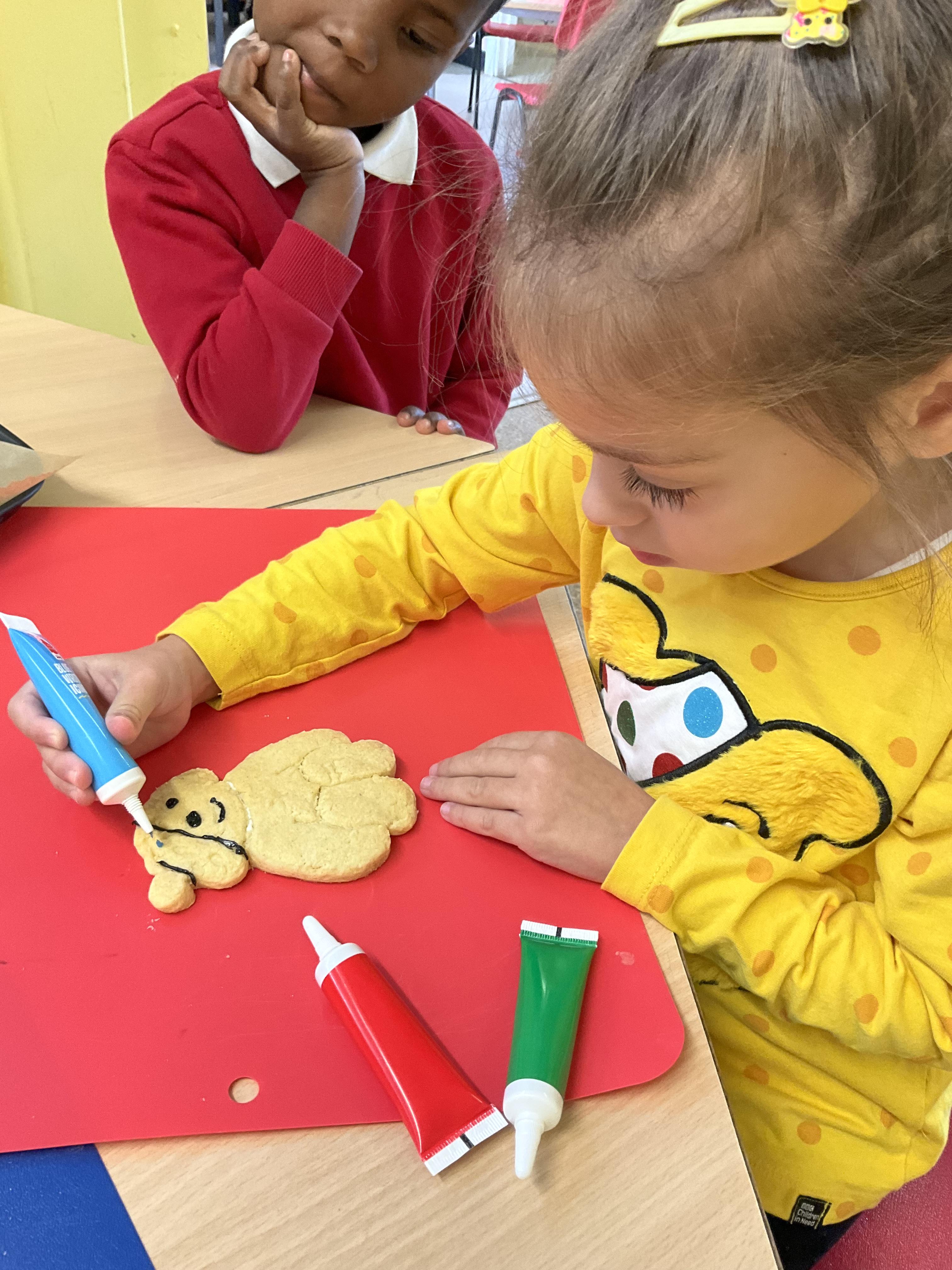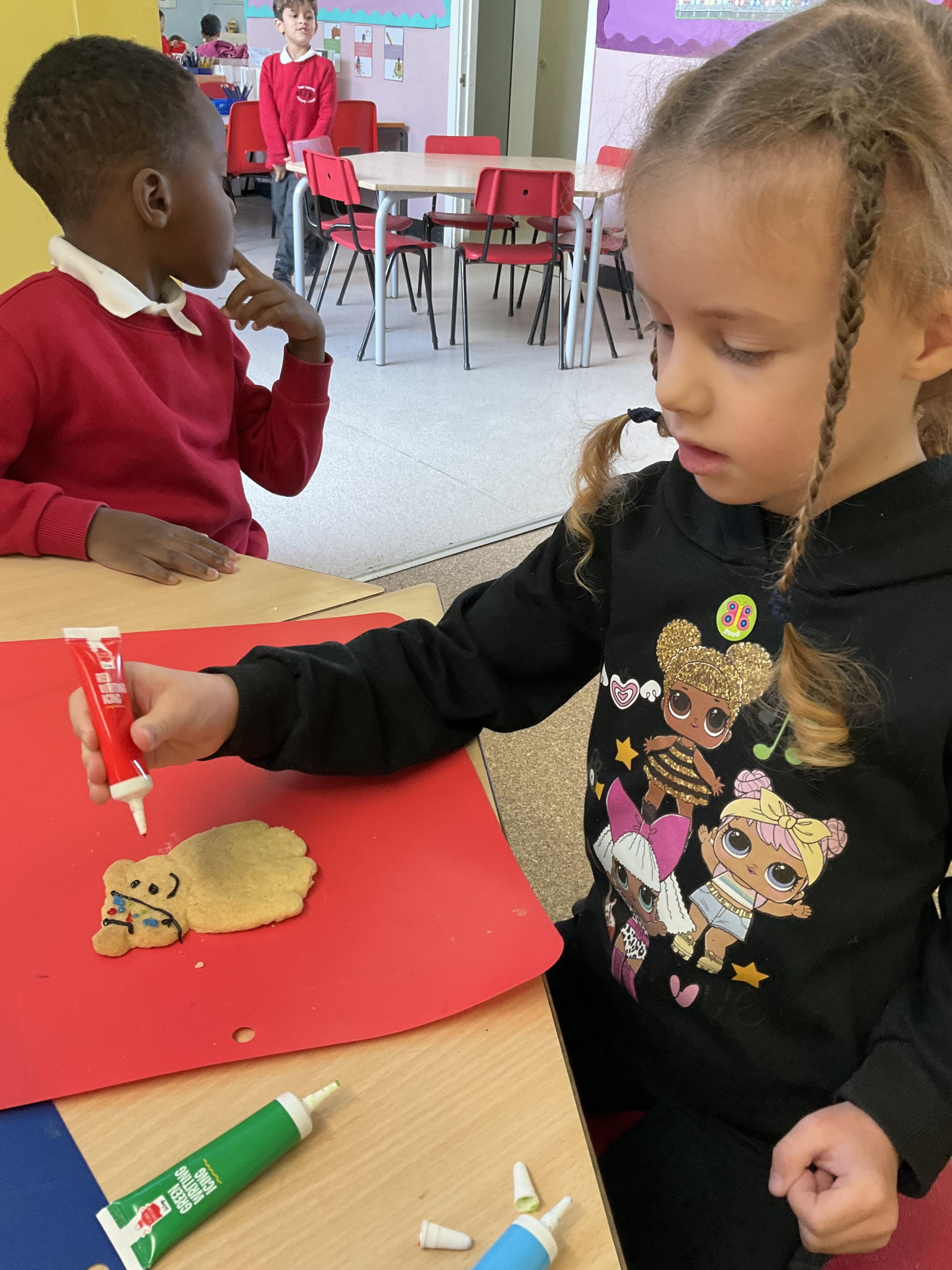 We then decorated the biscuits using icing sugar, resins and chocolate buttons. The children had to count how many eyes and buttons he had.