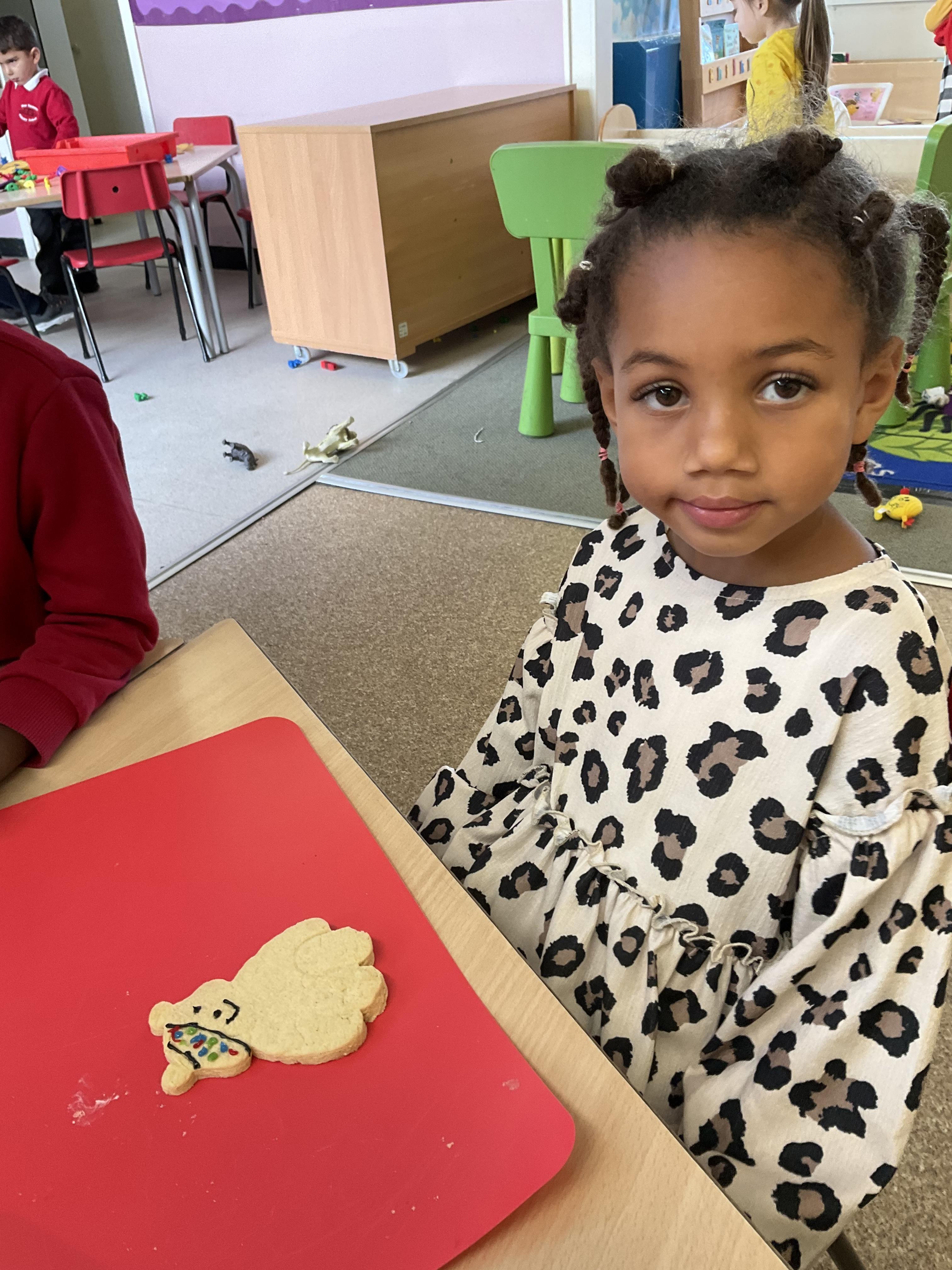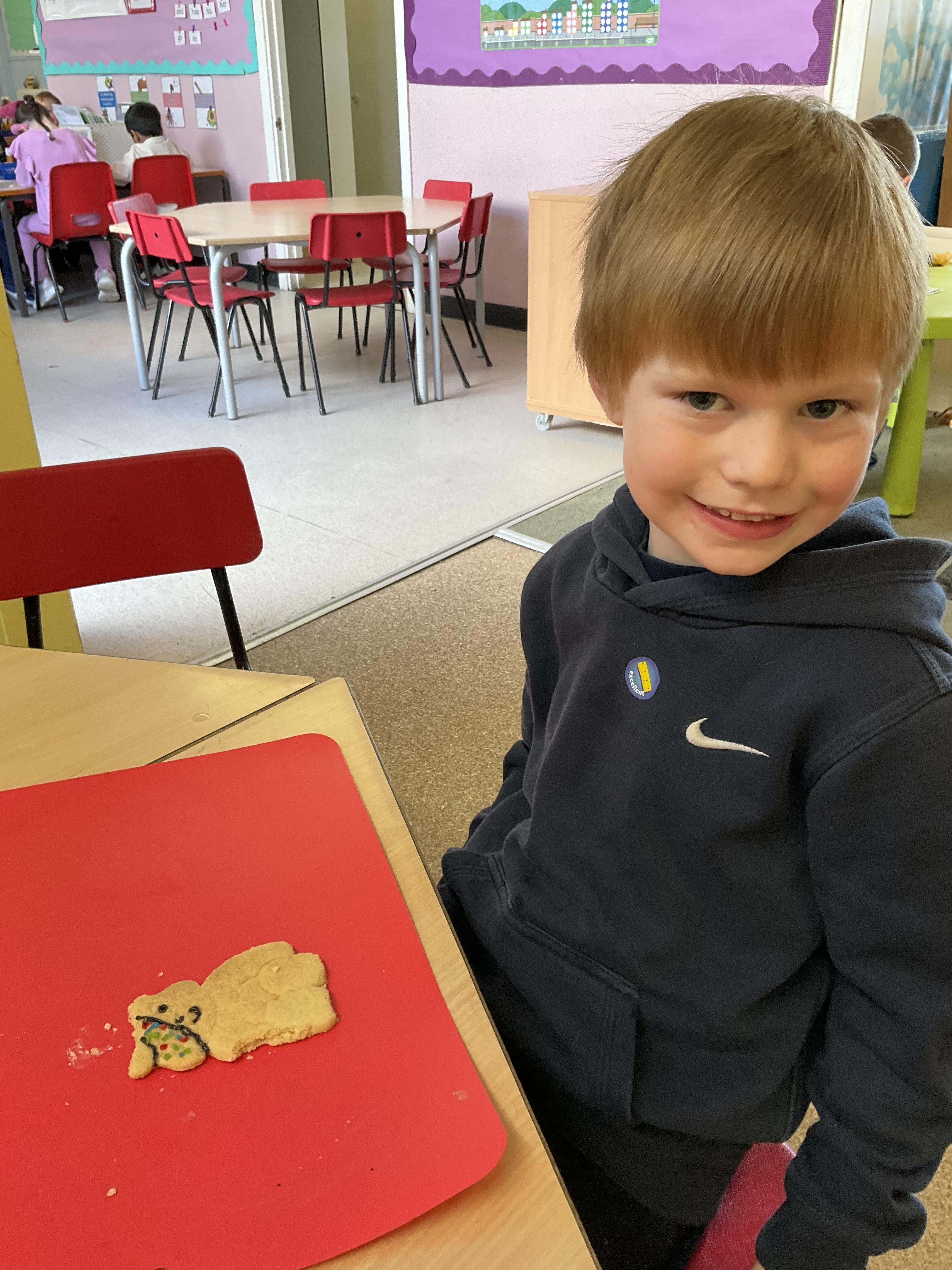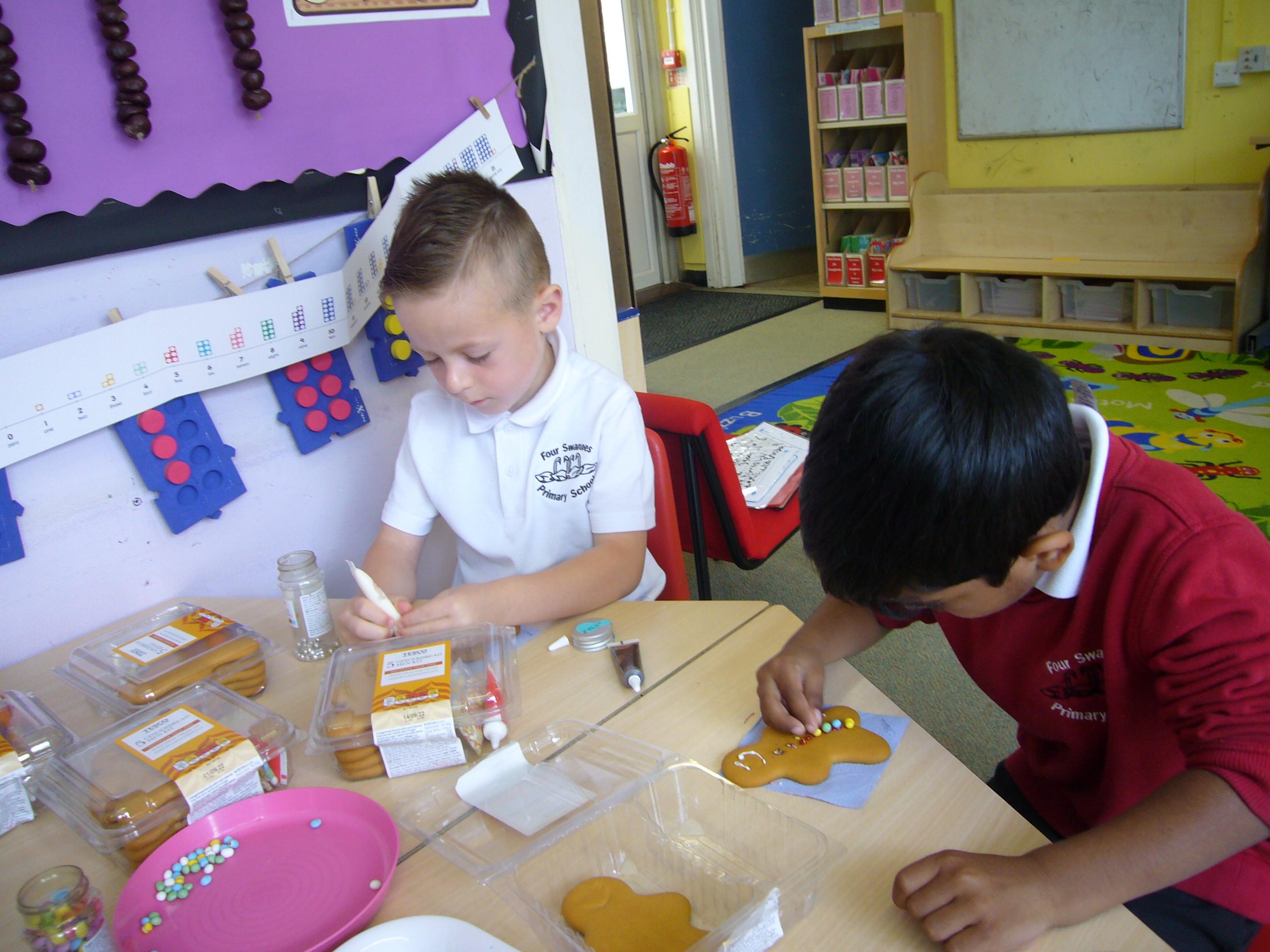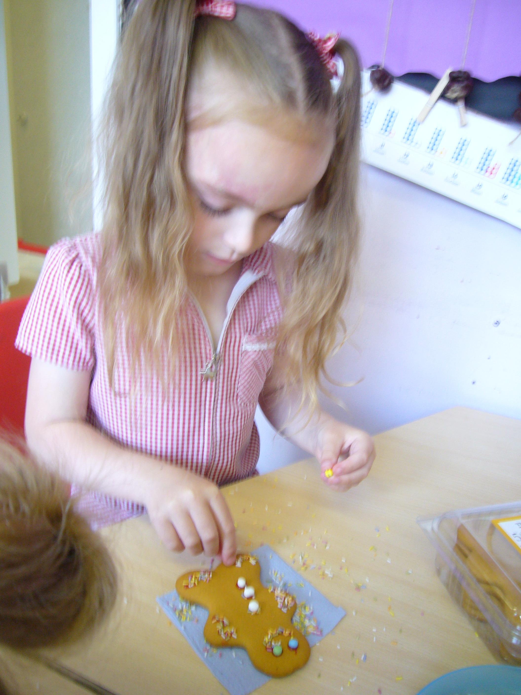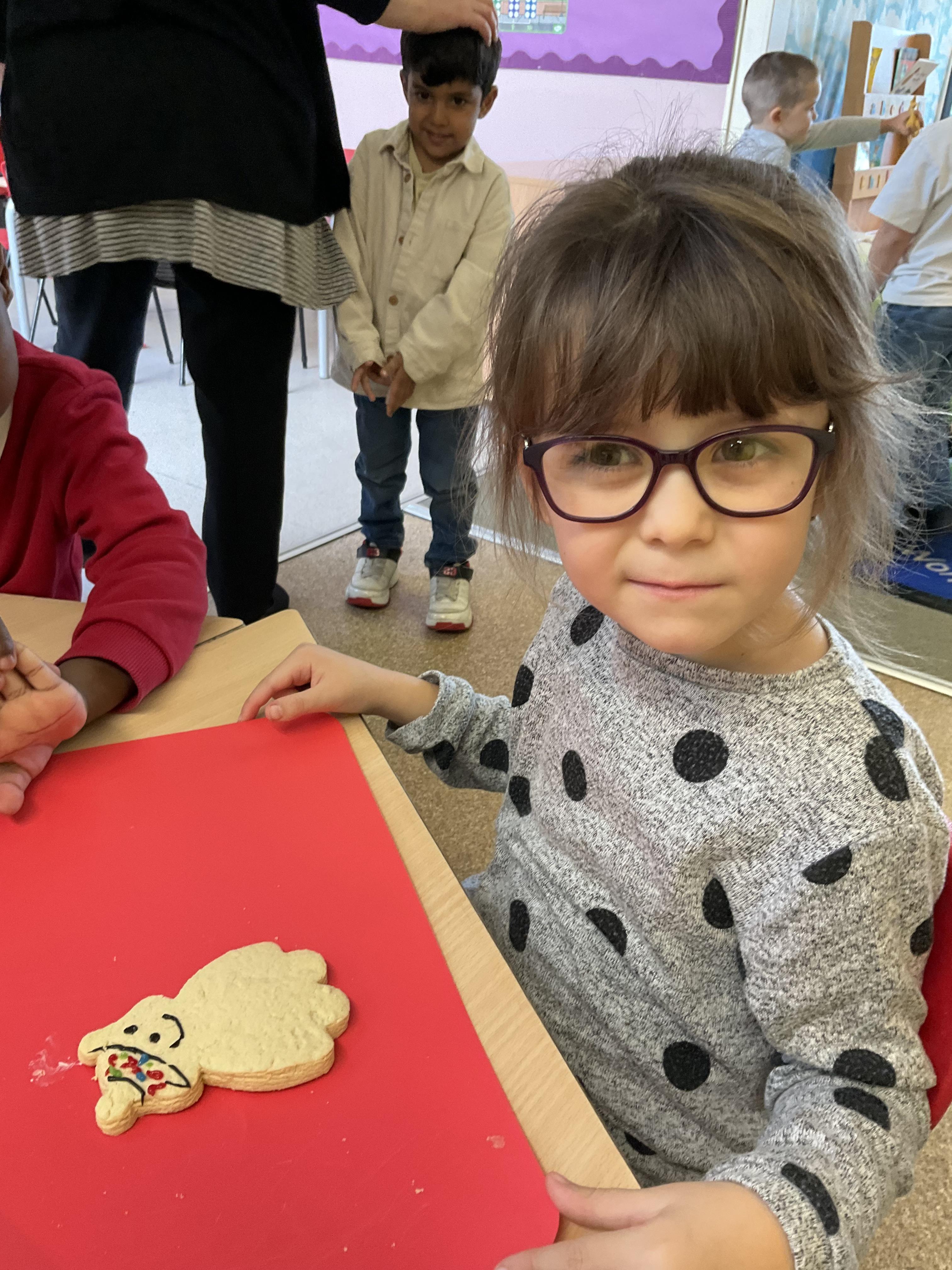 We then decorated the biscuits using icing sugar, resins and chocolate buttons. The children had to count how many eyes and buttons he had.