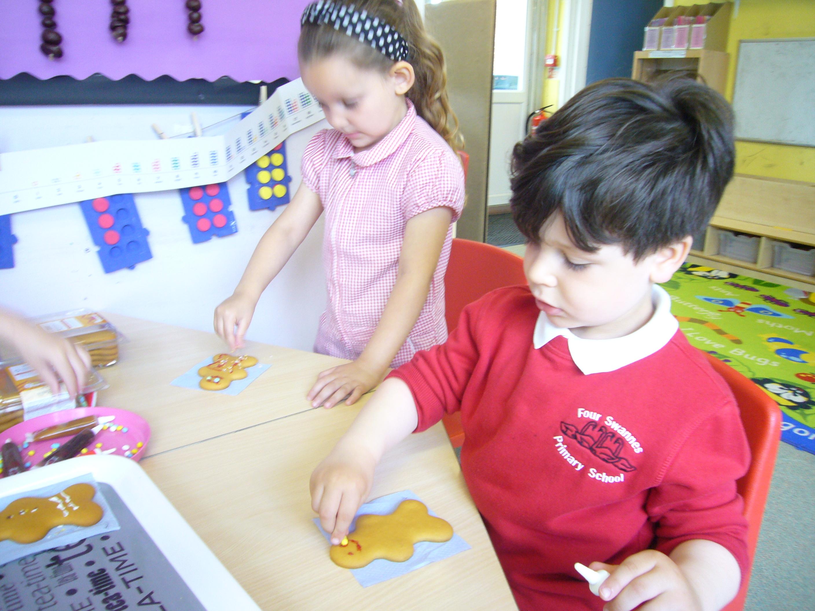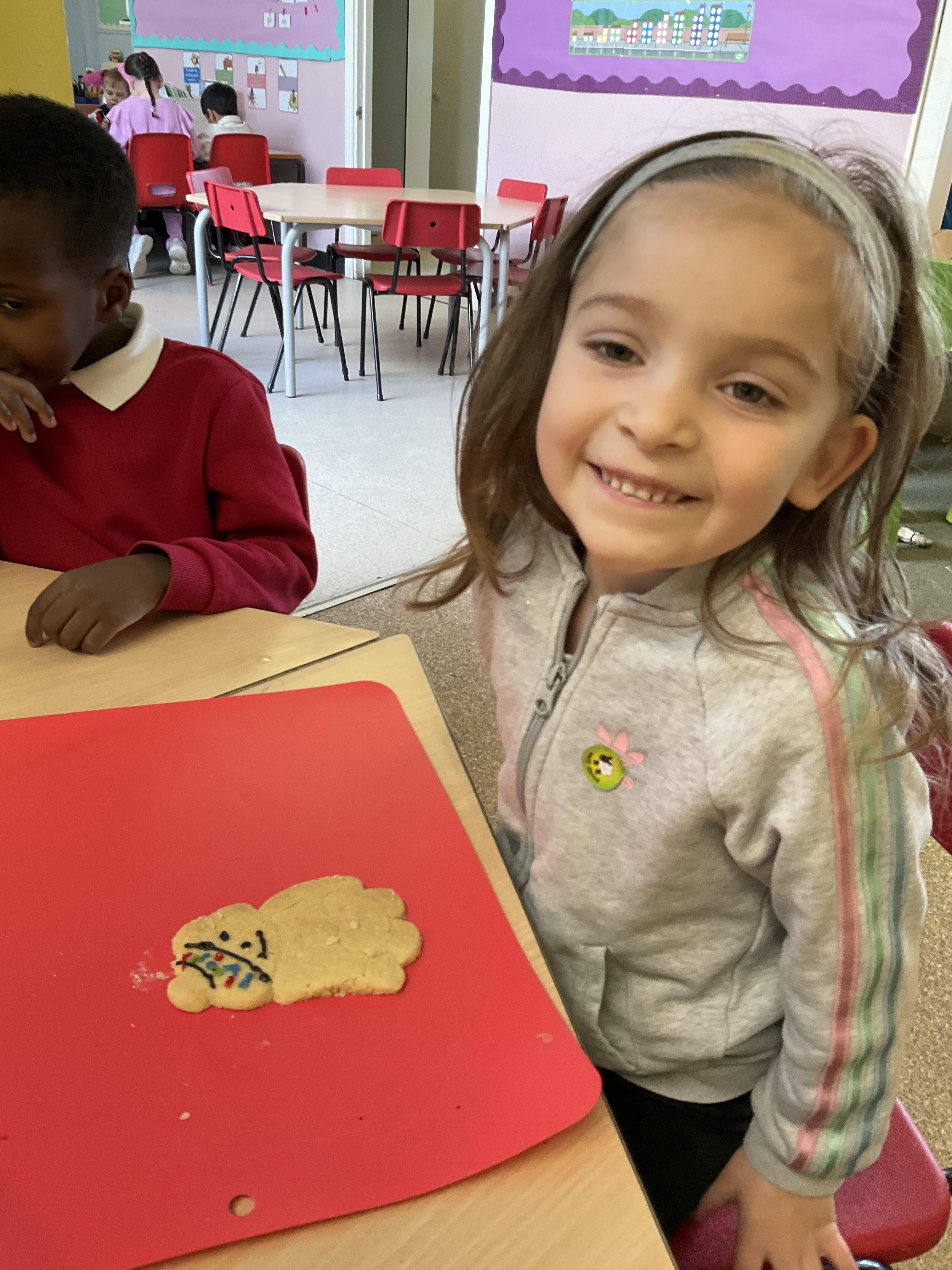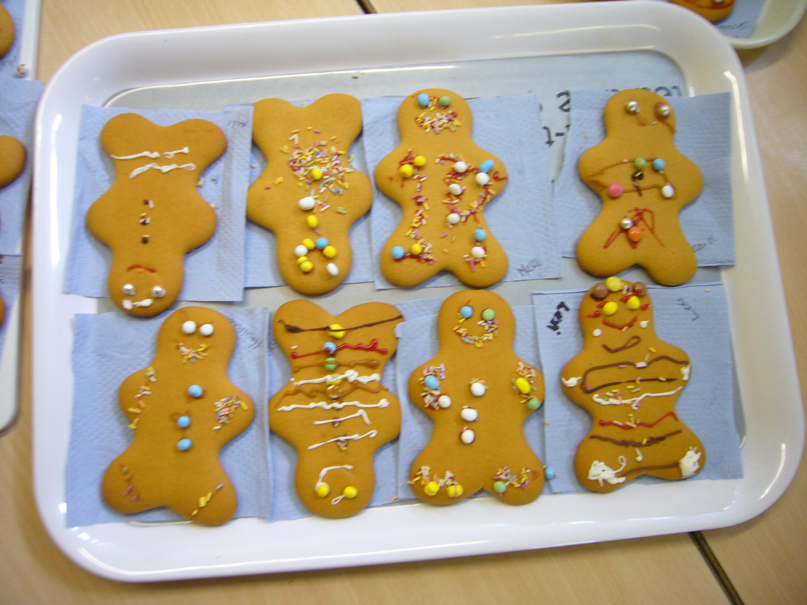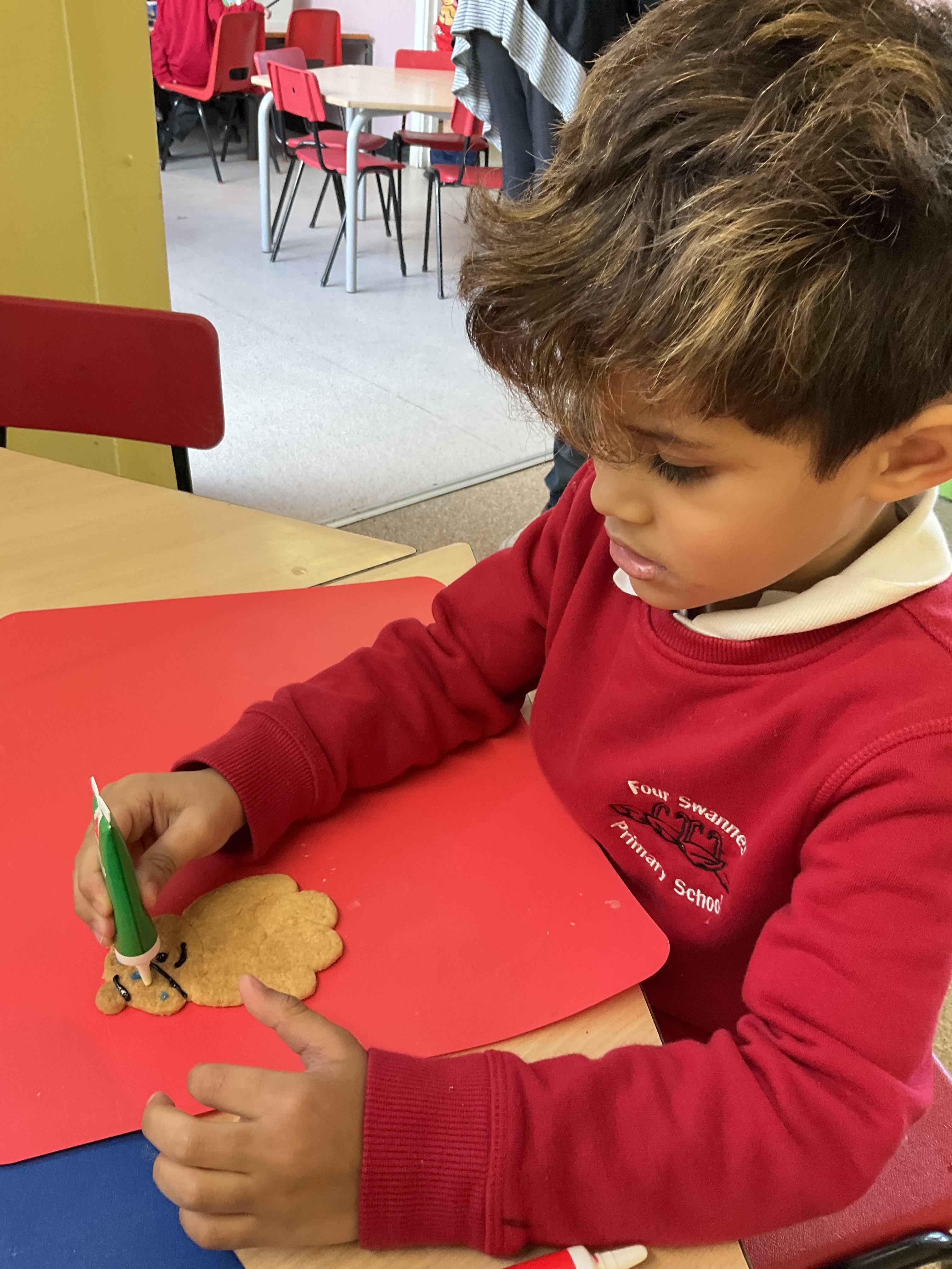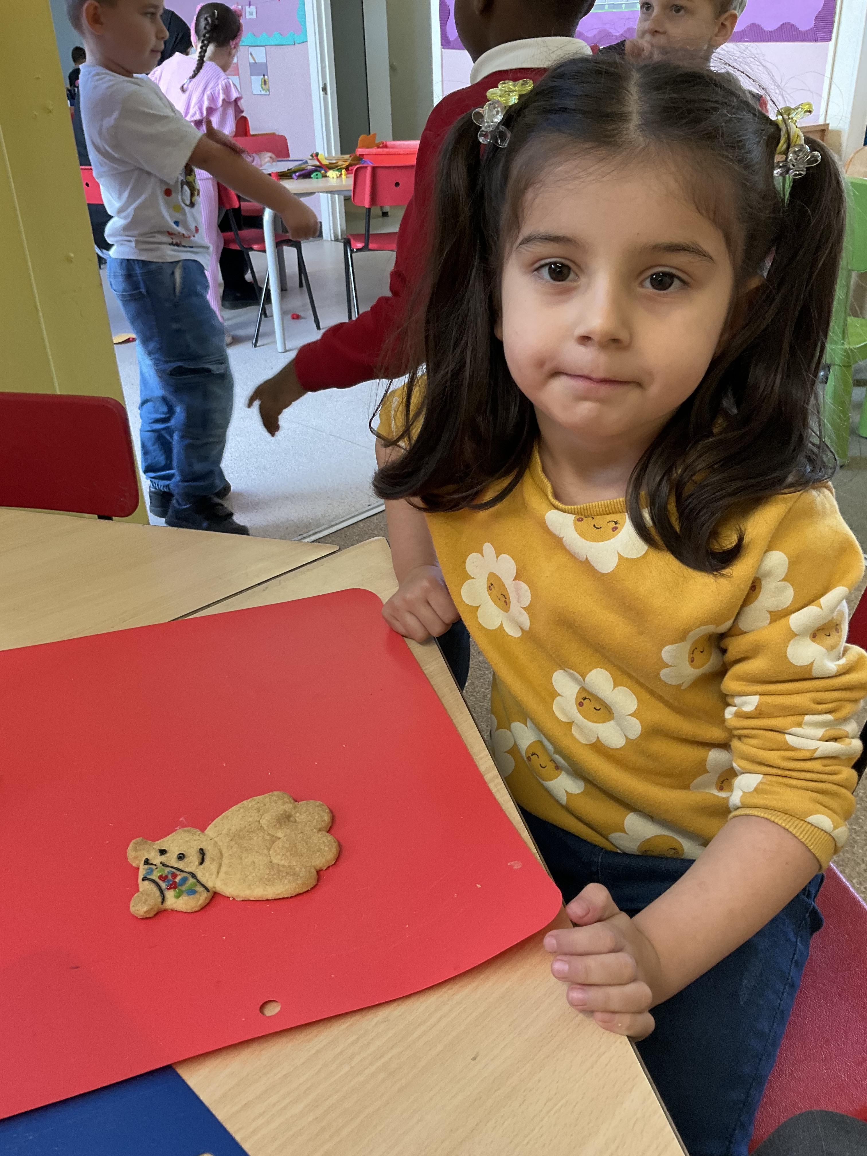 We then decorated the biscuits using icing sugar, resins and chocolate buttons. The children had to count how many eyes and buttons he had.