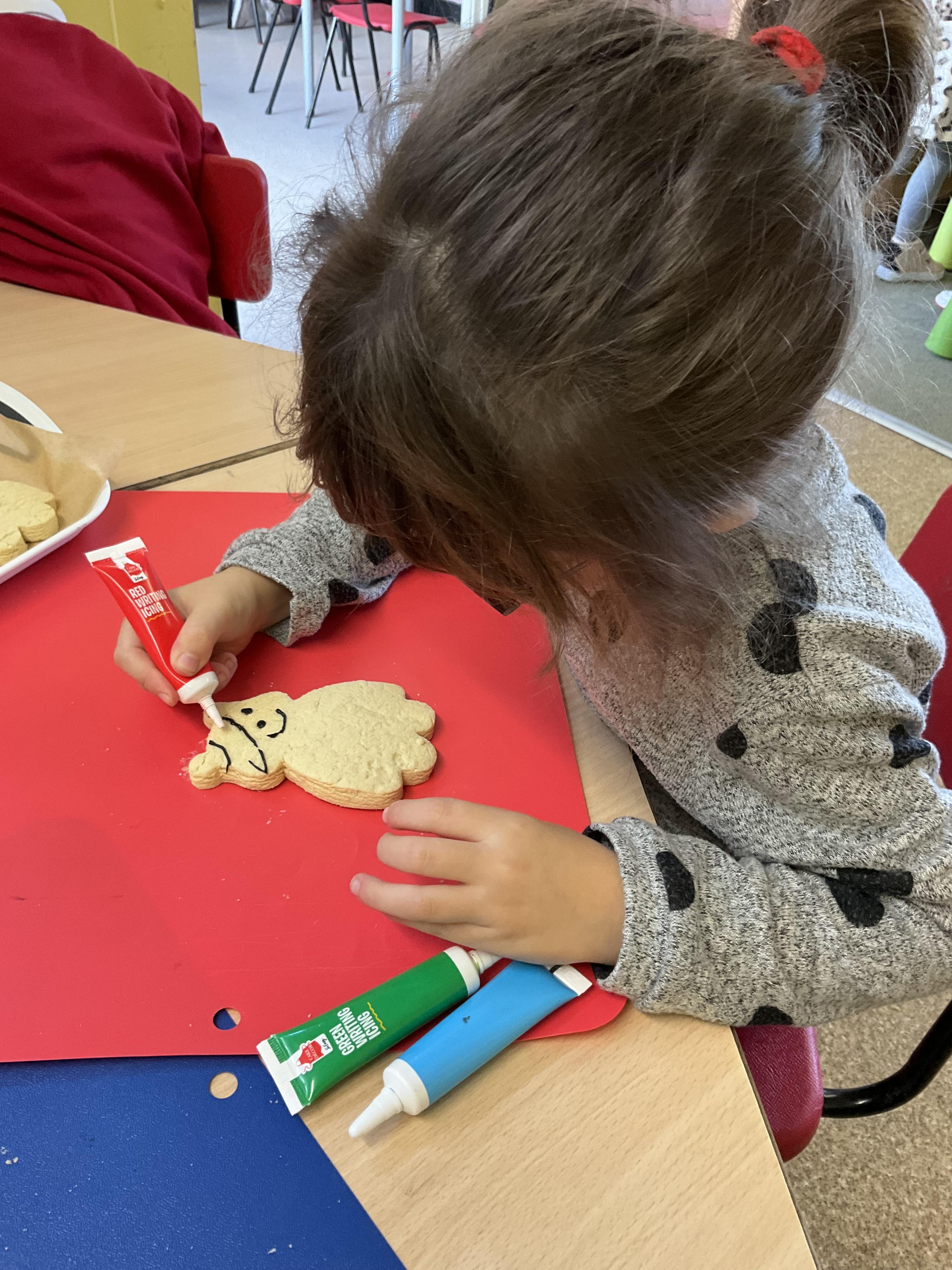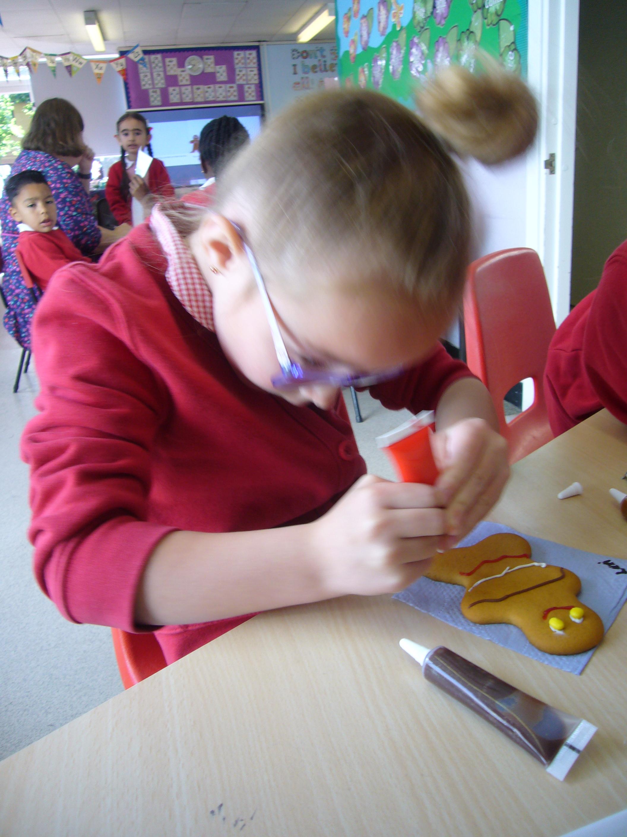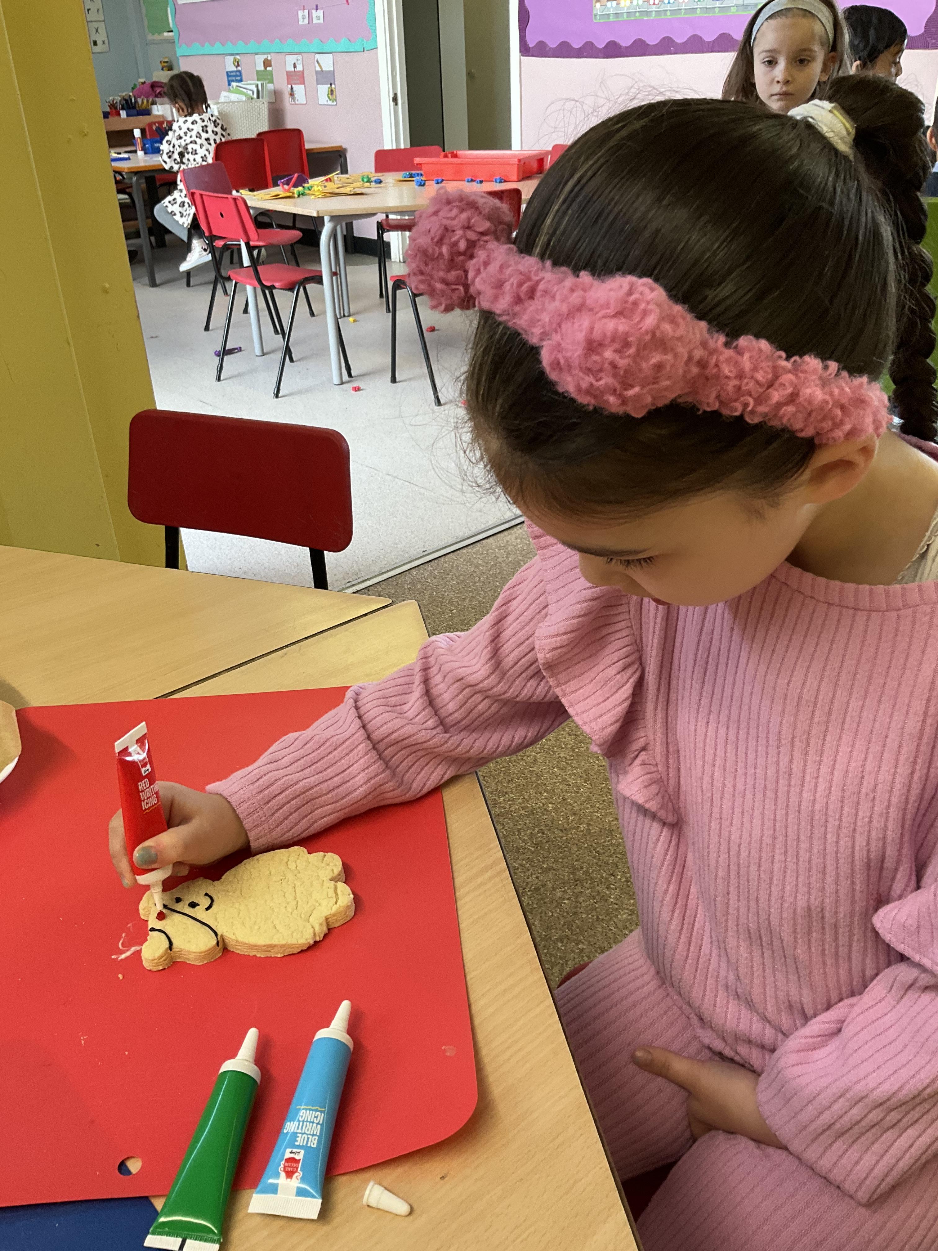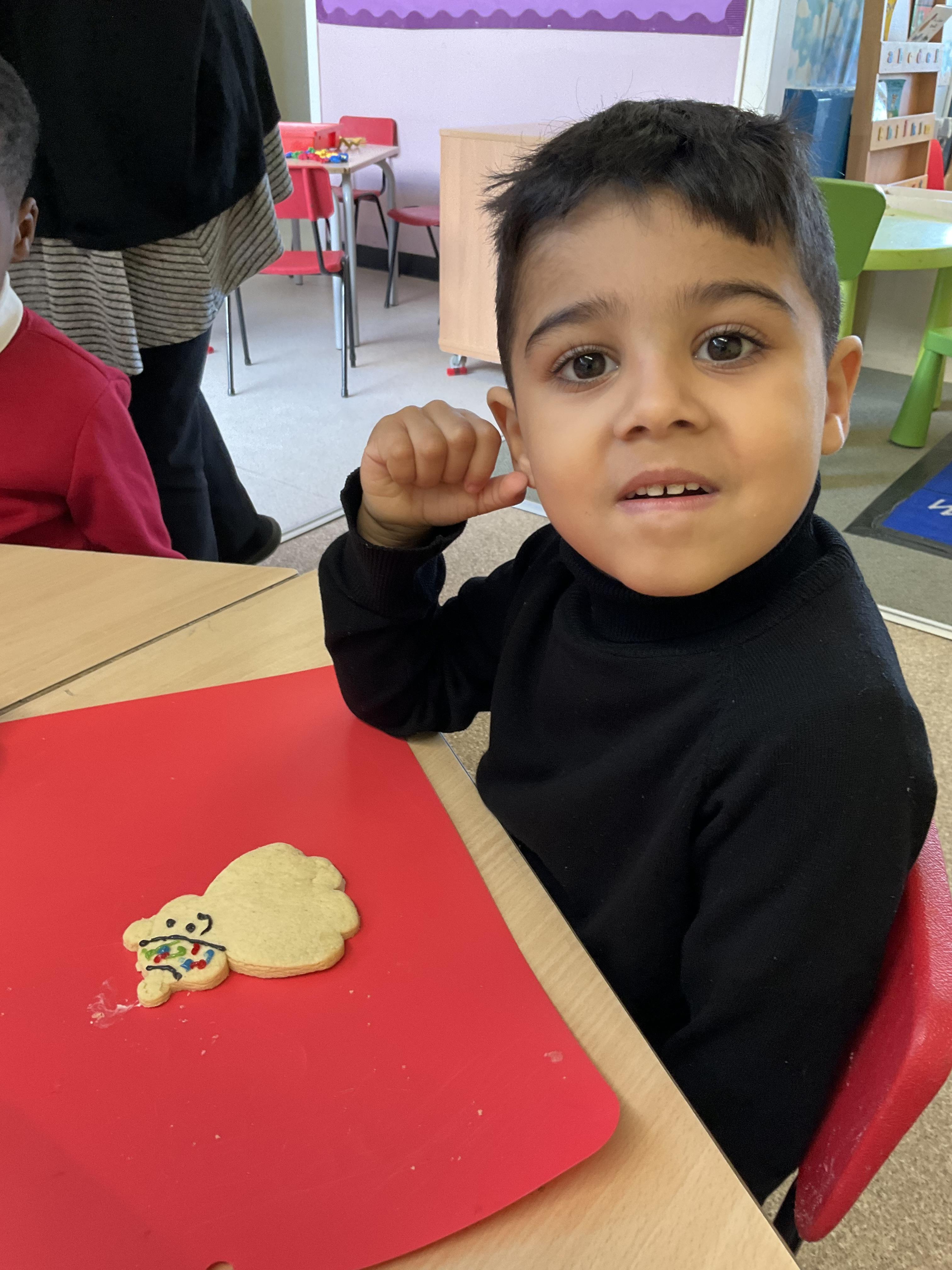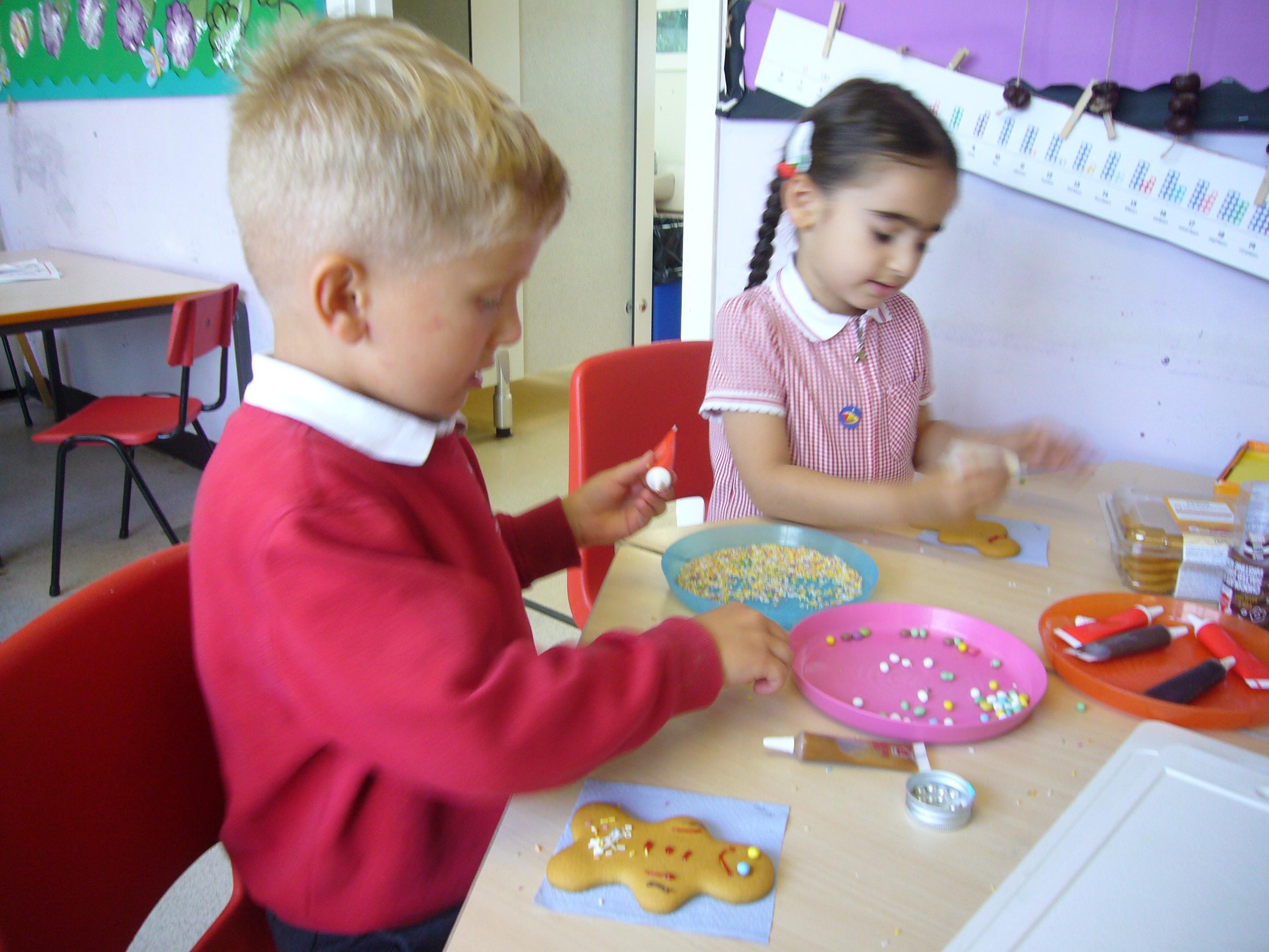 We then decorated the biscuits using icing sugar, resins and chocolate buttons. The children had to count how many eyes and buttons he had.
