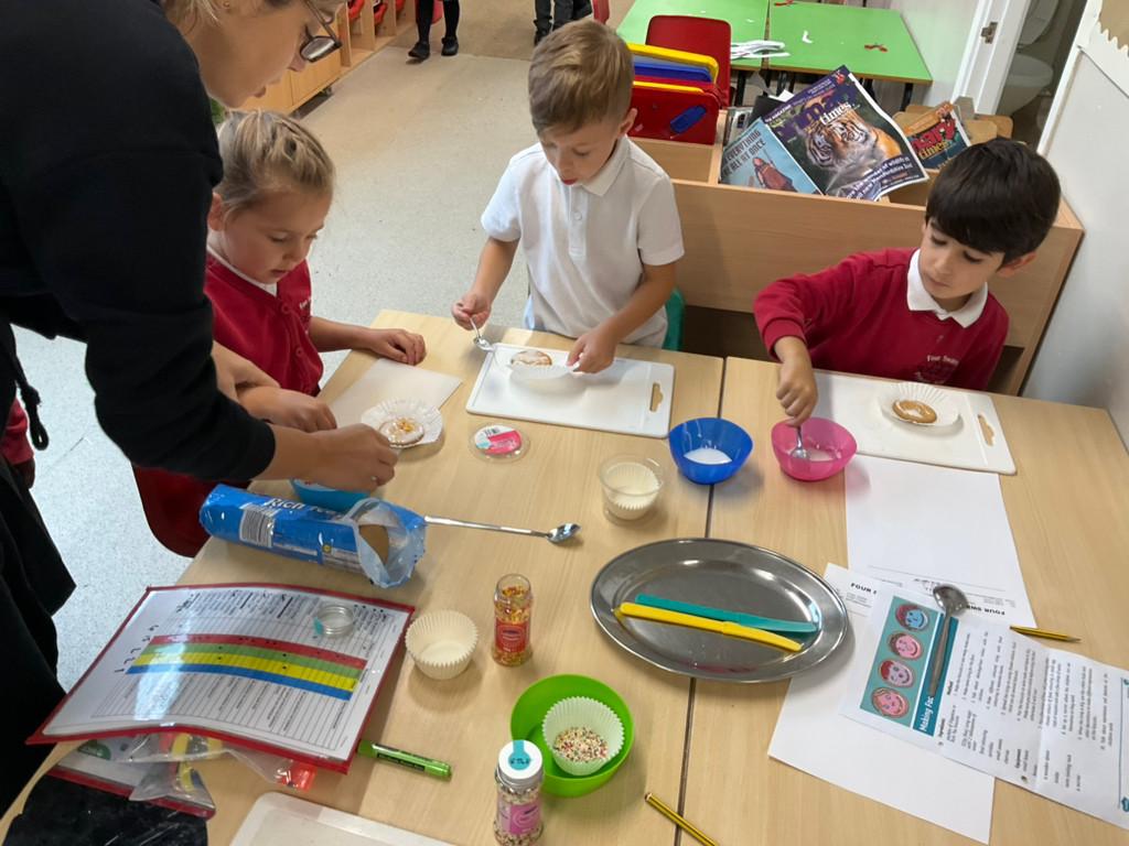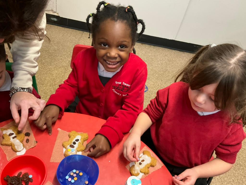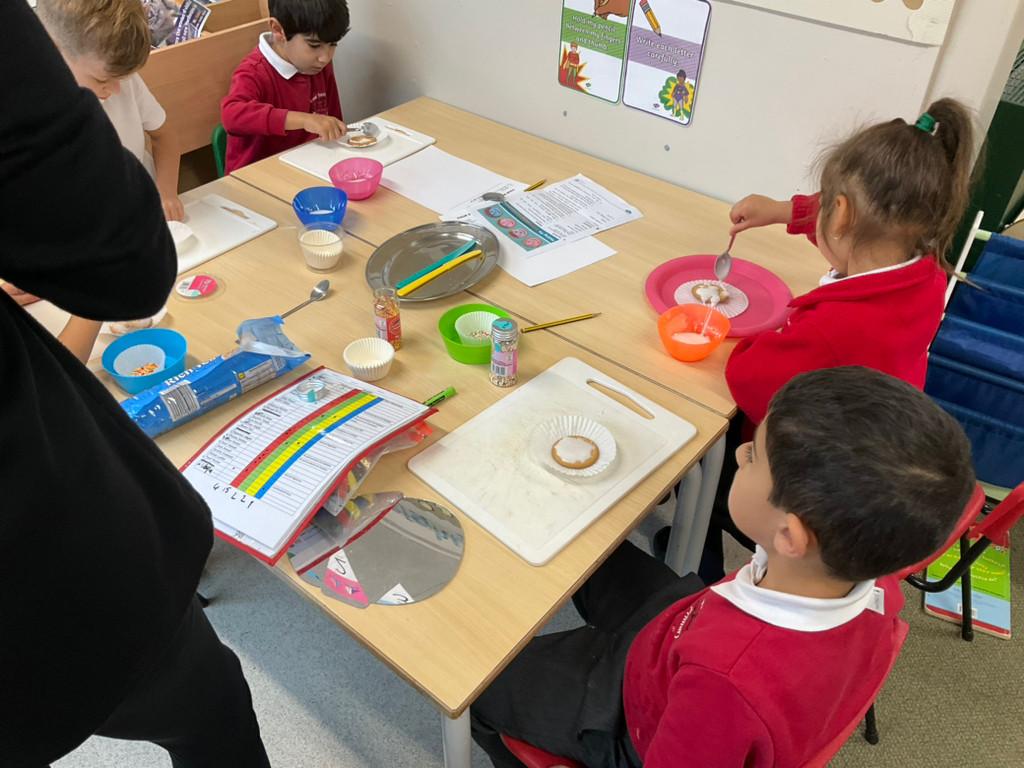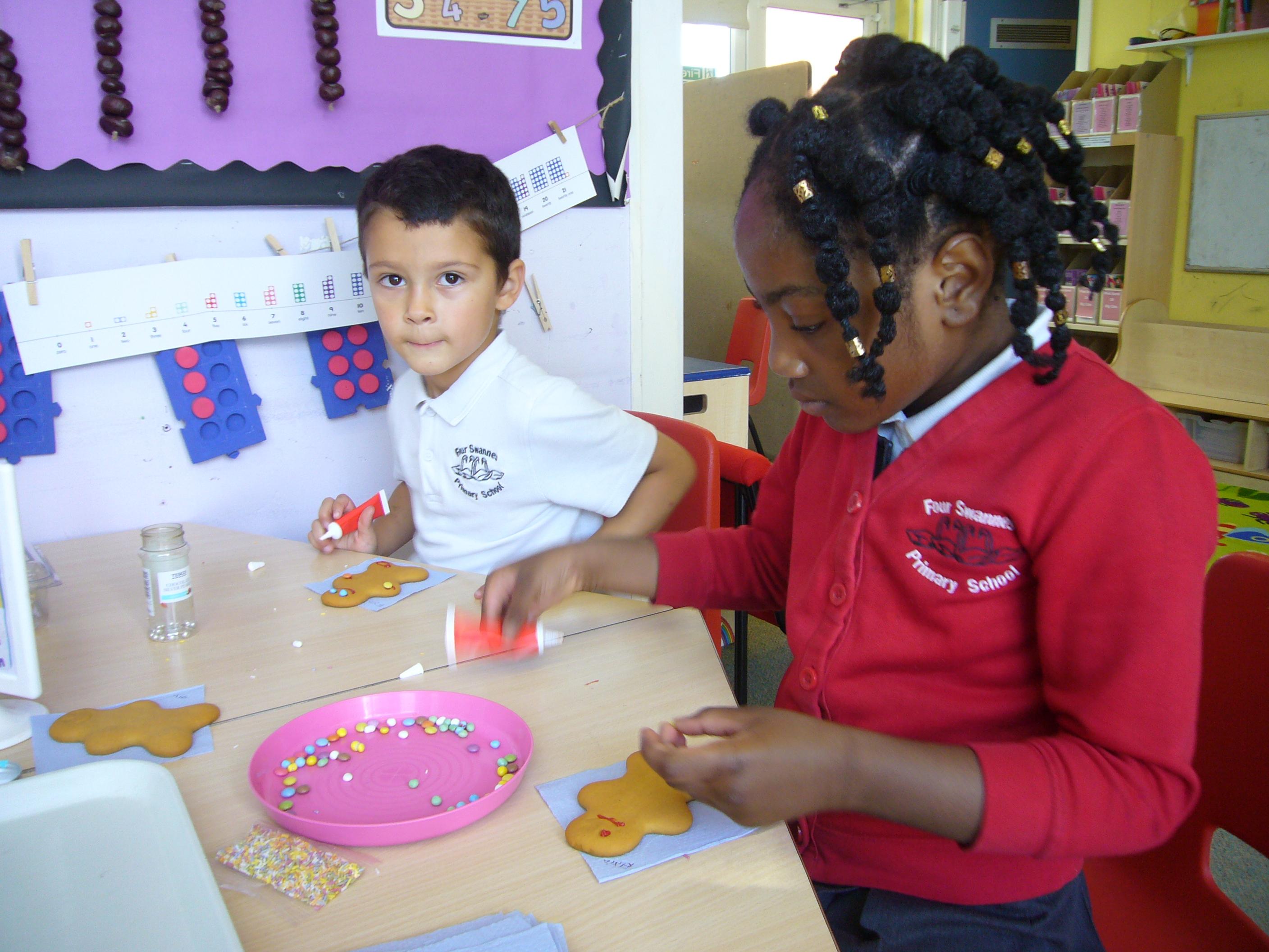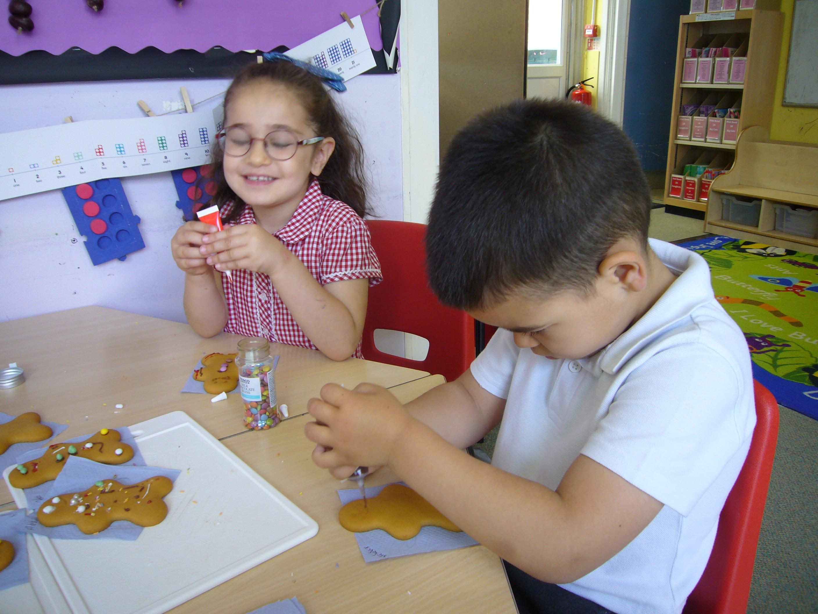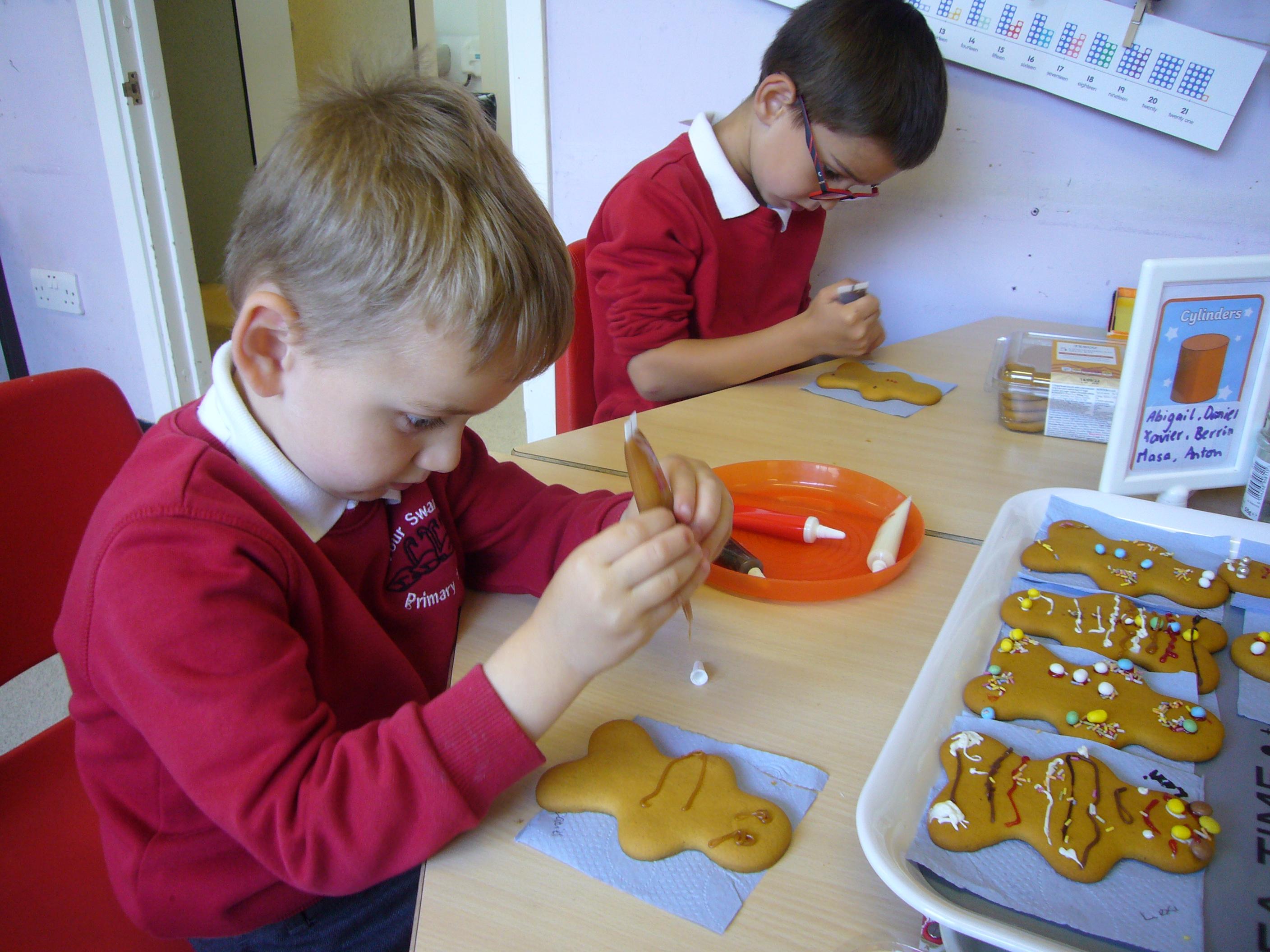 We then decorated the biscuits using icing sugar, resins and chocolate buttons. The children had to count how many eyes and buttons he had.